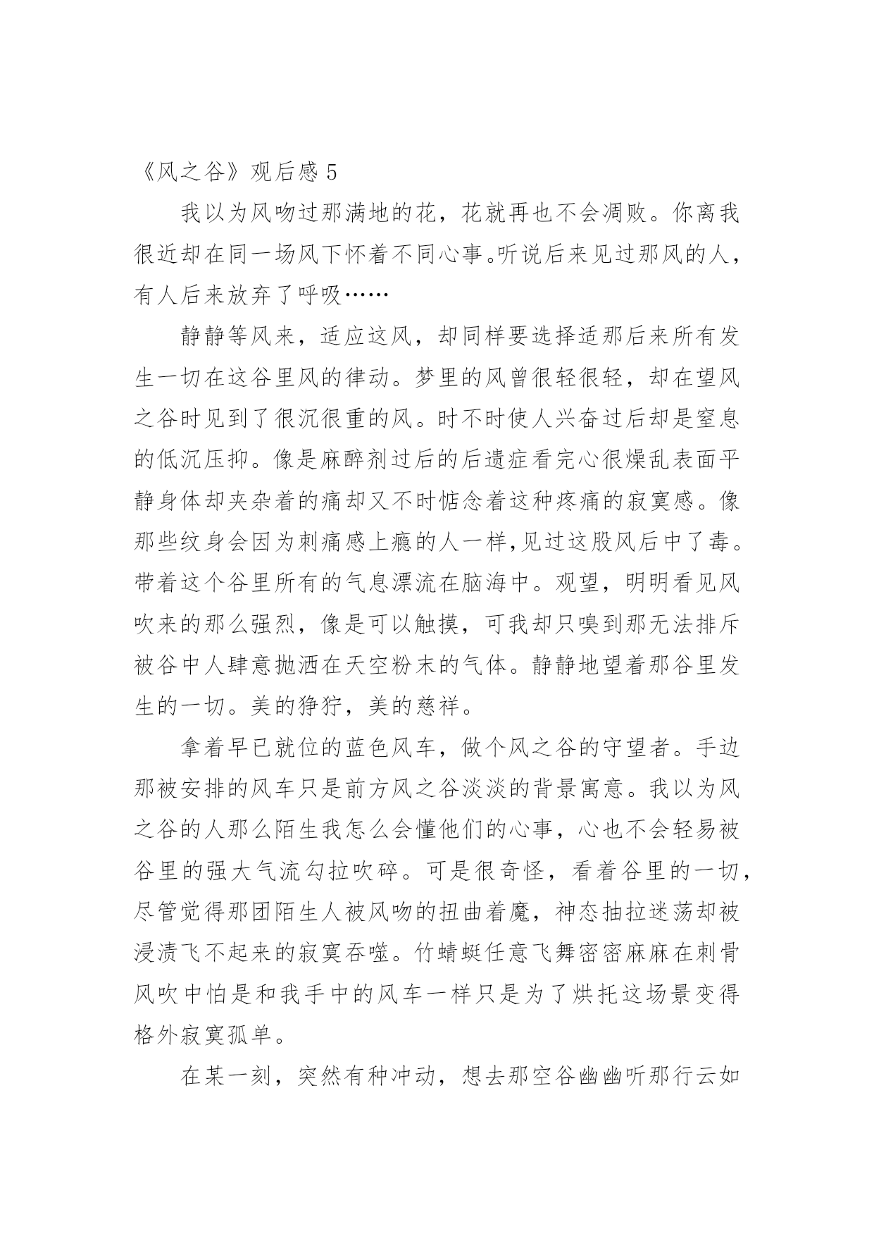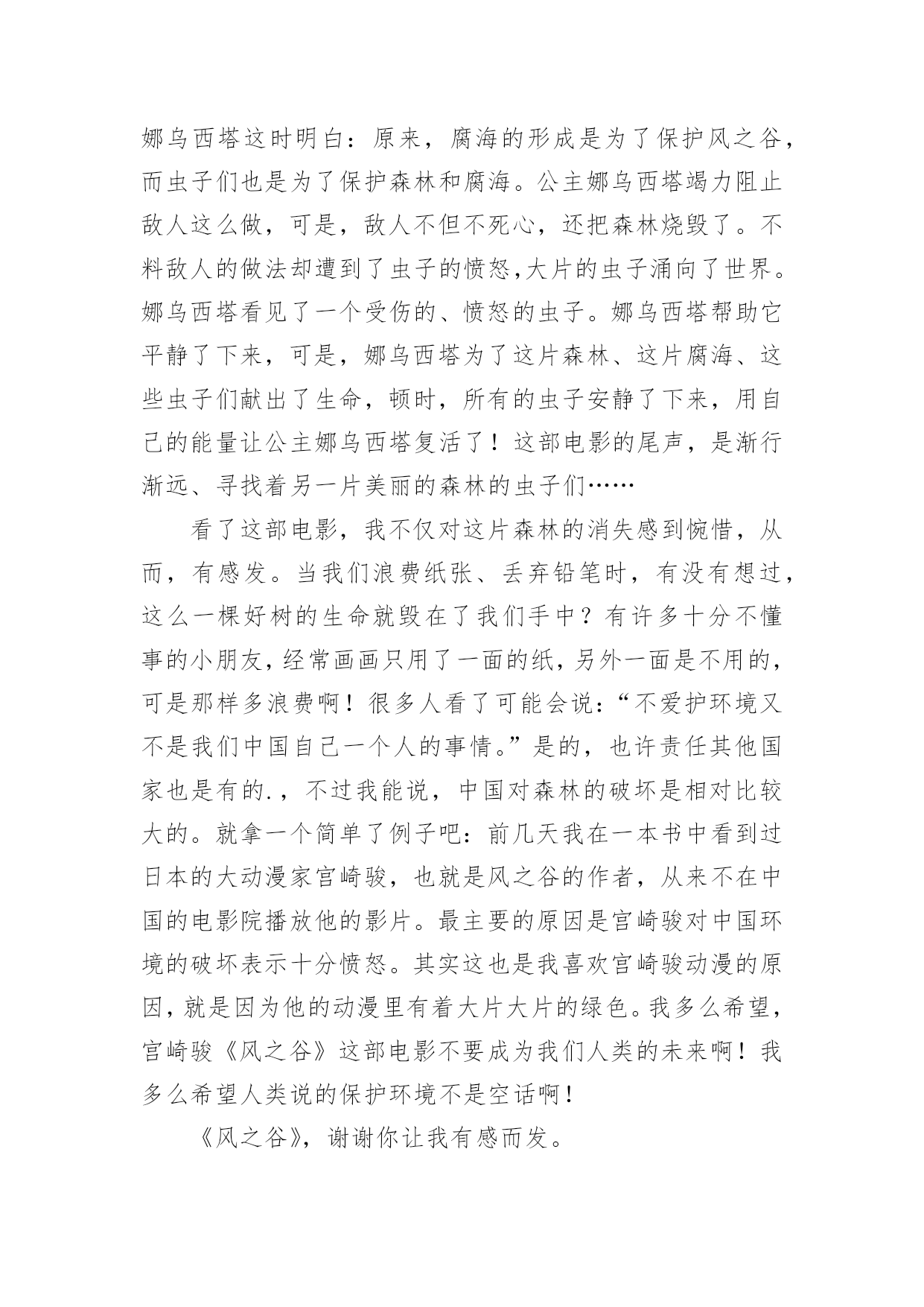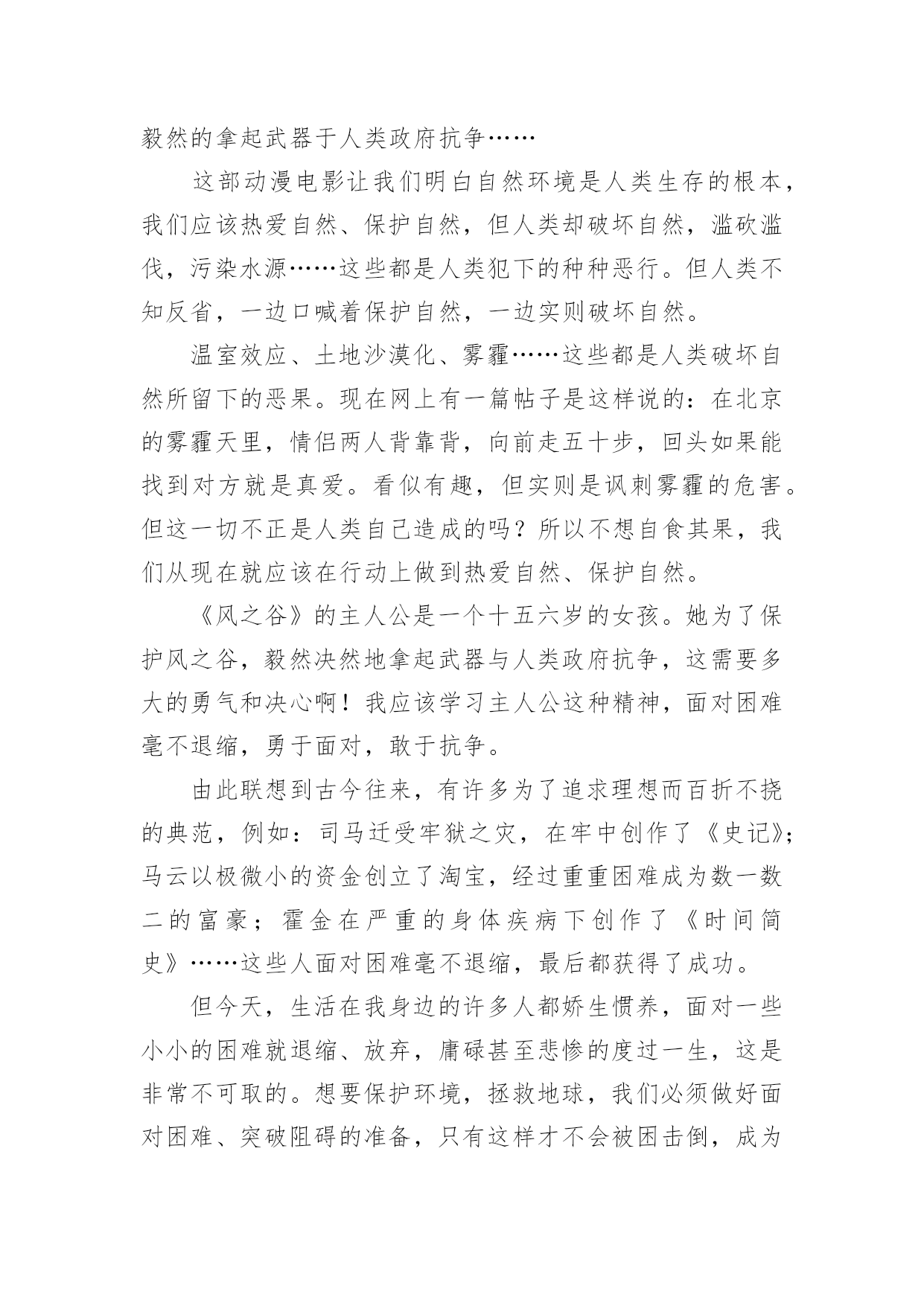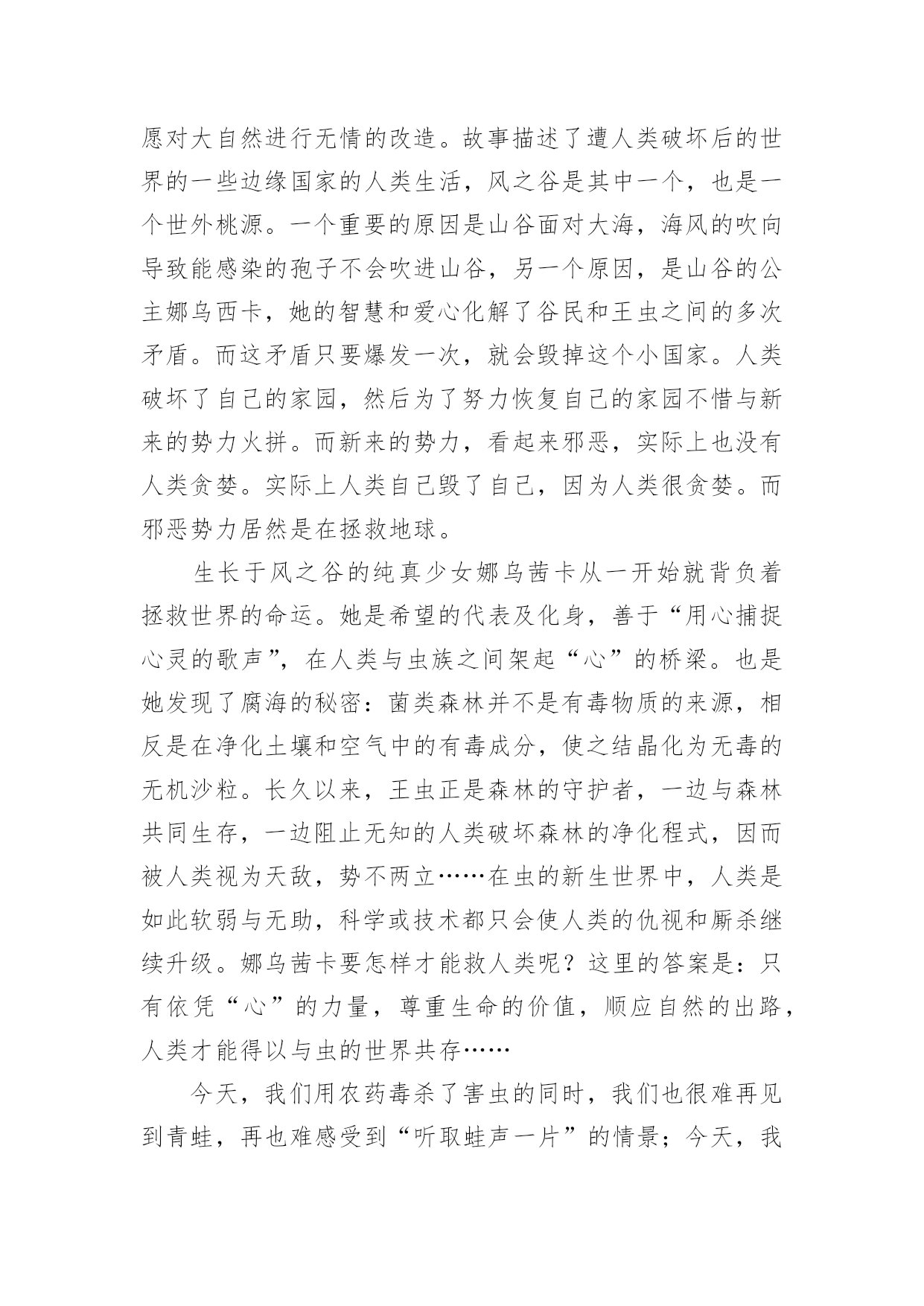 《风之谷》观后感当认真看完一部影视作品后,一定对生活有了新的感悟和看法吧,需要回过头来写一写观后感了。可能你现在毫无头绪吧,以下是小编为大家整理的《风之谷》观后感,欢迎阅读,希望大家能够喜欢。《风之谷》观后感1电影讲述了假定的因战争影响而环境腐化的未来,一位勇敢的少女娜乌西卡致力于以和平的方式改变环境、拯救人类的故事。它对反战/环保主题的阐述不单体现在剧情上,也体现在设定和画面表达上。片中的腐海一开始给角色和观众都留下了险象环生的印象,表面上这就足以体现人为破坏环境的恶果了。然而随着主角娜乌西卡的探索,才发现表面上的险象都是对绿洲的保护,庞大的变种昆虫、毒性强大的瘴气和不可立足的流沙,都是驱赶随时可能干扰、打乱绿洲生态平衡的人类。环境遭受的破坏不会影响大自然本身的运作规律,尊重自然规律的万物终究会得到大自然的庇护,越逆天而行的反而越会遭殃。值得一提的还有片中巨神兵的现身。巨神兵在传说中可是威力足以破坏全世界的战争武器。而当战争双方中的一方临时再一次唤醒它时,虽然它的肉体尚未成型,但破坏性依然不可小觑。不过威力大归威力大,未成型的巨神兵只能算个泥足巨人,远不如因为愤怒汹汹来袭的王虫虫群坚挺。说到王虫,它们本应是绿洲的守护者,却成了战争中的另一方的战争武器,宫崎骏对人类破坏、滥用自然资源进行活动的控诉溢于言表。《风之谷》是宫崎骏动画生涯的奠基之作,是吉卜力工作室的开山之作,开启了宫崎骏和久石让长达30来年的合作,是日本原创动画电影的先驱……但更重要的是,它奠定了宫崎骏作品乃至日本动画电影的主流艺术表达。它一改以往日本主流动画电影主题表达上的短平快,通过意境和场景的营造,让观众在感受氛围的同时,自然而然地体会到作品的主旨,而不是靠直接的台词和动作进行说教。宫崎骏其实还是个低产的隐士,尤其到了功成名就的21世纪,他的创作量就更少了。但正如那片守护着绿洲的腐海,只要他现有的作品能够永久地给影迷和同行后辈带来精神财富,就足够了。《风之谷》观后感2《风之谷》是日本大师宫崎骏的漫画连载,是我们这个年龄最爱的课外读物,更是很多成人都很喜欢的漫画作品,听说在成人中有很多关于作者想表达什么核心思想的争论。在书中我看到的是长相奇特的生物,充满悬念的战争,更多体会到的是大自然中不仅仅有你死我活的争斗,还有以娜乌茜卡为代表的人类与大自然关系的不断思考——爱护生灵、尊重自然。人类,自认为是大自然的主宰,他们往往按照自己的意愿对大自然进行无情的改造。故事描述了遭人类破坏后的世界的一些边缘国家的人类生活,风之谷是其中一个,也是一个世外桃源。一个重要的原因是山谷面对大海,海风的吹向导致能感染的孢子不会吹进山谷,另一个原因,是山谷的公主娜乌西卡,她的智慧和爱心化解了谷民和王虫之间的多次矛盾。而这矛盾只要爆发一次,就会毁掉这个小国家。人类破坏了自己的家园,然后为了努力恢复自己的家园不惜与新来的势力火拼。而新来的势力,看起来邪恶,实际上也没有人类贪婪。实际上人类自己毁了自己,因为人类很贪婪。而邪恶势力居然是在拯救地球。生长于风之谷的纯真少女娜乌茜卡从一开始就背负着拯救世界的命运。她是希望的代表及化身,善于“用心捕捉心灵的歌声”,在人类与虫族之间架起“心”的桥梁。也是她发现了腐海的秘密:菌类森林并不是有毒物质的来源,相反是在净化土壤和空气中的有毒成分,使之结晶化为无毒的无机沙粒。长久以来,王虫正是森林的守护者,一边与森林共同生存,一边阻止无知的人类破坏森林的净化程式,因而被人类视为天敌,势不两立……在虫的新生世界中,人类是如此软弱与无助,科学或技术都只会使人类的仇视和厮杀继续升级。娜乌茜卡要怎样才能救人类呢?这里的答案是:只有依凭“心”的力量,尊重生命的价值,顺应自然的出路,人类才能得以与虫的世界共存……今天,我们用农药毒杀了害虫的同时,我们也很难再见到青蛙,再也难感受到“听取蛙声一片”的情景;今天,我们站在城市的高楼上却是眼前“薄雾一片”,很难感受到:呼一口浊气,吸一口清新;今天,《风之谷》告诉我们:世外桃源在我们做到爱护生灵、尊重自然之后就会出现。《风之谷》观后感3《风之谷》是一部有关人类破坏大自然过后,在夹缝中求得生存的动漫。它立意之巧妙,让我叹为观止。在此,我不得不再一次想要向伟大的动漫大师——宫崎骏致敬了。看完它,我感觉整个人就沸腾了,仿佛几百年,几千年后的世界就是风之谷里的世界;仿佛那样的故事不是故事,而是实实在在的真人真事。一个充满了毒气,走出风之谷必须戴上防毒面罩的世界,还能够怎样生存,还能够怎样发展,可是贪婪无厌的人类还是要占领,还是要掠夺。一方、两方、三方的战斗仍然在继续。瘴气底下是虫族的领地,没有防毒面具,人类恐怕活可是5分钟,加上成群结队的大虫,恐怖、恶心得犹如地狱。但那么地偶然,女主角娜乌西卡为了拯救一个落入腐海中的少年阿斯贝鲁,乘着滑翔机