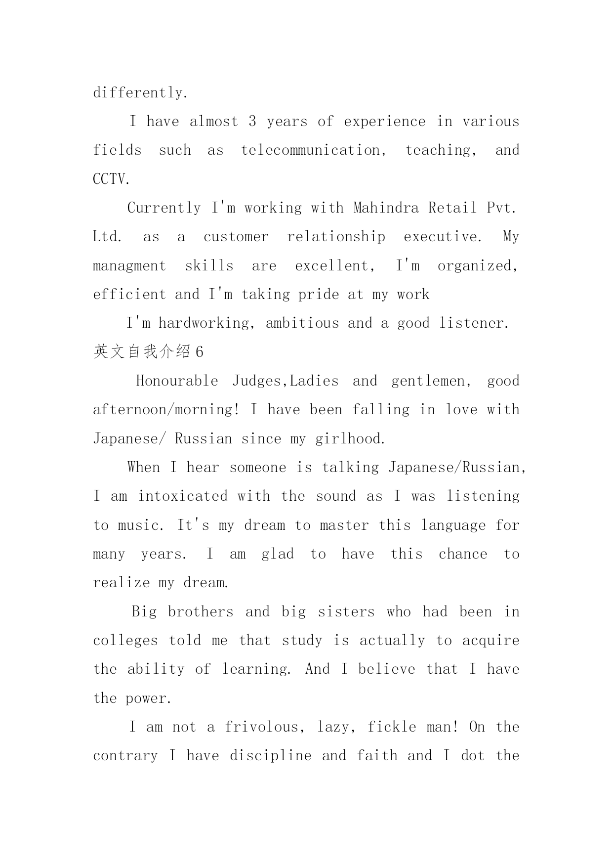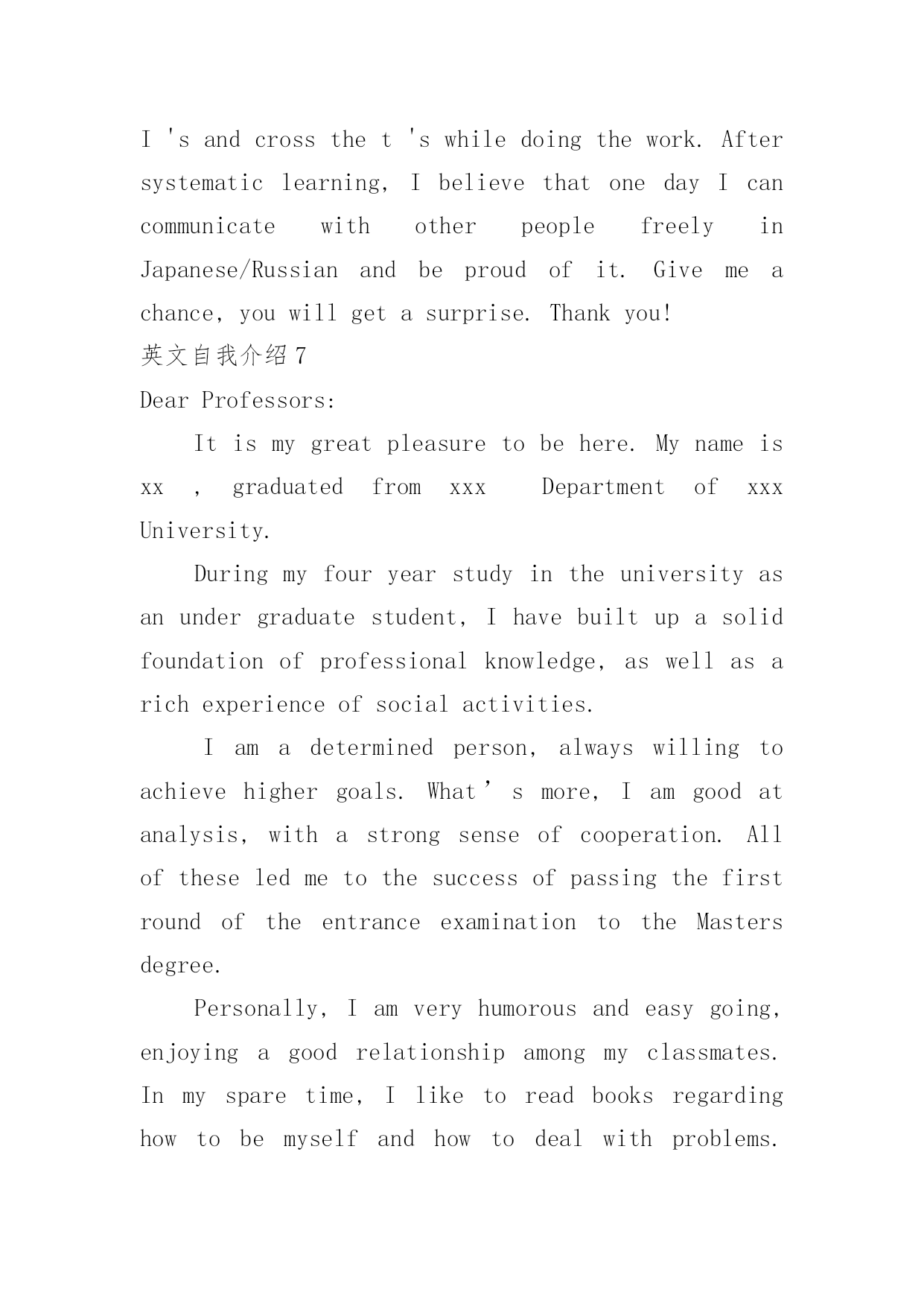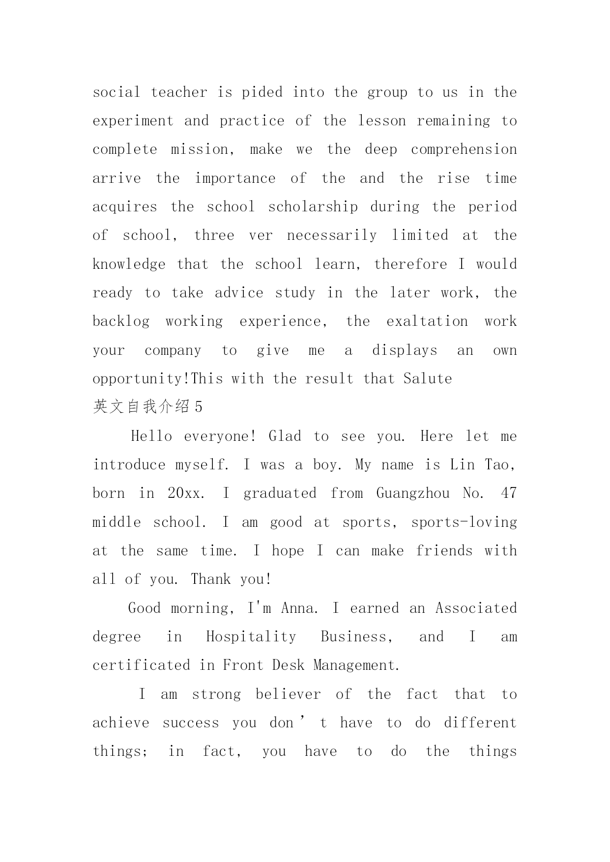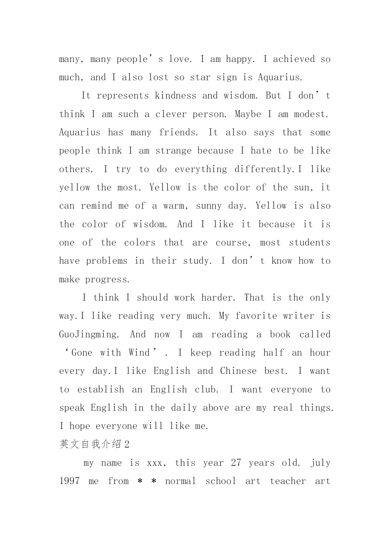 英文自我介绍英文自我介绍[精华]初到一个新的环境,通常需要用到自我介绍,通过自我介绍可以让别人认识自己。如何写出一个与众不同的自我介绍?以下是小编帮大家整理的英文自我介绍,欢迎大家分享。英文自我介绍1Ihavespentfifteenyearsinmylife.So,thisismyninthyeartostudy.Bytheway,mynameisWengJingru.Myfatherthoughthardaboutmyname.Heconsultedthedictionarytwotimestofindhowtonameme.Ofcourse,thisnameisverygoodandIlikeitverytimesIthinkIamalittlestrange.BecauseIoftenthinktheworldisn’tfullofhappiness.AndIwanttobedifferentfromothers.Ihatesuperficialpeople.ButalwaysIamveryout-goingandkindtoothers.Ican’tsay‘no’toothers.SoIdon’tknowhowtorefuse.Ican’tseeIamaprettygirl,butIamnotanuglyperson,either.Iamverygeneral.Ican’tsaytoomuchaboutmythisterm,Imakealittleprogressinmystudy.Inmylife,Ihavemyparents’love,andmany,manypeople’slove.Iamhappy.Iachievedsomuch,andIalsolostsostarsignisAquarius.Itrepresentskindnessandwisdom.ButIdon’tthinkIamsuchacleverperson.MaybeIammodest.Aquariushasmanyfriends.ItalsosaysthatsomepeoplethinkIamstrangebecauseIhatetobelikeothers.Itrytodoeverythingdifferently.Ilikeyellowthemost.Yellowisthecolorofthesun,itcanremindmeofawarm,sunnyday.Yellowisalsothecolorofwisdom.AndIlikeitbecauseitisoneofthecolorsthatarecourse,moststudentshaveproblemsintheirstudy.Idon’tknowhowtomakeprogress.IthinkIshouldworkharder.Thatistheonlyway.Ilikereadingverymuch.MyfavoritewriterisGuoJingming.AndnowIamreadingabookcalled‘GonewithWind’.Ikeepreadinghalfanhoureveryday.IlikeEnglishandChinesebest.IwanttoestablishanEnglishclub.IwanteveryonetospeakEnglishinthedailyabovearemyrealthings.Ihopeeveryonewilllikeme.英文自我介绍2mynameisxxx,thisyear27yearsold.july1997mefrom**normalschoolartteacherartprofessionalinsidetheplanatgraduation.from1997towithincountrynolongerzifeishengbagdistributive,thatishouldgoupwiththesunmostglaryvocationover.fortunately,tattenaimachangsmallteachersisinsufficient,thepeopleinthissmallintroduction,iservedasayearoftemporarysubstituteteacher.recallthattimewhichwasbothsweetandgood,althoughsubstitutealowsalary,butlistenstudentsaroundthesideteacherandteachergrowledandlookedatthepairsofeyes,thefulltr