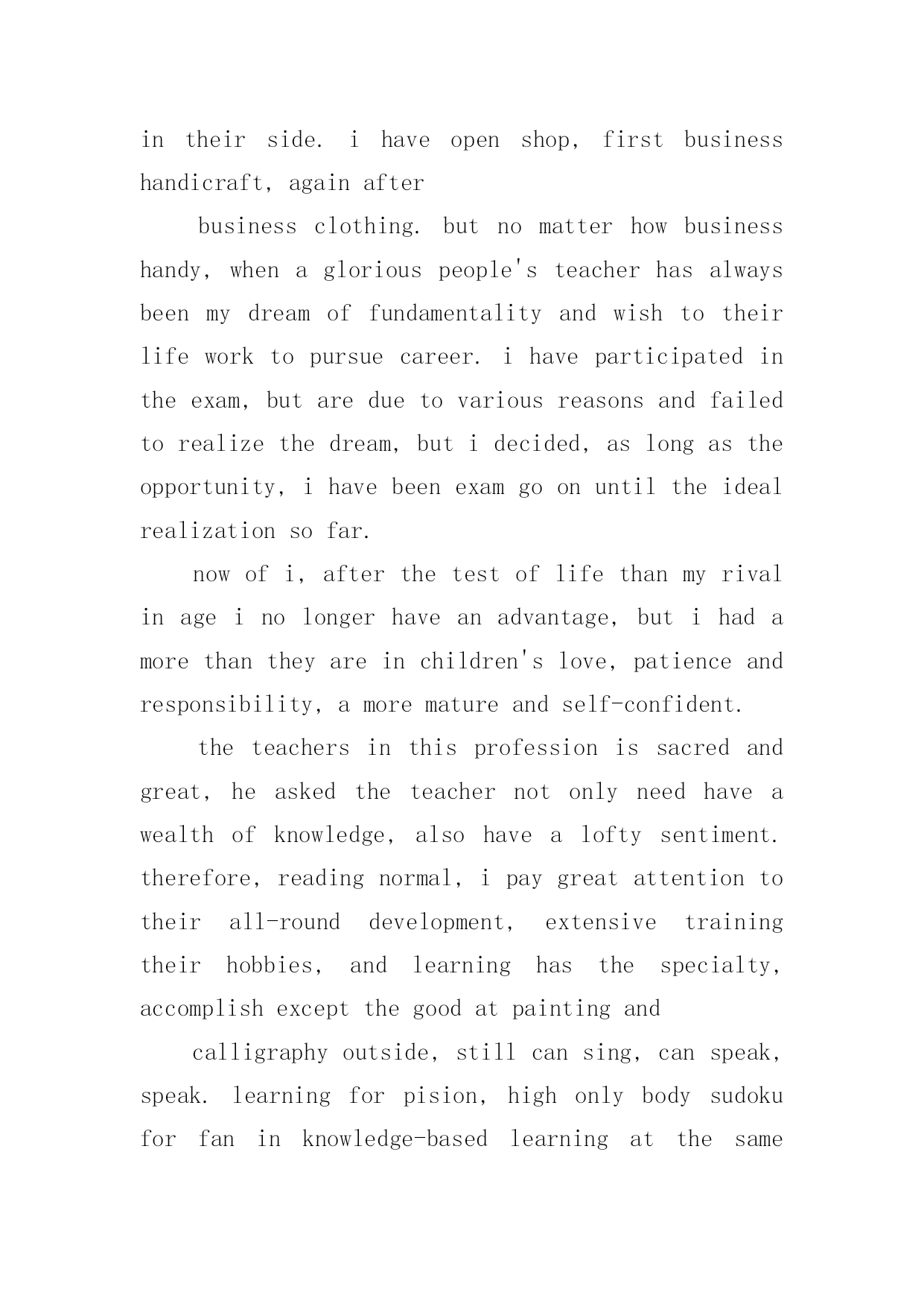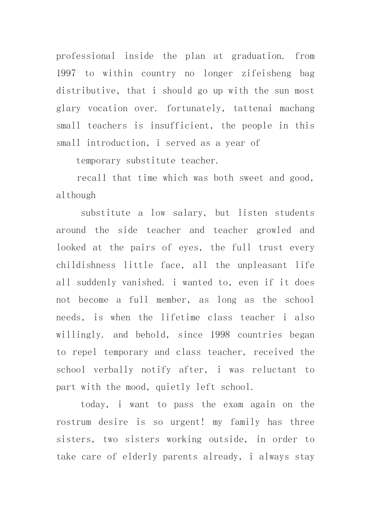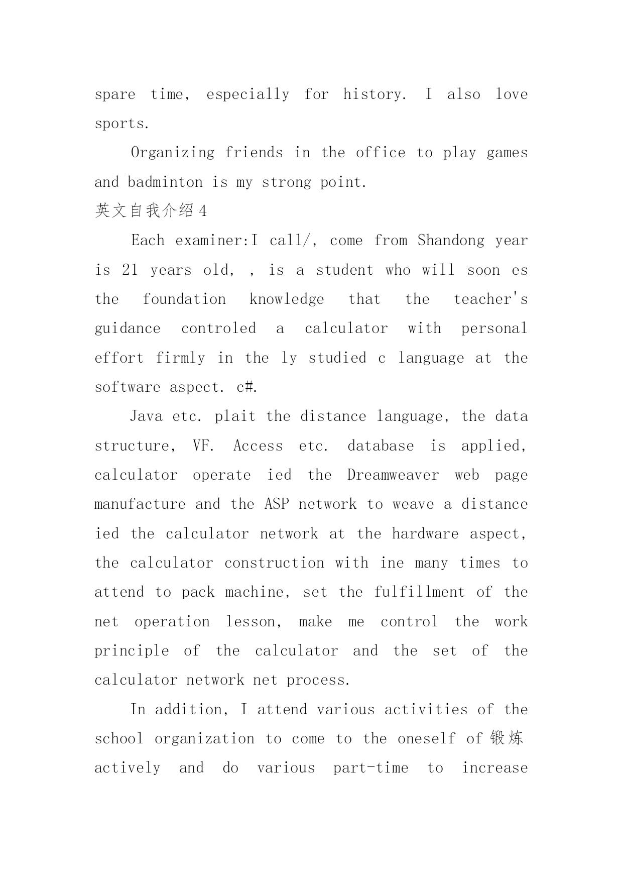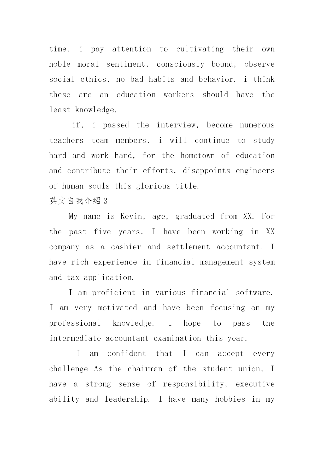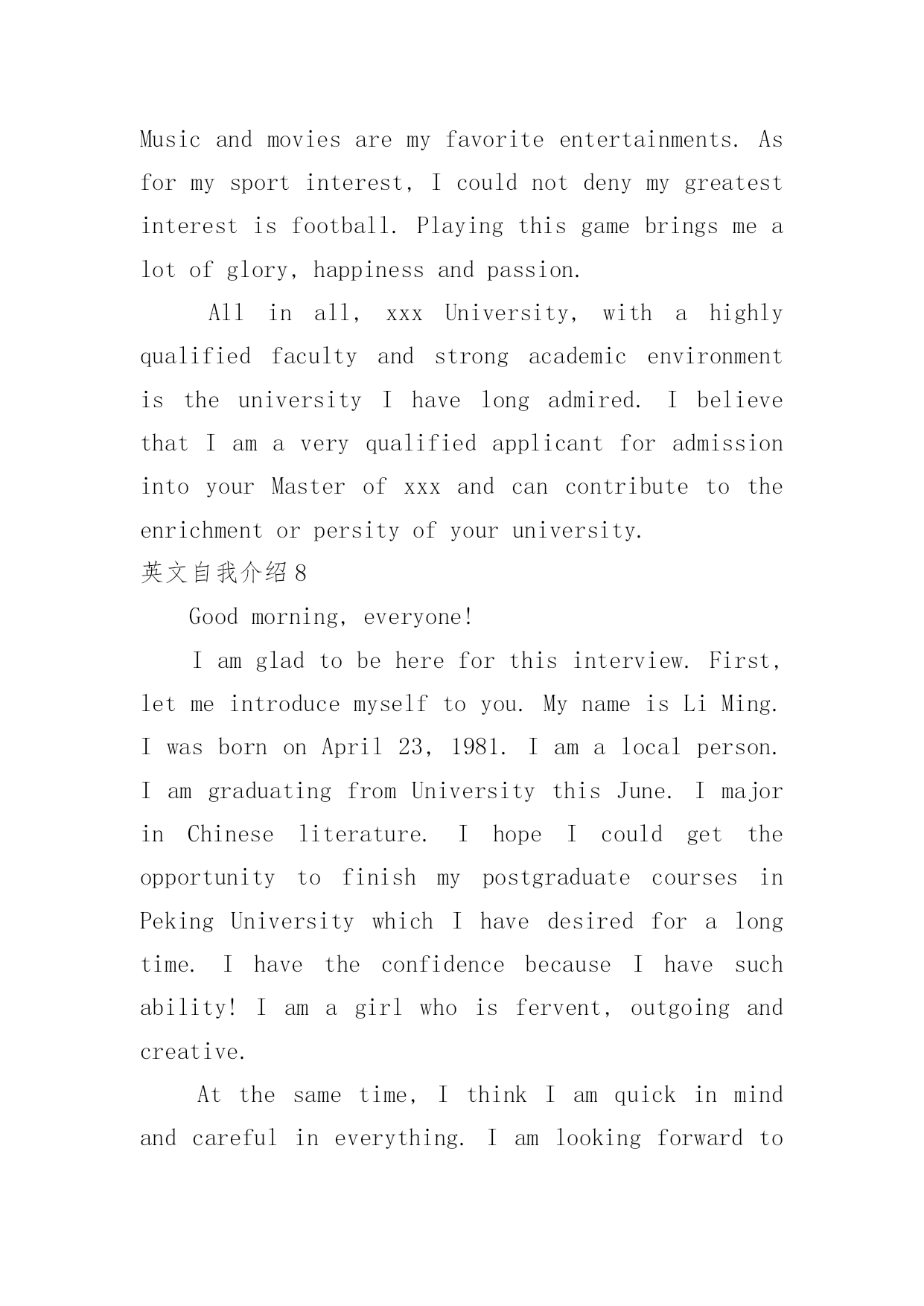 英文自我介绍英文自我介绍[精华]初到一个新的环境,通常需要用到自我介绍,通过自我介绍可以让别人认识自己。如何写出一个与众不同的自我介绍?以下是小编帮大家整理的英文自我介绍,欢迎大家分享。英文自我介绍1Ihavespentfifteenyearsinmylife.So,thisismyninthyeartostudy.Bytheway,mynameisWengJingru.Myfatherthoughthardaboutmyname.Heconsultedthedictionarytwotimestofindhowtonameme.Ofcourse,thisnameisverygoodandIlikeitverytimesIthinkIamalittlestrange.BecauseIoftenthinktheworldisn’tfullofhappiness.AndIwanttobedifferentfromothers.Ihatesuperficialpeople.ButalwaysIamveryout-goingandkindtoothers.Ican’tsay‘no’toothers.SoIdon’tknowhowtorefuse.Ican’tseeIamaprettygirl,butIamnotanuglyperson,either.Iamverygeneral.Ican’tsaytoomuchaboutmythisterm,Imakealittleprogressinmystudy.Inmylife,Ihavemyparents’love,andmany,manypeople’slove.Iamhappy.Iachievedsomuch,andIalsolostsostarsignisAquarius.Itrepresentskindnessandwisdom.ButIdon’tthinkIamsuchacleverperson.MaybeIammodest.Aquariushasmanyfriends.ItalsosaysthatsomepeoplethinkIamstrangebecauseIhatetobelikeothers.Itrytodoeverythingdifferently.Ilikeyellowthemost.Yellowisthecolorofthesun,itcanremindmeofawarm,sunnyday.Yellowisalsothecolorofwisdom.AndIlikeitbecauseitisoneofthecolorsthatarecourse,moststudentshaveproblemsintheirstudy.Idon’tknowhowtomakeprogress.IthinkIshouldworkharder.Thatistheonlyway.Ilikereadingverymuch.MyfavoritewriterisGuoJingming.AndnowIamreadingabookcalled‘GonewithWind’.Ikeepreadinghalfanhoureveryday.IlikeEnglishandChinesebest.IwanttoestablishanEnglishclub.IwanteveryonetospeakEnglishinthedailyabovearemyrealthings.Ihopeeveryonewilllikeme.英文自我介绍2mynameisxxx,thisyear27yearsold.july1997mefrom**normalschoolartteacherartprofessionalinsidetheplanatgraduation.from1997towithincountrynolongerzifeishengbagdistributive,thatishouldgoupwiththesunmostglaryvocationover.fortunately,tattenaimachangsmallteachersisinsufficient,thepeopleinthissmallintroduction,iservedasayearoftemporarysubstituteteacher.recallthattimewhichwasbothsweetandgood,althoughsubstitutealowsalary,butlistenstudentsaroundthesideteacherandteachergrowledandlookedatthepairsofeyes,thefulltr