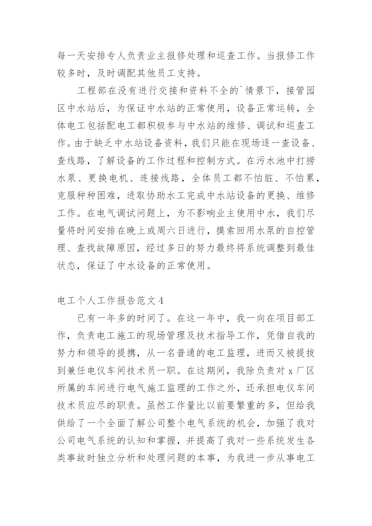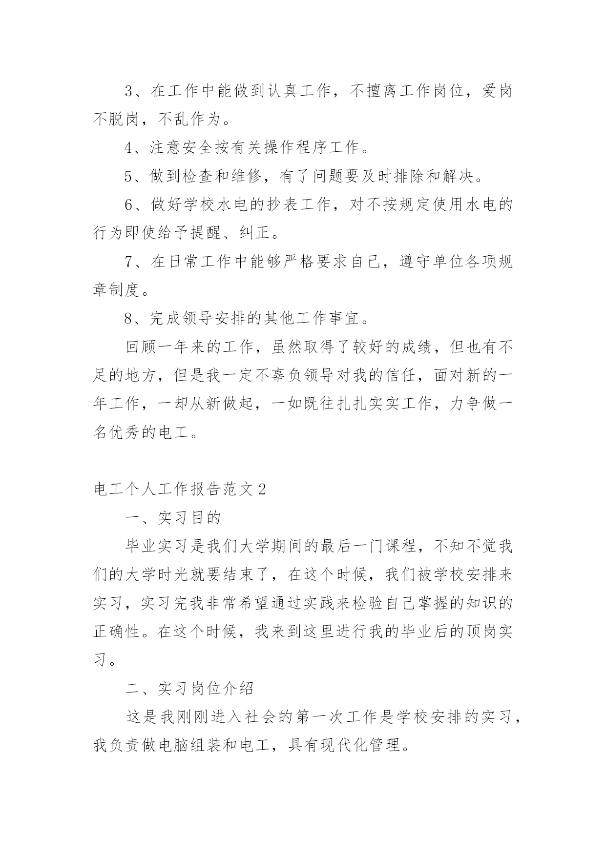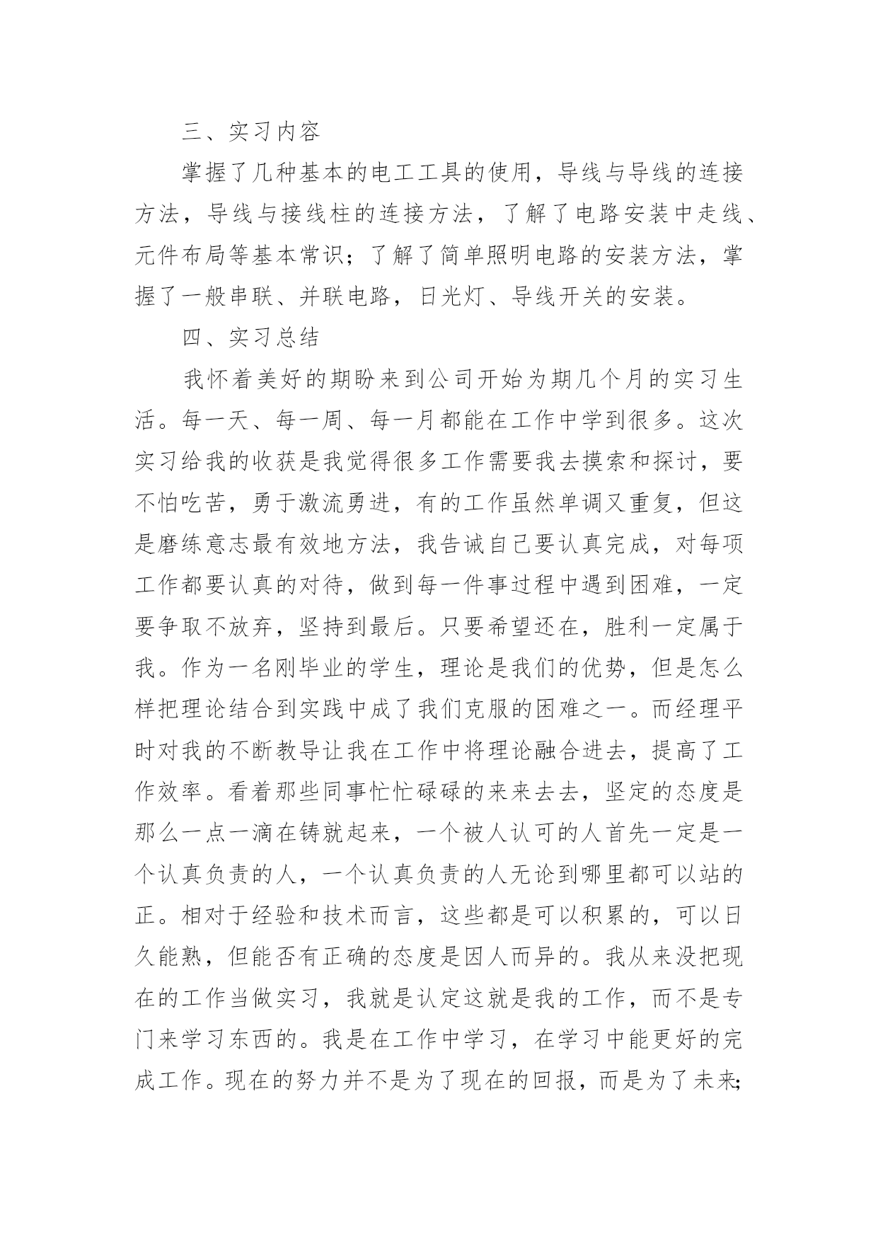 电工个人工作报告电工个人工作报告范文随着社会不断地进步,大家逐渐认识到报告的重要性,报告成为了一种新兴产业。那么大家知道标准正式的报告格式吗?下面是小编为大家收集的电工个人工作报告范文,欢迎阅读,希望大家能够喜欢。电工个人工作报告范文1充实的20xx年即将过去。在这一年里,我和同事们一起生活、学习和工作。彼此建立了深厚的友谊,同时在实践中磨练了工作能力,使我的业务能力和技术水平又有了很大的提高,当然这与上级领导的帮助和大家的支持是分不开的,在此我深表感谢!我作为学校总务处的一名电工,我深感责任重大。一年来的一幕幕在我脑中徘徊。认真思索总结之后便对自己有了客观,真实的评价,为了将本年度的工作画上圆满的句号,现将本年度的工作做如下工作总结一、工作态度,思想工作我热衷于本职工作,严以律己,遵守各项校规制度,严格要球自己,摆正工作位置,时刻保持“谦虚,谨慎,律己”的工作态度,在领导的关心培养和同事们的帮助下,始终勤奋学习,积极进取,努力提高自我,始终勤奋工作,认真完成任务,履行好岗位的职责。坚持理想,坚定信念。不断加强学习,牢固树立共产主义远大理想,坚定走中国特色社会主义道路的信念,自觉地为实现党在初级阶段的基本路线和基本纲领而努力奋斗。二、生产工作方面1、贯彻执行学校里管理工作的.法律法规的规定,提高水电业务水平,认真做好对修理工具的使用和维护,定时巡查所里水电附属设施是否完好,发现问题立即向领导报告。确保电路、水路设施的完好,保障学校里的水电畅通。2、严以律己,宽以待人,遵守学校里的各项规章制度。本人严格遵守学校里的各项规章制度,不迟到、不早退、有事主动请假。在工作中,尊敬领导、团结同事。平时,勤俭节约、任劳任怨、对人真诚、人际关系和谐融洽,从不闹无原则的纠纷,处处以一名优秀的水电工的要求来规范自己的言行,毫不松懈地培养自己的综合素质和学习水电方面的有关政策、法规和处罚尺度,掌握正确的施工方法,及时对老化和存在安全隐患水电设施进行更换改造。本年度主要完成了如下工作:1、热爱本职工作,日常工作中不断熟悉更新业务,能够做到事事认真负责。2、做好水电线路的维修保养,做到定期检查,及时维修,保障供电供水设备的正常运行,认真完成必要的改进任务,使线路设备保持良好的状态,合理使用水电材料,爱护工具。3、在工作中能做到认真工作,不擅离工作岗位,爱岗不脱岗,不乱作为。4、注意安全按有关操作程序工作。5、做到检查和维修,有了问题要及时排除和解决。6、做好学校水电的抄表工作,对不按规定使用水电的行为即使给予提醒、纠正。7、在日常工作中能够严格要求自己,遵守单位各项规章制度。8、完成领导安排的其他工作事宜。回顾一年来的工作,虽然取得了较好的成绩,但也有不足的地方,但是我一定不辜负领导对我的信任,面对新的一年工作,一却从新做起,一如既往扎扎实实工作,力争做一名优秀的电工。电工个人工作报告范文2一、实习目的毕业实习是我们大学期间的最后一门课程,不知不觉我们的大学时光就要结束了,在这个时候,我们被学校安排来实习,实习完我非常希望通过实践来检验自己掌握的知识的正确性。在这个时候,我来到这里进行我的毕业后的顶岗实习。二、实习岗位介绍这是我刚刚进入社会的第一次工作是学校安排的实习,我负责做电脑组装和电工,具有现代化管理。三、实习内容掌握了几种基本的电工工具的使用,导线与导线的连接方法,导线与接线柱的连接方法,了解了电路安装中走线、元件布局等基本常识;了解了简单照明电路的安装方法,掌握了一般串联、并联电路,日光灯、导线开关的安装。四、实习总结我怀着美好的期盼来到公司开始为期几个月的实习生活。每一天、每一周、每一月都能在工作中学到很多。这次实习给我的收获是我觉得很多工作需要我去摸索和探讨,要不怕吃苦,勇于激流勇进,有的工作虽然单调又重复,但这是磨练意志最有效地方法,我告诫自己要认真完成,对每项工作都要认真的对待,做到每一件事过程中遇到困难,一定要争取不放弃,坚持到最后。只要希望还在,胜利一定属于我。作为一名刚毕业的学生,理论是我们的优势,但是怎么样把理论结合到实践中成了我们克服的困难之一。而经理平时对我的不断教导让我在工作中将理论融合进去,提高了工作效率。看着那些同事忙忙碌碌的来来去去,坚定的态度是那么一点一滴在铸就起来,一个被人认可的人首先一定是一个认真负责的人,一个认真负责的人无论到哪里都可以站的正。相对于经验和技术而言,这些都是可以积累的,可以日久能熟,但能否有正确的态度是因人而异的。我从来没把现在的工作当做实习,我就是认定这就是我的工作,而不是专门来学习东西的。我是在工作中学习,在学习中能更好的完成工作。现在的努力并不是为了现在的回报,而是为了未来;艰难的任务能锻炼我们的意志,新的工作能拓展我们的才能,与同事的合作能培养我们的人格,与客户的交流能训练我们的