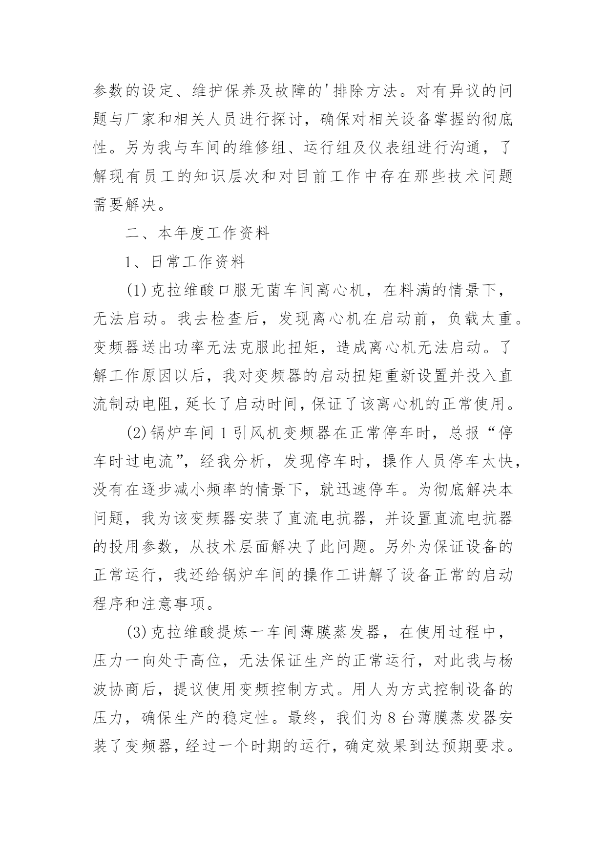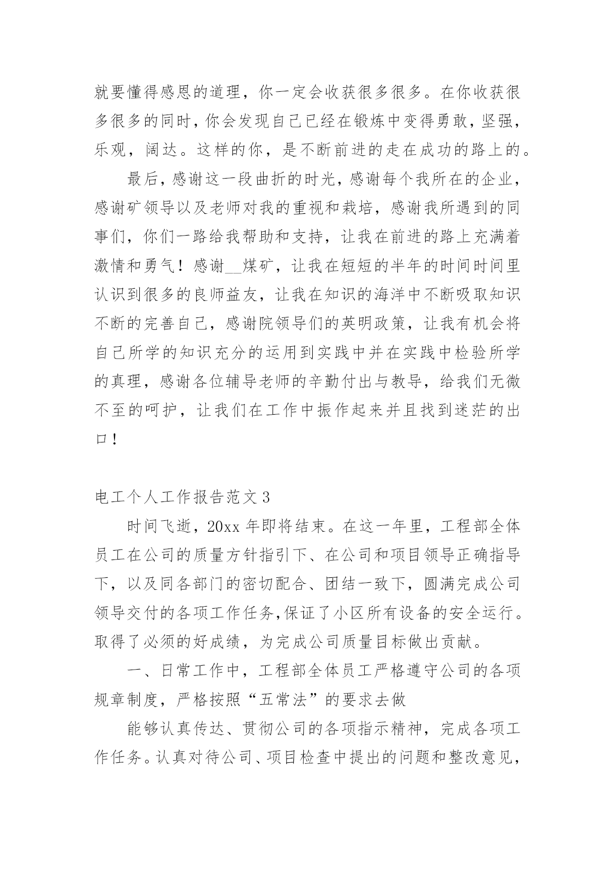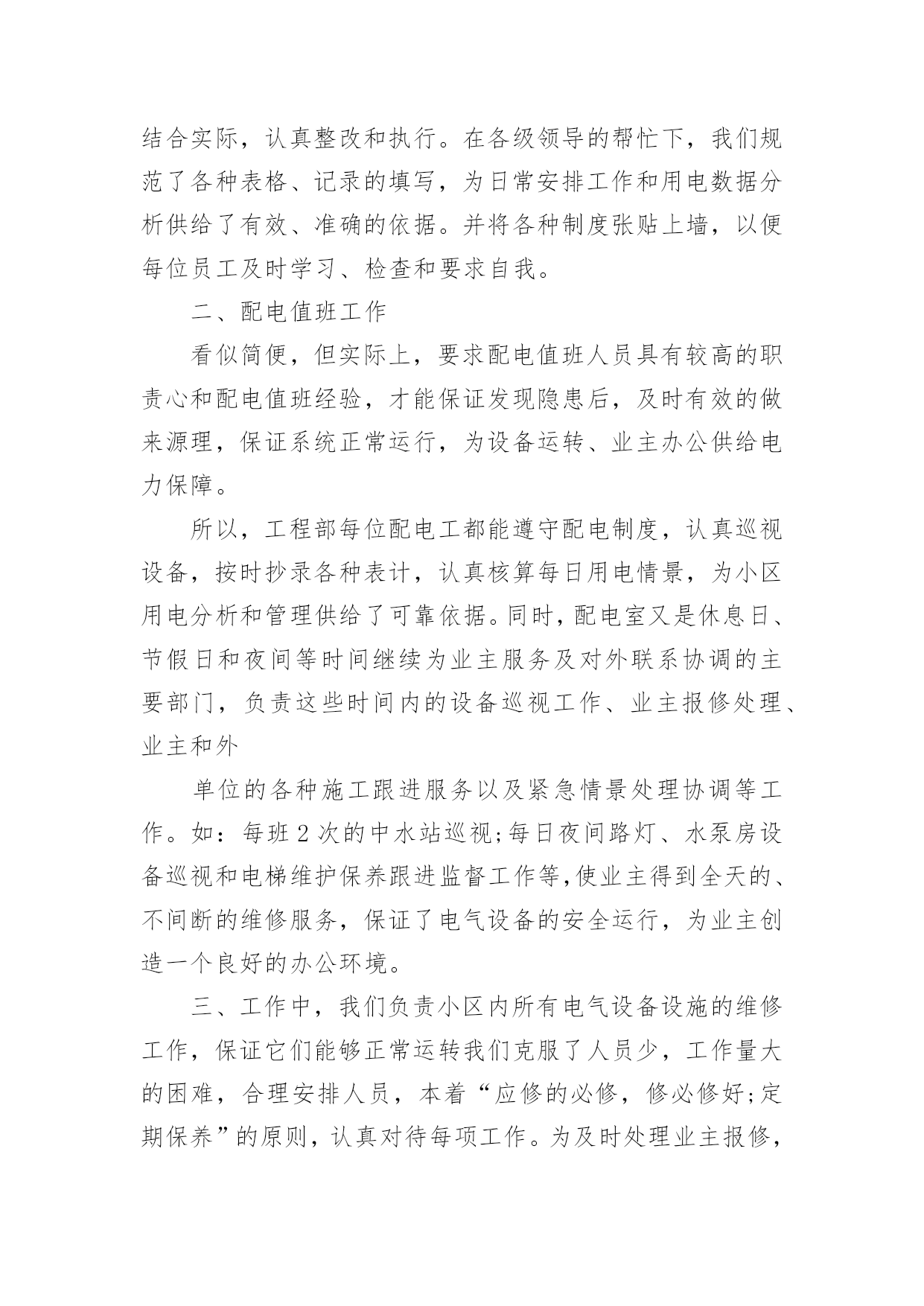 电工个人工作报告电工个人工作报告范文随着社会不断地进步,大家逐渐认识到报告的重要性,报告成为了一种新兴产业。那么大家知道标准正式的报告格式吗?下面是小编为大家收集的电工个人工作报告范文,欢迎阅读,希望大家能够喜欢。电工个人工作报告范文1充实的20xx年即将过去。在这一年里,我和同事们一起生活、学习和工作。彼此建立了深厚的友谊,同时在实践中磨练了工作能力,使我的业务能力和技术水平又有了很大的提高,当然这与上级领导的帮助和大家的支持是分不开的,在此我深表感谢!我作为学校总务处的一名电工,我深感责任重大。一年来的一幕幕在我脑中徘徊。认真思索总结之后便对自己有了客观,真实的评价,为了将本年度的工作画上圆满的句号,现将本年度的工作做如下工作总结一、工作态度,思想工作我热衷于本职工作,严以律己,遵守各项校规制度,严格要球自己,摆正工作位置,时刻保持“谦虚,谨慎,律己”的工作态度,在领导的关心培养和同事们的帮助下,始终勤奋学习,积极进取,努力提高自我,始终勤奋工作,认真完成任务,履行好岗位的职责。坚持理想,坚定信念。不断加强学习,牢固树立共产主义远大理想,坚定走中国特色社会主义道路的信念,自觉地为实现党在初级阶段的基本路线和基本纲领而努力奋斗。二、生产工作方面1、贯彻执行学校里管理工作的.法律法规的规定,提高水电业务水平,认真做好对修理工具的使用和维护,定时巡查所里水电附属设施是否完好,发现问题立即向领导报告。确保电路、水路设施的完好,保障学校里的水电畅通。2、严以律己,宽以待人,遵守学校里的各项规章制度。本人严格遵守学校里的各项规章制度,不迟到、不早退、有事主动请假。在工作中,尊敬领导、团结同事。平时,勤俭节约、任劳任怨、对人真诚、人际关系和谐融洽,从不闹无原则的纠纷,处处以一名优秀的水电工的要求来规范自己的言行,毫不松懈地培养自己的综合素质和学习水电方面的有关政策、法规和处罚尺度,掌握正确的施工方法,及时对老化和存在安全隐患水电设施进行更换改造。本年度主要完成了如下工作:1、热爱本职工作,日常工作中不断熟悉更新业务,能够做到事事认真负责。2、做好水电线路的维修保养,做到定期检查,及时维修,保障供电供水设备的正常运行,认真完成必要的改进任务,使线路设备保持良好的状态,合理使用水电材料,爱护工具。3、在工作中能做到认真工作,不擅离工作岗位,爱岗不脱岗,不乱作为。4、注意安全按有关操作程序工作。5、做到检查和维修,有了问题要及时排除和解决。6、做好学校水电的抄表工作,对不按规定使用水电的行为即使给予提醒、纠正。7、在日常工作中能够严格要求自己,遵守单位各项规章制度。8、完成领导安排的其他工作事宜。回顾一年来的工作,虽然取得了较好的成绩,但也有不足的地方,但是我一定不辜负领导对我的信任,面对新的一年工作,一却从新做起,一如既往扎扎实实工作,力争做一名优秀的电工。电工个人工作报告范文2一、实习目的毕业实习是我们大学期间的最后一门课程,不知不觉我们的大学时光就要结束了,在这个时候,我们被学校安排来实习,实习完我非常希望通过实践来检验自己掌握的知识的正确性。在这个时候,我来到这里进行我的毕业后的顶岗实习。二、实习岗位介绍这是我刚刚进入社会的第一次工作是学校安排的实习,我负责做电脑组装和电工,具有现代化管理。三、实习内容掌握了几种基本的电工工具的使用,导线与导线的连接方法,导线与接线柱的连接方法,了解了电路安装中走线、元件布局等基本常识;了解了简单照明电路的安装方法,掌握了一般串联、并联电路,日光灯、导线开关的安装。四、实习总结我怀着美好的期盼来到公司开始为期几个月的实习生活。每一天、每一周、每一月都能在工作中学到很多。这次实习给我的收获是我觉得很多工作需要我去摸索和探讨,要不怕吃苦,勇于激流勇进,有的工作虽然单调又重复,但这是磨练意志最有效地方法,我告诫自己要认真完成,对每项工作都要认真的对待,做到每一件事过程中遇到困难,一定要争取不放弃,坚持到最后。只要希望还在,胜利一定属于我。作为一名刚毕业的学生,理论是我们的优势,但是怎么样把理论结合到实践中成了我们克服的困难之一。而经理平时对我的不断教导让我在工作中将理论融合进去,提高了工作效率。看着那些同事忙忙碌碌的来来去去,坚定的态度是那么一点一滴在铸就起来,一个被人认可的人首先一定是一个认真负责的人,一个认真负责的人无论到哪里都可以站的正。相对于经验和技术而言,这些都是可以积累的,可以日久能熟,但能否有正确的态度是因人而异的。我从来没把现在的工作当做实习,我就是认定这就是我的工作,而不是专门来学习东西的。我是在工作中学习,在学习中能更好的完成工作。现在的努力并不是为了现在的回报,而是为了未来;艰难的任务能锻炼我们的意志,新的工作能拓展我们的才能,与同事的合作能培养我们的人格,与客户的交流能训练我们的