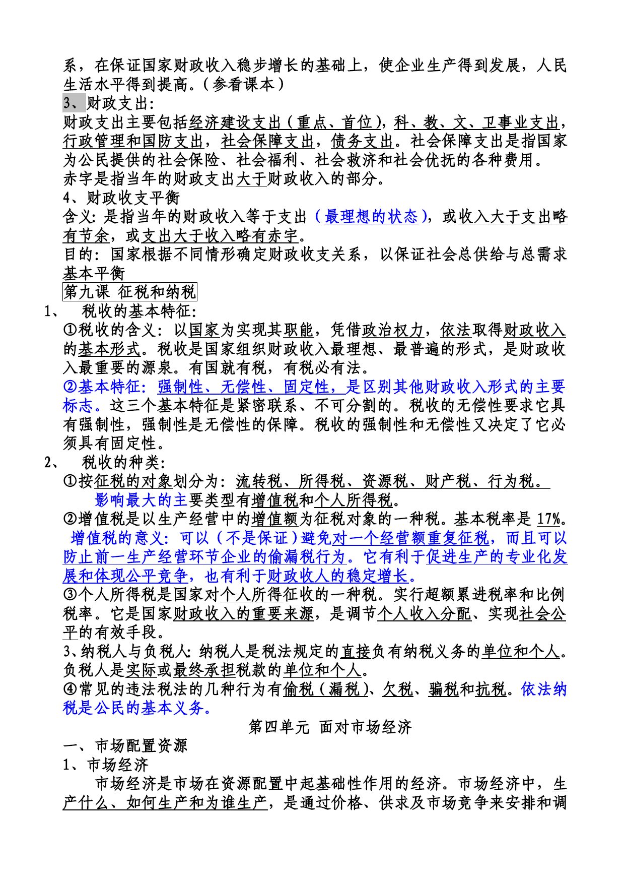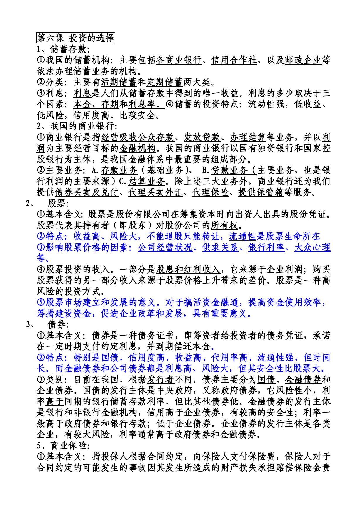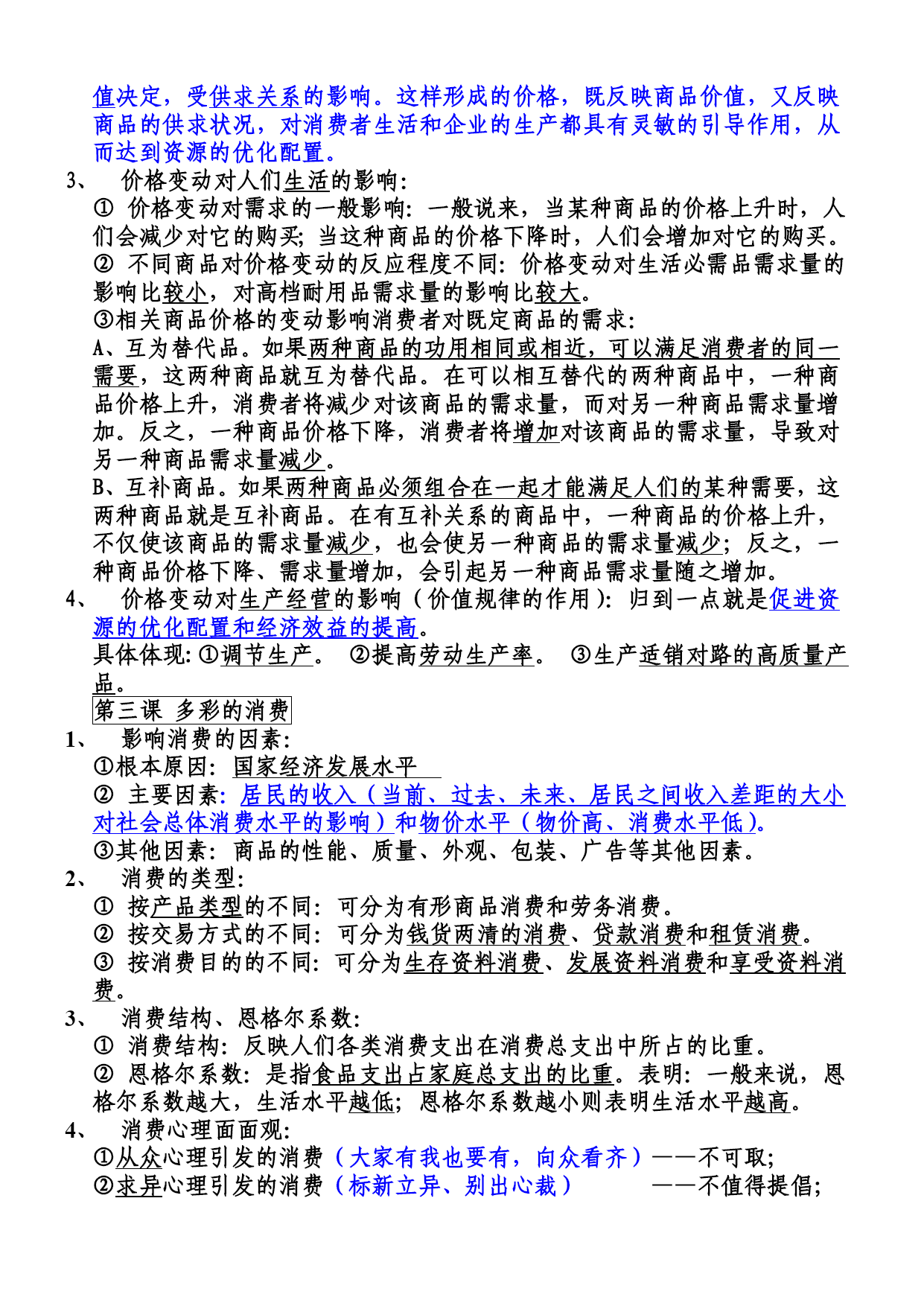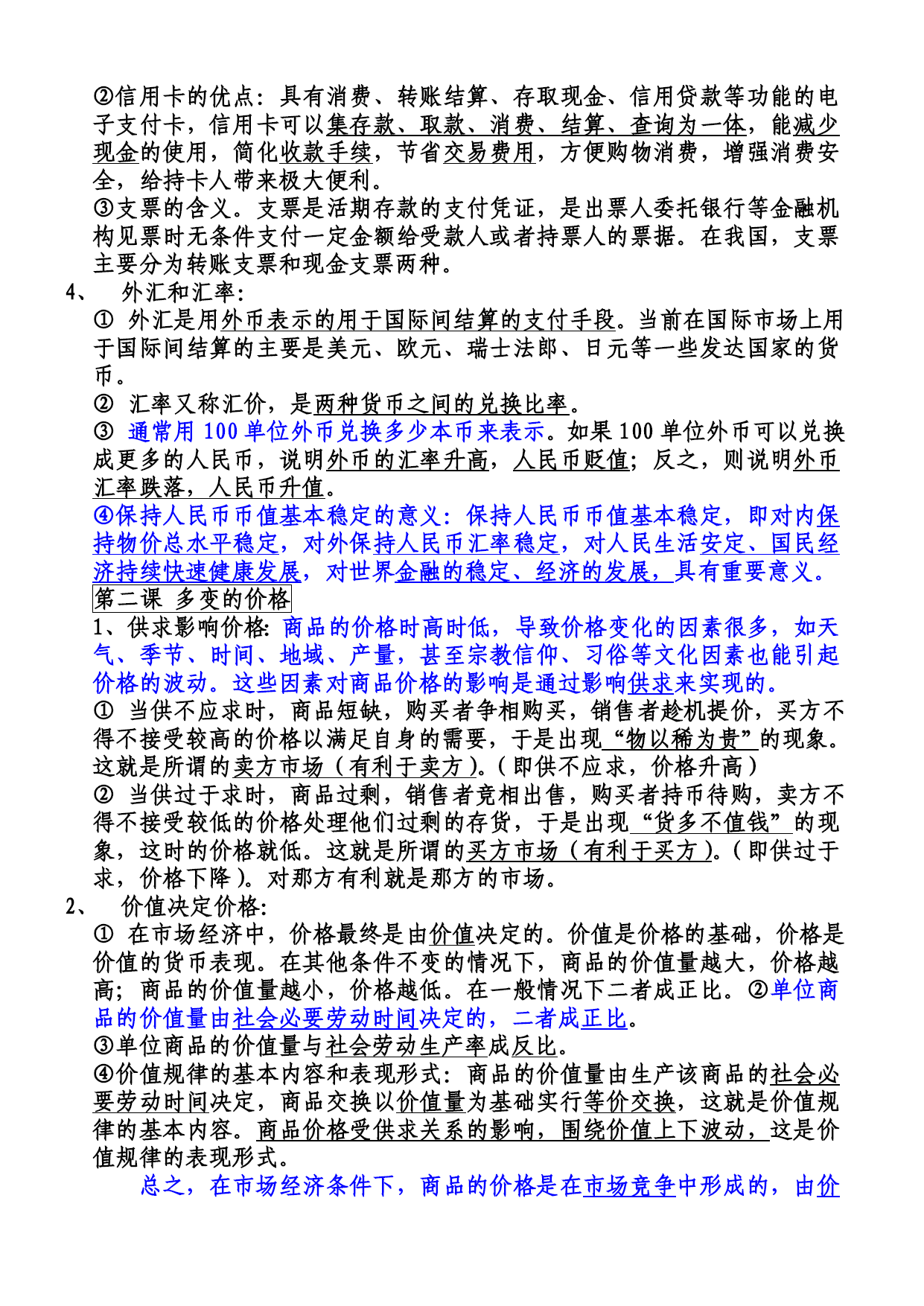 背诵要点之一——经济生活第一单元生活与消费第一课神奇的货币商品及其基本属性:①商品是用于交换的劳动产品。②从含义上看,作为商品必须同时具备两个条件:第一,必须是劳动产品,不是劳动产品一定不是商品;第二,必须用于交换,不用于交换的劳动产品不是商品。③商品的两个基本属性是使用价值和价值。使用价值是价值的物质承担者,二者统一于商品中,缺一不可。货币的含义、本质和职能:①货币是从商品中分离出来固定的充当一般等价物的商品。②货币的本质是一般等价物。货币与其他一般等价物的区别在于是否固定的充当一般等价物。③货币具有价值尺度和流通手段两种基本职能。货币之所以能具有价值尺度职能,是因为货币本身是商品,也具有价值。货币在执行价值尺度职能时,只需要观念上的货币即可,并不需要现实的货币。货币充当价值尺度职能,一切商品的价值都由货币来表现,商品价值就表现为商品的价格。价格有价值决定,价格是价值的货币表现。货币的流通手段职能是指货币充当商品交换媒介的职能,又叫购买手段职能。作为流通手段的货币,必须是实实在在的货币,而不能只是观念上的货币;货币充当流通手段职能后,原来的商品交换(商品一商品)变成以货币为媒介的商品流通(商品一货币一商品)。货币还具有贮藏手段、支付手段、世界货币的职能。④流通中实际需要的货币量=商品价格总额(待受商品量X价格水平)/货币流通次数。纸币及其发行规律:①纸币是国家(或某些地区)发行的、强制使用的价值符号。纸币本身没有价值,它只是代替金属货币执行流通手段和支付手段的职能。没有价值尺度和贮藏手段的职能。②纸币发行量必须以流通中所需要的货币量为限度,如果不相符,则可能出现通货膨胀或通货紧缩经济现象,势必会影响人们的经济生活和杜会经济秩序。通货膨胀和通货紧缩都是总供给与总需求之间的不平衡造成的。③通货膨胀指的是纸币贬值、物价上涨的现象,纸币的发行量超过流通中所需要的货币量是导致通货膨胀的主要原因之一。④通货紧缩是一种与通货膨胀相反的经济现象,表现为物价全面持续下跌,通常伴随着经济衰退出现。4、信用工具:①结算通常有两种方式:一是现金结算,二是转账结算,信用卡、支票就是经济往来结算中经常使用的信用工具。②信用卡的优点:具有消费、转账结算、存取现金、信用贷款等功能的电子支付卡,信用卡可以集存款、取款、消费、结算、查询为一体,能减少现金的使用,简化收款手续,节省交易费用,方便购物消费,增强消费安全,给持卡人带来极大便利。③支票的含义。支票是活期存款的支付凭证,是出票人委托银行等金融机构见票时无条件支付一定金额给受款人或者持票人的票据。在我国,支票主要分为转账支票和现金支票两种。外汇和汇率:①外汇是用外币表示的用于国际间结算的支付手段。当前在国际市场上用于国际间结算的主要是美元、欧元、瑞士法郎、日元等一些发达国家的货币。②汇率又称汇价,是两种货币之间的兑换比率。③通常用100单位外币兑换多少本币来表示。如果100单位外币可以兑换成更多的人民币,说明外币的汇率升高,人民币贬值;反之,则说明外币汇率跌落,人民币升值。④保持人民币币值基本稳定的意义:保持人民币币值基本稳定,即对内保持物价总水平稳定,对外保持人民币汇率稳定,对人民生活安定、国民经济持续快速健康发展,对世界金融的稳定、经济的发展,具有重要意义。第二课多变的价格1、供求影响价格:商品的价格时高时低,导致价格变化的因素很多,如天气、季节、时间、地域、产量,甚至宗教信仰、习俗等文化因素也能引起价格的波动。这些因素对商品价格的影响是通过影响供求来实现的。①当供不应求时,商品短缺,购买者争相购买,销售者趁机提价,买方不得不接受较高的价格以满足自身的需要,于是出现“物以稀为贵”的现象。这就是所谓的卖方市场(有利于卖方)。(即供不应求,价格升高)②当供过于求时,商品过剩,销售者竞相出售,购买者持币待购,卖方不得不接受较低的价格处理他们过剩的存货,于是出现“货多不值钱”的现象,这时的价格就低。这就是所谓的买方市场(有利于买方)。(即供过于求,价格下降)。对那方有利就是那方的市场。价值决定价格:①在市场经济中,价格最终是由价值决定的。价值是价格的基础,价格是价值的货币表现。在其他条件不变的情况下,商品的价值量越大,价格越高;商品的价值量越小,价格越低。在一般情况下二者成正比。②单位商品的价值量由社会必要劳动时间决定的,二者成正比。③单位商品的价值量与社会劳动生产率成反比。④价值规律的基本内容和表现形式:商品的价值量由生产该商品的社会必要劳动时间决定,商品交换以价值量为基础实行等价交换,这就是价值规律的基本内容。商品价格受供求关系的影响,围绕价值上下波动,这是价值规律的表现形式。总之,在市场经济条件下,商品的价格是在市场竞