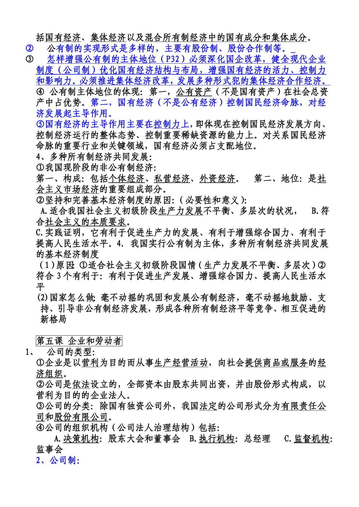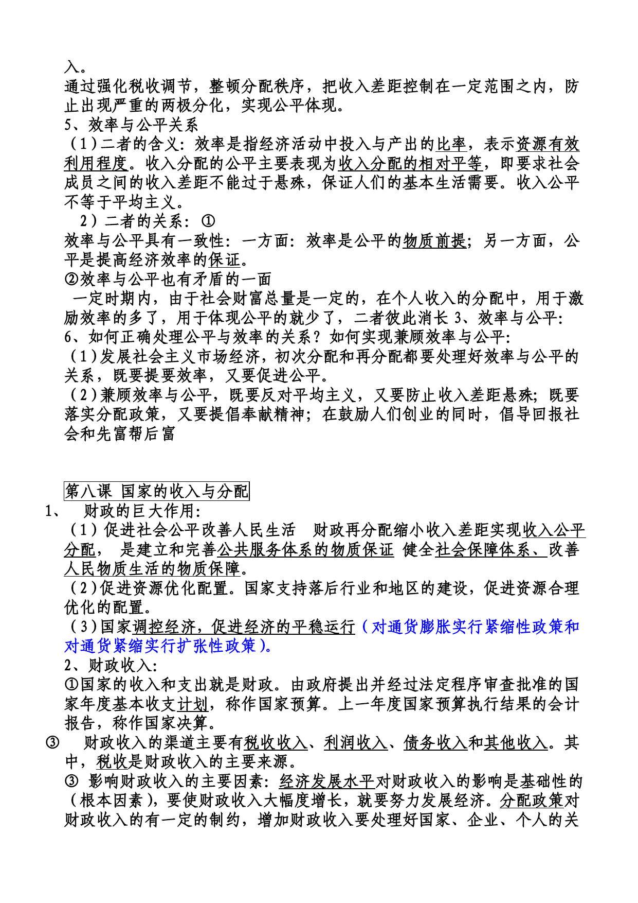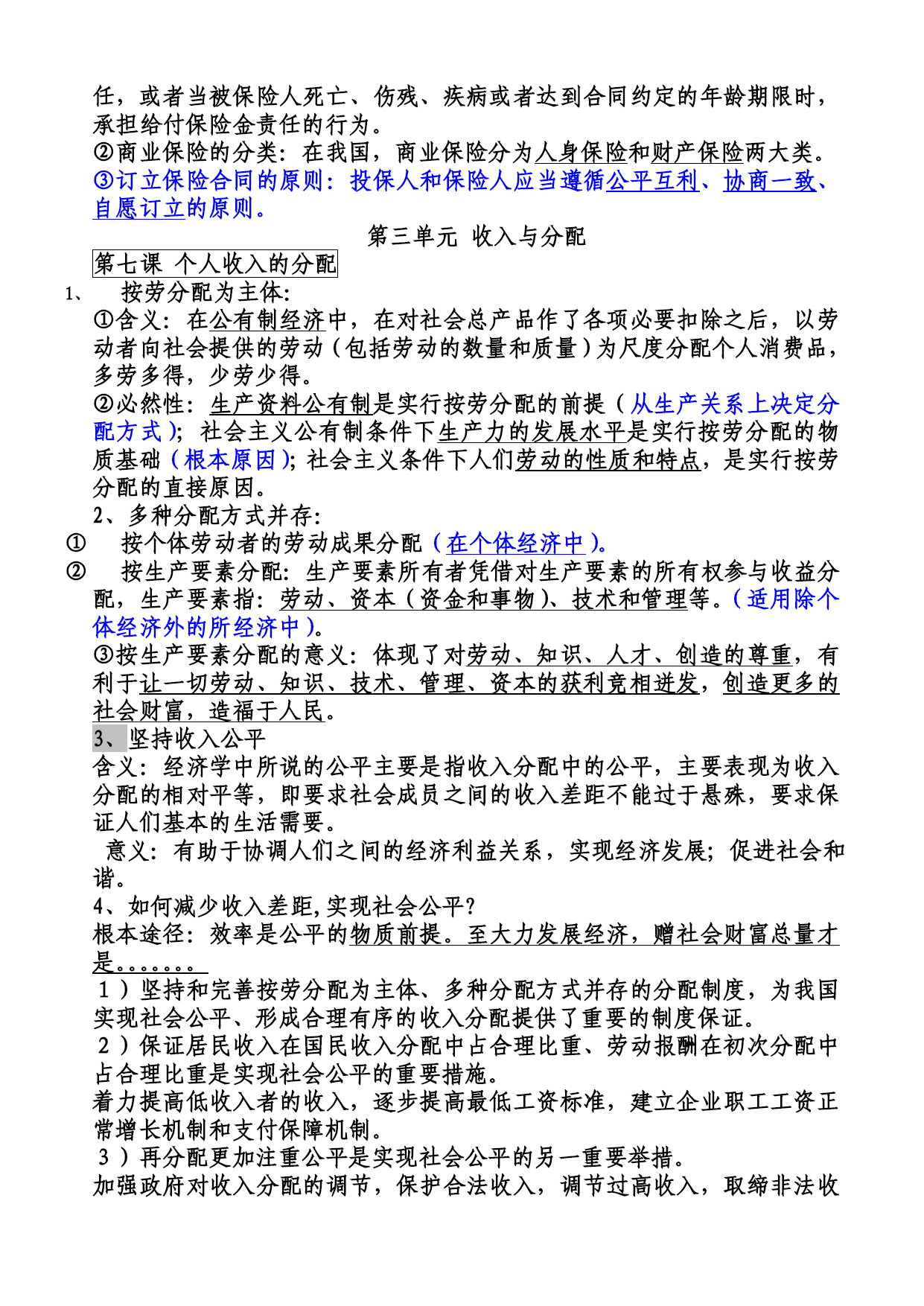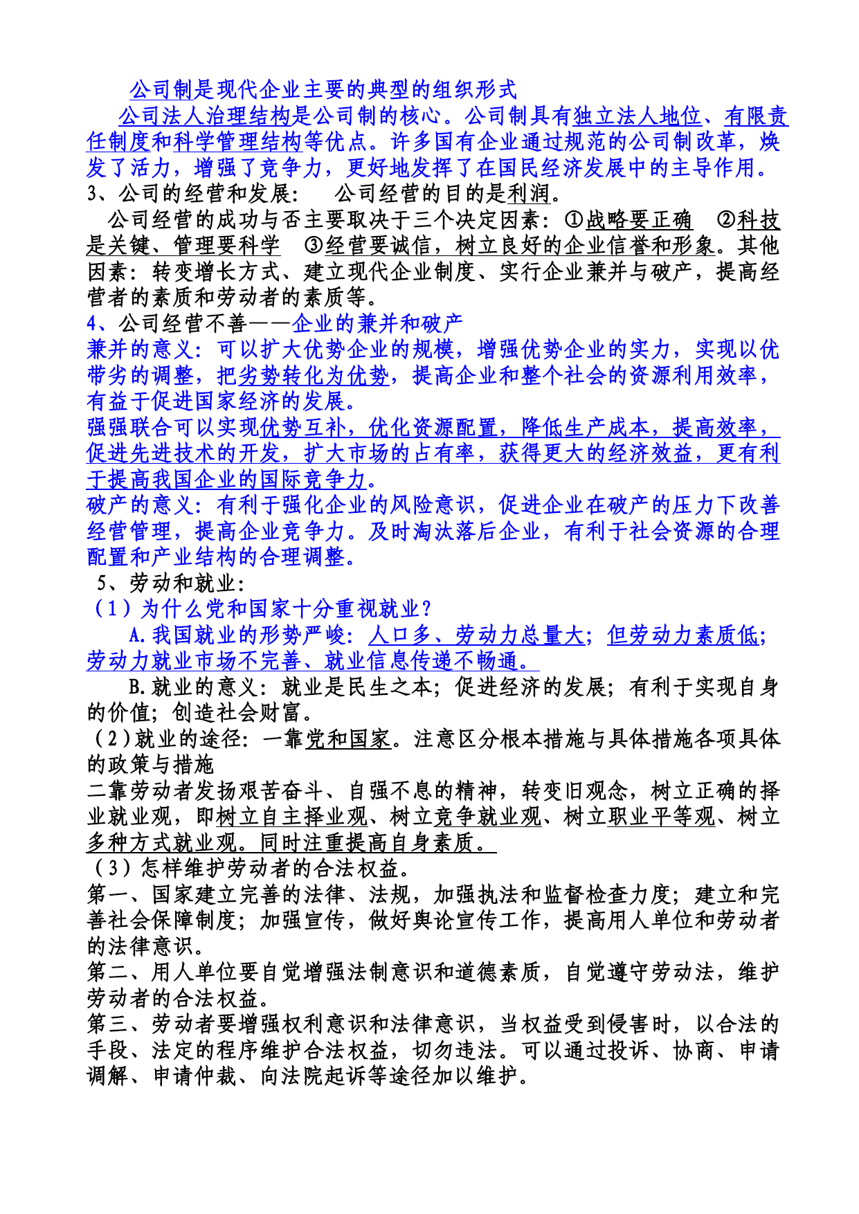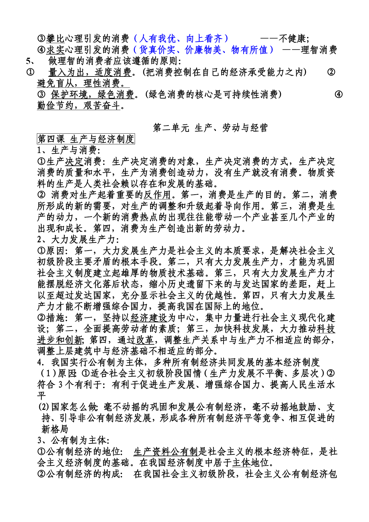 背诵要点之一——经济生活第一单元生活与消费第一课神奇的货币商品及其基本属性:①商品是用于交换的劳动产品。②从含义上看,作为商品必须同时具备两个条件:第一,必须是劳动产品,不是劳动产品一定不是商品;第二,必须用于交换,不用于交换的劳动产品不是商品。③商品的两个基本属性是使用价值和价值。使用价值是价值的物质承担者,二者统一于商品中,缺一不可。货币的含义、本质和职能:①货币是从商品中分离出来固定的充当一般等价物的商品。②货币的本质是一般等价物。货币与其他一般等价物的区别在于是否固定的充当一般等价物。③货币具有价值尺度和流通手段两种基本职能。货币之所以能具有价值尺度职能,是因为货币本身是商品,也具有价值。货币在执行价值尺度职能时,只需要观念上的货币即可,并不需要现实的货币。货币充当价值尺度职能,一切商品的价值都由货币来表现,商品价值就表现为商品的价格。价格有价值决定,价格是价值的货币表现。货币的流通手段职能是指货币充当商品交换媒介的职能,又叫购买手段职能。作为流通手段的货币,必须是实实在在的货币,而不能只是观念上的货币;货币充当流通手段职能后,原来的商品交换(商品一商品)变成以货币为媒介的商品流通(商品一货币一商品)。货币还具有贮藏手段、支付手段、世界货币的职能。④流通中实际需要的货币量=商品价格总额(待受商品量X价格水平)/货币流通次数。纸币及其发行规律:①纸币是国家(或某些地区)发行的、强制使用的价值符号。纸币本身没有价值,它只是代替金属货币执行流通手段和支付手段的职能。没有价值尺度和贮藏手段的职能。②纸币发行量必须以流通中所需要的货币量为限度,如果不相符,则可能出现通货膨胀或通货紧缩经济现象,势必会影响人们的经济生活和杜会经济秩序。通货膨胀和通货紧缩都是总供给与总需求之间的不平衡造成的。③通货膨胀指的是纸币贬值、物价上涨的现象,纸币的发行量超过流通中所需要的货币量是导致通货膨胀的主要原因之一。④通货紧缩是一种与通货膨胀相反的经济现象,表现为物价全面持续下跌,通常伴随着经济衰退出现。4、信用工具:①结算通常有两种方式:一是现金结算,二是转账结算,信用卡、支票就是经济往来结算中经常使用的信用工具。②信用卡的优点:具有消费、转账结算、存取现金、信用贷款等功能的电子支付卡,信用卡可以集存款、取款、消费、结算、查询为一体,能减少现金的使用,简化收款手续,节省交易费用,方便购物消费,增强消费安全,给持卡人带来极大便利。③支票的含义。支票是活期存款的支付凭证,是出票人委托银行等金融机构见票时无条件支付一定金额给受款人或者持票人的票据。在我国,支票主要分为转账支票和现金支票两种。外汇和汇率:①外汇是用外币表示的用于国际间结算的支付手段。当前在国际市场上用于国际间结算的主要是美元、欧元、瑞士法郎、日元等一些发达国家的货币。②汇率又称汇价,是两种货币之间的兑换比率。③通常用100单位外币兑换多少本币来表示。如果100单位外币可以兑换成更多的人民币,说明外币的汇率升高,人民币贬值;反之,则说明外币汇率跌落,人民币升值。④保持人民币币值基本稳定的意义:保持人民币币值基本稳定,即对内保持物价总水平稳定,对外保持人民币汇率稳定,对人民生活安定、国民经济持续快速健康发展,对世界金融的稳定、经济的发展,具有重要意义。第二课多变的价格1、供求影响价格:商品的价格时高时低,导致价格变化的因素很多,如天气、季节、时间、地域、产量,甚至宗教信仰、习俗等文化因素也能引起价格的波动。这些因素对商品价格的影响是通过影响供求来实现的。①当供不应求时,商品短缺,购买者争相购买,销售者趁机提价,买方不得不接受较高的价格以满足自身的需要,于是出现“物以稀为贵”的现象。这就是所谓的卖方市场(有利于卖方)。(即供不应求,价格升高)②当供过于求时,商品过剩,销售者竞相出售,购买者持币待购,卖方不得不接受较低的价格处理他们过剩的存货,于是出现“货多不值钱”的现象,这时的价格就低。这就是所谓的买方市场(有利于买方)。(即供过于求,价格下降)。对那方有利就是那方的市场。价值决定价格:①在市场经济中,价格最终是由价值决定的。价值是价格的基础,价格是价值的货币表现。在其他条件不变的情况下,商品的价值量越大,价格越高;商品的价值量越小,价格越低。在一般情况下二者成正比。②单位商品的价值量由社会必要劳动时间决定的,二者成正比。③单位商品的价值量与社会劳动生产率成反比。④价值规律的基本内容和表现形式:商品的价值量由生产该商品的社会必要劳动时间决定,商品交换以价值量为基础实行等价交换,这就是价值规律的基本内容。商品价格受供求关系的影响,围绕价值上下波动,这是价值规律的表现形式。总之,在市场经济条件下,商品的价格是在市场竞