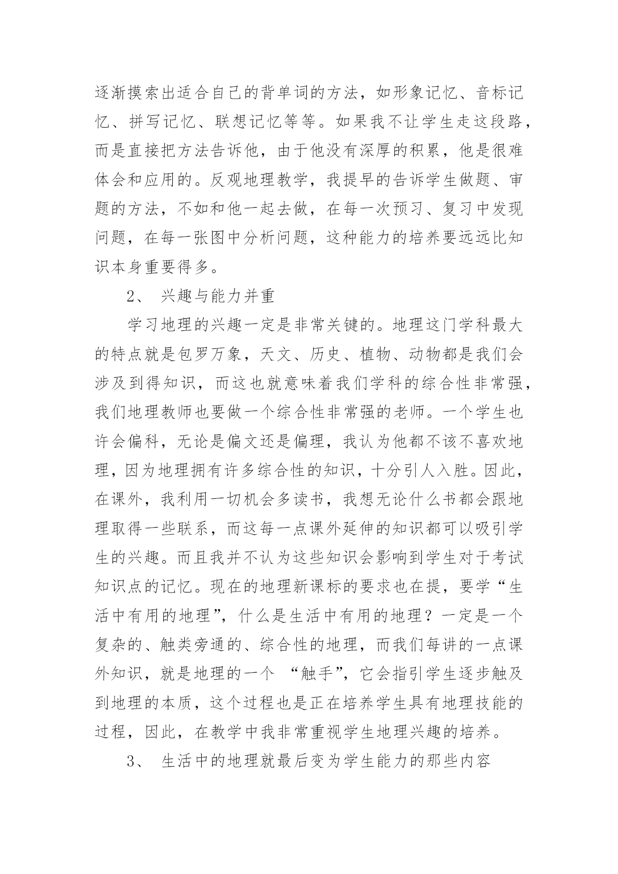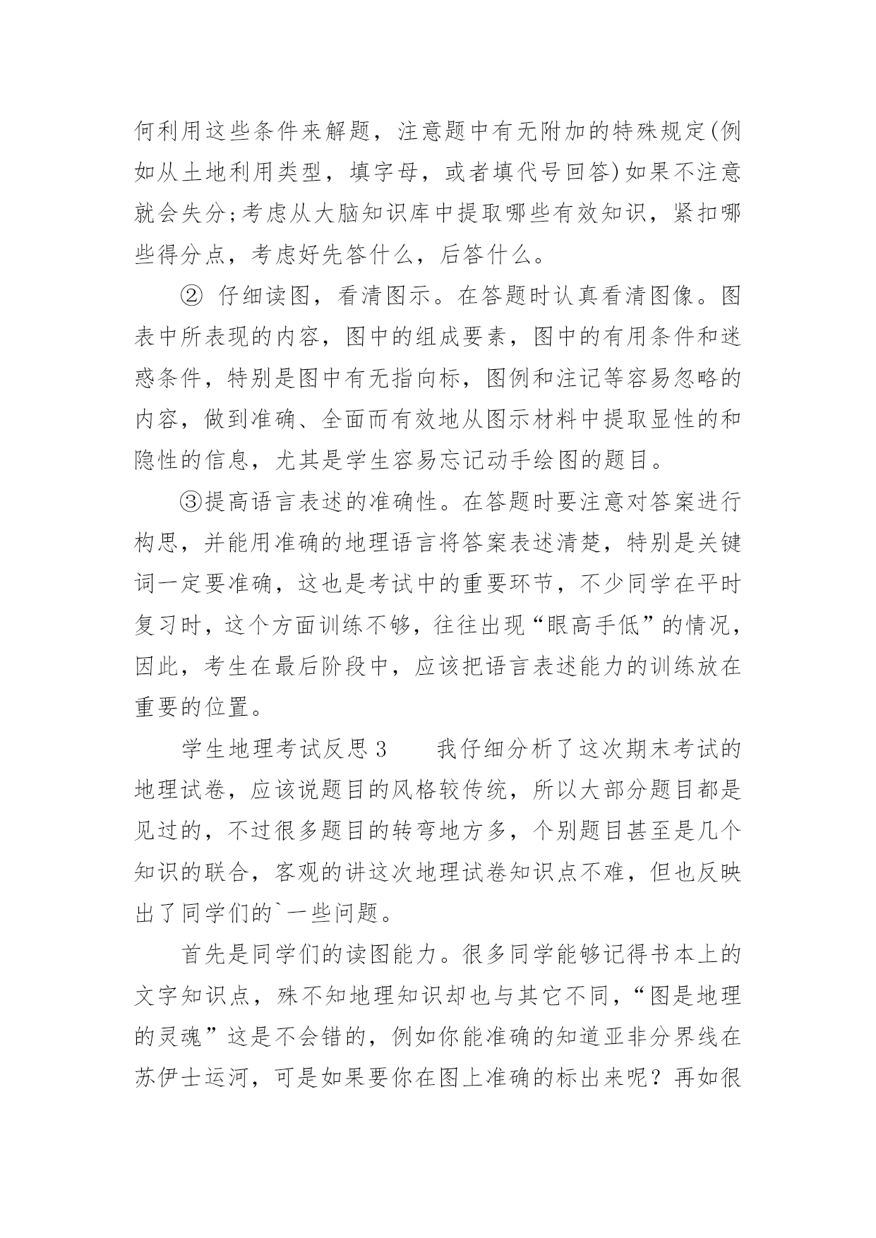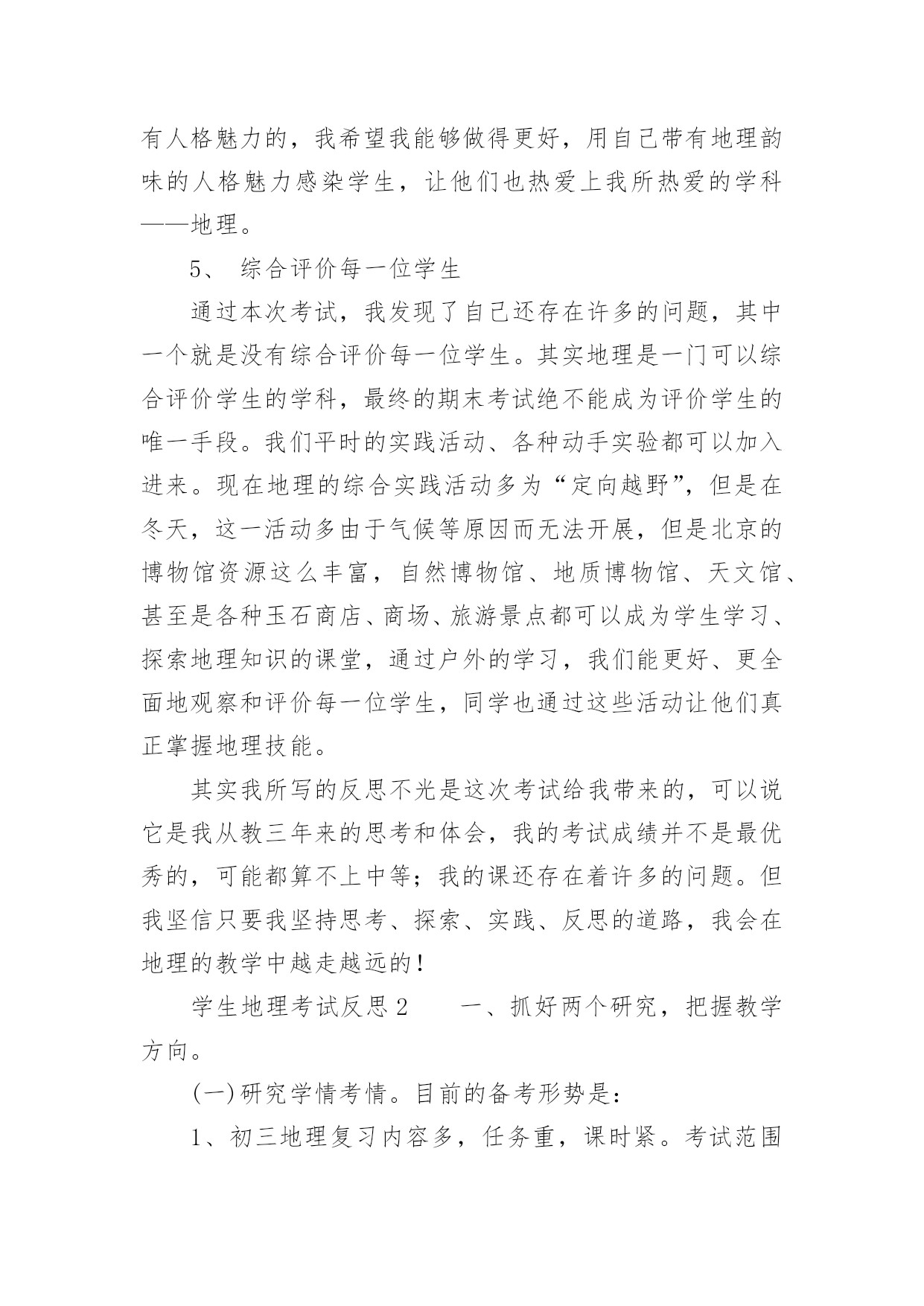 学生地理考试反思学生地理考试反思(通用12篇)在快速变化和不断变革的今天,我们要有很强的课堂教学能力,反思是思考过去的事情,从中总结经验教训。那么反思应该怎么写才合适呢?下面是小编精心整理的学生地理考试反思(通用7篇),欢迎阅读,希望大家能够喜欢。学生地理考试反思1通过这次期末考试,我发现在我的教学过程中还有许多需要提高和加强的地方,但是我也看到三年的成长在我的身上留下了深刻的烙印,许多的方法我再不断地尝试和总结之中,只要我能继续坚持刻苦学习、积极探索方法、及时进行经验总结,我相信我能把我们的学生培养成为真正具有地理技能的人。下面将我的反思简述如下:1、授人以鱼不如授人以渔以前我总是希望学生能够掌握书中的所有知识点,于是课前做非常精心地准备,把每一个知识点都画出来,把重点的知识点圈出,然后要在课堂上重点讲授。但是我发现学生变懒了,他们习惯于依赖我画的知识点,依赖我的课件、板书,而他们自己的地理学习能力并没有变强。现在我会把这一提前预习的工作交给学生,让他们读书发现本节课的重点,发现应该怎样学习。其实有的时候地理学习的过程有点像是背单词,最开始的时候都是死记硬背,根本就没有方法可言,但是只有通过前期这样艰苦的积累过程,才会在日后逐渐摸索出适合自己的背单词的方法,如形象记忆、音标记忆、拼写记忆、联想记忆等等。如果我不让学生走这段路,而是直接把方法告诉他,由于他没有深厚的积累,他是很难体会和应用的。反观地理教学,我提早的告诉学生做题、审题的方法,不如和他一起去做,在每一次预习、复习中发现问题,在每一张图中分析问题,这种能力的培养要远远比知识本身重要得多。2、兴趣与能力并重学习地理的兴趣一定是非常关键的。地理这门学科最大的特点就是包罗万象,天文、历史、植物、动物都是我们会涉及到得知识,而这也就意味着我们学科的综合性非常强,我们地理教师也要做一个综合性非常强的老师。一个学生也许会偏科,无论是偏文还是偏理,我认为他都不该不喜欢地理,因为地理拥有许多综合性的知识,十分引人入胜。因此,在课外,我利用一切机会多读书,我想无论什么书都会跟地理取得一些联系,而这每一点课外延伸的知识都可以吸引学生的兴趣。而且我并不认为这些知识会影响到学生对于考试知识点的记忆。现在的地理新课标的要求也在提,要学“生活中有用的地理”,什么是生活中有用的地理?一定是一个复杂的、触类旁通的、综合性的地理,而我们每讲的一点课外知识,就是地理的一个“触手”,它会指引学生逐步触及到地理的本质,这个过程也是正在培养学生具有地理技能的过程,因此,在教学中我非常重视学生地理兴趣的培养。3、生活中的地理就最后变为学生能力的那些内容记得有一次听一个讲座,有一位专家问我们“你的教学学生到底学到了什么?”我们在底下窃窃私语,有的说是考试会的那些,有的说是能够解决实际问题的那些,那位专家摇了摇头,说道“学生最终学到的是当他有一天不再学习了,毕业了、工作了把该忘得都忘了,而最终记得的那些!”这句话深深地刻在了我的脑子里。我反问我自己,之前我讲的那么多知识会不会随着时间的推移而被学生淡忘,有多少会跟随他们终生,而跟随他们终生的,我就认为是“地理技能”了。想让学生记住一个知识点很容易,但真让他把所学地理知识转化为地理技能却并不容易。这也是我们新课标要求的最高境界“学生活中有用的地理”。现在,我会刻意地带领学生运用地理知识解决一些实际问题,会让他们在心中运用地理思维思考问题,虽然是刚刚开始,但是我发现,现在很少有学生会再用一次性餐具吃饭,每当学生厕所和水房泡水的时候同学们都会自觉地告诉老师或想办法解决,这就是生活中的地理思维吧,是一种潜移默化可以指导终身的人生观和价值观。4、地理的思维方式是通过每一次接触培养出来的作为一名地理教师,每周真正与学生接触的机会也就两节课,这可大大地不够用,要想让学生掌握地理的.技能一定要多于学生接触,只有在不断地接触中,带领学生共同思考、成长、解决问题,这样才能让学生掌握地理技能。因此,我利用一切可能的机会参加到我所教各班的各种活动,班会、运动会上经常能看到我和他们在一起的身影。我相信,人是有人格魅力的,我希望我能够做得更好,用自己带有地理韵味的人格魅力感染学生,让他们也热爱上我所热爱的学科——地理。5、综合评价每一位学生通过本次考试,我发现了自己还存在许多的问题,其中一个就是没有综合评价每一位学生。其实地理是一门可以综合评价学生的学科,最终的期末考试绝不能成为评价学生的唯一手段。我们平时的实践活动、各种动手实验都可以加入进来。现在地理的综合实践活动多为“定向越野”,但是在冬天,这一活动多由于气候等原因而无法开展,但是北京的博物馆资源这么丰富,自然博物馆、地质博物馆、天文馆、甚至是各种玉石商店、商场、旅游景点都可以成为学生学习、探索地理知识的课堂,通过户外的学习,我们能
