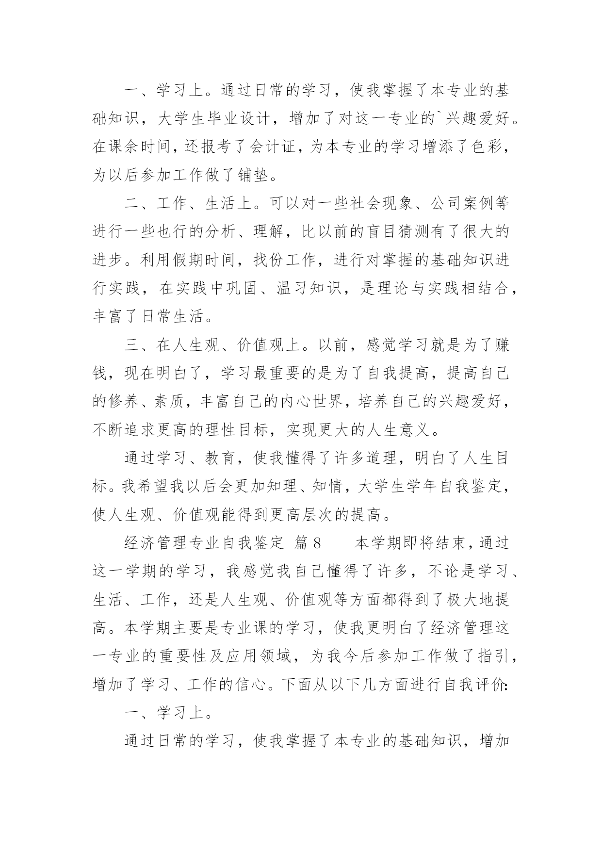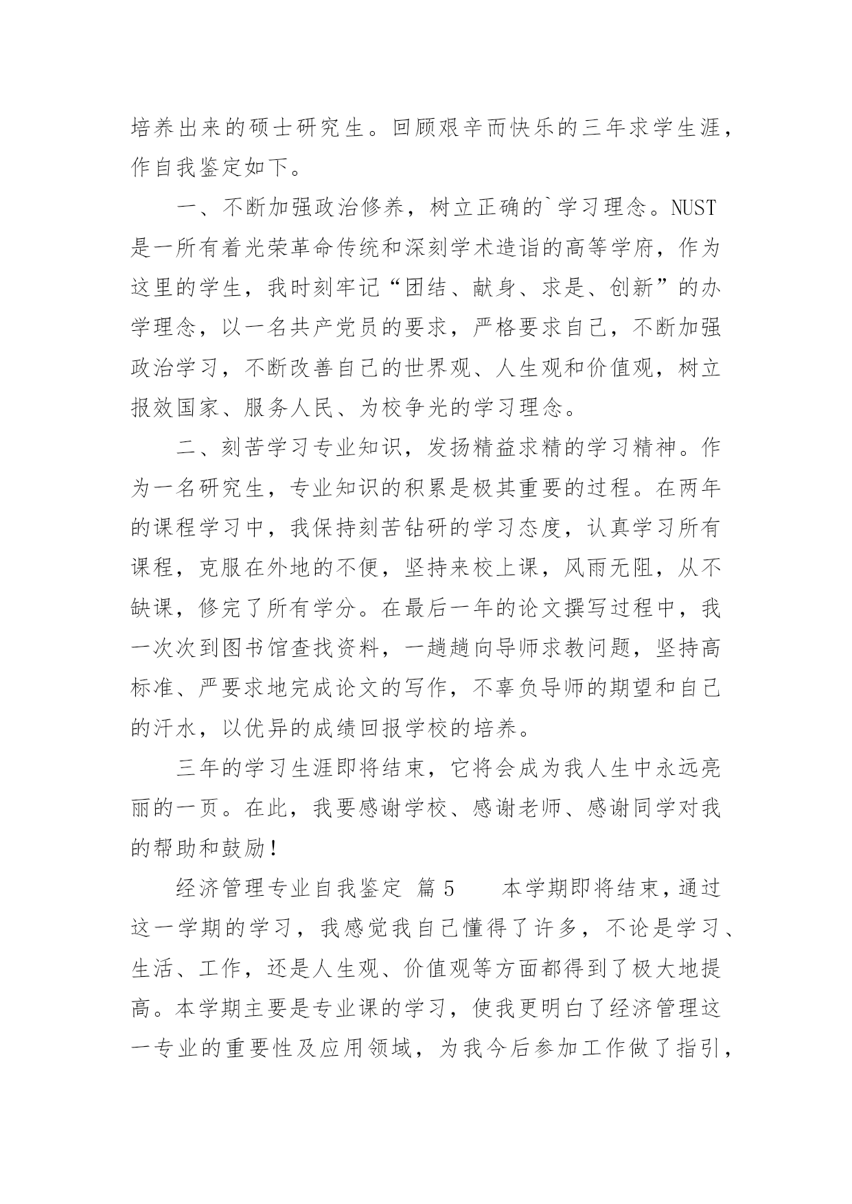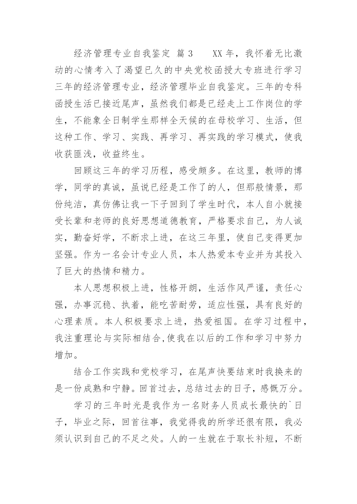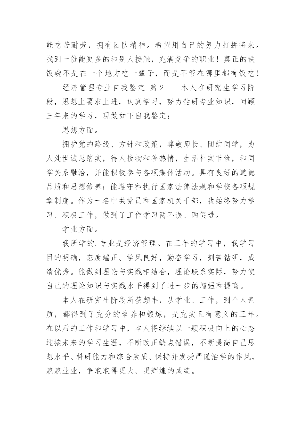 经济管理专业自我鉴定经济管理专业自我鉴定(合集12篇)自我鉴定是个人在一个阶段的自我总结,自我鉴定使我们及时找出错误并改正,因此我们要做好总结,写好自我鉴定。你所见过的自我鉴定应该是什么样的?下面是小编精心整理的经济管理专业自我鉴定,供大家参考借鉴,希望可以帮助到有需要的朋友。经济管理专业自我鉴定篇1本学期即将结束,通过这一学期的学习,我感觉我自己懂得了许多,不论是学习、生活、工作,还是人生观、价值观等方面都得到了极大地提高。本学期主要是专业课的学习,使我更明白了经济管理这一专业的重要性及应用领域,为我今后参加工作做了指引,增加了学习、工作的信心。下面从以下几方面进行自我评价:一、学习上。通过日常的学习,使我掌握了本专业的基础知识,增加了对这一专业的兴趣爱好。在课余时间,还报考了会计证,为本专业的学习增添了色彩,为以后参加工作做了铺垫。二、工作、生活上。可以对一些社会现象、公司案例等进行一些也行的分析、理解,比以前的盲目猜测有了很大的进步。利用假期时间,找份工作,进行对掌握的基础知识进行实践,在实践中巩固、温习知识,是理论与实践相结合,丰富了日常生活。三、在人生观、价值观上。以前,感觉学习就是为了赚钱,现在明白了,学习最重要的是为了自我提高,提高自己的修养、素质,丰富自己的内心世界,培养自己的兴趣爱好,不断追求更高的理性目标,实现更大的人生意义。通过学习、教育,使我懂得了许多道理,明白了人生目标。我希望我以后会更加知理、知情,使人生观、价值观能得到更高层次的提高。经过大学四年机电一体化专业课程的学习,谦虚自律的我,乐观向上、为人真诚、坦率,能吃苦耐劳具有团队合作精神,有较强的适应能力和自学能力,不易受外界环境的干扰,在学习上,我成绩良好,多次获得奖学金,通过课余时间学习参加自学考试(建筑工程),参加浙江省的计算机等级考试现已通过一级windows、二级(vb)、三级(网络技术)。在深透课本知识的同时,注重理论与实践的结合工作,利用课余时间进行多种计算机软件的学习和运用。在面对学校的每一次实习时都认真对待,争取做到最好,能够学到更多的专业知识,在得到了各位老师好评的同时候,也为以后的工作打下基础。作为一个大学生,我想最重要的不是说他的书读的有多好,而是他应该具备怎么的素质才能在这个社会的残酷竞争中生存下来!我觉得每个人都有适合自己的路,也有自己的`谋生手段。能通过社会的竞争生存会比其他方式生存更加让人兴奋,试问哪个企业不是在竞争中成长起来的,所以竞争是企业存活的生命线。说到我自己,是个很平凡的人!但是我也有自己的品质,我热爱生活,喜欢拼搏,为人真诚还能吃苦耐劳,拥有团队精神。希望用自己的努力打拼将来。找到一份能更多的和别人接触,充满竞争的职业!真正的铁饭碗不是在一个地方吃一辈子,而是不管在哪里都有饭吃!经济管理专业自我鉴定篇2本人在研究生学习阶段,思想上要求上进,认真学习,努力钻研专业知识,回顾三年来的学习,现做如下自我鉴定:思想方面。拥护党的路线、方针和政策,尊敬师长、团结同学,为人处世诚恳踏实,待人接物和善热情,生活朴实节俭,和同学关系融洽,并能积极参与各项集体活动。具有良好的道德品质和思想修养;能遵守和执行国家法律法规和学校各项规章制度。作为一名中共党员和国家机关干部,我始终努力学习、积极工作,做到了工作学习两不误、两促进。学业方面。我所学的.专业是经济管理。在三年的学习中,我学习目的明确,态度端正、学风良好,勤奋学习,刻苦钻研,成绩优秀。能做到理论与实践相结合,理论联系实际,努力使自己的理论知识与实践水平得到了进一步的增强和提高。本人在研究生阶段所获颇丰,从学业、工作,到个人素质,都得到了充分的培养和锻炼,是充实且有意义的三年。在以后的工作和学习中,本人将继续以一颗积极向上的心态迎接未来的学习生涯,不断改正缺点错误,不断提高自己思想水平、科研能力和综合素质。保持并发扬严谨治学的作风,兢兢业业,争取取得更大、更辉煌的成绩。经济管理专业自我鉴定篇3XX年,我怀着无比激动的心情考入了渴望已久的中央党校函授大专班进行学习三年的经济管理专业,经济管理毕业自我鉴定。三年的专科函授生活已接近尾声,虽然我们都是已经走上工作岗位的学生,不能象全日制学生那样全天候的在母校学习、生活,但这种工作、学习、实践、再学习、再实践的学习模式,使我收获匪浅,收益终生。回顾这三年的学习历程,感受颇多。在这里,教师的博学,同学的真诚,虽说已经是工作了的人,但那般情景,那份纯洁,真仿佛让我一下子回到了学生时代,本人自小就接受长辈和老师的良好思想道德教育,严格要求自己,为人诚实,勤奋好学,不断求上进,在这三年里,使自己变得更加坚强。作为一名会计专业人员,本人热爱本专业并为其投入了巨大的热情和精力。本人思想积极上进,性格开朗,生活作风严谨,责任心强,办事沉稳