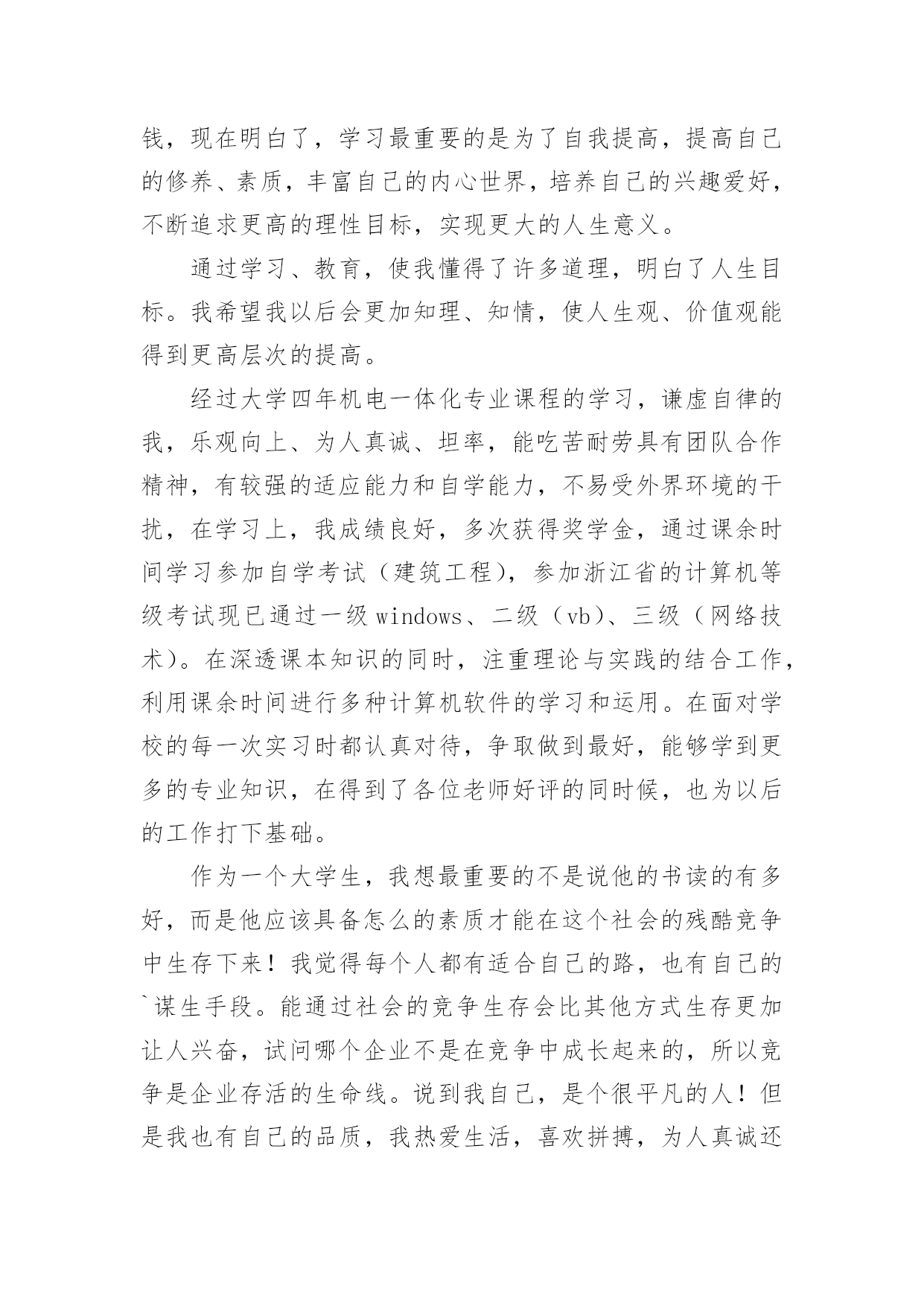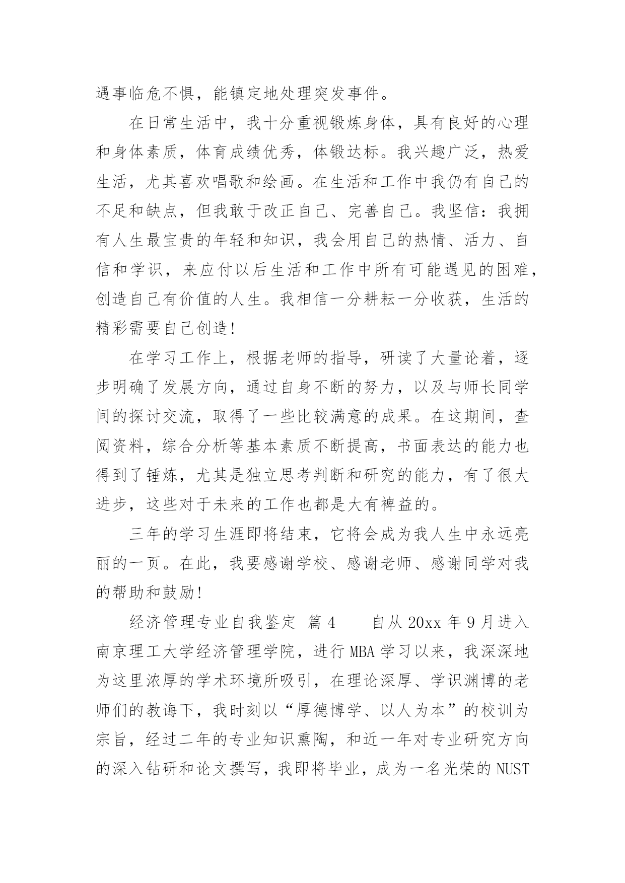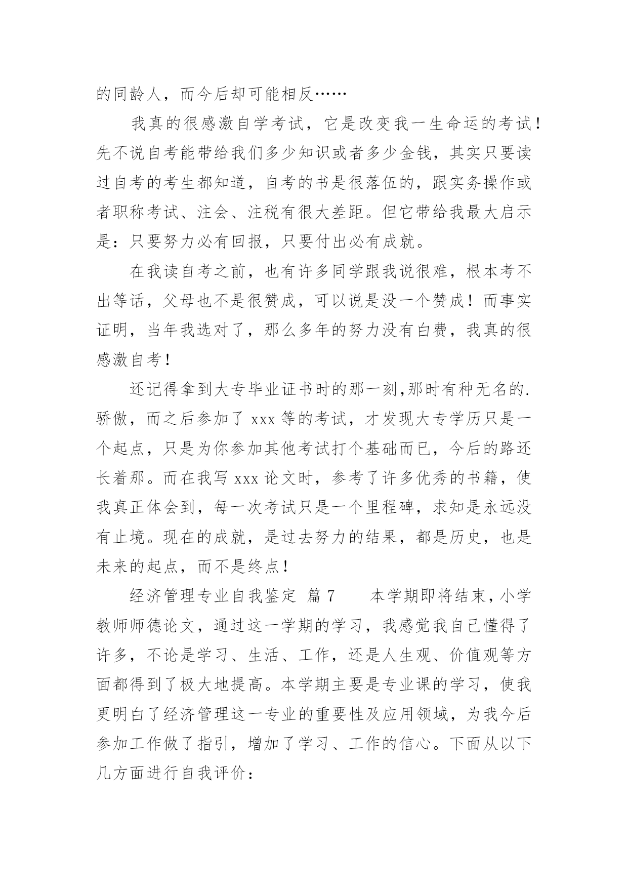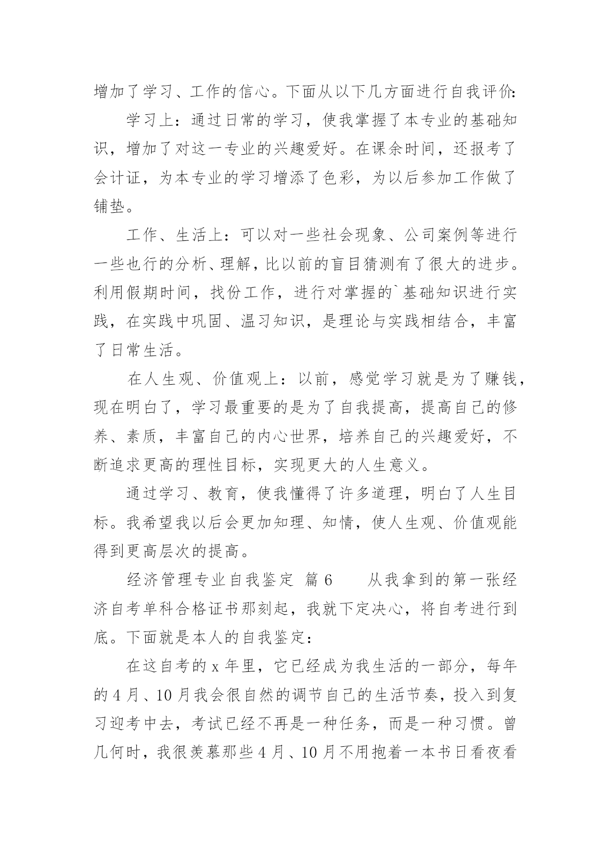 经济管理专业自我鉴定经济管理专业自我鉴定(合集12篇)自我鉴定是个人在一个阶段的自我总结,自我鉴定使我们及时找出错误并改正,因此我们要做好总结,写好自我鉴定。你所见过的自我鉴定应该是什么样的?下面是小编精心整理的经济管理专业自我鉴定,供大家参考借鉴,希望可以帮助到有需要的朋友。经济管理专业自我鉴定篇1本学期即将结束,通过这一学期的学习,我感觉我自己懂得了许多,不论是学习、生活、工作,还是人生观、价值观等方面都得到了极大地提高。本学期主要是专业课的学习,使我更明白了经济管理这一专业的重要性及应用领域,为我今后参加工作做了指引,增加了学习、工作的信心。下面从以下几方面进行自我评价:一、学习上。通过日常的学习,使我掌握了本专业的基础知识,增加了对这一专业的兴趣爱好。在课余时间,还报考了会计证,为本专业的学习增添了色彩,为以后参加工作做了铺垫。二、工作、生活上。可以对一些社会现象、公司案例等进行一些也行的分析、理解,比以前的盲目猜测有了很大的进步。利用假期时间,找份工作,进行对掌握的基础知识进行实践,在实践中巩固、温习知识,是理论与实践相结合,丰富了日常生活。三、在人生观、价值观上。以前,感觉学习就是为了赚钱,现在明白了,学习最重要的是为了自我提高,提高自己的修养、素质,丰富自己的内心世界,培养自己的兴趣爱好,不断追求更高的理性目标,实现更大的人生意义。通过学习、教育,使我懂得了许多道理,明白了人生目标。我希望我以后会更加知理、知情,使人生观、价值观能得到更高层次的提高。经过大学四年机电一体化专业课程的学习,谦虚自律的我,乐观向上、为人真诚、坦率,能吃苦耐劳具有团队合作精神,有较强的适应能力和自学能力,不易受外界环境的干扰,在学习上,我成绩良好,多次获得奖学金,通过课余时间学习参加自学考试(建筑工程),参加浙江省的计算机等级考试现已通过一级windows、二级(vb)、三级(网络技术)。在深透课本知识的同时,注重理论与实践的结合工作,利用课余时间进行多种计算机软件的学习和运用。在面对学校的每一次实习时都认真对待,争取做到最好,能够学到更多的专业知识,在得到了各位老师好评的同时候,也为以后的工作打下基础。作为一个大学生,我想最重要的不是说他的书读的有多好,而是他应该具备怎么的素质才能在这个社会的残酷竞争中生存下来!我觉得每个人都有适合自己的路,也有自己的`谋生手段。能通过社会的竞争生存会比其他方式生存更加让人兴奋,试问哪个企业不是在竞争中成长起来的,所以竞争是企业存活的生命线。说到我自己,是个很平凡的人!但是我也有自己的品质,我热爱生活,喜欢拼搏,为人真诚还能吃苦耐劳,拥有团队精神。希望用自己的努力打拼将来。找到一份能更多的和别人接触,充满竞争的职业!真正的铁饭碗不是在一个地方吃一辈子,而是不管在哪里都有饭吃!经济管理专业自我鉴定篇2本人在研究生学习阶段,思想上要求上进,认真学习,努力钻研专业知识,回顾三年来的学习,现做如下自我鉴定:思想方面。拥护党的路线、方针和政策,尊敬师长、团结同学,为人处世诚恳踏实,待人接物和善热情,生活朴实节俭,和同学关系融洽,并能积极参与各项集体活动。具有良好的道德品质和思想修养;能遵守和执行国家法律法规和学校各项规章制度。作为一名中共党员和国家机关干部,我始终努力学习、积极工作,做到了工作学习两不误、两促进。学业方面。我所学的.专业是经济管理。在三年的学习中,我学习目的明确,态度端正、学风良好,勤奋学习,刻苦钻研,成绩优秀。能做到理论与实践相结合,理论联系实际,努力使自己的理论知识与实践水平得到了进一步的增强和提高。本人在研究生阶段所获颇丰,从学业、工作,到个人素质,都得到了充分的培养和锻炼,是充实且有意义的三年。在以后的工作和学习中,本人将继续以一颗积极向上的心态迎接未来的学习生涯,不断改正缺点错误,不断提高自己思想水平、科研能力和综合素质。保持并发扬严谨治学的作风,兢兢业业,争取取得更大、更辉煌的成绩。经济管理专业自我鉴定篇3XX年,我怀着无比激动的心情考入了渴望已久的中央党校函授大专班进行学习三年的经济管理专业,经济管理毕业自我鉴定。三年的专科函授生活已接近尾声,虽然我们都是已经走上工作岗位的学生,不能象全日制学生那样全天候的在母校学习、生活,但这种工作、学习、实践、再学习、再实践的学习模式,使我收获匪浅,收益终生。回顾这三年的学习历程,感受颇多。在这里,教师的博学,同学的真诚,虽说已经是工作了的人,但那般情景,那份纯洁,真仿佛让我一下子回到了学生时代,本人自小就接受长辈和老师的良好思想道德教育,严格要求自己,为人诚实,勤奋好学,不断求上进,在这三年里,使自己变得更加坚强。作为一名会计专业人员,本人热爱本专业并为其投入了巨大的热情和精力。本人思想积极上进,性格开朗,生活作风严谨,责任心强,办事沉稳