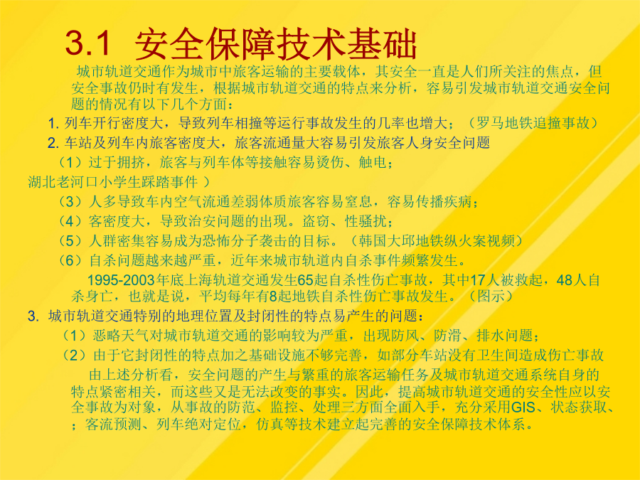 本章学习重点3.1安全保障技术基础原因:事后罗马地铁立即展开了调查,有关调查结果及事故原因分析如下:受损两列车皆为上线不到一年的新车,目前尚无机件故障迹象。基本排除车辆故障原因导致事故的发生。根据肇事列车司机员与行控中心的通联记录与地铁公司人员表示,司机是接获行控中心指示越过红灯继续前进(当运量较大时,类此调度命令可被接受)。司机员被授权的命令是保持警觉以最大时速15公里行进,事故后经调查证明列车追撞时之时速度约30公里)该国运输部已成立项目委员会深入调查。首要之务则为解读肇事列车之行车纪录器数据(黑匣子).8.26上海轨交6号线一男子跳轨遭列车撞击手臂被碾.3.6晚8点左右,上海轨道交通2号线陆家嘴站发生乘客跳轨事件,一名男子当场身亡,地铁运行受到短时影响。类似的事件在年初五也曾发生,一名女子跳轨当场身亡。事发后,网友纷纷发帖呼吁,地铁方面加快半封闭站台改造为全封闭的屏蔽门,从技术上杜绝跳轨自杀事件的发生。来源东方网)3.2地理信息系统(GIS)技术人造卫星上天因此,提高城市轨道交通的安全性应以安全事故为对象,从事故的防范、监控、处理三方面全面入手,充分采用GIS、状态获取、;(6)自杀问题越来越严重,近年来城市轨道内自杀事件频繁发生。GIS的空间分析可分为三个层次的内容:空间检索、空间拓扑叠加分析、空间模型分析。正是由于计算机仿真技术具备以上特点,计算机仿真技术被广泛的应用于城市轨道交通车务、机务、公务、电务等各个领域。司机员被授权的命令是保持警觉以最大时速15公里行进,事故后经调查证明列车追撞时之时速度约30公里)由于传统的视频监控系统通常在安全威胁发生时做出的响应和处理都比较慢,,很多情况下会影响到多个安全相关的部门在最短的时间内协调配合,共同处理危机。*除以上五大功能外,还有用户接口模块,用于接收用户的指令、程序、或数据,是用户和系统交互的工具。该国运输部已成立项目委员会深入调查。虽然可以用解析的方法解决问题,但数字的分析与计算过于复杂,这时计算机仿真可能提供简单可行的求解方法。地理信息系统的主要功能是什么?根据肇事列车司机员与行控中心的通联记录与地铁公司人员表示,司机是接获行控中心指示越过红灯继续前进(当运量较大时,类此调度命令可被接受)。视频监控不能系统很少会按照1:1的比例为监控摄像机配置监视器,这意味着对于那些机场、地铁等大型的视频监控系统来讲,各个监控点并非时刻处于监控当中。首要之务则为解读肇事列车之行车纪录器数据(黑匣子)因此我们需要智能视觉监控来改善监控效果,同时减轻保安人员的负担。由于传统的视频监控系统通常在安全威胁发生时做出的响应和处理都比较慢,,很多情况下会影响到多个安全相关的部门在最短的时间内协调配合,共同处理危机。GIS用于城市居民服务GIS在城市管理中的应用GIS在城市管理中的应用GIS用于道路交通管理3.2.2地理信息系统的组成3.3智能视频监控技术3.3.1智能视频监控技术的产生为什么需要智能视频监控3.3.1智能视频监控技术的产生3.3.2智能视频监控的关键技术及优势3.3.3智能视频监控的应用与发展智能视频监控的应用与发展3.4仿真技术仿真技术用于军事研究北京奥运会开幕式智能模拟仿真计算机仿真技术适用于解决以下问题:难以在实际环境中进行试验和观察时,计算机仿真是唯一可行的方法,例如地铁脱轨的研究。报警发生后要对监控录像进行分析,而漏报和误报更加重了进行数据分析的工作负担。由于传统的视频监控系统通常在安全威胁发生时做出的响应和处理都比较慢,,很多情况下会影响到多个安全相关的部门在最短的时间内协调配合,共同处理危机。2地理信息系统(GIS)技术湖北老河口小学生踩踏事件)因此,提高城市轨道交通的安全性应以安全事故为对象,从事故的防范、监控、处理三方面全面入手,充分采用GIS、状态获取、;难以用数学公式表示的系统,或没有建立和求解数学模型的有效方法。基本排除车辆故障原因导致事故的发生。主要由视频数据采集、视频数据编码、视频数据传输机数据分析处理和异常行为报警等部分组成。2智能视频监控的关键技术及优势地理信息系统的主要功能是什么?对于缺少解析表示的系统,或虽有解析表示但无法精确求解的系统,可以通过仿真获得系统运行的数值结果。误报是指位于监控点的安全活动被误认为安全威胁,从而产生错误的报警。另外安全人员经常被要求找出与报警事件相关的录像资料,找到肇事者、确定责任或评估该事件的安全威胁程度。计算机仿真的适用范围;(6)自杀问题越来越严重,近年来城市轨道内自杀事件频繁发生。传统的视频监控系统与设备虽然在功能和性能上得到了极