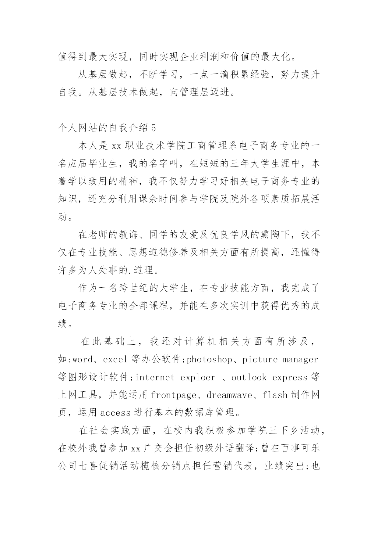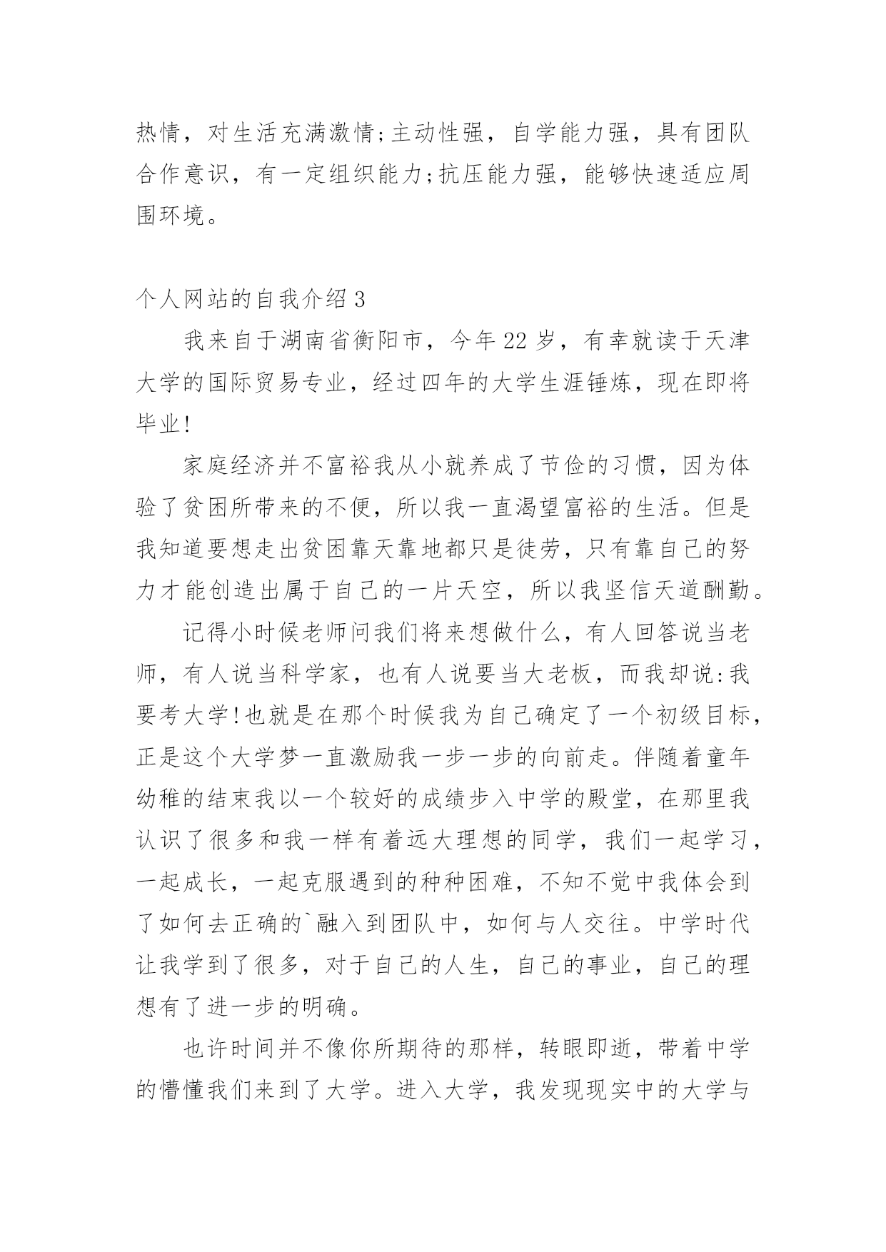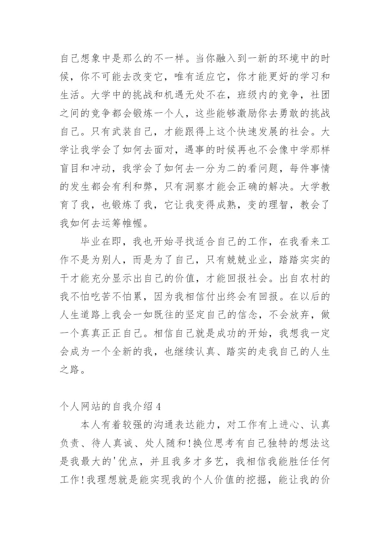 个人网站的自我介绍初到一个新的环境,我们总少不了要向他人介绍自己,自我介绍可以满足我们渴望得到尊重的心理。你所见过的自我介绍是什么样的呢?以下是小编精心整理的个人网站的自我介绍,欢迎阅读与收藏。个人网站的自我介绍1本人诚信开朗,热情真诚,团队意识强,时间观念强,易于接受新事物,乐于与人沟通,较强的适应能力和协调能力,能恪守以大局为重的原则。在校园生活期间,曾担任校园广播站站长,让我的组织协调能力、管理能力、应变能力、团队合作精神大大提升,使我具备良好的心理素质。进入社会工作之后,已慢慢学会耐心、用良好的感知为客户解答问题,已磨练出较强的`忍耐力和意志力。个人网站的自我介绍2一直以来,努力、积极、乐观、拼搏是我的'人生信条,我相信,我会一直努力下去,做好自己,奉献社会。敢做敢拼,脚踏实地;做事认真负责,责任心强;座右铭是“优秀是一种习惯”我的期望是在企事业单位从事管理、金融、行政、助理等与专业相关方面的工作。爱好所学专业,乐于学习新知识;对工作有责任心;踏实,热情,对生活充满激情;主动性强,自学能力强,具有团队合作意识,有一定组织能力;抗压能力强,能够快速适应周围环境。个人网站的自我介绍3我来自于湖南省衡阳市,今年22岁,有幸就读于天津大学的国际贸易专业,经过四年的大学生涯锤炼,现在即将毕业!家庭经济并不富裕我从小就养成了节俭的习惯,因为体验了贫困所带来的不便,所以我一直渴望富裕的生活。但是我知道要想走出贫困靠天靠地都只是徒劳,只有靠自己的努力才能创造出属于自己的一片天空,所以我坚信天道酬勤。记得小时候老师问我们将来想做什么,有人回答说当老师,有人说当科学家,也有人说要当大老板,而我却说:我要考大学!也就是在那个时候我为自己确定了一个初级目标,正是这个大学梦一直激励我一步一步的向前走。伴随着童年幼稚的结束我以一个较好的成绩步入中学的殿堂,在那里我认识了很多和我一样有着远大理想的同学,我们一起学习,一起成长,一起克服遇到的种种困难,不知不觉中我体会到了如何去正确的`融入到团队中,如何与人交往。中学时代让我学到了很多,对于自己的人生,自己的事业,自己的理想有了进一步的明确。也许时间并不像你所期待的那样,转眼即逝,带着中学的懵懂我们来到了大学。进入大学,我发现现实中的大学与自己想象中是那么的不一样。当你融入到一新的环境中的时候,你不可能去改变它,唯有适应它,你才能更好的学习和生活。大学中的挑战和机遇无处不在,班级内的竞争,社团之间的竞争都会锻炼一个人,这些能够激励你去勇敢的挑战自己。只有武装自己,才能跟得上这个快速发展的社会。大学让我学会了如何去面对,遇事的时候再也不会像中学那样盲目和冲动,我学会了如何去一分为二的看问题,每件事情的发生都会有利和弊,只有洞察才能会正确的解决。大学教育了我,也锻炼了我,它让我变得成熟,变的理智,教会了我如何去运筹帷幄。毕业在即,我也开始寻找适合自己的工作,在我看来工作不是为别人,而是为了自己,只有兢兢业业,踏踏实实的干才能充分显示出自己的价值,才能回报社会。出自农村的我不怕吃苦不怕累,因为我相信付出终会有回报。在以后的人生道路上我会一如既往的坚定自己的信念,不会放弃,做一个真真正正自己。相信自己就是成功的开始,我想我一定会成为一个全新的我,也继续认真、踏实的走我自己的人生之路。个人网站的自我介绍4本人有着较强的沟通表达能力,对工作有上进心、认真负责、待人真诚、处人随和!换位思考有自己独特的想法这是我最大的'优点,并且我多才多艺,我相信我能胜任任何工作!我理想就是能实现我的个人价值的挖掘,能让我的价值得到最大实现,同时实现企业利润和价值的最大化。从基层做起,不断学习,一点一滴积累经验,努力提升自我。从基层技术做起,向管理层迈进。个人网站的自我介绍5本人是xx职业技术学院工商管理系电子商务专业的一名应届毕业生,我的名字叫,在短短的三年大学生涯中,本着学以致用的精神,我不仅努力学习好相关电子商务专业的知识,还充分利用课余时间参与学院及院外各项素质拓展活动。在老师的教诲、同学的友爱及优良学风的熏陶下,我不仅在专业技能、思想道德修养及相关方面有所提高,还懂得许多为人处事的.道理。作为一名跨世纪的大学生,在专业技能方面,我完成了电子商务专业的全部课程,并能在多次实训中获得优秀的成绩。在此基础上,我还对计算机相关方面有所涉及,如:word、excel等办公软件;photoshop、picturemanager等图形设计软件;internetexploer、outlookexpress等上网工具,并能运用frontpage、dreamwave、flash制作网页,运用access进行基本的数据库管理。在社会实践方面,在校内我积极参加学院三下乡活动,在校外我曾参加xx广交会担任初级外语翻译;曾在百事可乐公司七喜促销活