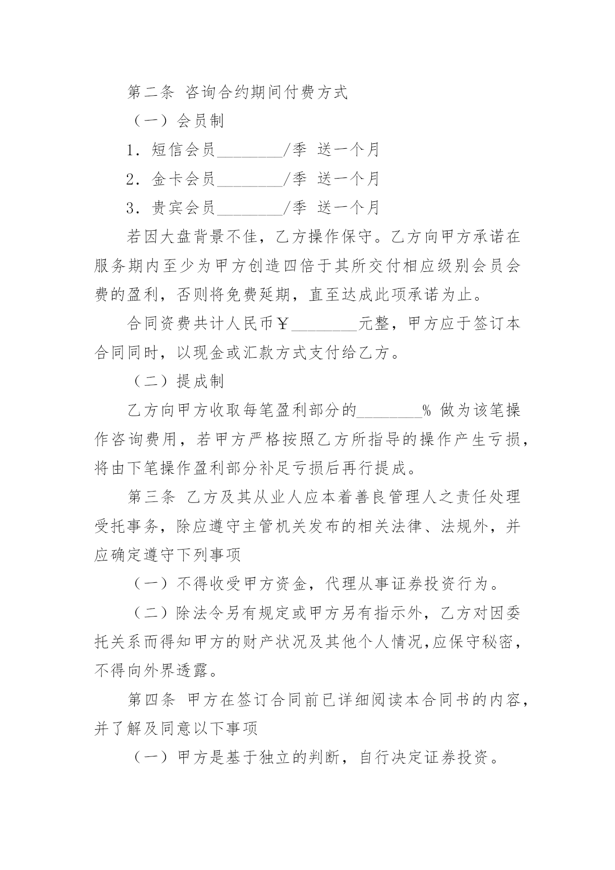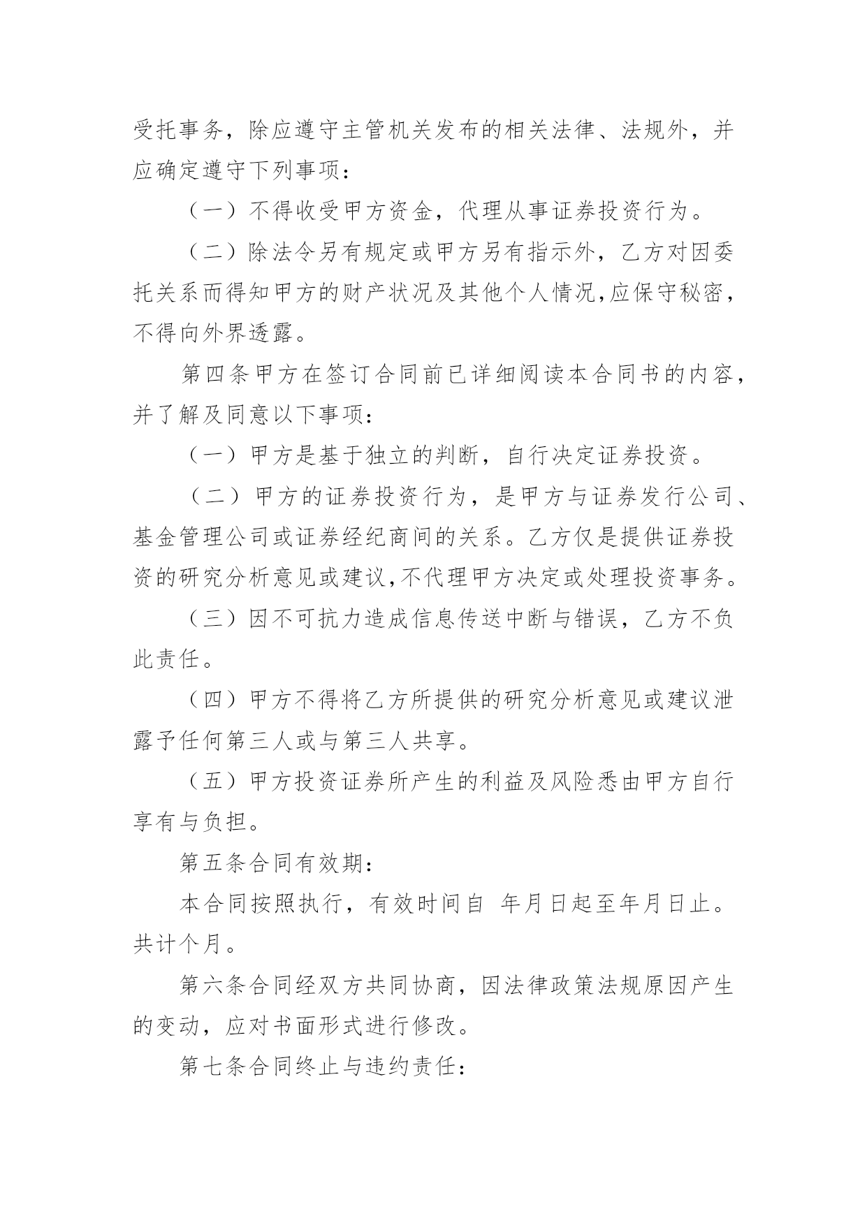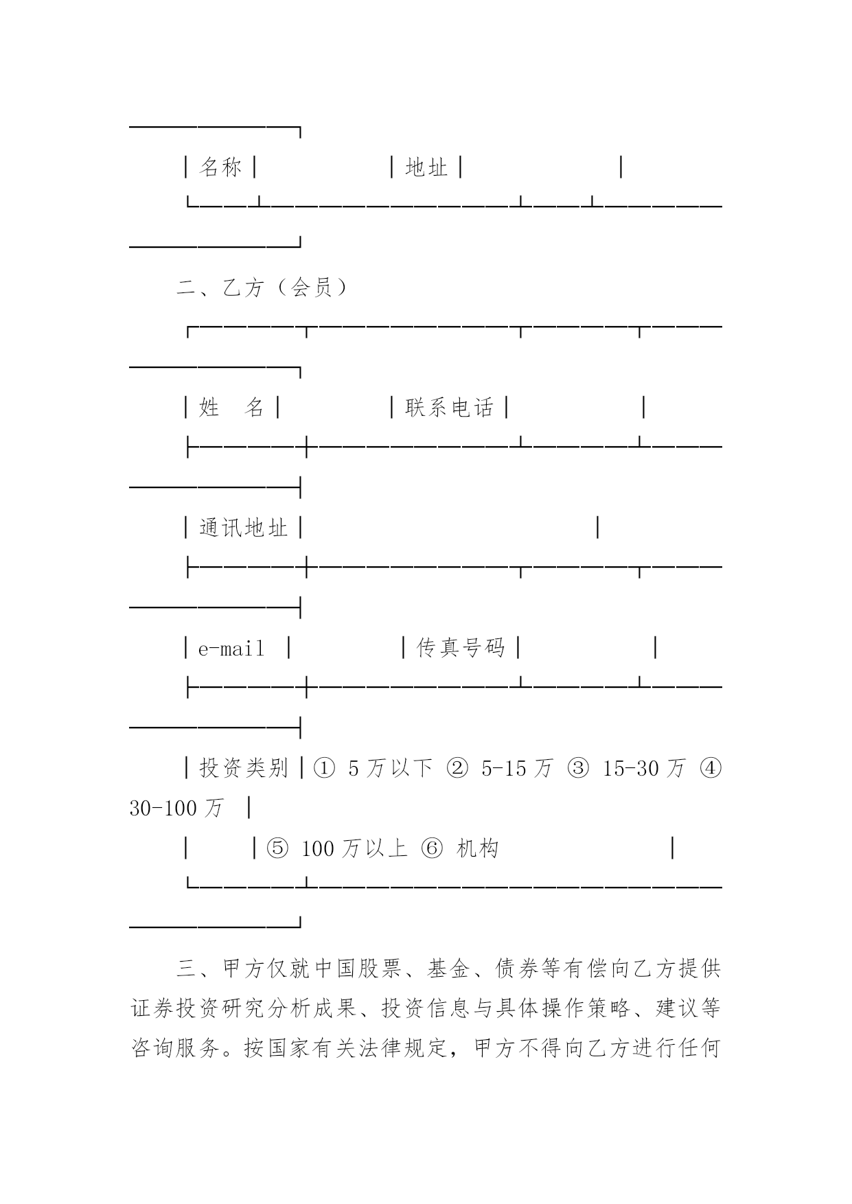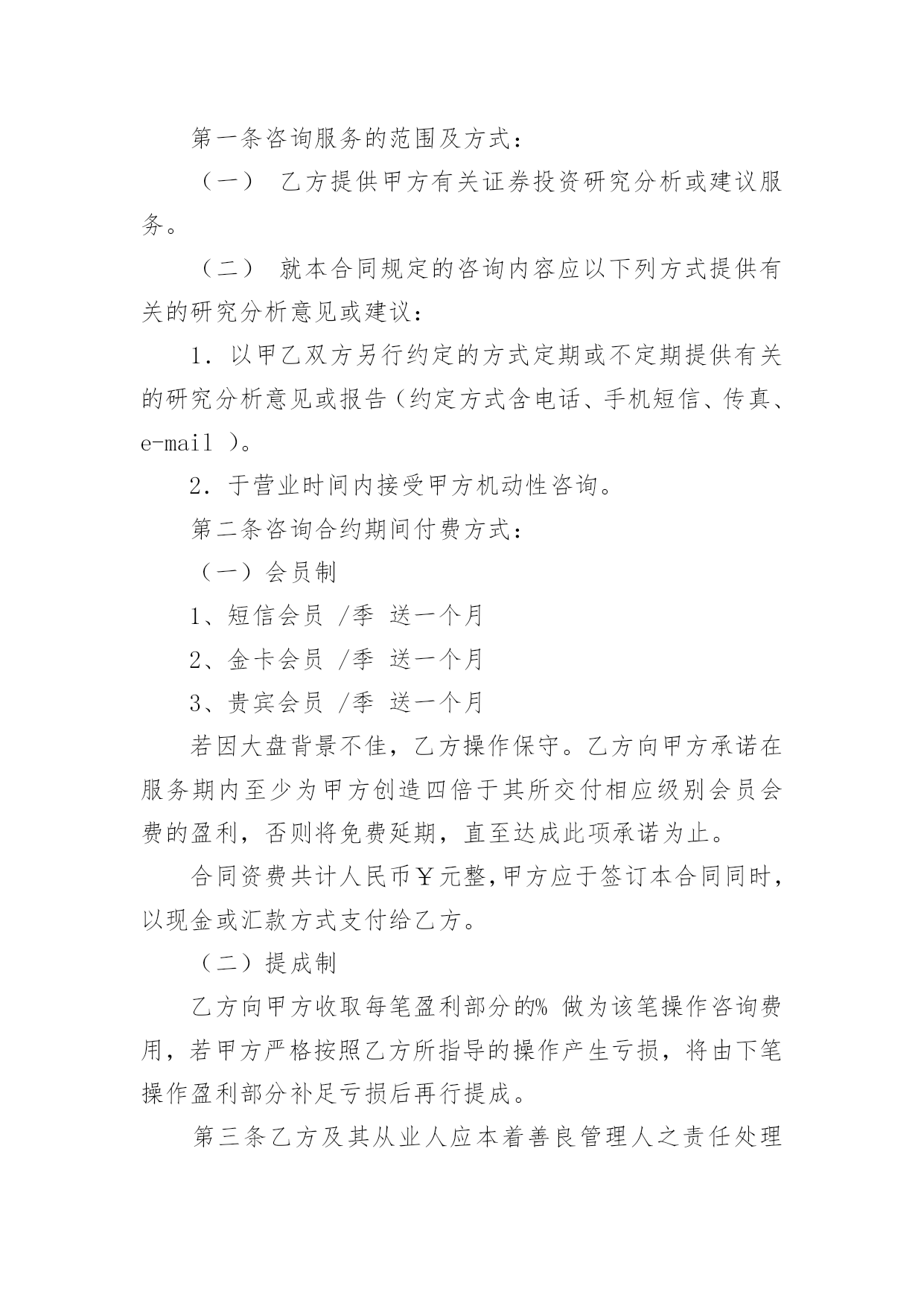 证券投资咨询服务合同证券投资咨询服务合同3篇随着人们对法律的了解日益加深,我们用到合同的地方越来越多,签订合同也是非常有必要的行为。你知道合同的主要内容是什么吗?以下是小编为大家整理的证券投资咨询服务合同,欢迎大家借鉴与参考,希望对大家有所帮助。证券投资咨询服务合同1┌──────┬─────────┬─────┬─────────┐│会员姓名││会员类别││├──────┼─────────┼─────┼─────────┤│会期││咨询费││├──────┼─────────┼─────┼─────────┤│会员编号││客服人员││└──────┴─────────┴─────┴─────────┘立合同书人:(以下简称甲方)西安天富投资:(以下简称乙方)兹因甲方就证券投资,委托乙方提供投资咨询顾问服务事项,经双方同意签定合同约定条款如下:第一条咨询服务的范围及方式:(一)乙方提供甲方有关证券投资研究分析或建议服务。(二)就本合同规定的咨询内容应以下列方式提供有关的研究分析意见或建议:1.以甲乙双方另行约定的方式定期或不定期提供有关的研究分析意见或报告(约定方式含电话、手机短信、传真、e-mail)。2.于营业时间内接受甲方机动性咨询。第二条咨询合约期间付费方式:(一)会员制1、短信会员/季送一个月2、金卡会员/季送一个月3、贵宾会员/季送一个月若因大盘背景不佳,乙方操作保守。乙方向甲方承诺在服务期内至少为甲方创造四倍于其所交付相应级别会员会费的盈利,否则将免费延期,直至达成此项承诺为止。合同资费共计人民币¥元整,甲方应于签订本合同同时,以现金或汇款方式支付给乙方。(二)提成制乙方向甲方收取每笔盈利部分的%做为该笔操作咨询费用,若甲方严格按照乙方所指导的操作产生亏损,将由下笔操作盈利部分补足亏损后再行提成。第三条乙方及其从业人应本着善良管理人之责任处理受托事务,除应遵守主管机关发布的相关法律、法规外,并应确定遵守下列事项:(一)不得收受甲方资金,代理从事证券投资行为。(二)除法令另有规定或甲方另有指示外,乙方对因委托关系而得知甲方的财产状况及其他个人情况,应保守秘密,不得向外界透露。第四条甲方在签订合同前已详细阅读本合同书的内容,并了解及同意以下事项:(一)甲方是基于独立的判断,自行决定证券投资。(二)甲方的证券投资行为,是甲方与证券发行公司、基金管理公司或证券经纪商间的关系。乙方仅是提供证券投资的研究分析意见或建议,不代理甲方决定或处理投资事务。(三)因不可抗力造成信息传送中断与错误,乙方不负此责任。(四)甲方不得将乙方所提供的研究分析意见或建议泄露予任何第三人或与第三人共享。(五)甲方投资证券所产生的利益及风险悉由甲方自行享有与负担。第五条合同有效期:本合同按照执行,有效时间自年月日起至年月日止。共计个月。第六条合同经双方共同协商,因法律政策法规原因产生的变动,应对书面形式进行修改。第七条合同终止与违约责任:(一)立合同双方书面同意终止本合同时,合同得以终止。(二)如因不可抗拒因素导致合同终止,甲方有权请求乙方退还扣除已使用咨询时间成本后剩余的费用。(三)合同终止时,因提供证券投资咨询服务所必要的传输出设备及其他相关费用与已缴税费由甲方负担,乙方将从退还的咨询报酬中扣减或向甲方请求给付。(四)甲方一签定合同,乙方即预收全额咨询费,并出具收据。第八条本合同未尽事宜,悉依据中华人民共和国相关法律办理。第九条本合同经双方签署后正式生效。本合同壹式贰份,双方各执壹份为凭。立合同人:甲方签章:乙方签章:地址:地址:电话:电话:签约日:签约日:证券投资咨询服务合同2兹甲乙双方共同友好协商并自愿签订以下协议,本协议由甲乙双方共同遵守并具法律效力。一、甲方(中华人民共和国证券投资咨询资格证书_________号)┌──┬──────────┬──┬────────────┐│名称││地址││└──┴──────────┴──┴────────────┘二、乙方(会员)┌────┬────────┬────┬──────────┐│姓名││联系电话││├────┼────────┴────┴──────────┤│通讯地址││├────┼────────┬────┬──────────┤│e-mail││传真号码││├────┼────────┴────┴──────────┤│投资类别│①5万以下②5-15万③15-30万④30-100万│││⑤100万以上⑥机构│└────┴────────────────────────┘三、甲方仅就中国股票、基金、债券等有偿向乙方提供证券投资研究分析成果、投资信息与具体操作策略、建议等咨询服务。按国家有关法律规定,甲方不得向乙方进行任何回报承诺。四、甲方因工作关系而得知乙方之财产状况及其他