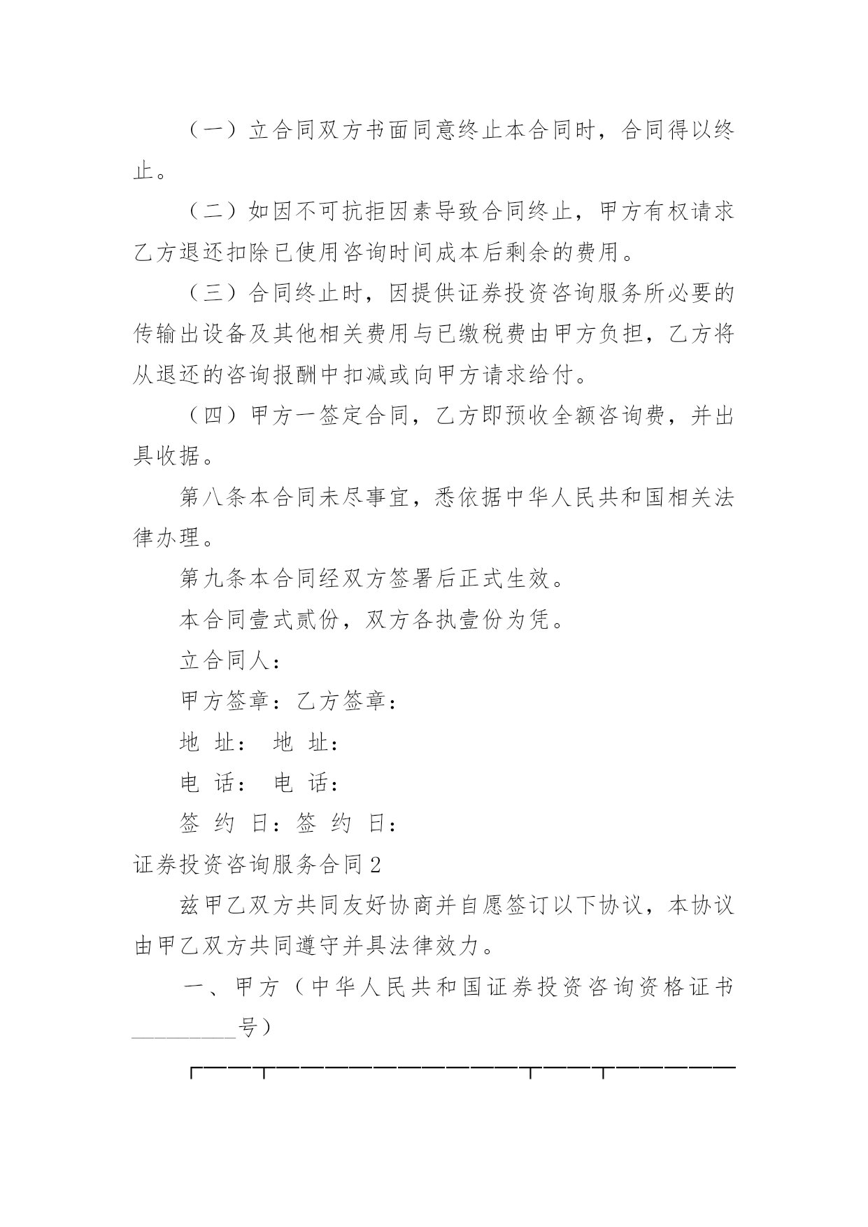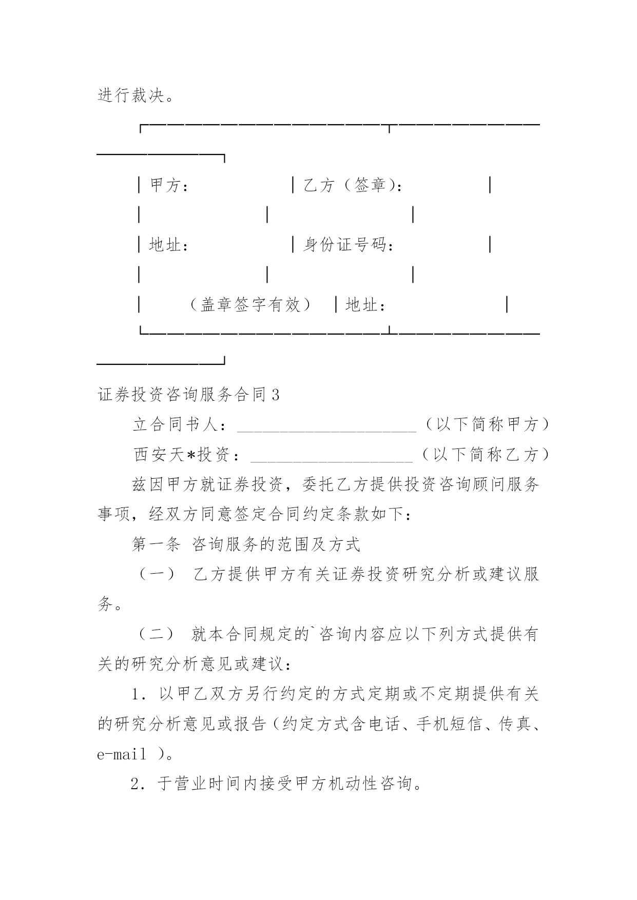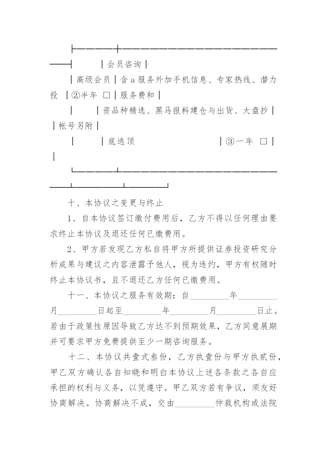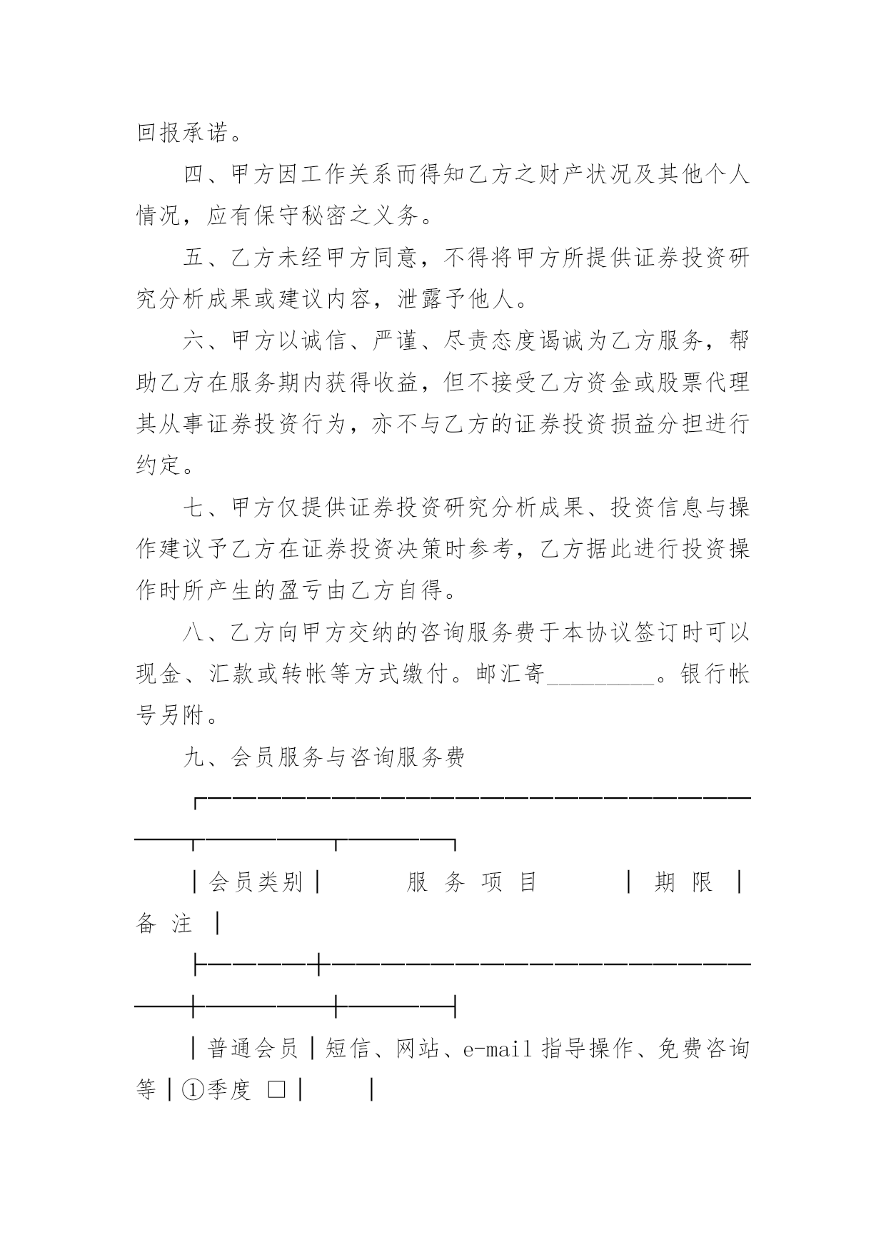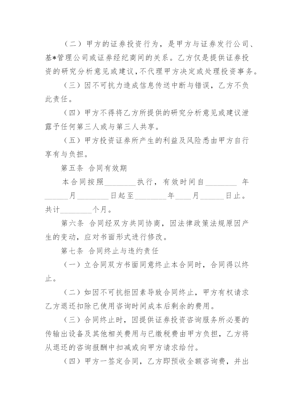 证券投资咨询服务合同证券投资咨询服务合同3篇随着人们对法律的了解日益加深,我们用到合同的地方越来越多,签订合同也是非常有必要的行为。你知道合同的主要内容是什么吗?以下是小编为大家整理的证券投资咨询服务合同,欢迎大家借鉴与参考,希望对大家有所帮助。证券投资咨询服务合同1┌──────┬─────────┬─────┬─────────┐│会员姓名││会员类别││├──────┼─────────┼─────┼─────────┤│会期││咨询费││├──────┼─────────┼─────┼─────────┤│会员编号││客服人员││└──────┴─────────┴─────┴─────────┘立合同书人:(以下简称甲方)西安天富投资:(以下简称乙方)兹因甲方就证券投资,委托乙方提供投资咨询顾问服务事项,经双方同意签定合同约定条款如下:第一条咨询服务的范围及方式:(一)乙方提供甲方有关证券投资研究分析或建议服务。(二)就本合同规定的咨询内容应以下列方式提供有关的研究分析意见或建议:1.以甲乙双方另行约定的方式定期或不定期提供有关的研究分析意见或报告(约定方式含电话、手机短信、传真、e-mail)。2.于营业时间内接受甲方机动性咨询。第二条咨询合约期间付费方式:(一)会员制1、短信会员/季送一个月2、金卡会员/季送一个月3、贵宾会员/季送一个月若因大盘背景不佳,乙方操作保守。乙方向甲方承诺在服务期内至少为甲方创造四倍于其所交付相应级别会员会费的盈利,否则将免费延期,直至达成此项承诺为止。合同资费共计人民币¥元整,甲方应于签订本合同同时,以现金或汇款方式支付给乙方。(二)提成制乙方向甲方收取每笔盈利部分的%做为该笔操作咨询费用,若甲方严格按照乙方所指导的操作产生亏损,将由下笔操作盈利部分补足亏损后再行提成。第三条乙方及其从业人应本着善良管理人之责任处理受托事务,除应遵守主管机关发布的相关法律、法规外,并应确定遵守下列事项:(一)不得收受甲方资金,代理从事证券投资行为。(二)除法令另有规定或甲方另有指示外,乙方对因委托关系而得知甲方的财产状况及其他个人情况,应保守秘密,不得向外界透露。第四条甲方在签订合同前已详细阅读本合同书的内容,并了解及同意以下事项:(一)甲方是基于独立的判断,自行决定证券投资。(二)甲方的证券投资行为,是甲方与证券发行公司、基金管理公司或证券经纪商间的关系。乙方仅是提供证券投资的研究分析意见或建议,不代理甲方决定或处理投资事务。(三)因不可抗力造成信息传送中断与错误,乙方不负此责任。(四)甲方不得将乙方所提供的研究分析意见或建议泄露予任何第三人或与第三人共享。(五)甲方投资证券所产生的利益及风险悉由甲方自行享有与负担。第五条合同有效期:本合同按照执行,有效时间自年月日起至年月日止。共计个月。第六条合同经双方共同协商,因法律政策法规原因产生的变动,应对书面形式进行修改。第七条合同终止与违约责任:(一)立合同双方书面同意终止本合同时,合同得以终止。(二)如因不可抗拒因素导致合同终止,甲方有权请求乙方退还扣除已使用咨询时间成本后剩余的费用。(三)合同终止时,因提供证券投资咨询服务所必要的传输出设备及其他相关费用与已缴税费由甲方负担,乙方将从退还的咨询报酬中扣减或向甲方请求给付。(四)甲方一签定合同,乙方即预收全额咨询费,并出具收据。第八条本合同未尽事宜,悉依据中华人民共和国相关法律办理。第九条本合同经双方签署后正式生效。本合同壹式贰份,双方各执壹份为凭。立合同人:甲方签章:乙方签章:地址:地址:电话:电话:签约日:签约日:证券投资咨询服务合同2兹甲乙双方共同友好协商并自愿签订以下协议,本协议由甲乙双方共同遵守并具法律效力。一、甲方(中华人民共和国证券投资咨询资格证书_________号)┌──┬──────────┬──┬────────────┐│名称││地址││└──┴──────────┴──┴────────────┘二、乙方(会员)┌────┬────────┬────┬──────────┐│姓名││联系电话││├────┼────────┴────┴──────────┤│通讯地址││├────┼────────┬────┬──────────┤│e-mail││传真号码││├────┼────────┴────┴──────────┤│投资类别│①5万以下②5-15万③15-30万④30-100万│││⑤100万以上⑥机构│└────┴────────────────────────┘三、甲方仅就中国股票、基金、债券等有偿向乙方提供证券投资研究分析成果、投资信息与具体操作策略、建议等咨询服务。按国家有关法律规定,甲方不得向乙方进行任何回报承诺。四、甲方因工作关系而得知乙方之财产状况及其他