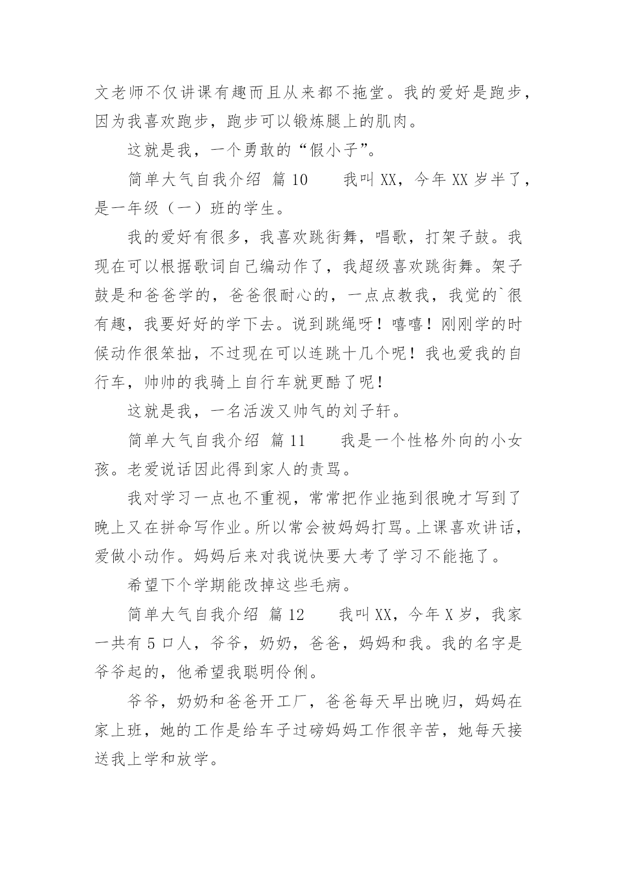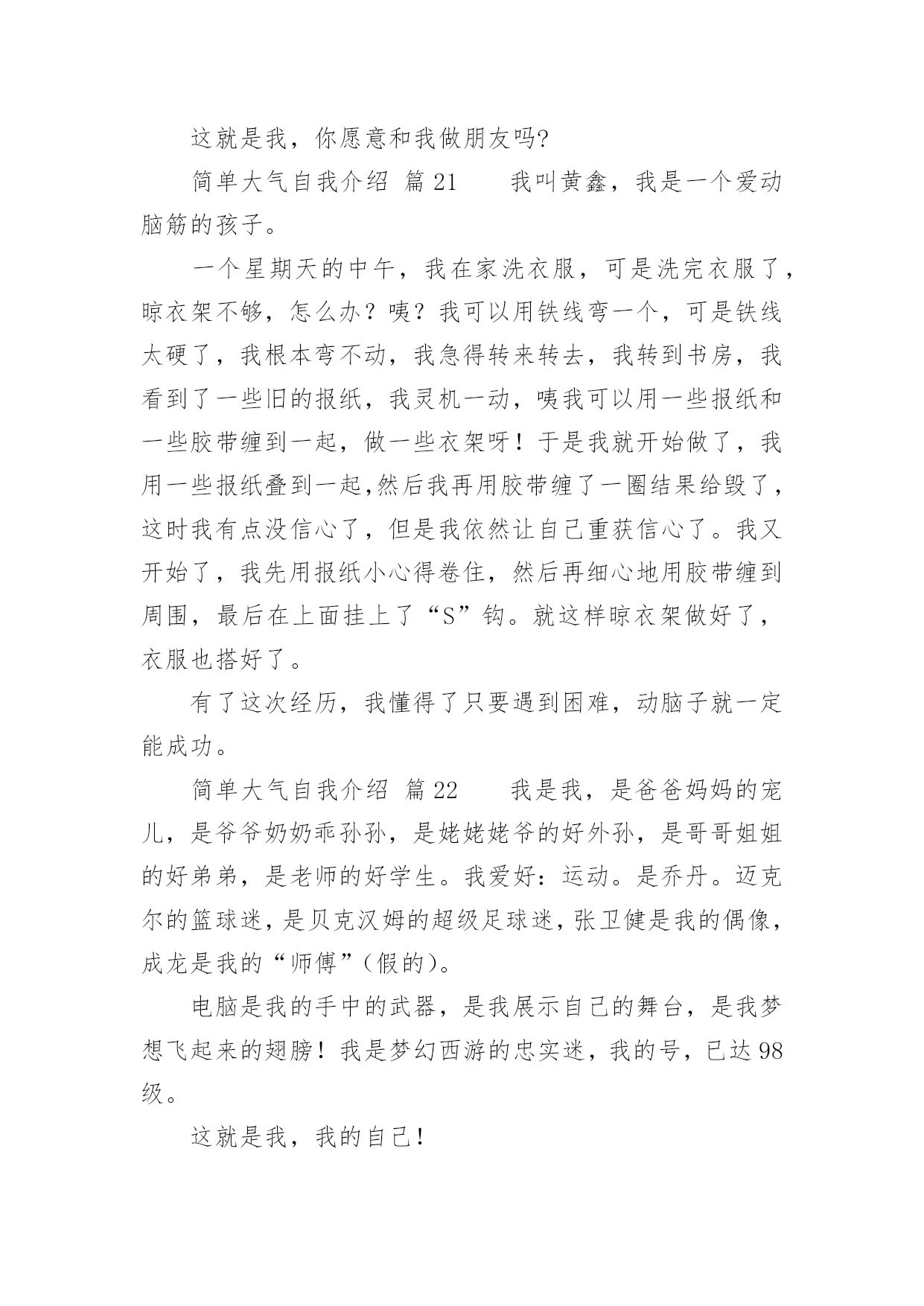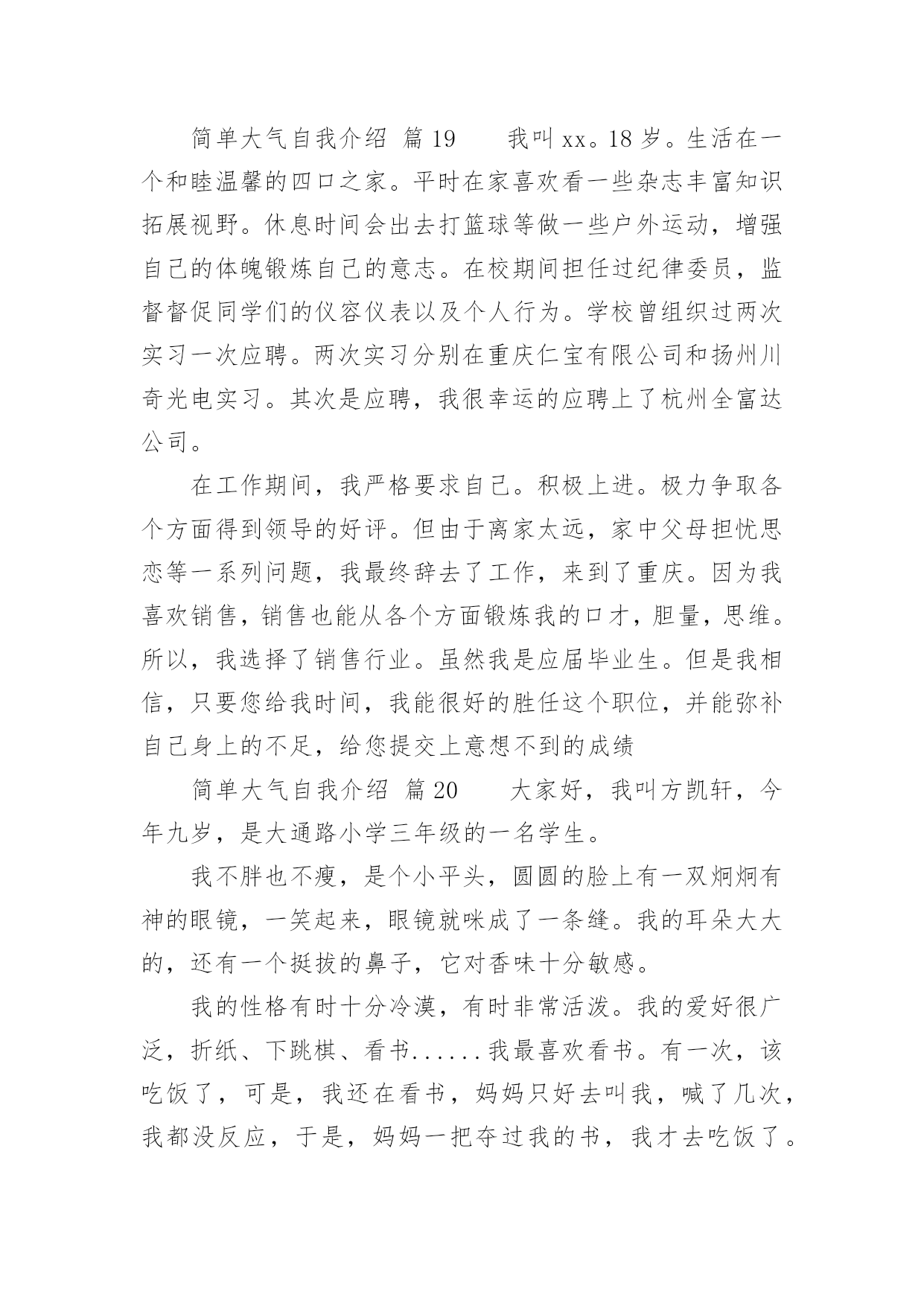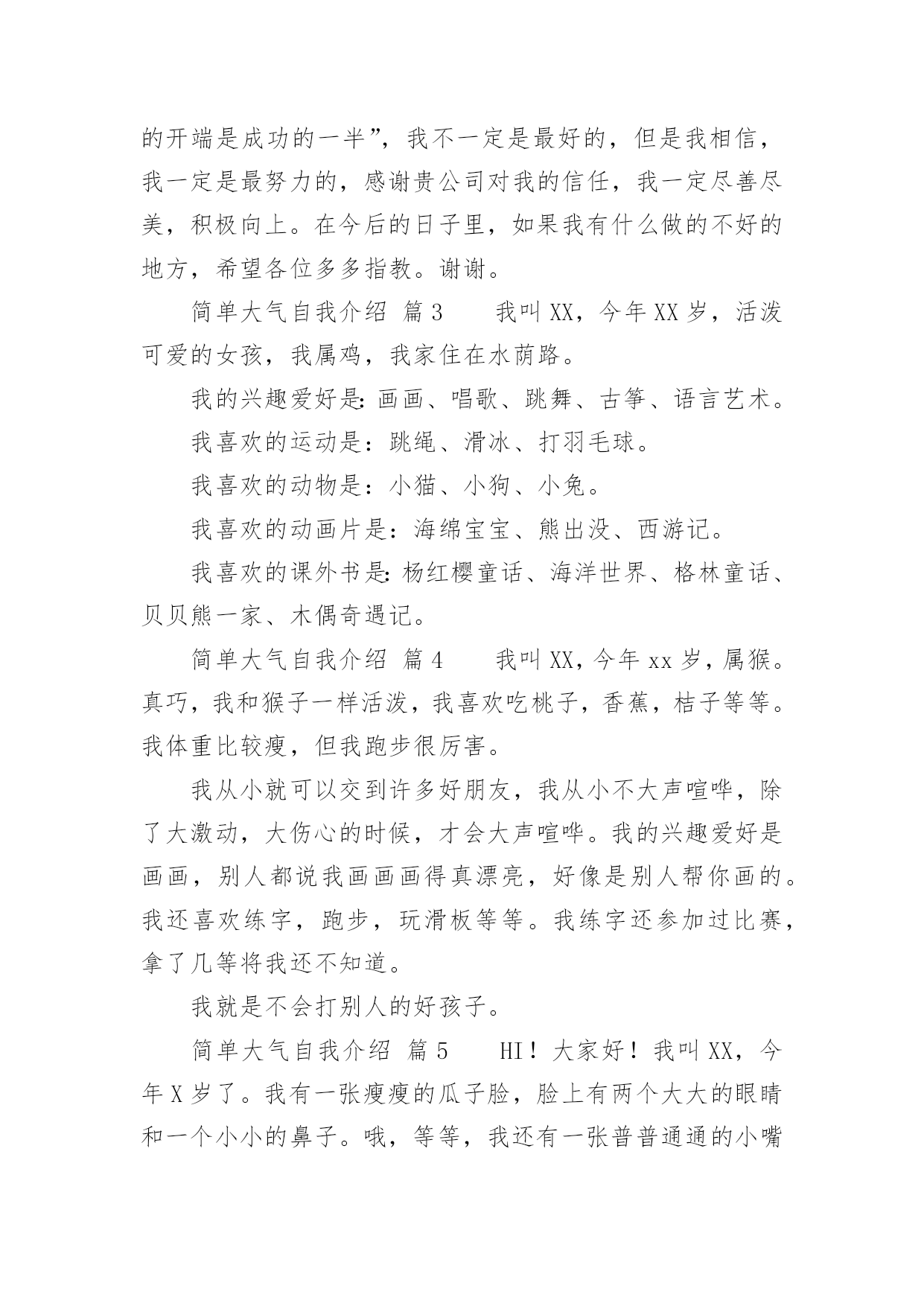 简单大气自我介绍简单大气自我介绍(精选27篇)当我们在一个新环境中,需要我们进行自我介绍,用自我介绍往往可以来展示自己。写起自我介绍来就毫无头绪?以下是小编精心整理的简单大气自我介绍,希望对大家有所帮助。简单大气自我介绍篇1大家好,我叫XX,今年X岁。俗话说“人心齐,泰山移。”这就是我爸爸妈妈给我起这个名字的寓意喔!我现在就读于北京新东方扬州外国语学校。我的爱好很广泛,比如说:打羽毛球,踢足球,弹钢琴等。特别是打羽毛球,周末一有时间我都要让爸爸妈妈陪我去打羽毛球。我们家有四口人,分别是:爸爸,妈妈,我和奶奶。我们这一家很和睦,我生活在这里感到很幸福。爸爸是一家之主,他说话很幽默,但他对于工作一丝不苟。妈妈很温柔,她的脸上总是带着微笑。妈妈只要一有时间就来陪我。奶奶每天都帮我们做家务活,很辛苦。所以我想对奶奶说:“奶奶,您辛苦了!”我还喜欢写博客。怎么样,我很厉害吧?你们愿意和我交好朋友吗?简单大气自我介绍篇2各位领导(同事):你们好,我是XXX,很荣幸的,我来到了贵公司工作,我的兴趣是XXXX,特长是XXXX,希望在新的工作单位,我可以更好地发挥我的特长,为公司争取更大的荣誉,“良好的开端是成功的一半”,我不一定是最好的,但是我相信,我一定是最努力的,感谢贵公司对我的信任,我一定尽善尽美,积极向上。在今后的日子里,如果我有什么做的不好的地方,希望各位多多指教。谢谢。简单大气自我介绍篇3我叫XX,今年XX岁,活泼可爱的女孩,我属鸡,我家住在水荫路。我的兴趣爱好是:画画、唱歌、跳舞、古筝、语言艺术。我喜欢的运动是:跳绳、滑冰、打羽毛球。我喜欢的动物是:小猫、小狗、小兔。我喜欢的动画片是:海绵宝宝、熊出没、西游记。我喜欢的课外书是:杨红樱童话、海洋世界、格林童话、贝贝熊一家、木偶奇遇记。简单大气自我介绍篇4我叫XX,今年xx岁,属猴。真巧,我和猴子一样活泼,我喜欢吃桃子,香蕉,桔子等等。我体重比较瘦,但我跑步很厉害。我从小就可以交到许多好朋友,我从小不大声喧哗,除了大激动,大伤心的时候,才会大声喧哗。我的兴趣爱好是画画,别人都说我画画画得真漂亮,好像是别人帮你画的。我还喜欢练字,跑步,玩滑板等等。我练字还参加过比赛,拿了几等将我还不知道。我就是不会打别人的好孩子。简单大气自我介绍篇5HI!大家好!我叫XX,今年X岁了。我有一张瘦瘦的瓜子脸,脸上有两个大大的眼睛和一个小小的鼻子。哦,等等,我还有一张普普通通的小嘴巴。我喜欢学习,我几乎和班上成绩好的同学都很要好,但是我偶尔也会帮助那些成绩落后的同学。我是个内向的孩子,别人课间谈话时嘴巴叽里呱啦讲个不停。而我呢?总是坐在座位上呆呆的望着窗外,看那像棉花糖一样的白云,看那在天空翱翔的小鸟。我的理想总是千变万化的,一会儿又想当老师,一会儿又想当明星,一会儿又想当会计师。总之永远都不知道自己想当什么。这就是一个普普通通的我,这样的我,你愿意和我做朋友吗?简单大气自我介绍篇6我,一头乌黑的头发和一双明亮的眼睛,充满了自信与活力。“书山有路勤为径,学海无涯苦作舟”是我的座右铭,“我能行”是我前进的动力。雷锋那钉子精神令我敬佩。上学时,我是大家的好同学。放假时,我是大家的好玩伴。每当我的同学遇到困难时我都会尽我所能帮忙解决困难。别忘了我每次期末考试都是前十名的双优生谁也别想把我挤到十名后。我的体育也是出类拔萃的比如说:篮球、乒乓球、急性跳远等等。在运动的时候我还曾在急性跳远的项目上夺得第二名的佳绩。我还参加了篮球队,打篮球是要天天锻炼,要长得高、跳得远所以我每天都在学校打篮球,打篮球还可以锻炼身体强壮体魄呢!我不单单喜欢篮球,另外还喜欢游泳。我还在暑假和周末的时间去练习游泳因为游泳也可以锻炼身体而且在水里泡着还十分舒服。爱拼才会赢,我就一定行!简单大气自我介绍篇7亲爱的先生或女士:您好。我是XX,我认为我很适合贵公司所需要的工作。我XX岁,身体健康。从XX中学毕业后,我已经工作了很长时间。在个人的责任,我做的很好,我很擅长电脑操作,我喜欢打篮球、上网和听音乐。我对这个职位感兴趣。我希望贵公司可以接纳我。如果我能成为贵公司的一员,我会努力工作。简单大气自我介绍篇8老师好,我的名字叫XX,今年X岁了,我性格开朗,热爱帮助同学。赵睿这个名字是爸爸和妈妈给我起的,我爸爸妈妈都姓赵,所以我也姓赵,睿的意思是,睿智,聪明,爸爸妈妈想让我既快乐又聪明。我的爱好是喜欢弹钢琴,我已经学了四年多了,每天放学,我都要到琴行练琴,走的时候,我还依依不舍。有一次,我在省文化厅比赛,还得了第三名呢!希望通过我的介绍,老师能深深的记住我。简单大气自我介绍篇9我叫XX,今年X岁了。我是一个“假小子”,因为我很勇敢。我可以做到很多男陔子做不到的事,如爬卡车、滚圆木等游戏。我最喜欢的科目是语文,因为语文老师讲课很有趣。语文老师不仅