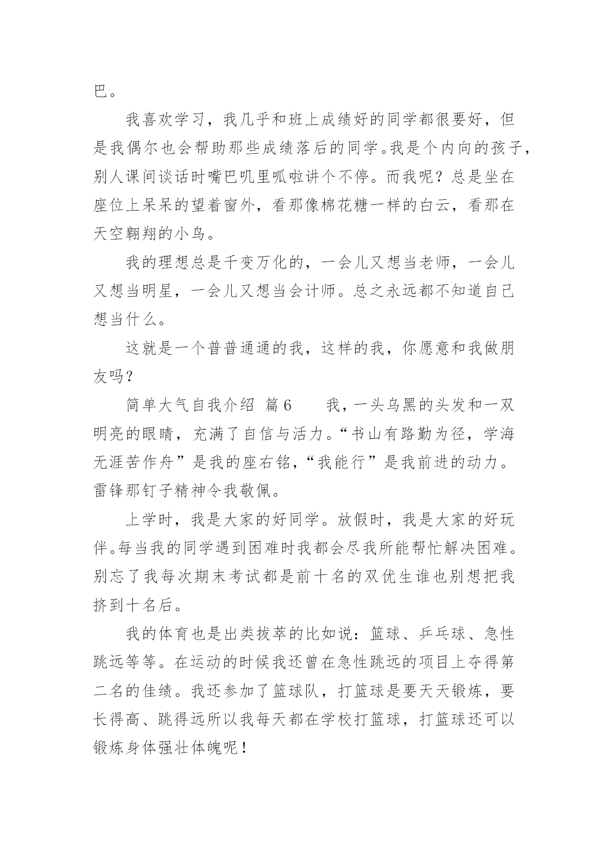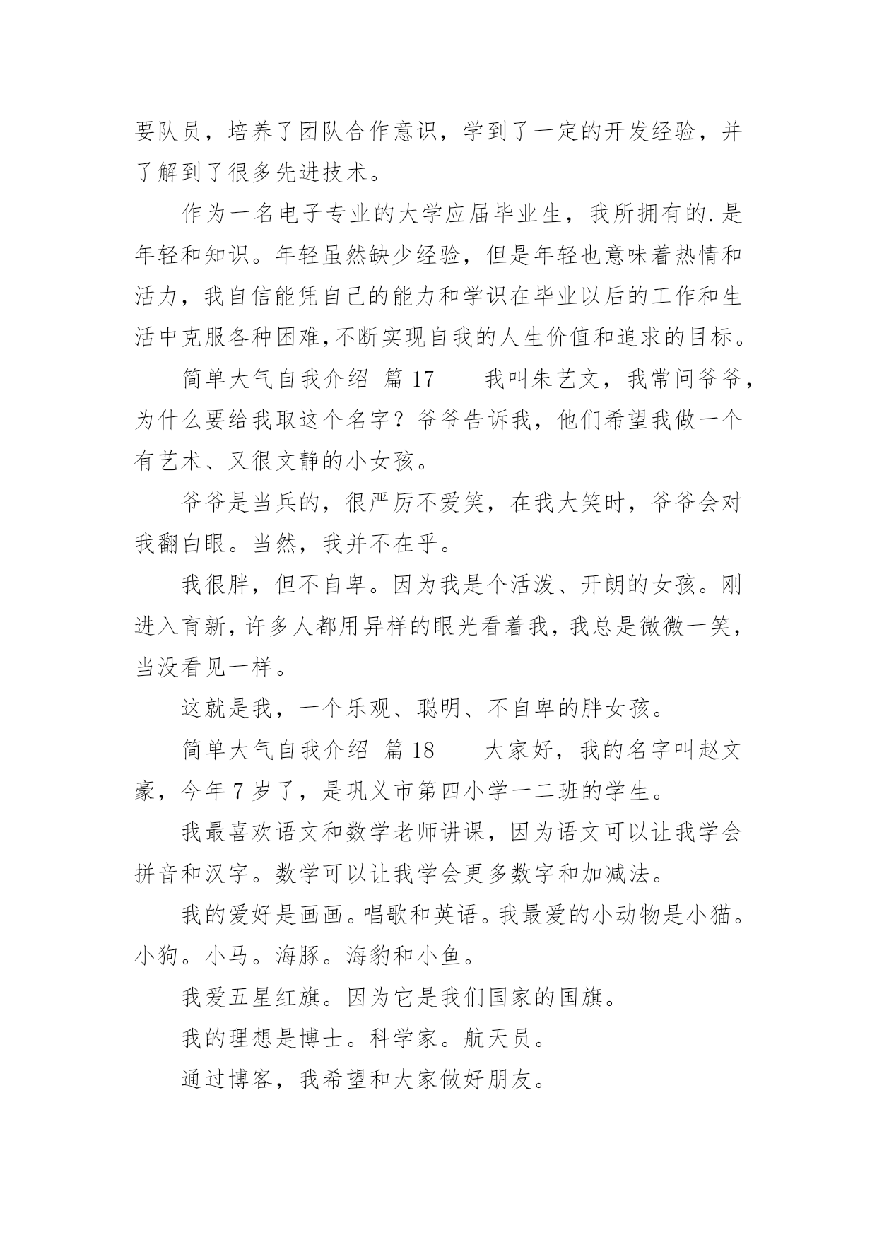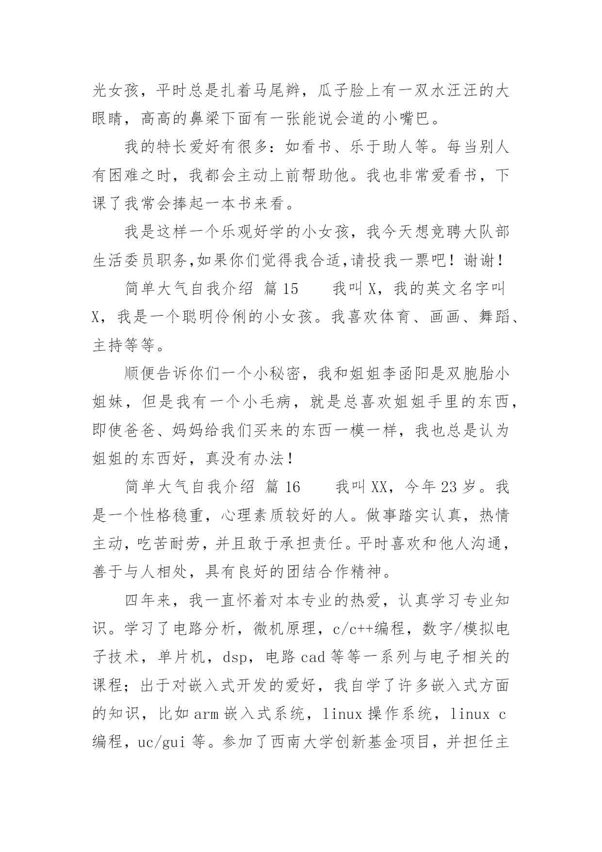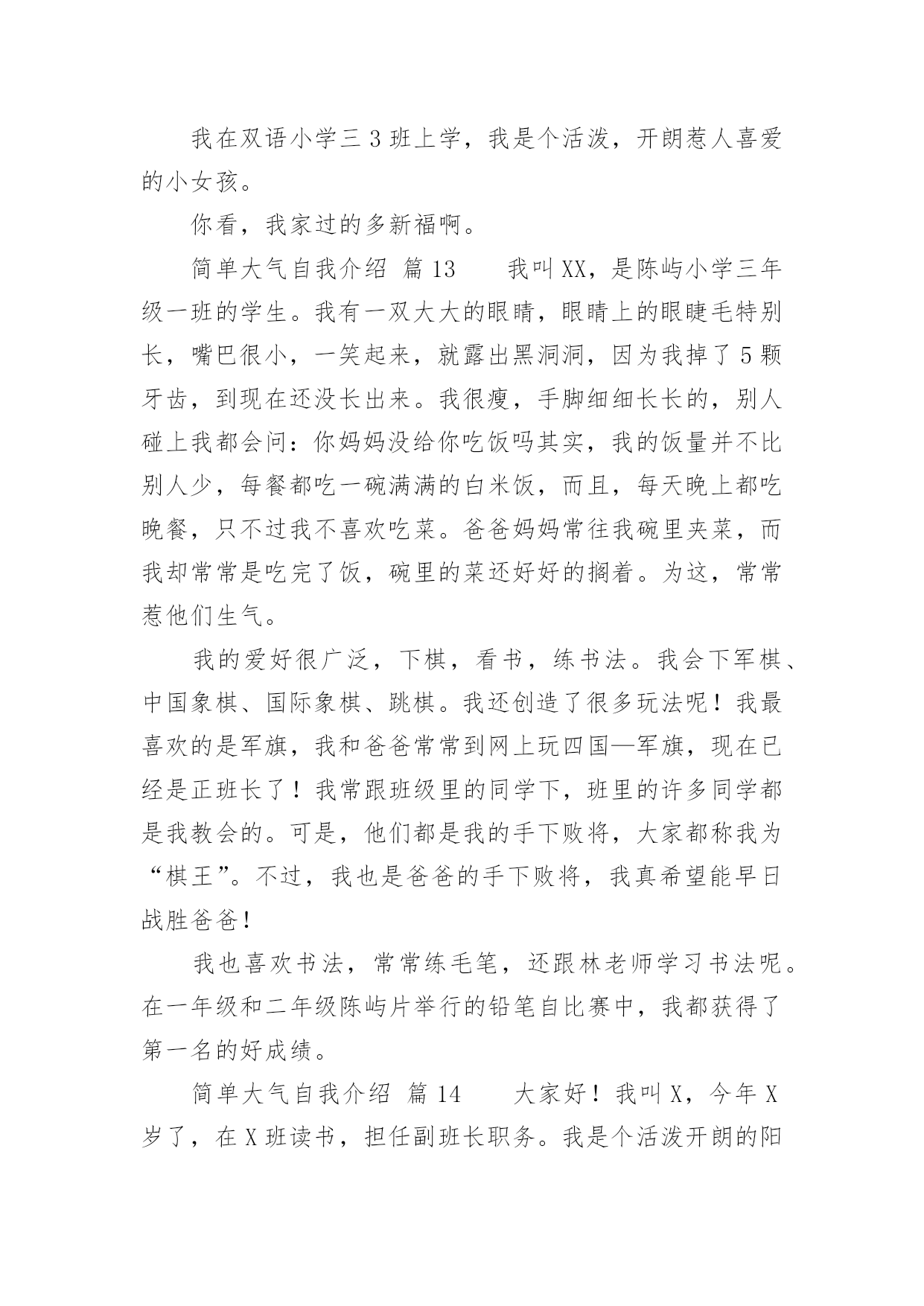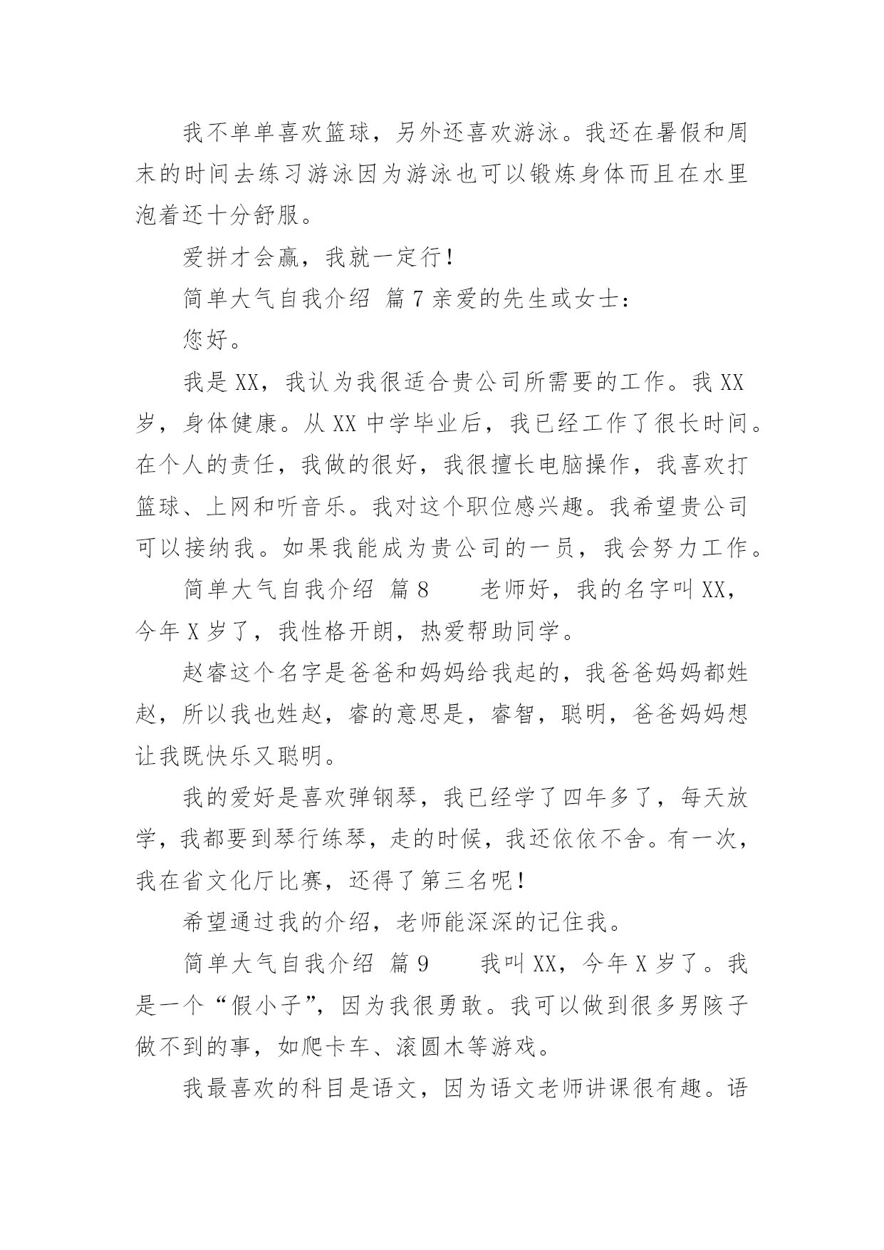 简单大气自我介绍简单大气自我介绍(精选27篇)当我们在一个新环境中,需要我们进行自我介绍,用自我介绍往往可以来展示自己。写起自我介绍来就毫无头绪?以下是小编精心整理的简单大气自我介绍,希望对大家有所帮助。简单大气自我介绍篇1大家好,我叫XX,今年X岁。俗话说“人心齐,泰山移。”这就是我爸爸妈妈给我起这个名字的寓意喔!我现在就读于北京新东方扬州外国语学校。我的爱好很广泛,比如说:打羽毛球,踢足球,弹钢琴等。特别是打羽毛球,周末一有时间我都要让爸爸妈妈陪我去打羽毛球。我们家有四口人,分别是:爸爸,妈妈,我和奶奶。我们这一家很和睦,我生活在这里感到很幸福。爸爸是一家之主,他说话很幽默,但他对于工作一丝不苟。妈妈很温柔,她的脸上总是带着微笑。妈妈只要一有时间就来陪我。奶奶每天都帮我们做家务活,很辛苦。所以我想对奶奶说:“奶奶,您辛苦了!”我还喜欢写博客。怎么样,我很厉害吧?你们愿意和我交好朋友吗?简单大气自我介绍篇2各位领导(同事):你们好,我是XXX,很荣幸的,我来到了贵公司工作,我的兴趣是XXXX,特长是XXXX,希望在新的工作单位,我可以更好地发挥我的特长,为公司争取更大的荣誉,“良好的开端是成功的一半”,我不一定是最好的,但是我相信,我一定是最努力的,感谢贵公司对我的信任,我一定尽善尽美,积极向上。在今后的日子里,如果我有什么做的不好的地方,希望各位多多指教。谢谢。简单大气自我介绍篇3我叫XX,今年XX岁,活泼可爱的女孩,我属鸡,我家住在水荫路。我的兴趣爱好是:画画、唱歌、跳舞、古筝、语言艺术。我喜欢的运动是:跳绳、滑冰、打羽毛球。我喜欢的动物是:小猫、小狗、小兔。我喜欢的动画片是:海绵宝宝、熊出没、西游记。我喜欢的课外书是:杨红樱童话、海洋世界、格林童话、贝贝熊一家、木偶奇遇记。简单大气自我介绍篇4我叫XX,今年xx岁,属猴。真巧,我和猴子一样活泼,我喜欢吃桃子,香蕉,桔子等等。我体重比较瘦,但我跑步很厉害。我从小就可以交到许多好朋友,我从小不大声喧哗,除了大激动,大伤心的时候,才会大声喧哗。我的兴趣爱好是画画,别人都说我画画画得真漂亮,好像是别人帮你画的。我还喜欢练字,跑步,玩滑板等等。我练字还参加过比赛,拿了几等将我还不知道。我就是不会打别人的好孩子。简单大气自我介绍篇5HI!大家好!我叫XX,今年X岁了。我有一张瘦瘦的瓜子脸,脸上有两个大大的眼睛和一个小小的鼻子。哦,等等,我还有一张普普通通的小嘴巴。我喜欢学习,我几乎和班上成绩好的同学都很要好,但是我偶尔也会帮助那些成绩落后的同学。我是个内向的孩子,别人课间谈话时嘴巴叽里呱啦讲个不停。而我呢?总是坐在座位上呆呆的望着窗外,看那像棉花糖一样的白云,看那在天空翱翔的小鸟。我的理想总是千变万化的,一会儿又想当老师,一会儿又想当明星,一会儿又想当会计师。总之永远都不知道自己想当什么。这就是一个普普通通的我,这样的我,你愿意和我做朋友吗?简单大气自我介绍篇6我,一头乌黑的头发和一双明亮的眼睛,充满了自信与活力。“书山有路勤为径,学海无涯苦作舟”是我的座右铭,“我能行”是我前进的动力。雷锋那钉子精神令我敬佩。上学时,我是大家的好同学。放假时,我是大家的好玩伴。每当我的同学遇到困难时我都会尽我所能帮忙解决困难。别忘了我每次期末考试都是前十名的双优生谁也别想把我挤到十名后。我的体育也是出类拔萃的比如说:篮球、乒乓球、急性跳远等等。在运动的时候我还曾在急性跳远的项目上夺得第二名的佳绩。我还参加了篮球队,打篮球是要天天锻炼,要长得高、跳得远所以我每天都在学校打篮球,打篮球还可以锻炼身体强壮体魄呢!我不单单喜欢篮球,另外还喜欢游泳。我还在暑假和周末的时间去练习游泳因为游泳也可以锻炼身体而且在水里泡着还十分舒服。爱拼才会赢,我就一定行!简单大气自我介绍篇7亲爱的先生或女士:您好。我是XX,我认为我很适合贵公司所需要的工作。我XX岁,身体健康。从XX中学毕业后,我已经工作了很长时间。在个人的责任,我做的很好,我很擅长电脑操作,我喜欢打篮球、上网和听音乐。我对这个职位感兴趣。我希望贵公司可以接纳我。如果我能成为贵公司的一员,我会努力工作。简单大气自我介绍篇8老师好,我的名字叫XX,今年X岁了,我性格开朗,热爱帮助同学。赵睿这个名字是爸爸和妈妈给我起的,我爸爸妈妈都姓赵,所以我也姓赵,睿的意思是,睿智,聪明,爸爸妈妈想让我既快乐又聪明。我的爱好是喜欢弹钢琴,我已经学了四年多了,每天放学,我都要到琴行练琴,走的时候,我还依依不舍。有一次,我在省文化厅比赛,还得了第三名呢!希望通过我的介绍,老师能深深的记住我。简单大气自我介绍篇9我叫XX,今年X岁了。我是一个“假小子”,因为我很勇敢。我可以做到很多男陔子做不到的事,如爬卡车、滚圆木等游戏。我最喜欢的科目是语文,因为语文老师讲课很有趣。语文老师不仅