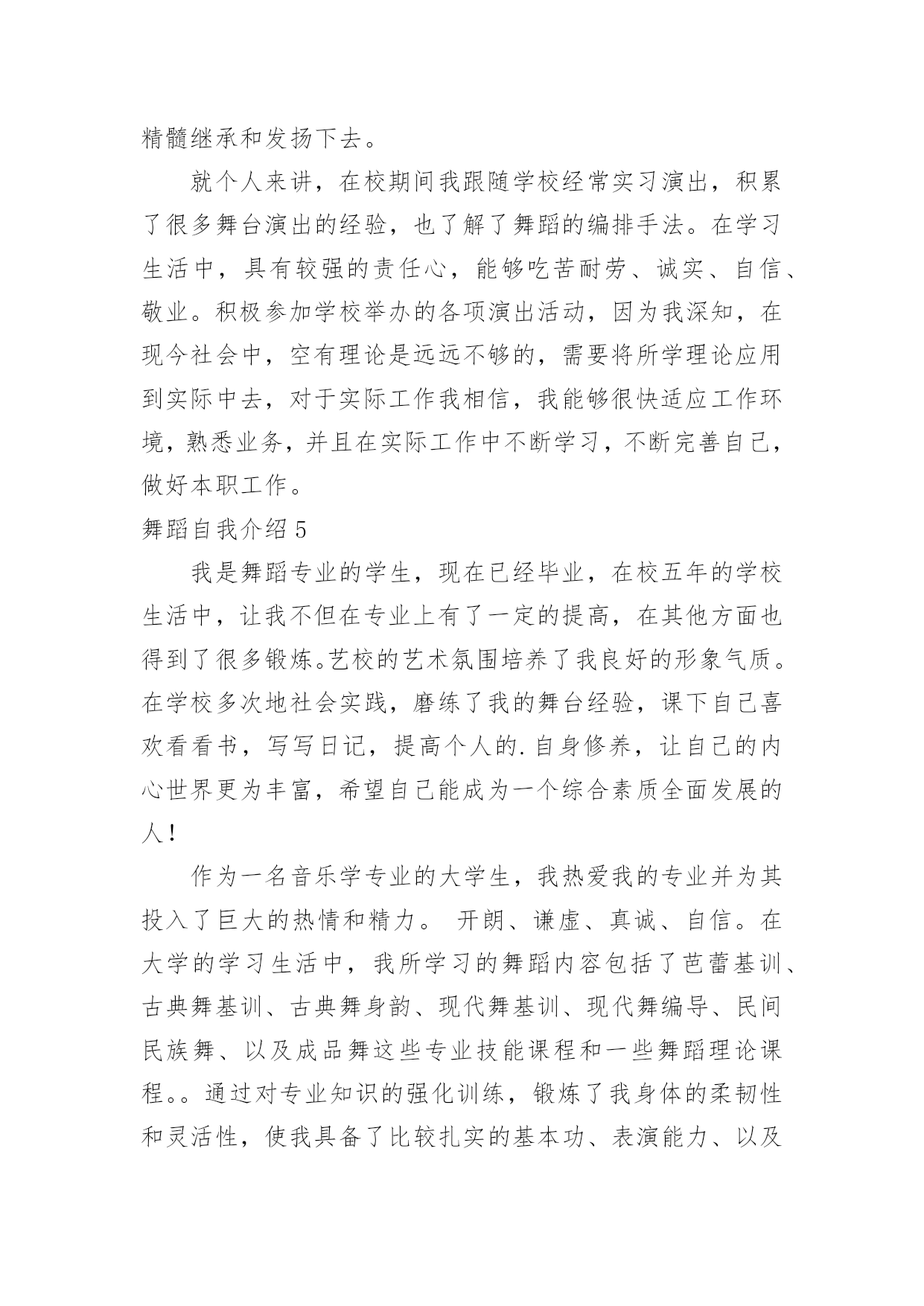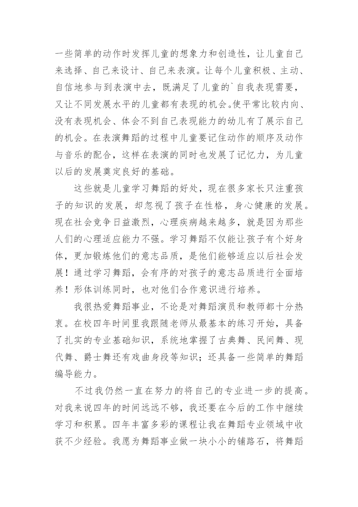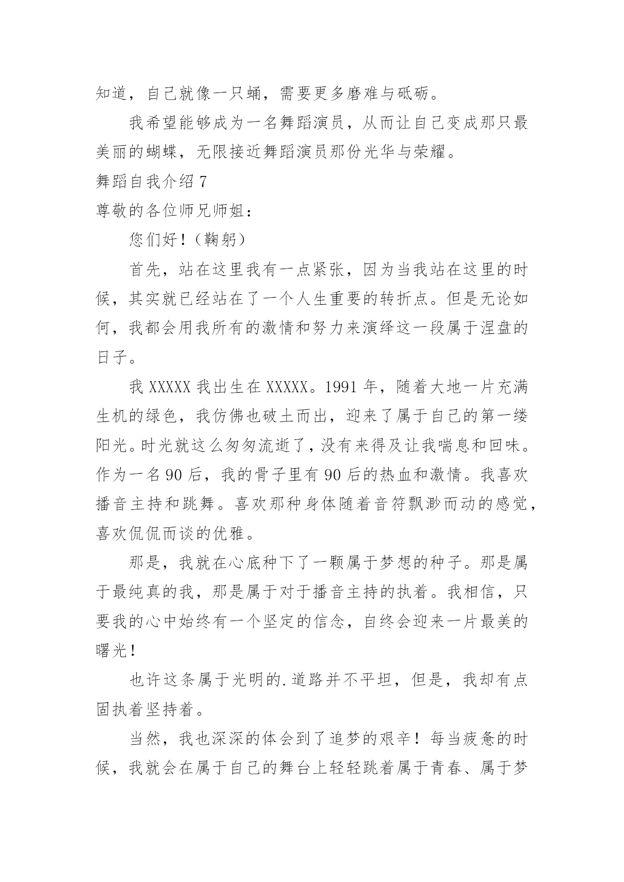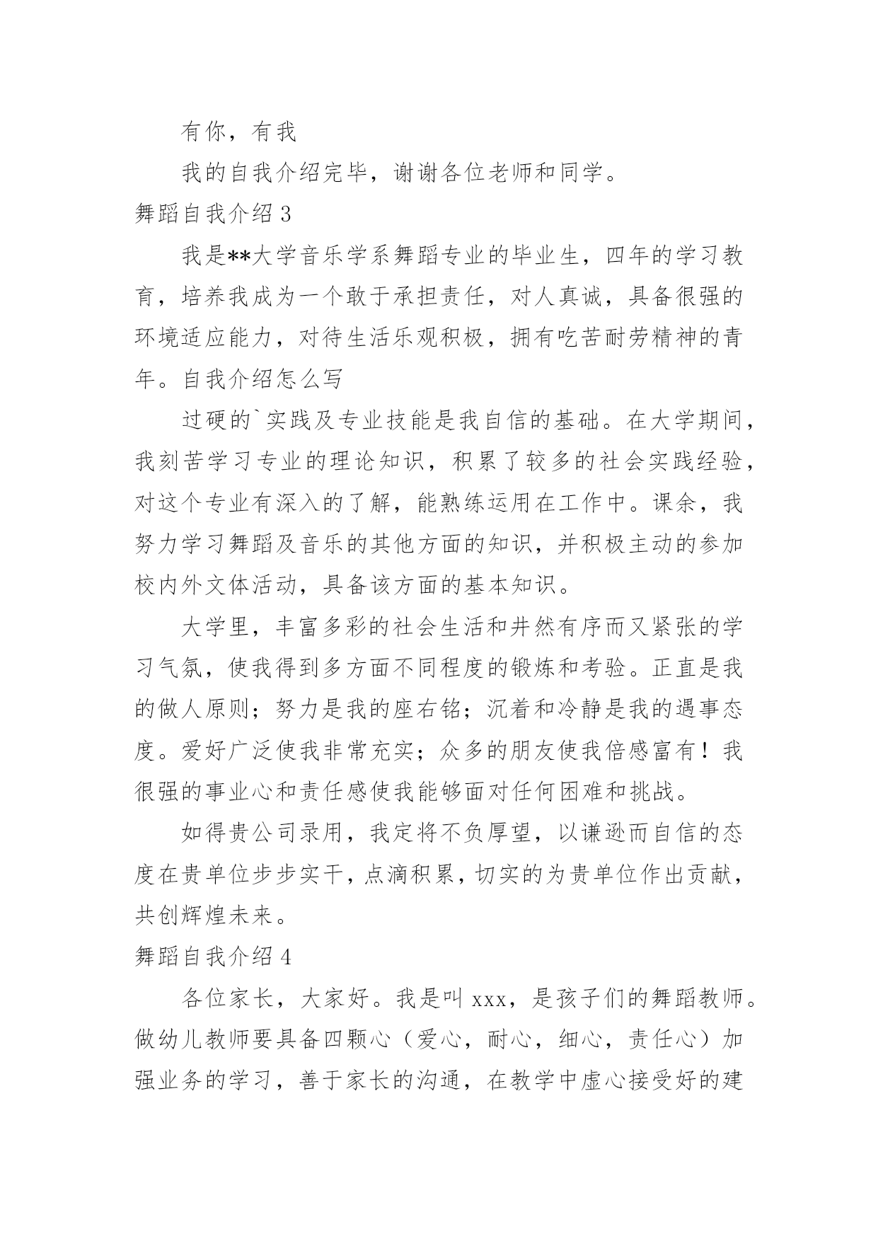 舞蹈自我介绍舞蹈自我介绍【热门】当来到一个新环境中,我们不得不需要向他人介绍自己,自我介绍可以唤起他人对我们的兴趣。那么什么样的自我介绍才合适呢?下面是小编为大家收集的舞蹈自我介绍,欢迎大家借鉴与参考,希望对大家有所帮助。舞蹈自我介绍1大家好!我是来自外语系的xx。本人性格活泼开朗,喜欢广泛交友,平时也喜欢参加各种活动,因此有着良好的人际关系。另外,我的思想比较活跃,经常有不错的创意和点子。我特别希望能够加入xx协会和大家一起努力策划出更多丰富多彩的.活动,通过这些活动达到完善自己和辐射他人的作用。xx协会对我来说是一个洋溢的青春与热情的大家庭,从这里,每个人都能学习和成长。我向往这种乐趣,也相信自己有能力创造出这份乐趣。之所有想要加入xx协会,是因为我是一个有责任心的人,不怕吃苦不怕累,做事有条理且认真负责,希望能将自己微薄的力量发挥到极致。也许我不是最优秀的,但我会是最负责的那一个;也许我不是最聪明的,但我会是最勤奋的那一个。如果我能有幸加入xx协会,我定会秉承“全心全意为同学服务”的宗旨,勇于创新,锐意进取,积极有效的完成各项工作。在此,希望带着我的热情加入这个友爱的集体,谢谢大家!舞蹈自我介绍2大家好,我叫×××,来自20xx级汉语言文学专业2班。我喜欢热闹的生活,喜欢交朋友,喜欢笑。坚信一切美好的信念,认真的生活。我常常觉得,大学4年是人生中极其宝贵的一段时光,虽然最终我们还是要步入社会,但我仍旧希望,在学习之余,我拥有一片广阔的天空。我不希望这4年在记忆中只是一片埋首在题海中的灰白。所以我希望进入了社团工作。多年的班级工作经验,使xuexila有信心承担舞蹈社团社团的工作,我也坚信通过努力,我可以合理安排工作与学习的`关系。我希望通过我们团队的努力,可以在任职的期间,切切实实做一切事情服务同学。我们怀抱着激情与期待生活着,工作着,以极大的耐心与信心面对未来未知的挑战。期待生活,挑战生活。最后,我想用一首小诗来结束我的自我介绍:哭过,笑过,彷徨过输过,赢过,拼搏过扬起嘴角,灿烂挥手告别,曾经的惘惑铿锵的说明天,社团的名单上有你,有我我的自我介绍完毕,谢谢各位老师和同学。舞蹈自我介绍3我是**大学音乐学系舞蹈专业的毕业生,四年的学习教育,培养我成为一个敢于承担责任,对人真诚,具备很强的环境适应能力,对待生活乐观积极,拥有吃苦耐劳精神的青年。自我介绍怎么写过硬的`实践及专业技能是我自信的基础。在大学期间,我刻苦学习专业的理论知识,积累了较多的社会实践经验,对这个专业有深入的了解,能熟练运用在工作中。课余,我努力学习舞蹈及音乐的其他方面的知识,并积极主动的参加校内外文体活动,具备该方面的基本知识。大学里,丰富多彩的社会生活和井然有序而又紧张的学习气氛,使我得到多方面不同程度的锻炼和考验。正直是我的做人原则;努力是我的座右铭;沉着和冷静是我的遇事态度。爱好广泛使我非常充实;众多的朋友使我倍感富有!我很强的事业心和责任感使我能够面对任何困难和挑战。如得贵公司录用,我定将不负厚望,以谦逊而自信的态度在贵单位步步实干,点滴积累,切实的为贵单位作出贡献,共创辉煌未来。舞蹈自我介绍4各位家长,大家好。我是叫xxx,是孩子们的舞蹈教师。做幼儿教师要具备四颗心(爱心,耐心,细心,责任心)加强业务的学习,善于家长的沟通,在教学中虚心接受好的建议,改进教学方法,能够总结自我的教学方法。在教学过程中,遇到调皮的孩子,一定不可以动粗,要耐心,因为我们的教态直接影响你的孩子,多给于关心,在无特殊情况下,一定不要放弃,也许就是这一个孩子也会影响你的教学质量,和家长对你的看法。对几天不来的孩子要家纺或电话慰问,你的一个电话会影响家长对你的开发,和家长沟通很重要。学舞蹈可以增强儿童体质,促进其健康快乐的成长。儿童期是整个人生的开端,在这一时期人的身体生长发育迅速。儿童经常参加有计划、有系统的舞蹈训练可以增强他们的体质,增加抵抗力,减少得病的可能。在舞蹈过程中呼吸、心跳、肌肉、骨骼、循环系统都得到了充分的锻炼,加快其机能的发育,加快新陈代谢,使他们的机体不断生长发育。其次儿童学习舞蹈可以陶冶情操,促进儿童良好性格的形成。儿童情感、意志力等非智力因素的教育是培养儿童成才的关键。而在具有教育意义的儿童舞蹈中,他们在活泼、轻松的气氛中,用身心去感受音乐形象,吸收音乐形象积极向上的精神状态,陶冶了情操。如:动作稍难时、感觉不好时或感觉有些累时,就需要儿童去克服这些困难,在克服这些困难的同时也锻炼了他们的意志力,使他们增强了吃苦耐劳、不怕困难的精神。因此,学习儿童舞蹈对儿童非智力因素的发展具有非常重要的意义。再其次儿童学习舞蹈可以启迪智慧,发展儿童的想象力、创造力、记忆力以及增强儿童的自信心。儿童舞蹈表演需要儿童的步态、手势、动作比日常生活中要夸张一些,在表演一