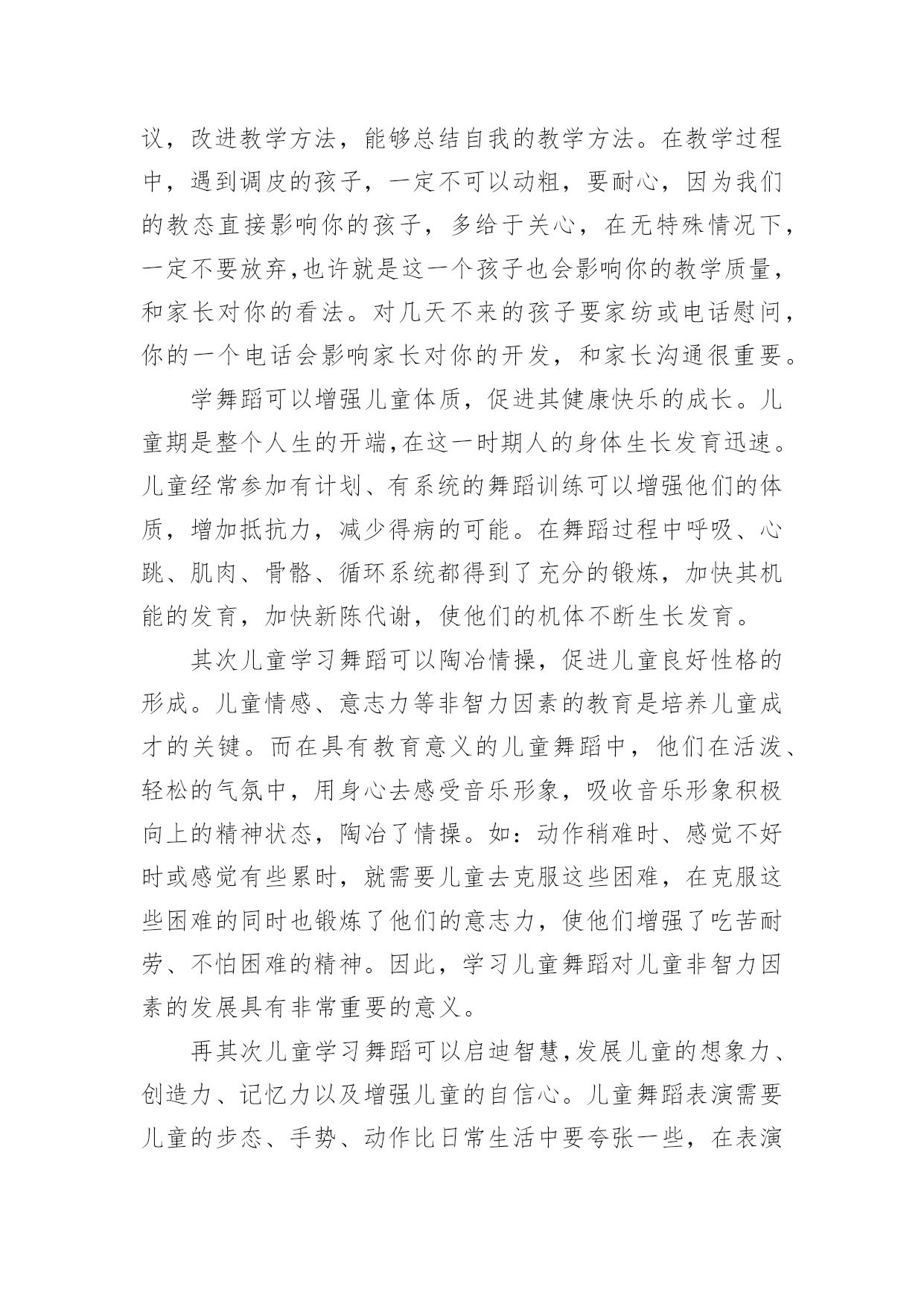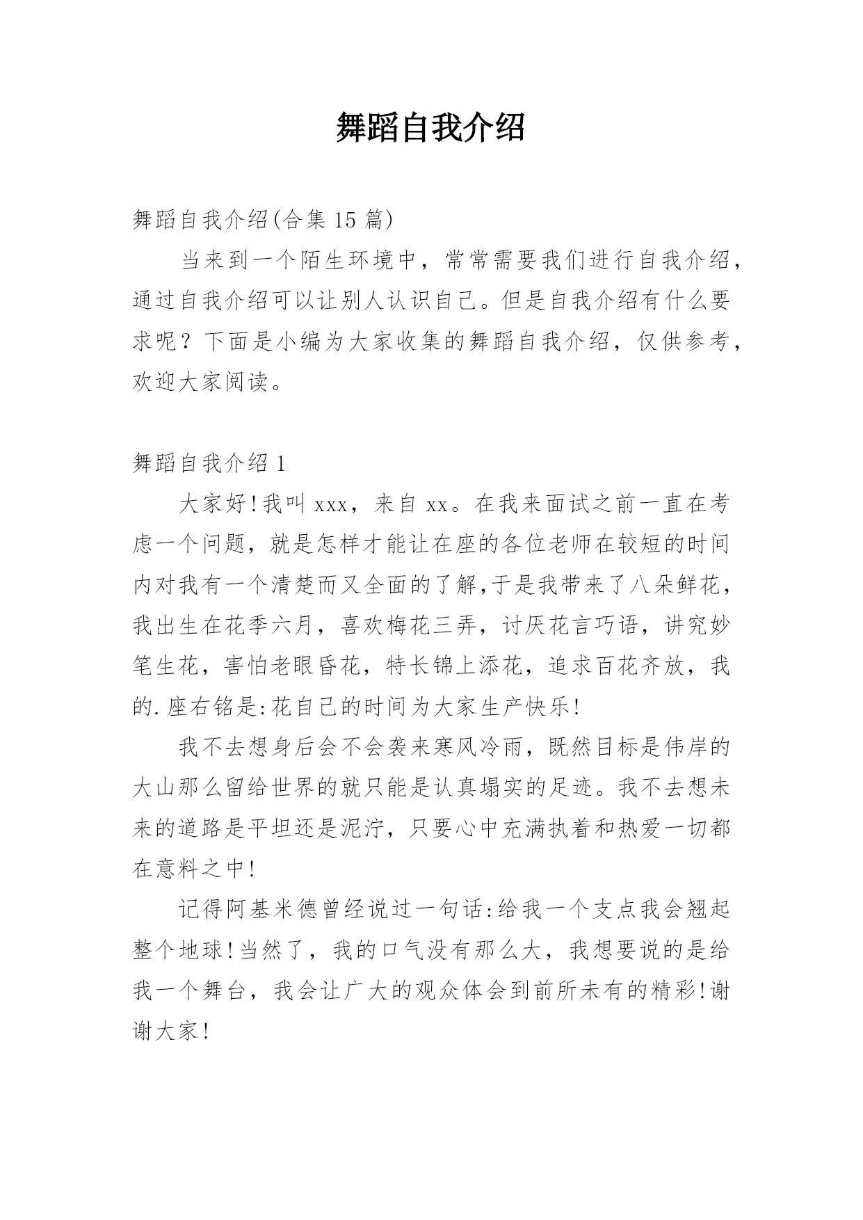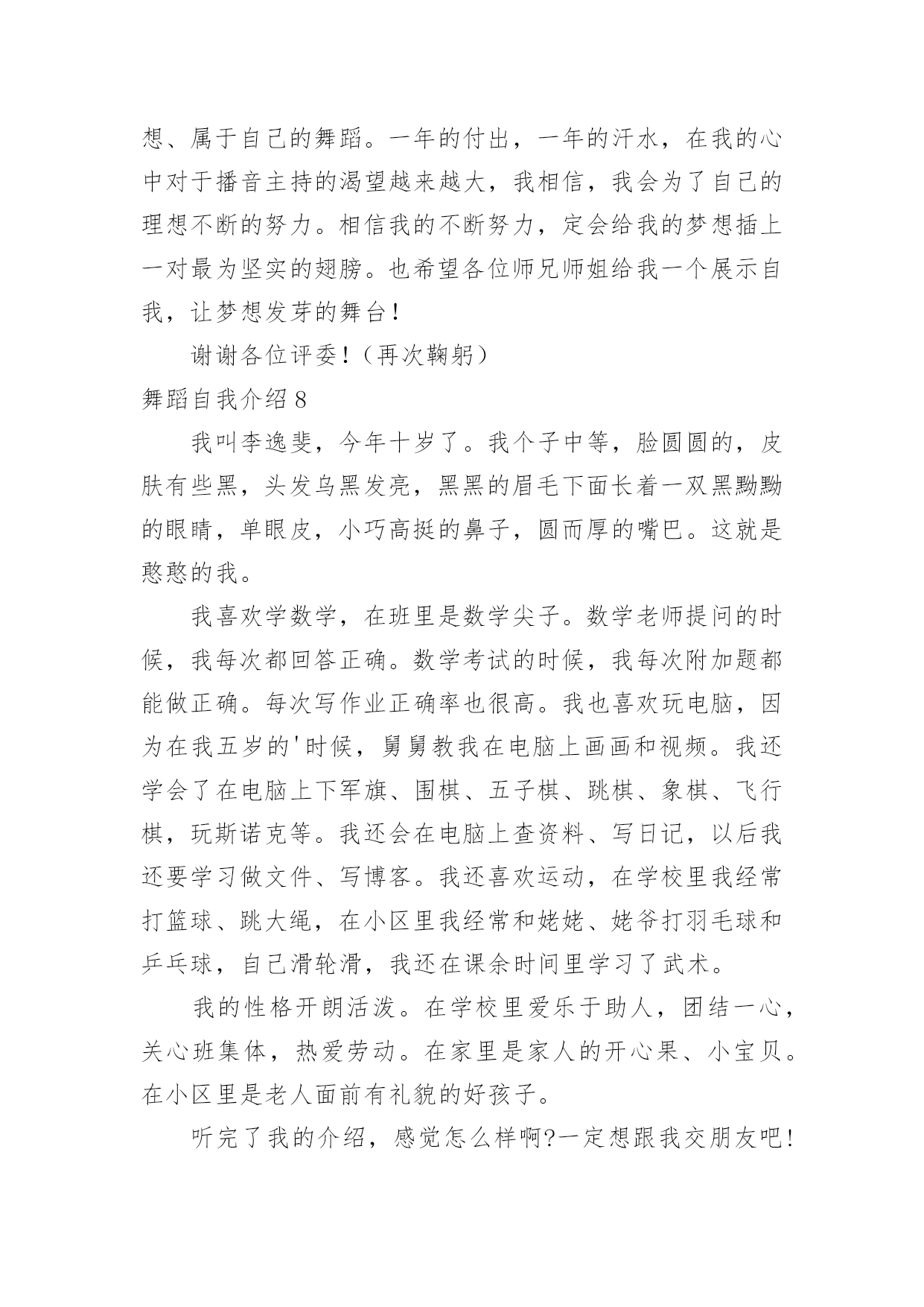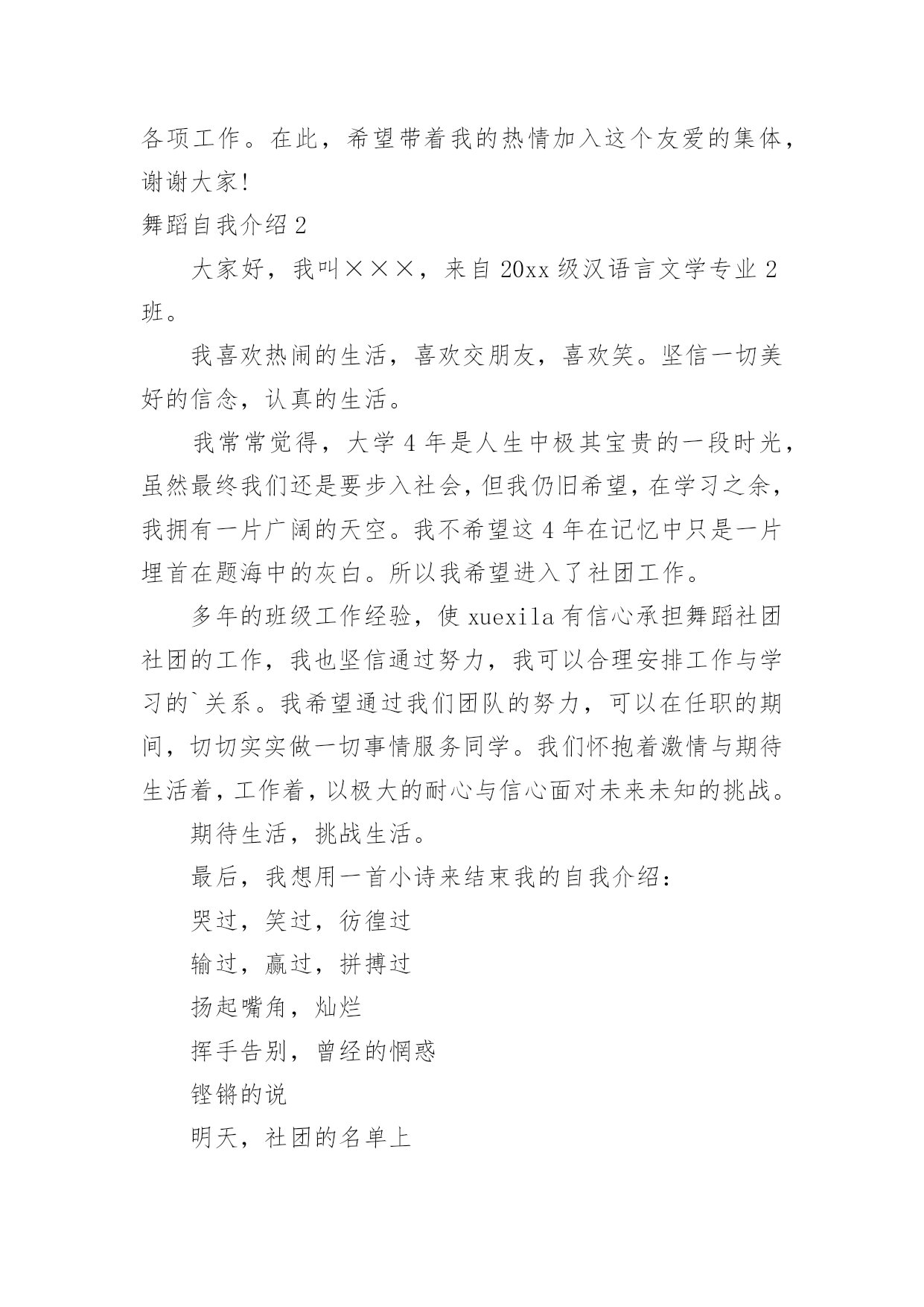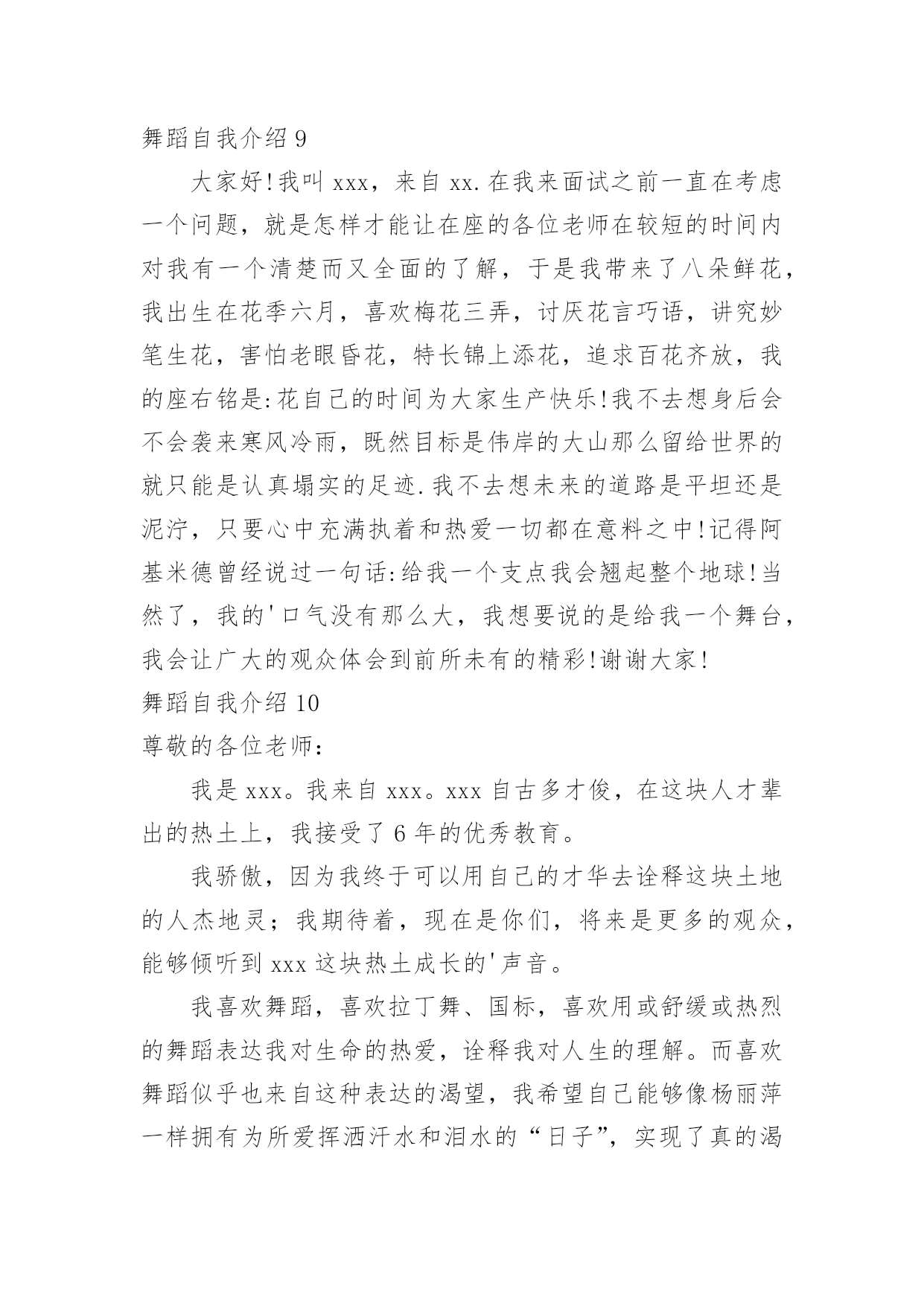 舞蹈自我介绍舞蹈自我介绍【热门】当来到一个新环境中,我们不得不需要向他人介绍自己,自我介绍可以唤起他人对我们的兴趣。那么什么样的自我介绍才合适呢?下面是小编为大家收集的舞蹈自我介绍,欢迎大家借鉴与参考,希望对大家有所帮助。舞蹈自我介绍1大家好!我是来自外语系的xx。本人性格活泼开朗,喜欢广泛交友,平时也喜欢参加各种活动,因此有着良好的人际关系。另外,我的思想比较活跃,经常有不错的创意和点子。我特别希望能够加入xx协会和大家一起努力策划出更多丰富多彩的.活动,通过这些活动达到完善自己和辐射他人的作用。xx协会对我来说是一个洋溢的青春与热情的大家庭,从这里,每个人都能学习和成长。我向往这种乐趣,也相信自己有能力创造出这份乐趣。之所有想要加入xx协会,是因为我是一个有责任心的人,不怕吃苦不怕累,做事有条理且认真负责,希望能将自己微薄的力量发挥到极致。也许我不是最优秀的,但我会是最负责的那一个;也许我不是最聪明的,但我会是最勤奋的那一个。如果我能有幸加入xx协会,我定会秉承“全心全意为同学服务”的宗旨,勇于创新,锐意进取,积极有效的完成各项工作。在此,希望带着我的热情加入这个友爱的集体,谢谢大家!舞蹈自我介绍2大家好,我叫×××,来自20xx级汉语言文学专业2班。我喜欢热闹的生活,喜欢交朋友,喜欢笑。坚信一切美好的信念,认真的生活。我常常觉得,大学4年是人生中极其宝贵的一段时光,虽然最终我们还是要步入社会,但我仍旧希望,在学习之余,我拥有一片广阔的天空。我不希望这4年在记忆中只是一片埋首在题海中的灰白。所以我希望进入了社团工作。多年的班级工作经验,使xuexila有信心承担舞蹈社团社团的工作,我也坚信通过努力,我可以合理安排工作与学习的`关系。我希望通过我们团队的努力,可以在任职的期间,切切实实做一切事情服务同学。我们怀抱着激情与期待生活着,工作着,以极大的耐心与信心面对未来未知的挑战。期待生活,挑战生活。最后,我想用一首小诗来结束我的自我介绍:哭过,笑过,彷徨过输过,赢过,拼搏过扬起嘴角,灿烂挥手告别,曾经的惘惑铿锵的说明天,社团的名单上有你,有我我的自我介绍完毕,谢谢各位老师和同学。舞蹈自我介绍3我是**大学音乐学系舞蹈专业的毕业生,四年的学习教育,培养我成为一个敢于承担责任,对人真诚,具备很强的环境适应能力,对待生活乐观积极,拥有吃苦耐劳精神的青年。自我介绍怎么写过硬的`实践及专业技能是我自信的基础。在大学期间,我刻苦学习专业的理论知识,积累了较多的社会实践经验,对这个专业有深入的了解,能熟练运用在工作中。课余,我努力学习舞蹈及音乐的其他方面的知识,并积极主动的参加校内外文体活动,具备该方面的基本知识。大学里,丰富多彩的社会生活和井然有序而又紧张的学习气氛,使我得到多方面不同程度的锻炼和考验。正直是我的做人原则;努力是我的座右铭;沉着和冷静是我的遇事态度。爱好广泛使我非常充实;众多的朋友使我倍感富有!我很强的事业心和责任感使我能够面对任何困难和挑战。如得贵公司录用,我定将不负厚望,以谦逊而自信的态度在贵单位步步实干,点滴积累,切实的为贵单位作出贡献,共创辉煌未来。舞蹈自我介绍4各位家长,大家好。我是叫xxx,是孩子们的舞蹈教师。做幼儿教师要具备四颗心(爱心,耐心,细心,责任心)加强业务的学习,善于家长的沟通,在教学中虚心接受好的建议,改进教学方法,能够总结自我的教学方法。在教学过程中,遇到调皮的孩子,一定不可以动粗,要耐心,因为我们的教态直接影响你的孩子,多给于关心,在无特殊情况下,一定不要放弃,也许就是这一个孩子也会影响你的教学质量,和家长对你的看法。对几天不来的孩子要家纺或电话慰问,你的一个电话会影响家长对你的开发,和家长沟通很重要。学舞蹈可以增强儿童体质,促进其健康快乐的成长。儿童期是整个人生的开端,在这一时期人的身体生长发育迅速。儿童经常参加有计划、有系统的舞蹈训练可以增强他们的体质,增加抵抗力,减少得病的可能。在舞蹈过程中呼吸、心跳、肌肉、骨骼、循环系统都得到了充分的锻炼,加快其机能的发育,加快新陈代谢,使他们的机体不断生长发育。其次儿童学习舞蹈可以陶冶情操,促进儿童良好性格的形成。儿童情感、意志力等非智力因素的教育是培养儿童成才的关键。而在具有教育意义的儿童舞蹈中,他们在活泼、轻松的气氛中,用身心去感受音乐形象,吸收音乐形象积极向上的精神状态,陶冶了情操。如:动作稍难时、感觉不好时或感觉有些累时,就需要儿童去克服这些困难,在克服这些困难的同时也锻炼了他们的意志力,使他们增强了吃苦耐劳、不怕困难的精神。因此,学习儿童舞蹈对儿童非智力因素的发展具有非常重要的意义。再其次儿童学习舞蹈可以启迪智慧,发展儿童的想象力、创造力、记忆力以及增强儿童的自信心。儿童舞蹈表演需要儿童的步态、手势、动作比日常生活中要夸张一些,在表演一