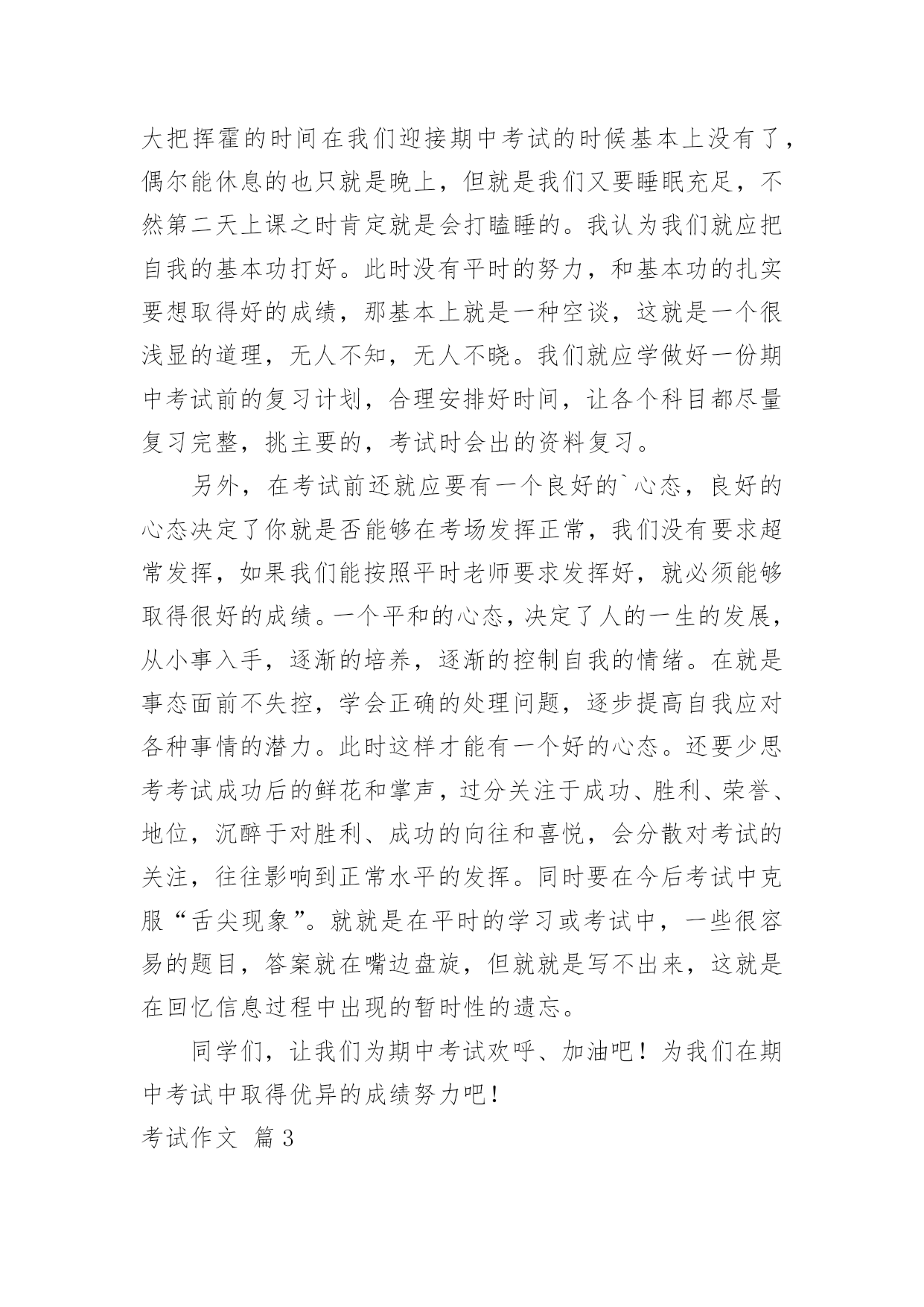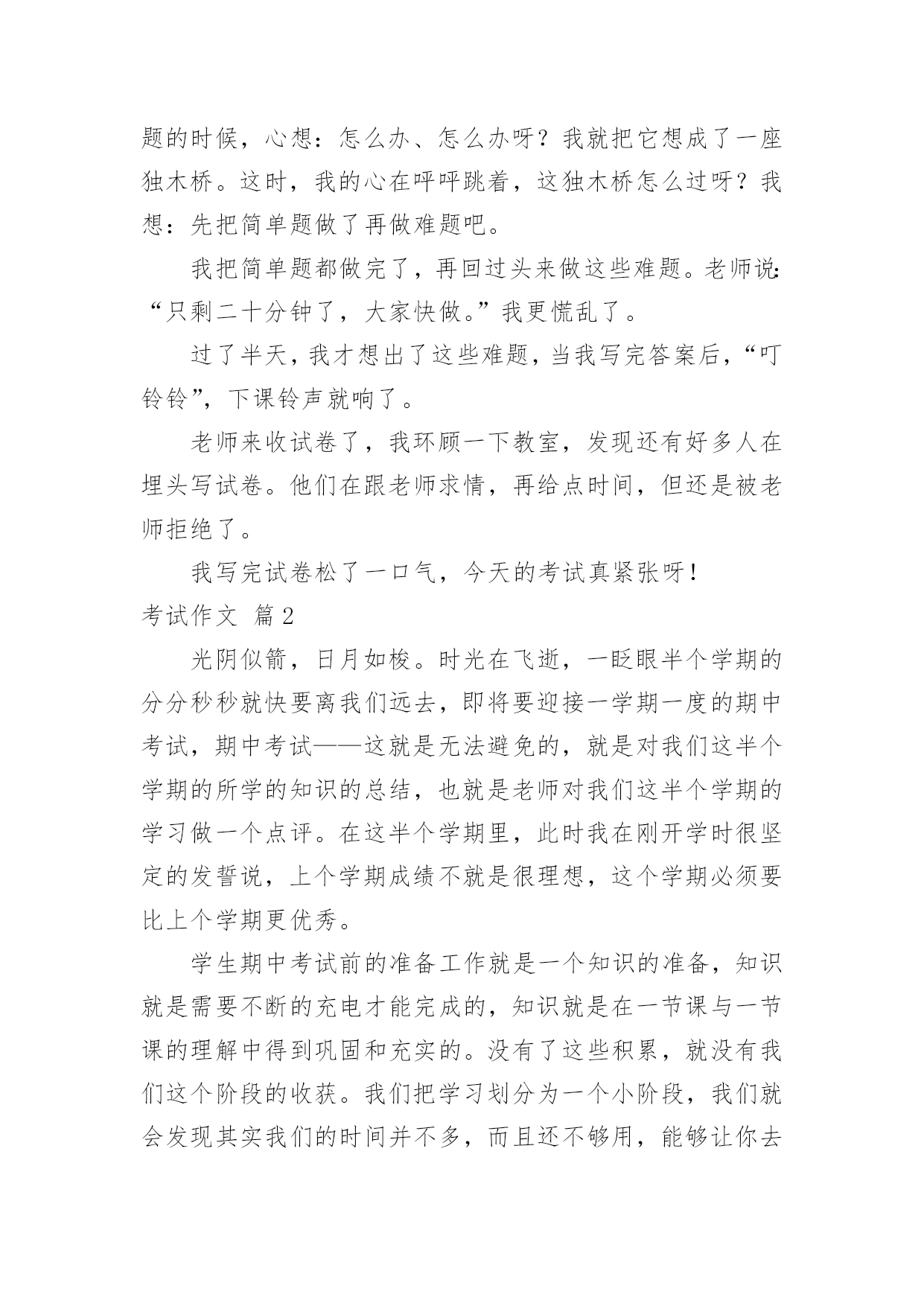 考试作文考试作文常用3篇在日常的学习、工作、生活中,大家都有写作文的经历,对作文很是熟悉吧,作文是经过人的思想考虑和语言组织,通过文字来表达一个主题意义的记叙方法。那么你知道一篇好的作文该怎么写吗?下面是小编收集整理的考试作文4篇,仅供参考,希望能够帮助到大家。考试作文篇1“叮铃铃”,上课铃声响了,语文老师抱着一大摞白纸走了进来,原本热闹的教室,此时突然安静了下来。老师严肃地说:“今天考试语文,考试的时候不能东张西望,好好考试。”我开始紧张了:我要是考不好怎么办呢?唉,还是好好。开始发卷子了,老师先发一小摞放在每一组最前面,然后再由每组同学一个个往后传,当传到我的时候,我快速地取了一张试卷,然后转过身去,把剩下的'卷子递到了后面的同学。我低下头看卷子,只见上面的题,有简单的,也有难的。第1、2、4、8题是简单的题。第1题是把正确的读音打“√”,第2题是写生字,第4题是填空,第8题是短文。第3、5、6、7是难题。第3题是选字填空,第5题是解决问题,第6、7题都是填古诗。我迅速写下名字、班级和学校。当我再一次看到那些难题的时候,心想:怎么办、怎么办呀?我就把它想成了一座独木桥。这时,我的心在呯呯跳着,这独木桥怎么过呀?我想:先把简单题做了再做难题吧。我把简单题都做完了,再回过头来做这些难题。老师说:“只剩二十分钟了,大家快做。”我更慌乱了。过了半天,我才想出了这些难题,当我写完答案后,“叮铃铃”,下课铃声就响了。老师来收试卷了,我环顾一下教室,发现还有好多人在埋头写试卷。他们在跟老师求情,再给点时间,但还是被老师拒绝了。我写完试卷松了一口气,今天的考试真紧张呀!考试作文篇2光阴似箭,日月如梭。时光在飞逝,一眨眼半个学期的分分秒秒就快要离我们远去,即将要迎接一学期一度的期中考试,期中考试——这就是无法避免的,就是对我们这半个学期的所学的知识的总结,也就是老师对我们这半个学期的学习做一个点评。在这半个学期里,此时我在刚开学时很坚定的发誓说,上个学期成绩不就是很理想,这个学期必须要比上个学期更优秀。学生期中考试前的准备工作就是一个知识的准备,知识就是需要不断的充电才能完成的,知识就是在一节课与一节课的理解中得到巩固和充实的。没有了这些积累,就没有我们这个阶段的收获。我们把学习划分为一个小阶段,我们就会发现其实我们的时间并不多,而且还不够用,能够让你去大把挥霍的时间在我们迎接期中考试的时候基本上没有了,偶尔能休息的也只就是晚上,但就是我们又要睡眠充足,不然第二天上课之时肯定就是会打瞌睡的。我认为我们就应把自我的基本功打好。此时没有平时的努力,和基本功的扎实要想取得好的成绩,那基本上就是一种空谈,这就是一个很浅显的道理,无人不知,无人不晓。我们就应学做好一份期中考试前的复习计划,合理安排好时间,让各个科目都尽量复习完整,挑主要的,考试时会出的资料复习。另外,在考试前还就应要有一个良好的`心态,良好的心态决定了你就是否能够在考场发挥正常,我们没有要求超常发挥,如果我们能按照平时老师要求发挥好,就必须能够取得很好的成绩。一个平和的心态,决定了人的一生的发展,从小事入手,逐渐的培养,逐渐的控制自我的情绪。在就是事态面前不失控,学会正确的处理问题,逐步提高自我应对各种事情的潜力。此时这样才能有一个好的心态。还要少思考考试成功后的鲜花和掌声,过分关注于成功、胜利、荣誉、地位,沉醉于对胜利、成功的向往和喜悦,会分散对考试的关注,往往影响到正常水平的发挥。同时要在今后考试中克服“舌尖现象”。就就是在平时的学习或考试中,一些很容易的题目,答案就在嘴边盘旋,但就就是写不出来,这就是在回忆信息过程中出现的暂时性的遗忘。同学们,让我们为期中考试欢呼、加油吧!为我们在期中考试中取得优异的成绩努力吧!考试作文篇3当天空无云时,风会与你为伴;当你的心灵无云时,快乐会与你为伴.----题记看到这个题材时,我回忆起很多美好的风景:青山绿水,百丈飞瀑的磅礴之势。西湖柳阴,小桥流水的温婉之气。草长莺飞,蜂围蝶阵的灵秀之韵......,都仿佛是昨天才看过的一样清晰,明澈。我无限的热爱自然,它的山,它的水,它的树,它的花草......,它的一切一切都是令人痴醉的。而在这之中,我最欣赏的便是水!江南的水,是神秘而精美的。如同深闺中曼妙的江南女子。姑苏河畔,秦淮河边,不知蕴育了多少爱恨情愁。西泠桥边的苏小小,断桥那边的白娘子,都是我们流传已久的经典绝唱。江南的水,造就了女水的江南,江南的水,亦是霸气而华丽的。吴越时那一把把绝世无双的宝剑,哪个不是在水中一次又一次的锤炼而出的?江南的水,太容易让人迷惑!北方亦有水,而这种水由古老的游牧民族来编织。它奔跑如草场上万马奔腾的气势,太过大气。这也是自然给予我们珍贵的财富。我们要珍惜它,不能浪费!自然是一本大书,水是它的`文字,描写着各个民