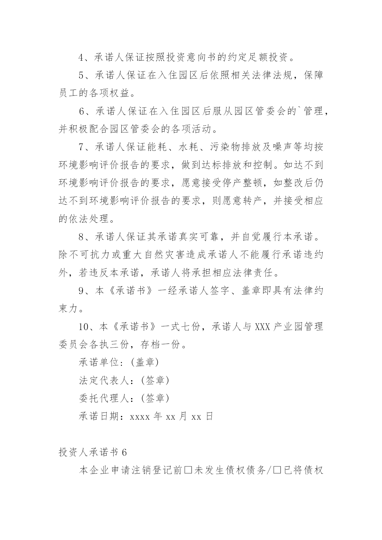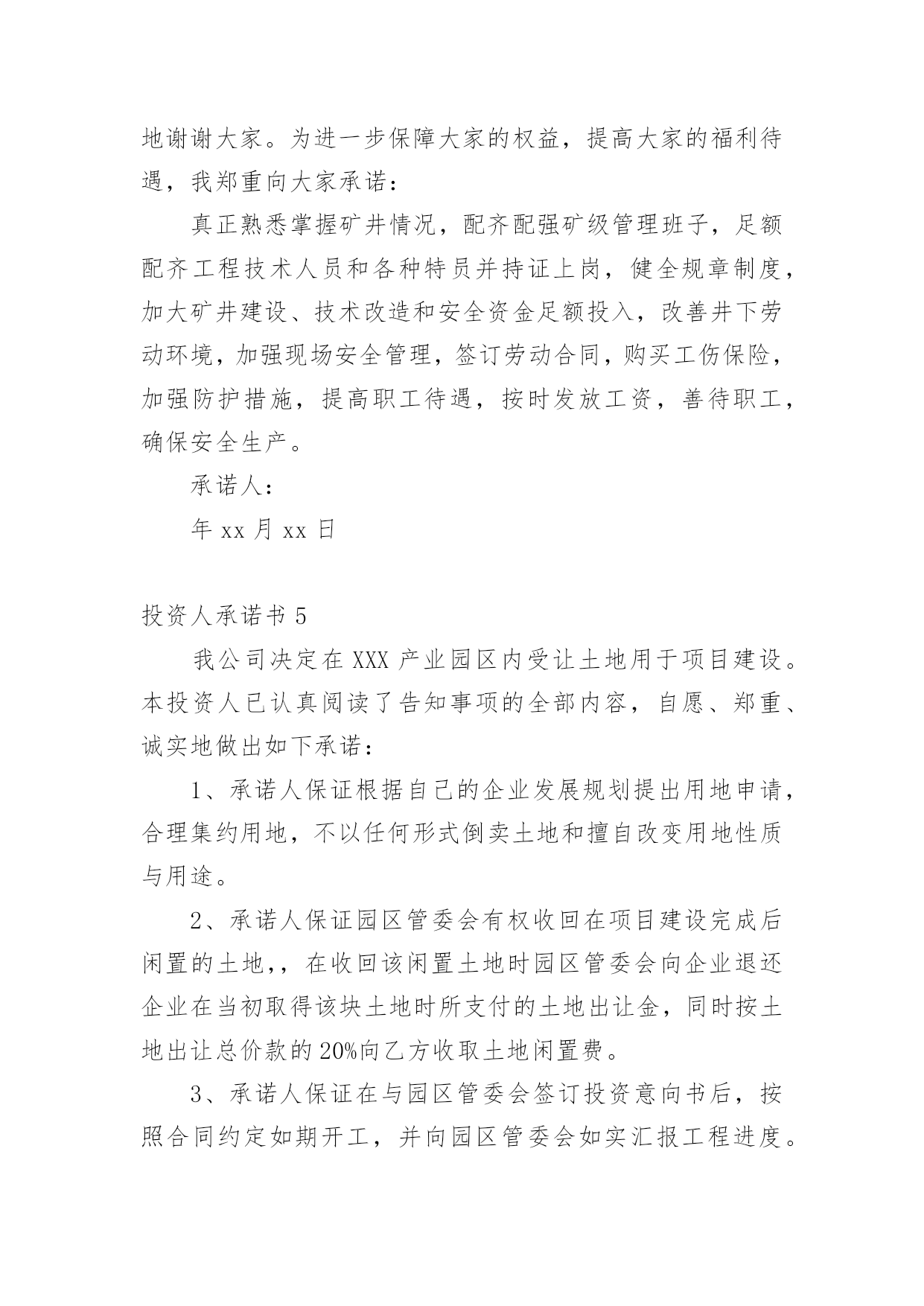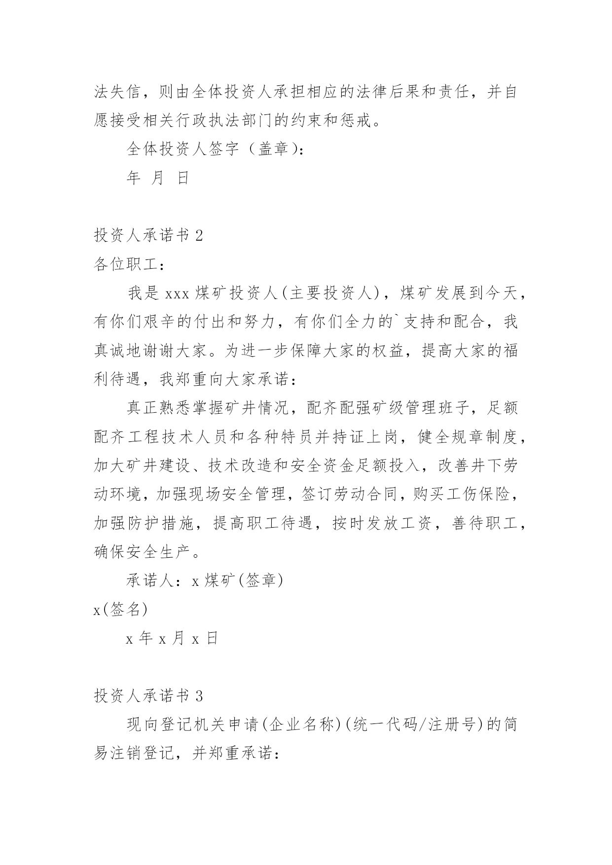 投资人承诺书在日新月异的现代社会中,需要使用承诺书的场合越来越多,承诺书是承诺人对要约人的要约完全同意的意思,表示以书面形式。那么,怎么去写承诺书呢?下面是小编精心整理的投资人承诺书,欢迎大家借鉴与参考,希望对大家有所帮助。投资人承诺书1现向登记机关申请__________(企业名称)的简易注销登记,并郑重承诺:本企业申请注销登记前未发生债权债务/已将债权债务清算完结,不存在未结清清算费用、职工工资、社会保险费用、法定补偿金和未交清的应缴纳税款及其他未了结事务,清算工作已全面完结。本企业承诺申请注销登记时不存在以下情形:涉及国家规定实施准入特别管理措施的外商投资企业;被列入企业经营异常名录或严重违法失信企业名单的;存在股权(投资权益)被冻结、出质或动产抵押等情形;有正在被立案调查或采取行政强制、司法协助、被予以行政处罚等情形的;企业所属的非法人分支机构未办理注销登记的;曾被终止简易注销程序的;法律、行政法规或者国务院决定规定在注销登记前需经批准的;不适用企业简易注销登记的其他情形。本企业全体投资人对以上承诺的'真实性负责,如果违法失信,则由全体投资人承担相应的法律后果和责任,并自愿接受相关行政执法部门的约束和惩戒。全体投资人签字(盖章):年月日投资人承诺书2各位职工:我是xxx煤矿投资人(主要投资人),煤矿发展到今天,有你们艰辛的付出和努力,有你们全力的`支持和配合,我真诚地谢谢大家。为进一步保障大家的权益,提高大家的福利待遇,我郑重向大家承诺:真正熟悉掌握矿井情况,配齐配强矿级管理班子,足额配齐工程技术人员和各种特员并持证上岗,健全规章制度,加大矿井建设、技术改造和安全资金足额投入,改善井下劳动环境,加强现场安全管理,签订劳动合同,购买工伤保险,加强防护措施,提高职工待遇,按时发放工资,善待职工,确保安全生产。承诺人:x煤矿(签章)x(签名)x年x月x日投资人承诺书3现向登记机关申请(企业名称)(统一代码/注册号)的简易注销登记,并郑重承诺:本企业申请注销登记前□未发生债权债务□已将债权债务清算完结,不存在未结清清算费用、职工工资、社会保险费用、法定补偿金和未交清的应缴纳税款及其他未了结事务,清算工作已全面完结。本企业承诺申请注销登记时不存在以下情形:涉及国家规定实施准入特别管理措施的.外商投资企业;被列入企业经营异常名录或严重违法失信企业名单的;存在股权(投资权益)被冻结、出质或动产抵押等情形;有正在被立案调查或采取行政强制、司法协助、被予以行政处罚等情形的;企业所属的非法人分支机构未办理注销登记的;所投资的子公司未清理完毕的;曾被终止简易注销程序的;法律、行政法规或者国务院决定规定在注销登记前需经批准的;不适用企业简易注销登记的其他情形。本企业全体投资人对以上承诺的真实性负责,如果违法失信,则由全体投资人承担相应的法律后果和责任,并自愿接受相关行政执法部门的约束和惩戒。全体投资人名称(姓名)及签字(盖章):xxxxxx年xx月xx日投资人承诺书4各位职工:我是煤矿投资人(主要投资人),煤矿发展到今天,有你们艰辛的`付出和努力,有你们全力的支持和配合,我真诚地谢谢大家。为进一步保障大家的权益,提高大家的福利待遇,我郑重向大家承诺:真正熟悉掌握矿井情况,配齐配强矿级管理班子,足额配齐工程技术人员和各种特员并持证上岗,健全规章制度,加大矿井建设、技术改造和安全资金足额投入,改善井下劳动环境,加强现场安全管理,签订劳动合同,购买工伤保险,加强防护措施,提高职工待遇,按时发放工资,善待职工,确保安全生产。承诺人:年xx月xx日投资人承诺书5我公司决定在XXX产业园区内受让土地用于项目建设。本投资人已认真阅读了告知事项的全部内容,自愿、郑重、诚实地做出如下承诺:1、承诺人保证根据自己的企业发展规划提出用地申请,合理集约用地,不以任何形式倒卖土地和擅自改变用地性质与用途。2、承诺人保证园区管委会有权收回在项目建设完成后闲置的土地,,在收回该闲置土地时园区管委会向企业退还企业在当初取得该块土地时所支付的土地出让金,同时按土地出让总价款的20%向乙方收取土地闲置费。3、承诺人保证在与园区管委会签订投资意向书后,按照合同约定如期开工,并向园区管委会如实汇报工程进度。4、承诺人保证按照投资意向书的约定足额投资。5、承诺人保证在入住园区后依照相关法律法规,保障员工的各项权益。6、承诺人保证在入住园区后服从园区管委会的`管理,并积极配合园区管委会的各项活动。7、承诺人保证能耗、水耗、污染物排放及噪声等均按环境影响评价报告的要求,做到达标排放和控制。如达不到环境影响评价报告的要求,愿意接受停产整顿,如整改后仍达不到环境影响评价报告的要求,则愿意转产,并接受相应的依法处理。8、承诺人保证其承诺真实可靠,并自觉履行本承诺。除不可抗力或重大自然灾害造