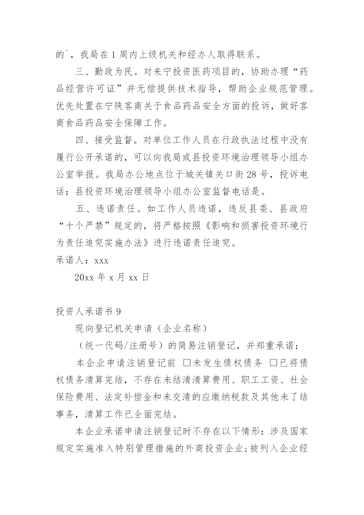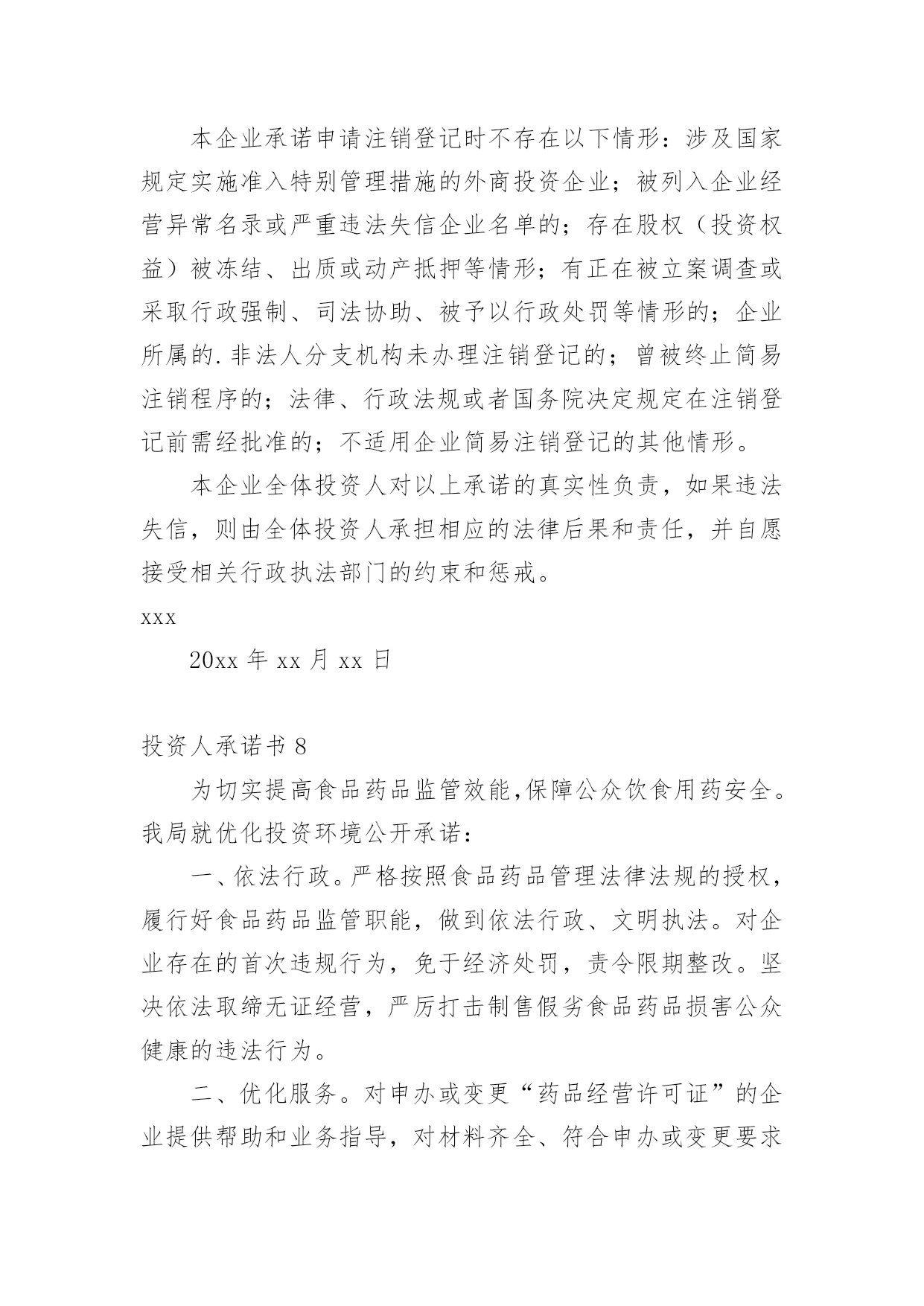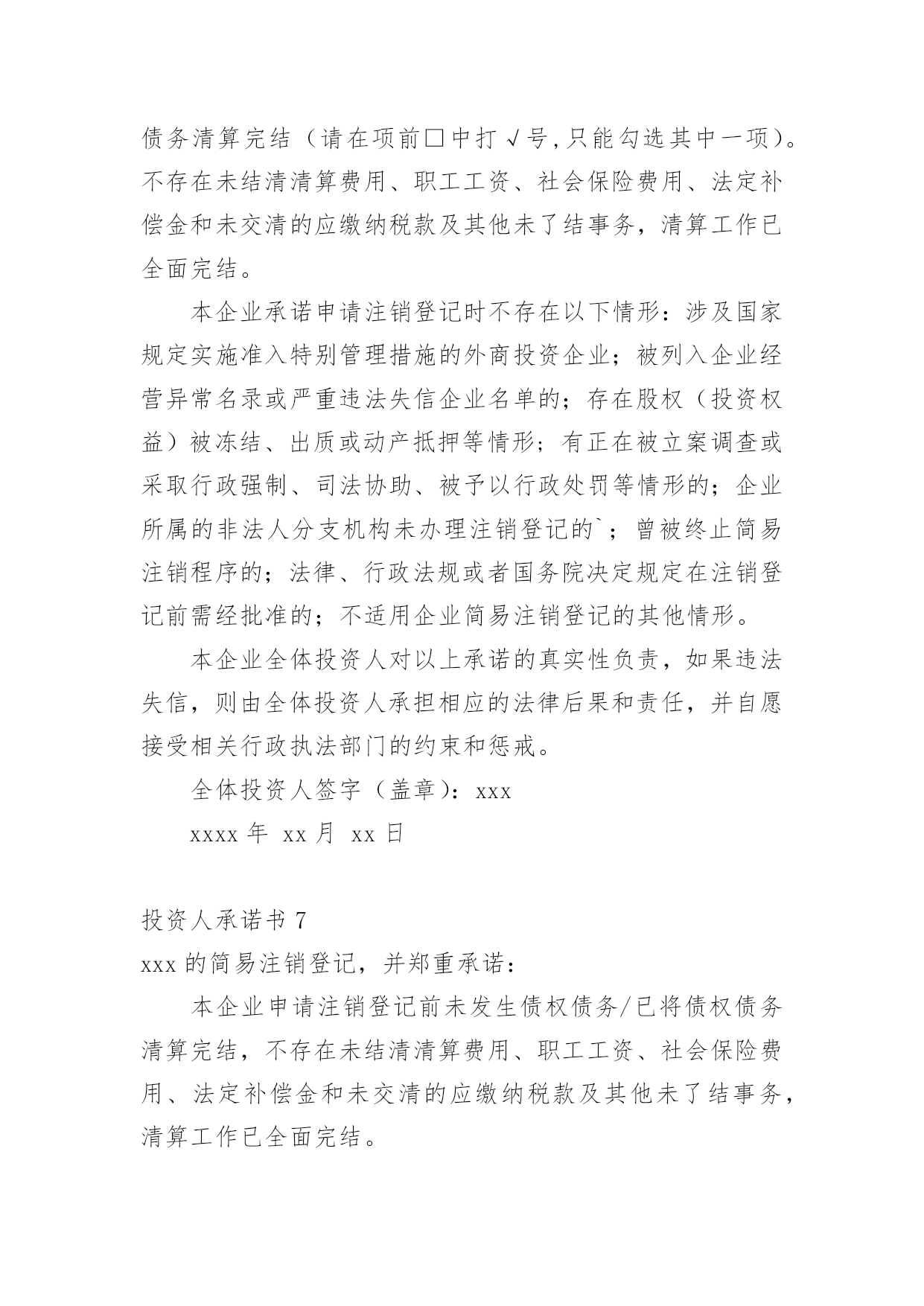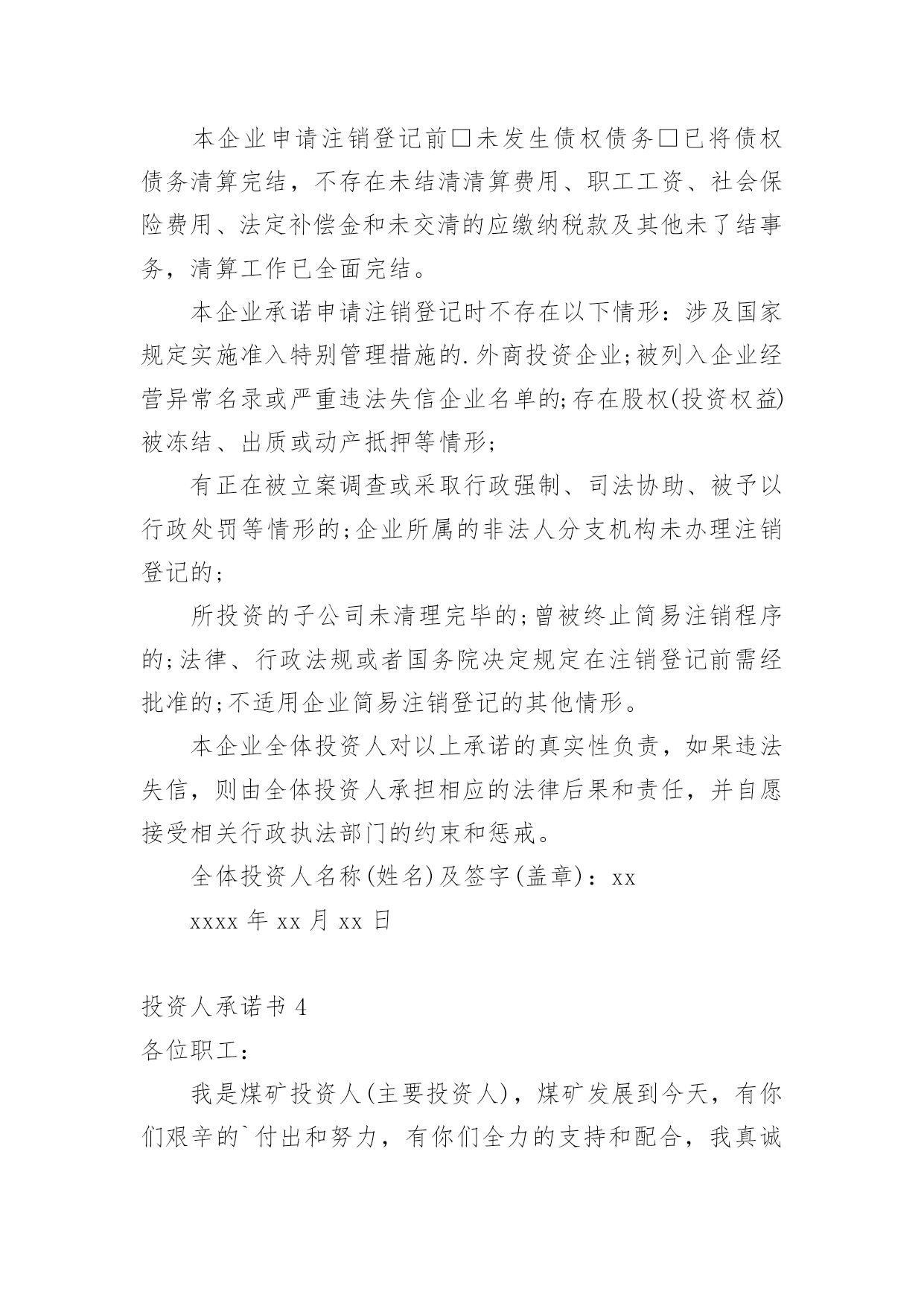 投资人承诺书在日新月异的现代社会中,需要使用承诺书的场合越来越多,承诺书是承诺人对要约人的要约完全同意的意思,表示以书面形式。那么,怎么去写承诺书呢?下面是小编精心整理的投资人承诺书,欢迎大家借鉴与参考,希望对大家有所帮助。投资人承诺书1现向登记机关申请__________(企业名称)的简易注销登记,并郑重承诺:本企业申请注销登记前未发生债权债务/已将债权债务清算完结,不存在未结清清算费用、职工工资、社会保险费用、法定补偿金和未交清的应缴纳税款及其他未了结事务,清算工作已全面完结。本企业承诺申请注销登记时不存在以下情形:涉及国家规定实施准入特别管理措施的外商投资企业;被列入企业经营异常名录或严重违法失信企业名单的;存在股权(投资权益)被冻结、出质或动产抵押等情形;有正在被立案调查或采取行政强制、司法协助、被予以行政处罚等情形的;企业所属的非法人分支机构未办理注销登记的;曾被终止简易注销程序的;法律、行政法规或者国务院决定规定在注销登记前需经批准的;不适用企业简易注销登记的其他情形。本企业全体投资人对以上承诺的'真实性负责,如果违法失信,则由全体投资人承担相应的法律后果和责任,并自愿接受相关行政执法部门的约束和惩戒。全体投资人签字(盖章):年月日投资人承诺书2各位职工:我是xxx煤矿投资人(主要投资人),煤矿发展到今天,有你们艰辛的付出和努力,有你们全力的`支持和配合,我真诚地谢谢大家。为进一步保障大家的权益,提高大家的福利待遇,我郑重向大家承诺:真正熟悉掌握矿井情况,配齐配强矿级管理班子,足额配齐工程技术人员和各种特员并持证上岗,健全规章制度,加大矿井建设、技术改造和安全资金足额投入,改善井下劳动环境,加强现场安全管理,签订劳动合同,购买工伤保险,加强防护措施,提高职工待遇,按时发放工资,善待职工,确保安全生产。承诺人:x煤矿(签章)x(签名)x年x月x日投资人承诺书3现向登记机关申请(企业名称)(统一代码/注册号)的简易注销登记,并郑重承诺:本企业申请注销登记前□未发生债权债务□已将债权债务清算完结,不存在未结清清算费用、职工工资、社会保险费用、法定补偿金和未交清的应缴纳税款及其他未了结事务,清算工作已全面完结。本企业承诺申请注销登记时不存在以下情形:涉及国家规定实施准入特别管理措施的.外商投资企业;被列入企业经营异常名录或严重违法失信企业名单的;存在股权(投资权益)被冻结、出质或动产抵押等情形;有正在被立案调查或采取行政强制、司法协助、被予以行政处罚等情形的;企业所属的非法人分支机构未办理注销登记的;所投资的子公司未清理完毕的;曾被终止简易注销程序的;法律、行政法规或者国务院决定规定在注销登记前需经批准的;不适用企业简易注销登记的其他情形。本企业全体投资人对以上承诺的真实性负责,如果违法失信,则由全体投资人承担相应的法律后果和责任,并自愿接受相关行政执法部门的约束和惩戒。全体投资人名称(姓名)及签字(盖章):xxxxxx年xx月xx日投资人承诺书4各位职工:我是煤矿投资人(主要投资人),煤矿发展到今天,有你们艰辛的`付出和努力,有你们全力的支持和配合,我真诚地谢谢大家。为进一步保障大家的权益,提高大家的福利待遇,我郑重向大家承诺:真正熟悉掌握矿井情况,配齐配强矿级管理班子,足额配齐工程技术人员和各种特员并持证上岗,健全规章制度,加大矿井建设、技术改造和安全资金足额投入,改善井下劳动环境,加强现场安全管理,签订劳动合同,购买工伤保险,加强防护措施,提高职工待遇,按时发放工资,善待职工,确保安全生产。承诺人:年xx月xx日投资人承诺书5我公司决定在XXX产业园区内受让土地用于项目建设。本投资人已认真阅读了告知事项的全部内容,自愿、郑重、诚实地做出如下承诺:1、承诺人保证根据自己的企业发展规划提出用地申请,合理集约用地,不以任何形式倒卖土地和擅自改变用地性质与用途。2、承诺人保证园区管委会有权收回在项目建设完成后闲置的土地,,在收回该闲置土地时园区管委会向企业退还企业在当初取得该块土地时所支付的土地出让金,同时按土地出让总价款的20%向乙方收取土地闲置费。3、承诺人保证在与园区管委会签订投资意向书后,按照合同约定如期开工,并向园区管委会如实汇报工程进度。4、承诺人保证按照投资意向书的约定足额投资。5、承诺人保证在入住园区后依照相关法律法规,保障员工的各项权益。6、承诺人保证在入住园区后服从园区管委会的`管理,并积极配合园区管委会的各项活动。7、承诺人保证能耗、水耗、污染物排放及噪声等均按环境影响评价报告的要求,做到达标排放和控制。如达不到环境影响评价报告的要求,愿意接受停产整顿,如整改后仍达不到环境影响评价报告的要求,则愿意转产,并接受相应的依法处理。8、承诺人保证其承诺真实可靠,并自觉履行本承诺。除不可抗力或重大自然灾害造