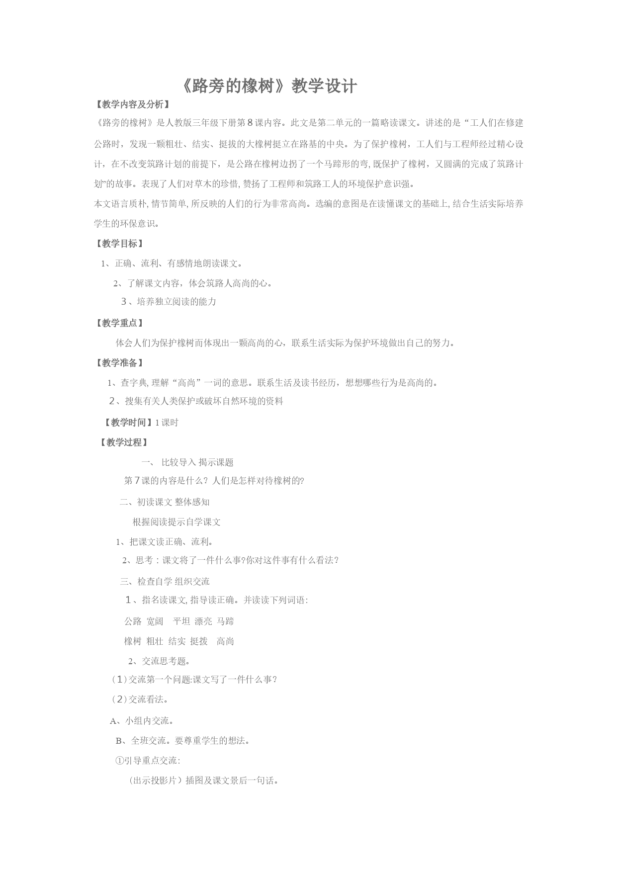 PAGEPAGE5《路旁的橡树》教学设计资料教学目标:1.认识本课的3个生字。能正确、流利、有感情地朗读课文。2.从筑路工人的行动中受到教育,培养爱护花草树木、自觉保护生态环境的意识。教学步骤:(一)揭示课题1.如果在修一条路时,前面遇到一棵树,你打算怎样办2.这节课我们来学习第11课《路旁的橡树》。(二)自学出示自学提示①自由读课文,要求读准字音。②一边读、一边想:每段讲的是什么③把不理解的地方做上记号,反复读。(三)检查自学情况1.指名分自然段,读课文,说一说:每段讲的是什么理解宽阔、平坦、沉重、不约而同、赞叹等词语。2.置疑学生提出不懂的问题,讨论交流。(四)再读课文1.一边读、一边想:为什么人们赞叹筑路人有一颗高尚的心说明了什么2.大家讨论、交流。(五)有感情地朗读课文教师指导学生有感情地朗读课文。(六)总结学了这篇课文之后,你有什么想法在选择是保树,还是砍树修路时,筑路人毅然选择了保树,宁可多费力气,多花钱,做了一件非常有意义的事。教案点评:《路旁的橡树》教学设计示例二点评这是一篇略读课文,课文语言简练,含义深刻。放手让学生自己学习,多给学生读书的机会,通过多种形式的读,读中理解,读中悟情,把对筑路工人高尚行为的赞美通过朗读表现出来。探究活动卫生纸纸芯应当省去我们平时使用的筒装卫生纸,里面都衬有一个硬纸板芯,用完外面的卫生纸,纸内的那个纸芯子也就变成了垃圾。去掉那个纸芯,一点也不影响卫生纸的质量,也不影响使用。别笑看了这小小的一个圆纸芯,它可是拿木材等资源换来的!以城市每户家庭月消耗15筒算,那么,全国1亿户家庭月消耗卫生纸就达15亿筒之巨,而一年的数量更是达到了180亿筒这一天文数字。再加上宾馆、单位所用,这卫生纸的消耗量是多么是多么惊人。那么,用于这二三百亿筒卫生纸的硬纸板芯又需多少木材真是不算不知道,一算吓一跳!可遗憾的是,为此而倒下的几百万、上千万立方米的树木,仅仅只是做一点内衬而已,根本起不到丝毫的作用。这岂只是可惜,而是对有限的森林资源的糟蹋!今天,环境恶化已到了威胁人类生存发展的危险关头,环境保护已是刻不容缓的头等大事。有鉴于此,我们有必要千方百计,想尽一切办法,包括从大处着眼和从小处入手来节约资源,来维护生态平衡,来坚决杜绝各方面的浪费。联想到卫生纸,自然应该省去这个纸芯。当然,在生产、消费领域,由于过度包装,由于画蛇添足,可以省去的地方还有许多。我想,节省资源,简洁包装,减少浪费,应该成为新世纪的主旋律。对此,除了企业增强环保意识,自觉把自己的生产(包括包装)纳入环保的轨道之外,还期待政策法规的完善,从法律上来遏制过度的包装和浪费。看了《卫生纸芯应当省去》一文后,你受到哪些启发找一找我们学习、生活中还存在着哪些浪费资源的现象;写出你所了解的情况(可用数字法、举例说明等方法),想一想有没有解决现状的办法。也可以采用写建议书的形式给相关的部门,针对具体问题提出解决的几条建议。下面向同学们推荐一篇刘寅同学写的建议书,供大家参考。建议书康居小区管理处的叔叔阿姨们:咱们小区刚建立了不到两年,环境建设等方面还有许多不足之处,我想给您们提几条建议:一、春天到了,别的小区里草绿了,花开了,可咱们小区却光秃秃的,一片荒芜的景象。所以,我认为咱们应该腾出一片空地,种上草籽,撒上花种,移植树木,既让我们小区的空气清鲜,又使环境优美。另外,应该派专职人员定期修剪,浇水。二、平时,我们这些学生想下楼玩球、做游戏,都没有一个固定的场所。打篮球,没有篮筐;打乒乓球,没有台子;打网球、羽毛球,又没有网子。看到其它小区的学生尽情地玩耍,我们既羡慕又妒忌。所以,我想请小区为我们开辟一块游戏的场所,设置一些体育器材和设备。希望各位叔叔阿姨能够采纳我的建议。