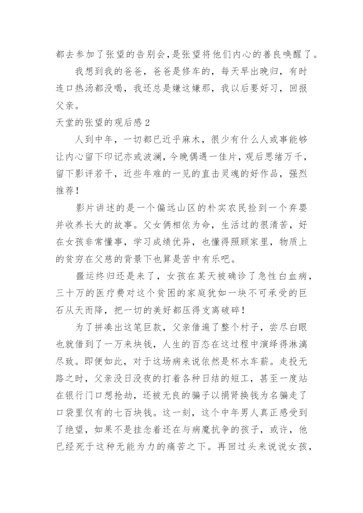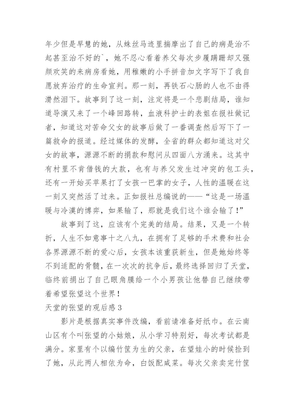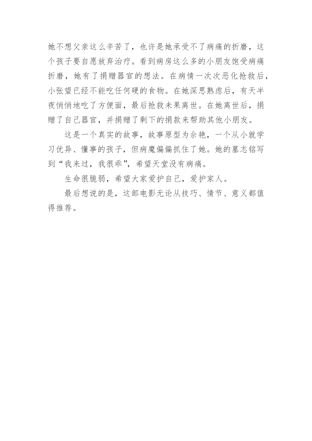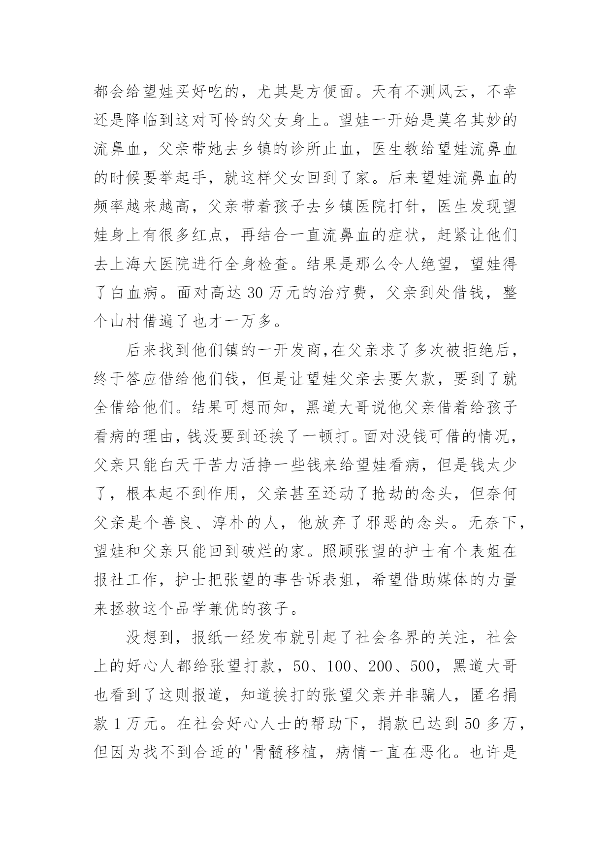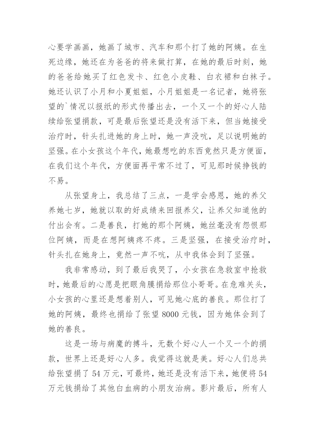 天堂的张望的观后感天堂的张望的观后感3篇看完一部经典作品以后,从中我们可以吸收新的思想,何不写一篇观后感记录下呢?那么你真的会写观后感吗?下面是小编为大家整理的天堂的张望的观后感,欢迎阅读与收藏。天堂的张望的观后感1今天下午我观看了一部影片,叫做《天堂的张望》,影片是由真实事件改编,刚开始一看题目时,我还以为是天堂的人往下张望呢!这部影片主要讲了一个叫张望的女孩,小学一年级放假时,跟着爸爸卖苹果,后来得了白血病的故事。影片中看到小女孩做饭时,我惊呆了,一个七岁的小孩,竟然自己会做饭,而且还自己从山里走到学校,让我难以置信。影片中小女孩卖苹果,不小心打了阿姨,阿姨竟然打了张望一下,我不赞成阿姨的做法,更何况是一个七岁的小女孩。而这个小女孩被打后还在想着那位阿姨,脸是不是很疼,可见这个小女孩的善良。后来,这个小女孩不幸得了白血病,她的爸爸挨家挨户的去借钱,向一个工头要钱时,还被他们打了一顿。张望在住院的同时认识了一位叫题题的小男孩,他的爸爸是画家,他说只要用心画,画就可以卖钱。张望便下定决心要学画画,她画了城市、汽车和那个打了她的阿姨。在生死边缘,她还在为爸爸的将来做打算,在她的最后时刻,她的爸爸给她买了红色发卡、红色小皮鞋、白衣裙和白袜子。她还认识了小月和小夏姐姐,小月姐姐是一名记者,她将张望的`情况以报纸的形式传播出去,一个又一个的好心人陆续给张望捐款,可是最后张望还是没有活下来,但当她接受治疗时,针头扎进她的身上时,她一声没吭,足以说明她的坚强。在小女孩这个年代,她最想吃的东西竟然只是方便面,在我们这个年代,方便面再平常不过了,可见那时候挣钱的不易。从张望身上,我总结了三点,一是学会感恩,她的养父养她七岁,她就以取的好成绩来回报养父,让养父知道他的付出会有。二是善良,打她的那个阿姨,她丝毫没有怨恨那位阿姨,而是在想阿姨疼不疼。三是坚强,在接受治疗时,针头扎在她身上,竟然一声不吭,从中我体会到了坚强。我非常感动,到了最后我哭了,小女孩在急救室中抢救时,她最后的心愿是把眼角膜捐给那位小哥哥。在危难关头,小女孩的心里还是想着别人,可见她心底的善良。那位打了她的阿姨,最终也捐给了张望8000元钱,因为她体会到了她的善良。这是一场与病魔的搏斗,无数个好心人一个又一个的捐款,世界上还是好心人多。我觉得这就是美。好心人们总共给张望捐了54万元,可最终,她还是没有活下来,她便将54万元钱捐给了其他白血病的小朋友治病。影片最后,所有人都去参加了张望的告别会,是张望将他们内心的善良唤醒了。我想到我的爸爸,爸爸是修车的,每天早出晚归,有时连口热汤都没喝,我还总是嫌这嫌那,我以后要好习,回报父亲。天堂的张望的观后感2人到中年,一切都已近乎麻木,很少有什么人或事能够让内心留下印记亦或波澜,今晚偶遇一佳片,观后思绪万千,留下影评若干,近些年难的一见的直击灵魂的好作品,强烈推荐!影片讲述的是一个偏远山区的朴实农民捡到一个弃婴并收养长大的故事。父女俩相依为命,生活过的很清苦,好在女孩非常懂事,学习成绩优异,也懂得照顾家里,物质上的贫穷在父慈的背景下也算是苦中有乐吧。噩运终归还是来了,女孩在某天被确诊了急性白血病,三十万的医疗费对这个贫困的家庭犹如一块不可承受的巨石从天而降,把一切的美好都压得支离破碎!为了拼凑出这笔巨款,父亲借遍了整个村子,尝尽白眼也就借到了一万来块钱,人生的百态在这过程中演绎得淋漓尽致。即便如此,对于这场病来说依然是杯水车薪。走投无路之时,父亲没日没夜的打着各种日结的短工,甚至一度站在银行门口想抢劫,还被无良的骗子以捐肾换钱为名骗走了口袋里仅有的七百块钱。这一刻,这个中年男人真正感受到了绝望,如果不是挂念着还在与病魔抗争的孩子,或许,他已经死于这种无能为力的痛苦之下。再回过头来说说女孩,年少但是早慧的她,从蛛丝马迹里揣摩出了自己的病是治不起甚至治不好的`,她不忍心看着养父每次步履蹒跚却又强颜欢笑的来病房看她,用稚嫩的小手拼音加文字写下了我自愿放弃治疗的生命宣判。那一刻,再铁石心肠的人也不由得潸然泪下。故事到了这一刻,注定将是一个悲剧结局,谁知道导演又来了一个峰回路转,血液科护士的表姐在报社做记者,知道这对苦命父女的故事后做了一番调查然后写下了一篇救命的报道。经过媒体的发酵,全省的群众都知道这对父女的故事,源源不断的捐款和慰问从四面八方涌来。这其中有村里不肯借钱的大款,也有与养父发生过冲突的包工头,还有一开始买苹果打了女孩一巴掌的女子,人性的温暖在这一刻又突然活了过来。正如报社总编说的——“这是一场温暖与冷漠的博弈,如果输了,那就是我们这个谁会输了!”故事到了这,应该有个完美的结局。结果,又是一个转折,人生不如意事十之八九,在拥有了足够的手术费和社会各界源源不断的爱心后,女孩本该重获新生,但是她始终等不到适配的骨髓,在一次次的抗争后,最
