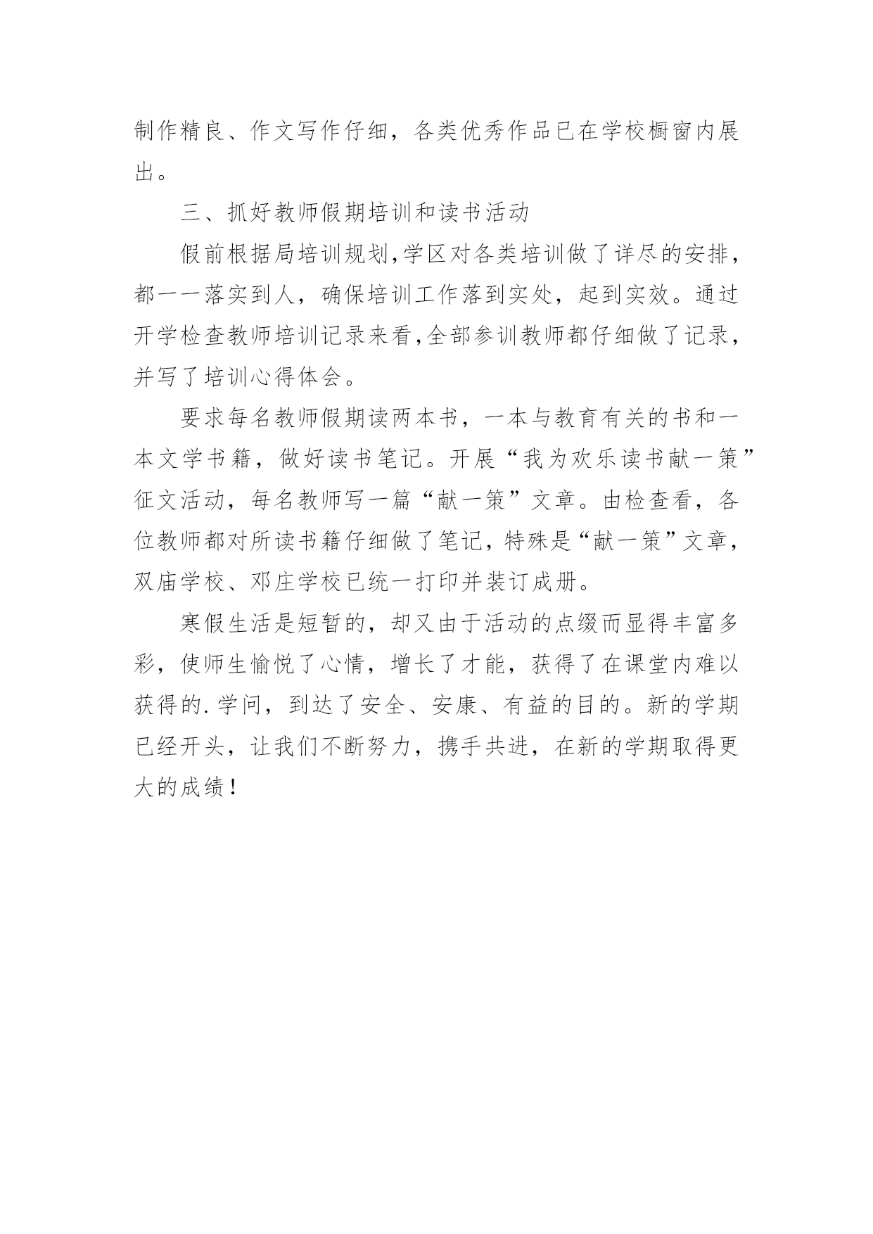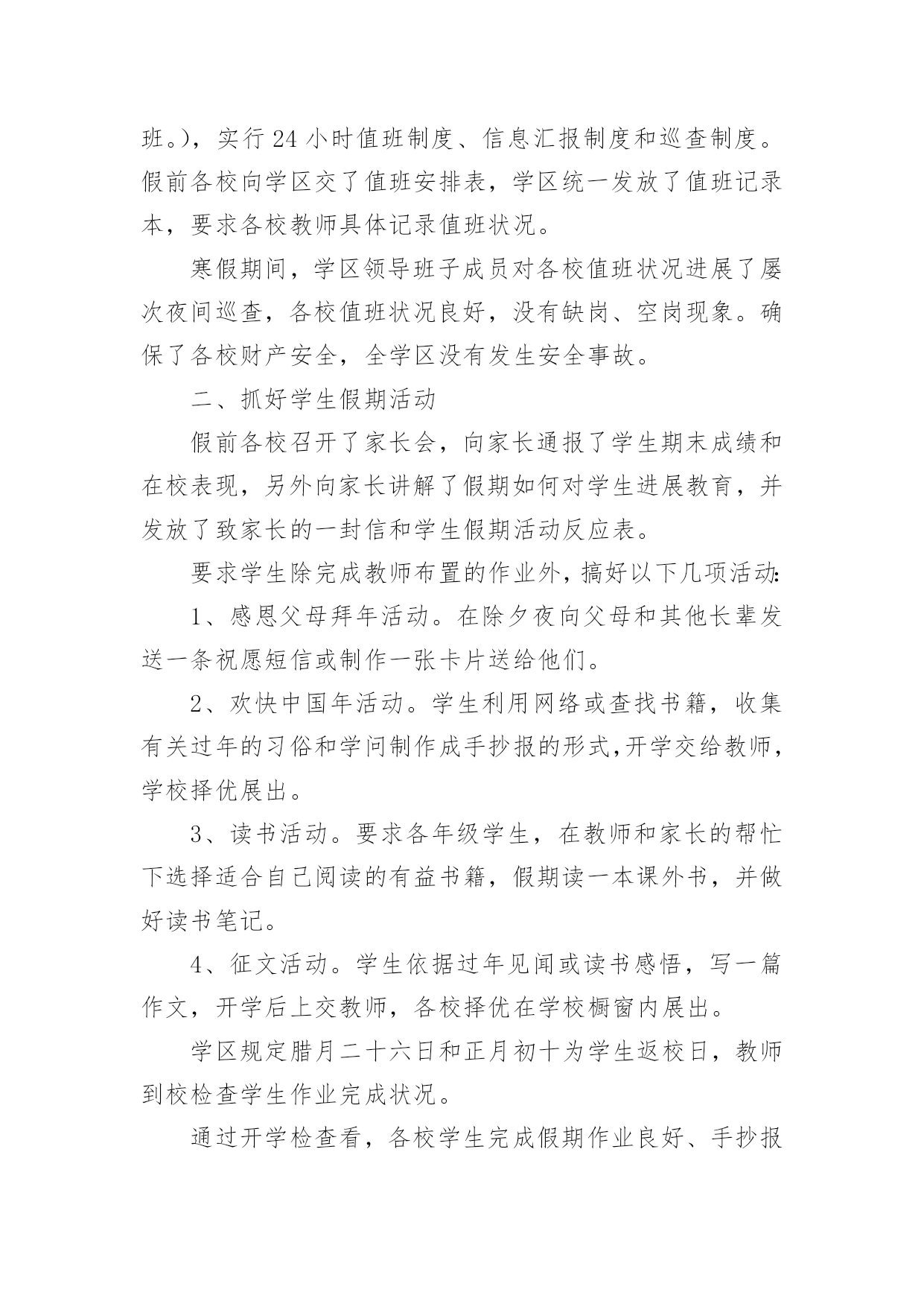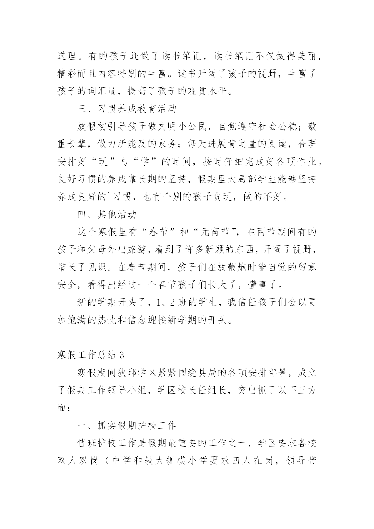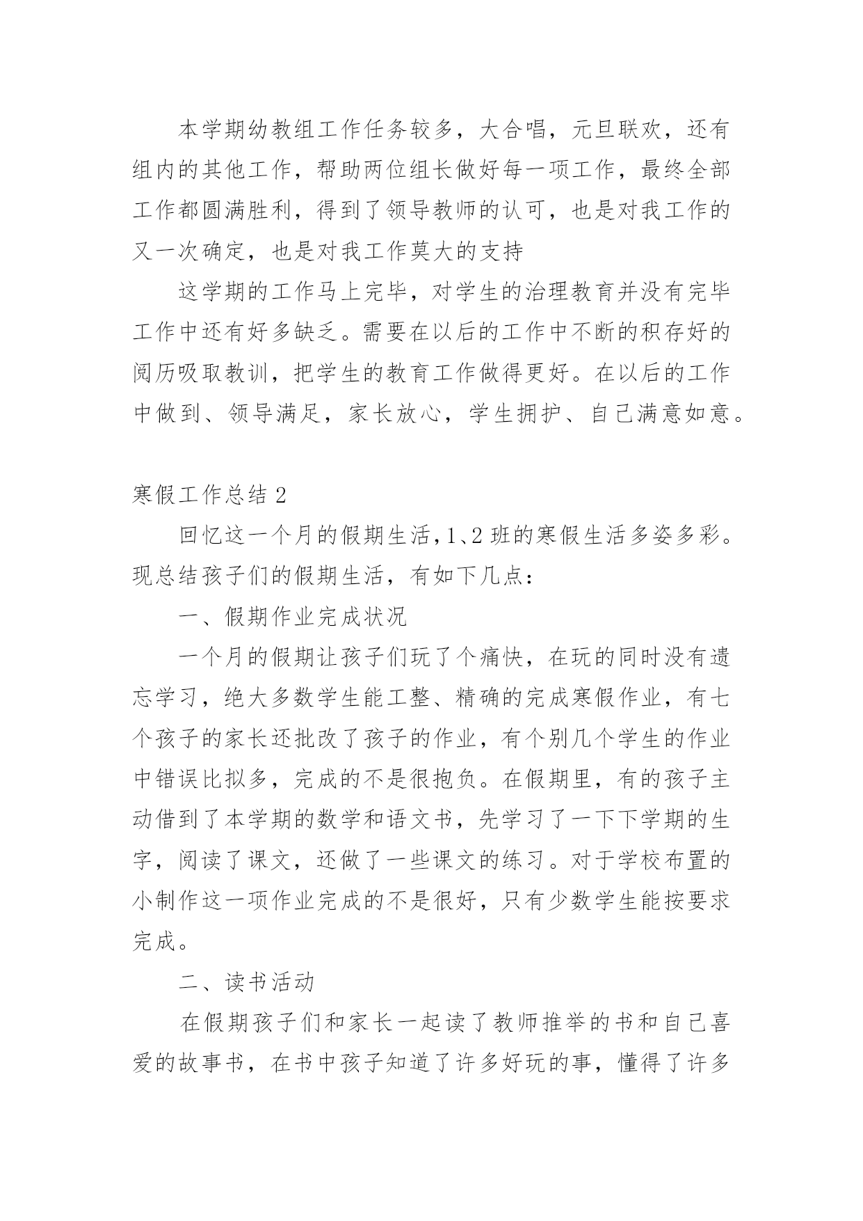 寒假工作总结总结就是把一个时段的学习、工作或其完成情况进行一次全面系统的总结,它能够使头脑更加清醒,目标更加明确,让我们一起认真地写一份总结吧。那么总结有什么格式呢?以下是小编为大家整理的寒假工作总结,欢迎大家分享。寒假工作总结1本学期马上完毕,但是我们教师的工作还在进展,在本学期的工作中,我连续担当了13物流班的班主任,作为马上走向实习岗位班的班主任,坚持进展学生个人力量为主,让学生都能够充分的做好就业前预备工作。现在特将我这学期的主要工作汇总如下:1、用良好德育塑造学生心灵我们13物流班本学期37位同学,本学期遵循学校的孝道教育讲座,针对我班全体同学的共性特点进展孝道教育专题班会,屡次进展了提升的个人能素养,使他们能够更好的呈现自己的才能,并且涌现出像陈XX、李XX、陆XX等突出的孝道小明星。2、做好就业前岗位培训以及岗前工作教育为了能够让学生更好融入到工作岗位当中去,本学期我班制定了物流专业岗前系列培训,包括,物流理论根底、计算机、形体、礼仪、行销力量等,一天一目标、一天一总结、一周一回忆、一月一考核的方式进展。使学生都能够做好工作岗位需要,提升自己的工作力量,加强专业实践技能的训练,符合物流行业的各种岗位需求,为步入岗位打好根底。3、班级文化建立、班级活动在本学期我们13物流班始终本着团结全都、永争第一、争创文明班集体的目标前进,在学校的各项活动中优异的成绩,本学期我班屡次获得卫生优胜班的称号,在太极展演中我合我班的同学共同参赛,并获得第一名的好成绩,得到学校同仁的认可,在大合唱竞赛中我班的圣洁的殿堂合1234歌获得第三名的好成绩,并且魏文路同学的指挥也受到了专业教师的夸奖,在诗朗读竞赛中我班孔宏颖同学不负众望再获佳绩,在华博公司的员工选拔中我们班的11名学生被选中,并且在电话客服的工作中,工作突出,表现突出,成绩显著。4、男生二层宿舍治理工作本学期我连续担当男生二层宿舍治理工作,连续和杨XX教师相互协作完成男生二层宿管的'工作,男生二层今年全部为14届学生,由新生转变老生,学生们已经了解了宿舍治理的状况,为避开有的学生钻空子,我和杨斌教师进展了白天共同巡查,夜晚突击检查,针对个别学生进展个别治理,在我们二层的卫生纪律的治理中,班主任的工作也尤为重要,许多事情都要和班主任进展结合,也特别感谢各位班主任教师的协作,并且在本学期我们楼层的卫生并不是很抱负。针对这样的状况,我和杨XX教师也做出了深刻的检讨,找出问题,进展解决,争取会更好,5幼教组的其他工作本学期幼教组工作任务较多,大合唱,元旦联欢,还有组内的其他工作,帮助两位组长做好每一项工作,最终全部工作都圆满胜利,得到了领导教师的认可,也是对我工作的又一次确定,也是对我工作莫大的支持这学期的工作马上完毕,对学生的治理教育并没有完毕工作中还有好多缺乏。需要在以后的工作中不断的积存好的阅历吸取教训,把学生的教育工作做得更好。在以后的工作中做到、领导满足,家长放心,学生拥护、自己满意如意。寒假工作总结2回忆这一个月的假期生活,1、2班的寒假生活多姿多彩。现总结孩子们的假期生活,有如下几点:一、假期作业完成状况一个月的假期让孩子们玩了个痛快,在玩的同时没有遗忘学习,绝大多数学生能工整、精确的完成寒假作业,有七个孩子的家长还批改了孩子的作业,有个别几个学生的作业中错误比拟多,完成的不是很抱负。在假期里,有的孩子主动借到了本学期的数学和语文书,先学习了一下下学期的生字,阅读了课文,还做了一些课文的练习。对于学校布置的小制作这一项作业完成的不是很好,只有少数学生能按要求完成。二、读书活动在假期孩子们和家长一起读了教师推举的书和自己喜爱的故事书,在书中孩子知道了许多好玩的事,懂得了许多道理。有的孩子还做了读书笔记,读书笔记不仅做得美丽,精彩而且内容特别的丰富。读书开阔了孩子的视野,丰富了孩子的词汇量,提高了孩子的观赏水平。三、习惯养成教育活动放假初引导孩子做文明小公民,自觉遵守社会公德;敬重长辈,做力所能及的家务;每天进展肯定量的阅读,合理安排好“玩”与“学”的时间,按时仔细完成好各项作业。良好习惯的养成靠长期的坚持,假期里大局部学生能够坚持养成良好的`习惯,也有个别的孩子贪玩,做的不好。四、其他活动这个寒假里有“春节”和“元宵节”,在两节期间有的孩子和父母外出旅游,看到了许多新颖的东西,开阔了视野,增长了见识。在春节期间,孩子们在放鞭炮时能自觉的留意安全,看得出经过一个春节孩子们长大了,懂事了。新的学期开头了,1、2班的学生,我信任孩子们会以更加饱满的热忱和信念迎接新学期的开头。寒假工作总结3寒假期间狄邱学区紧紧围绕县局的各项安排部署,成立了假期工作领导小组,学区校长任组长,突出抓了以下三方面:一、抓实假期护校工作值班护校工作是假期最重要的工作之一,学区要求各校双人双岗(中学和较