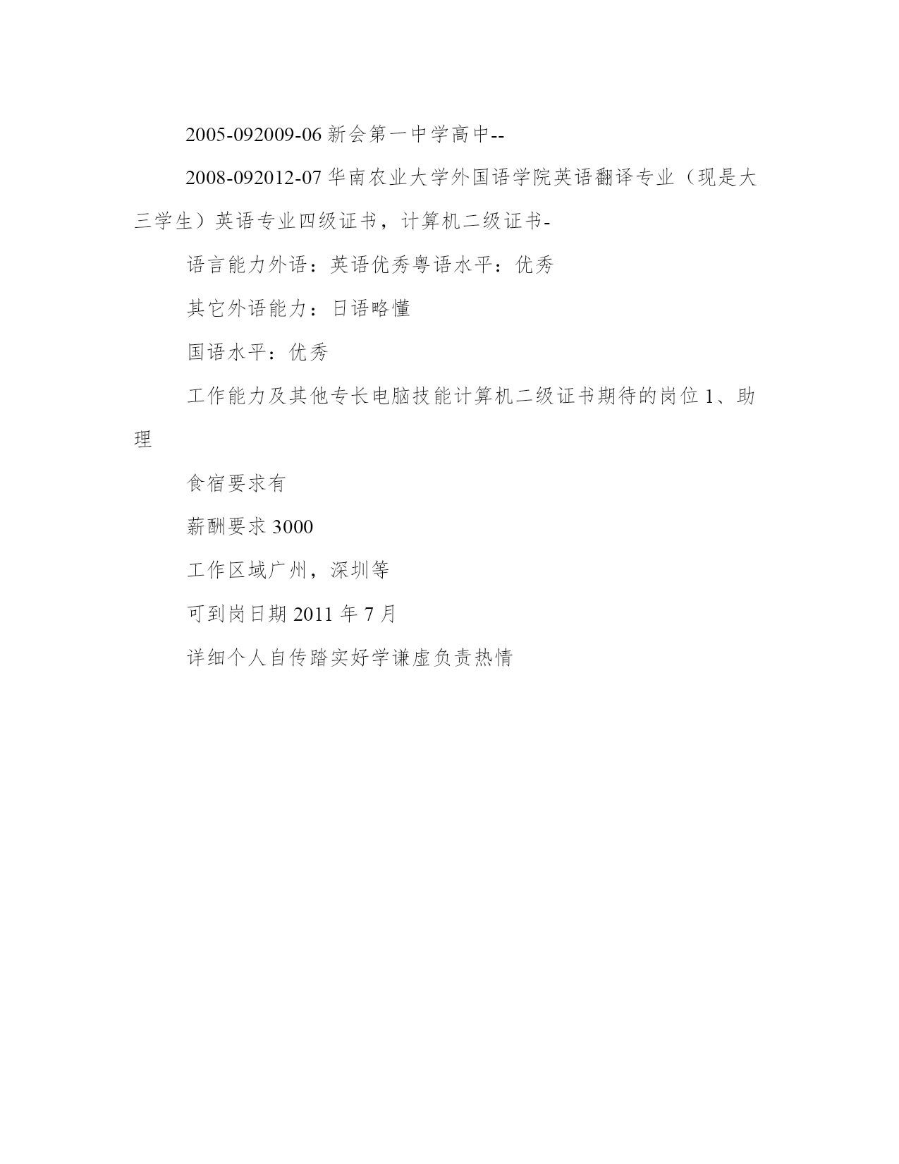 艺术设计中文简历户口所在:天河区国籍:中国婚姻状况:未婚民族:汉族培训认证:未参加身高:158cm诚信徽章:未申请体重:人才测评:未测评我的特长:求职意向人才类型:普通求职应聘职位:贸易:助理,艺术/设计:,教师:工作年限:0职称:无职称求职类型:兼职可到职日期:三个月以后月薪要求:2000--3500希望工作地区:广州,深圳,公司性质:所属行业:担任职位:导购员工作描述:担任职位:现代五项竞赛部志愿者组长工作描述:教育背景毕业院校:华南农业大学最高学历:本科获得学位:毕业日期:2012-07专业一:外国语学院英语翻译专业(现是大三学生)专业二:起始年月终止年月学校(机构)所学专业获得证书证书编号2005-092009-06新会第一中学高中--2008-092012-07华南农业大学外国语学院英语翻译专业(现是大三学生)英语专业四级证书,计算机二级证书-语言能力外语:英语优秀粤语水平:优秀其它外语能力:日语略懂国语水平:优秀工作能力及其他专长电脑技能计算机二级证书期待的岗位1、助理食宿要求有薪酬要求3000工作区域广州,深圳等可到岗日期2011年7月详细个人自传踏实好学谦虚负责热情