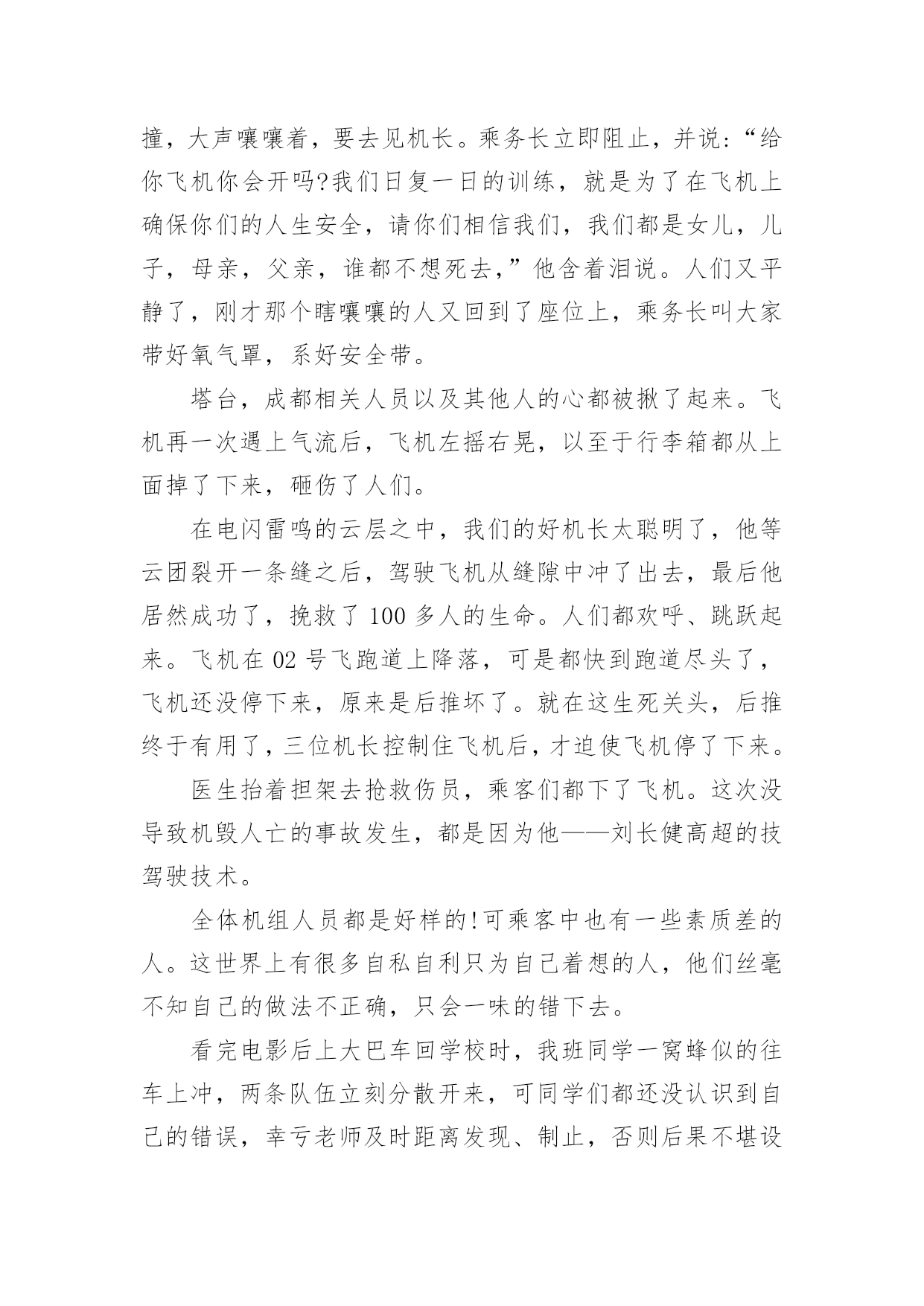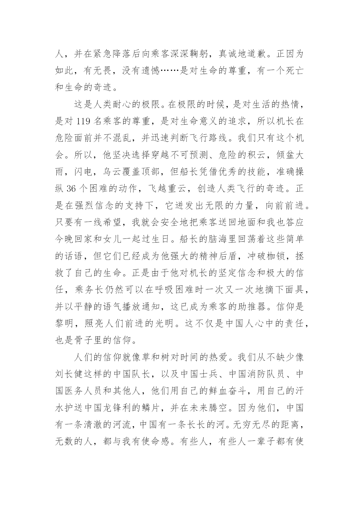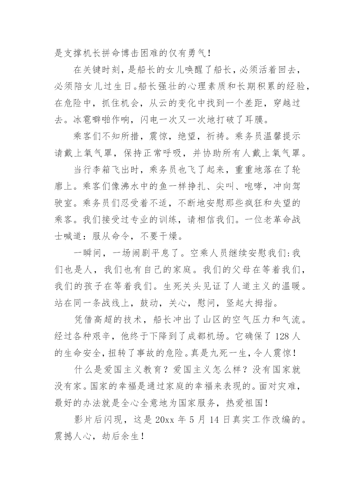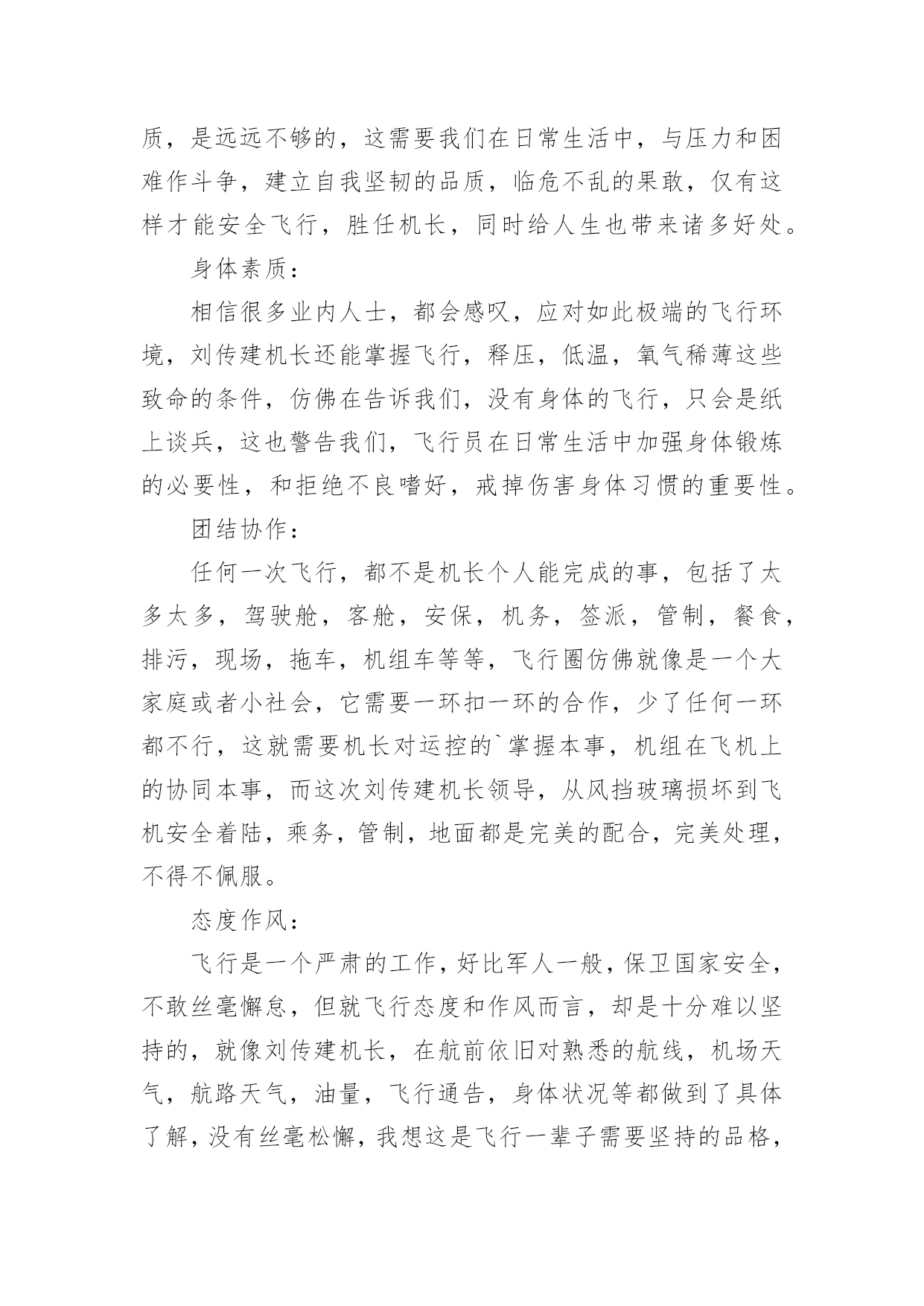 《中国机长》的观后感《中国机长》的观后感认真品味一部作品后,一定有很多值得分享的心得吧,这时候最关键的观后感不能忘了。快来参考观后感是怎么写的吧,下面是小编为大家整理的《中国机长》的观后感,欢迎大家分享。《中国机长》的观后感1飞过数万英里的云和月亮,穿越群山和海洋。尽职尽责地尊重生命,信仰和信任保护前进。这是真正的中国机长。《中国机长》改编自真实事件,机组人员执行从四川到拉萨的飞行任务,突然遇到危险,意外。凭借优秀的飞行能力,机组人员的高执行力,最终从危险中拯救了自己。四川8633成功迫降。在数万英里的高空,飞机右挡风玻璃突然破裂,气温突然下降,气压不平衡,仪器损坏,副驾驶半身在飞机外,情况危急,每个人的生命,我看到刘机长失去压力,风扫,颤抖的手控制杆保持飞机平衡,坚定的眼睛,发誓和危险的战斗。这是一颗高度负责的心,可以无畏和遗憾。面对乘客不合理的要求,空乘人员仍然耐心地微笑;面对乘客的恐慌和冲动,即使是他们自己的安全。由于对这个职业的高度尊重,我们可以在关键时刻响亮而稳定,有勇气放弃自己来拯救他人,并在紧急降落后向乘客深深鞠躬,真诚地道歉。正因为如此,有无畏,没有遗憾……是对生命的尊重,有一个死亡和生命的奇迹。这是人类耐心的极限。在极限的时候,是对生活的热情,是对119名乘客的尊重,是对生命意义的追求,所以机长在危险面前并不混乱,并迅速判断飞行路线。我们只有这个机会。所以,他坚决选择穿越不可预测、危险的积云,倾盆大雨,闪电,乌云覆盖顶部,但船长凭借优秀的技能,准确操纵36个困难的动作,飞越重云,创造人类飞行的奇迹。正是在强烈信念的支持下,它迸发出无限的力量,向前前进。只要有一线希望,我就会安全地把乘客送回地面和我也答应今晚回家和女儿一起过生日。船长的脑海里回荡着这些简单的话语,但它们已经成为他强大的精神后盾,冲破枷锁,拯救了自己的生命。正是由于他对机长的坚定信念和极大的信任,乘务长仍然可以在呼吸困难时一次又一次地摘下面具,并以平静的语气播放通知,这已成为乘客的助推器。信仰是黎明,照亮人们前进的光明。这不仅是中国人心中的责任,也是骨子里的信仰。人们的信仰就像草和树对时间的热爱。我们从不缺少像刘长健这样的中国队长,以及中国士兵、中国消防队员、中国医务人员和其他人,他们用自己的鲜血奋斗,用自己的汗水护送中国龙锋利的鳞片,并在未来腾空。因为他们,中国有一条清澈的河流,中国有一条长长的河。无穷无尽的距离,无数的人,都与我有使命感。有些人,有些人一辈子都有使命感。有了共同令人难忘的责任感,道路最终会被阻挡和延伸,或者风景是无限的。对于我们这些年轻人来说,我们应该遵循前辈的信仰,发展我们的爱,追求时代。《中国机长》的观后感2“只要在平凡的岗位上做出不平凡的事,就是英雄。”一次偶然的机会欣赏了《中国机长》这部电影,刷新了我对英雄的概念……《中国机长》是根据2018年5月14日四川航空3U8633航班机组成功处置特情真实事件改编:机组执行航班任务时,在万米高空突遇驾驶舱挡风玻璃爆裂脱落、座舱释压的极端罕见险情。生死关头,他们临危不乱、果断应对、正确处置,确保了机上全部人员的生命安全,创造了世界民航史上的奇迹。什么是英雄?我相信很多人的第一反应都会想到电影中那些飞天遁地、无所不能的超级英雄。他们亦或因为奇遇有幸获得了超能力,或是拥有超越常人的大脑以及富可敌国的“钞”能力。但请不要忘记,现实生活中“英雄”,他们和你我一样,都是普通人,只不过是拼尽全力以肉体凡胎在拯救生命、创造奇迹。3U8633航班机长刘传健说:“在万里高空的险情中如此从容,别问怎么做到的,每一个传奇背后,都隐藏着坚守和执着”。天下难事必作于易,天下大事必作于细。创造奇迹的不是一个人一瞬间,而是一群人一辈子用百分之百的努力,应对万分之一的隐患。当飞机出事后,虽然周遭只有一望无际的天空和连绵不断的山脉,但那一刻他们并非孤立无援,除了有勇敢果断的机长、尽职尽责的乘务员,管制员的快速应变能力也为飞机的安全降落提供了重要保障,他们在联系不到刘机长的情况下,仅凭雷达讯息,清空飞机前往备降机场航道上所有可能经过的航班,光是机场附近的区域就有8架飞机的航线临时发生了变动。在飞机着陆前,因为没办法确认它将在哪个跑道降落,机场塔台便通过沟通协调清空了所有跑道。整个过程中,管制员对3U8633的呼叫从未间断,即使可能根本没人能收到,但也绝不放过万分之一的希望。飞机备降后,地面保障部门、消防员、医疗员也全员出动,等待着3U8633的归来。这就是团队的力量,正是因为每个人都坚守岗位,尽自己最大的努力做好本职工作,最终才使得飞机成功备降成都双流机场,保证了飞机上119位乘客的生命安全。因此,我们不要觉得平凡的事太小。每一个不平凡的事都是由无数个平凡的小事凑成的,“英雄”本就是平凡的人在做不平凡的事。当我