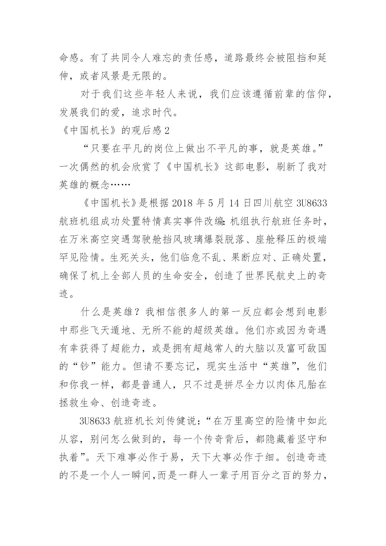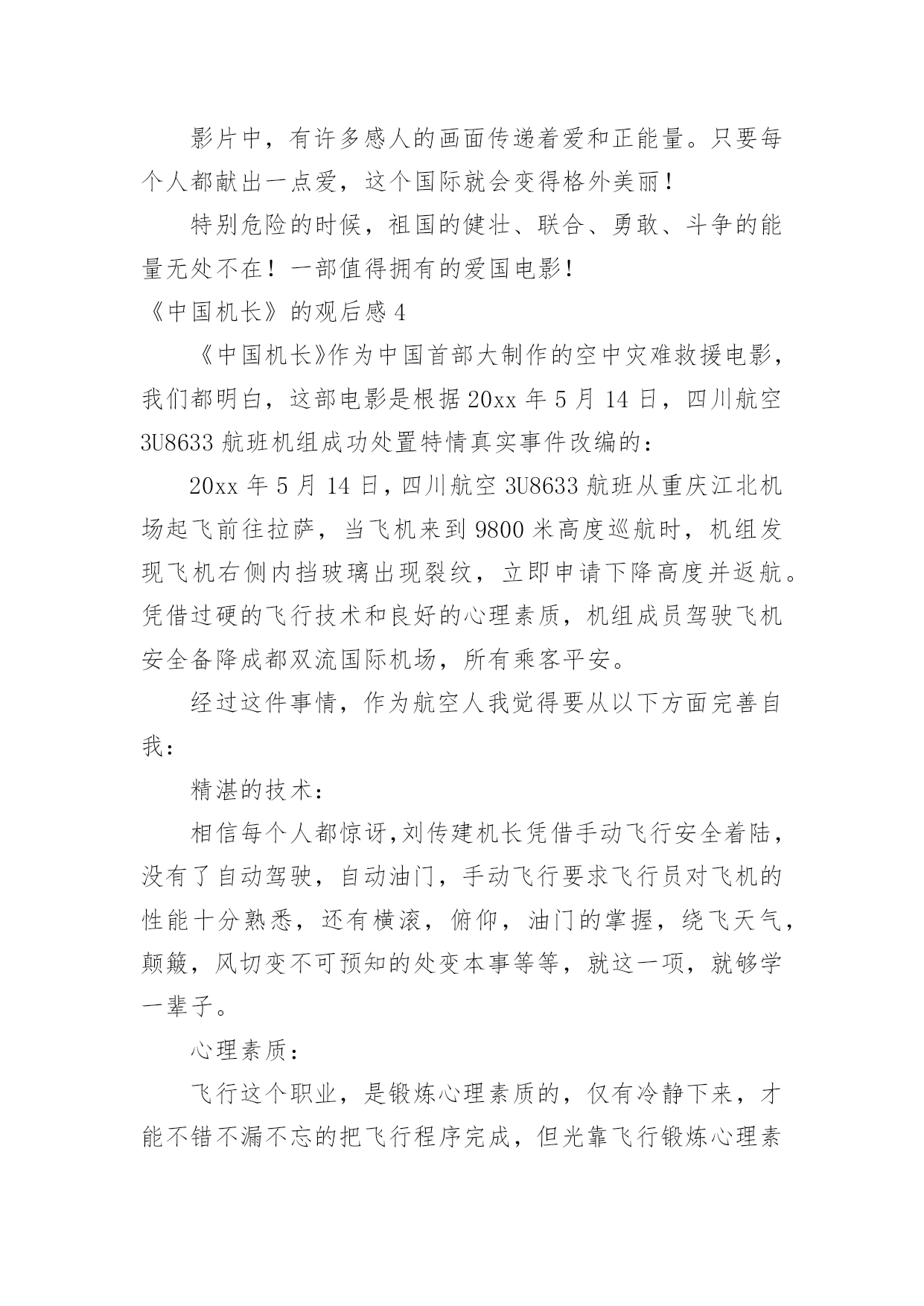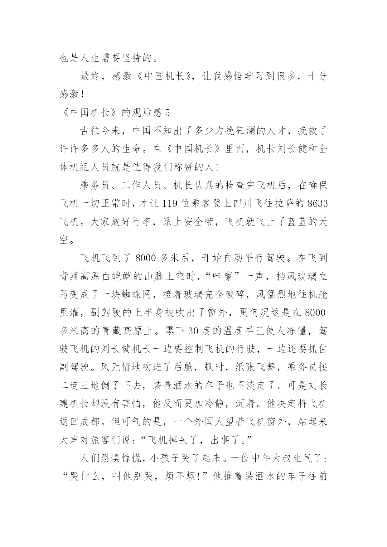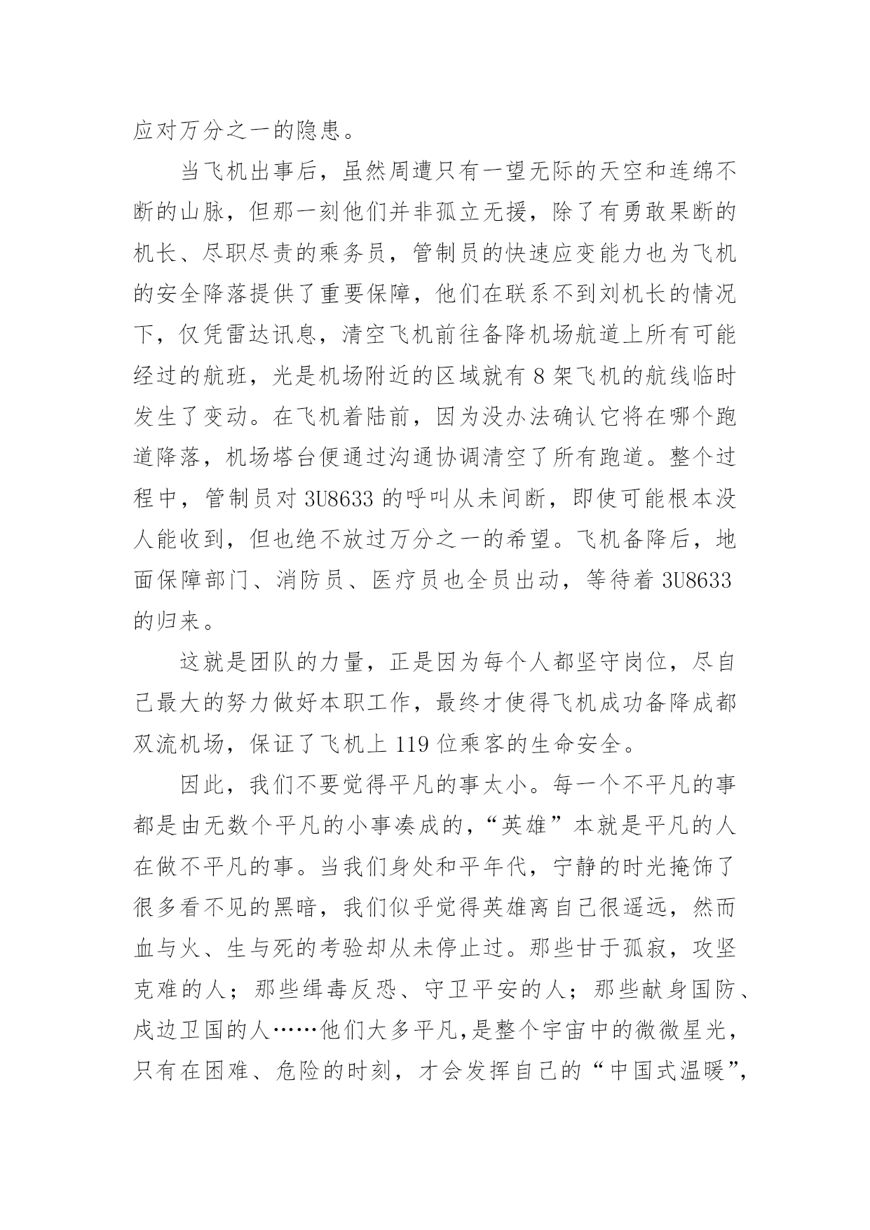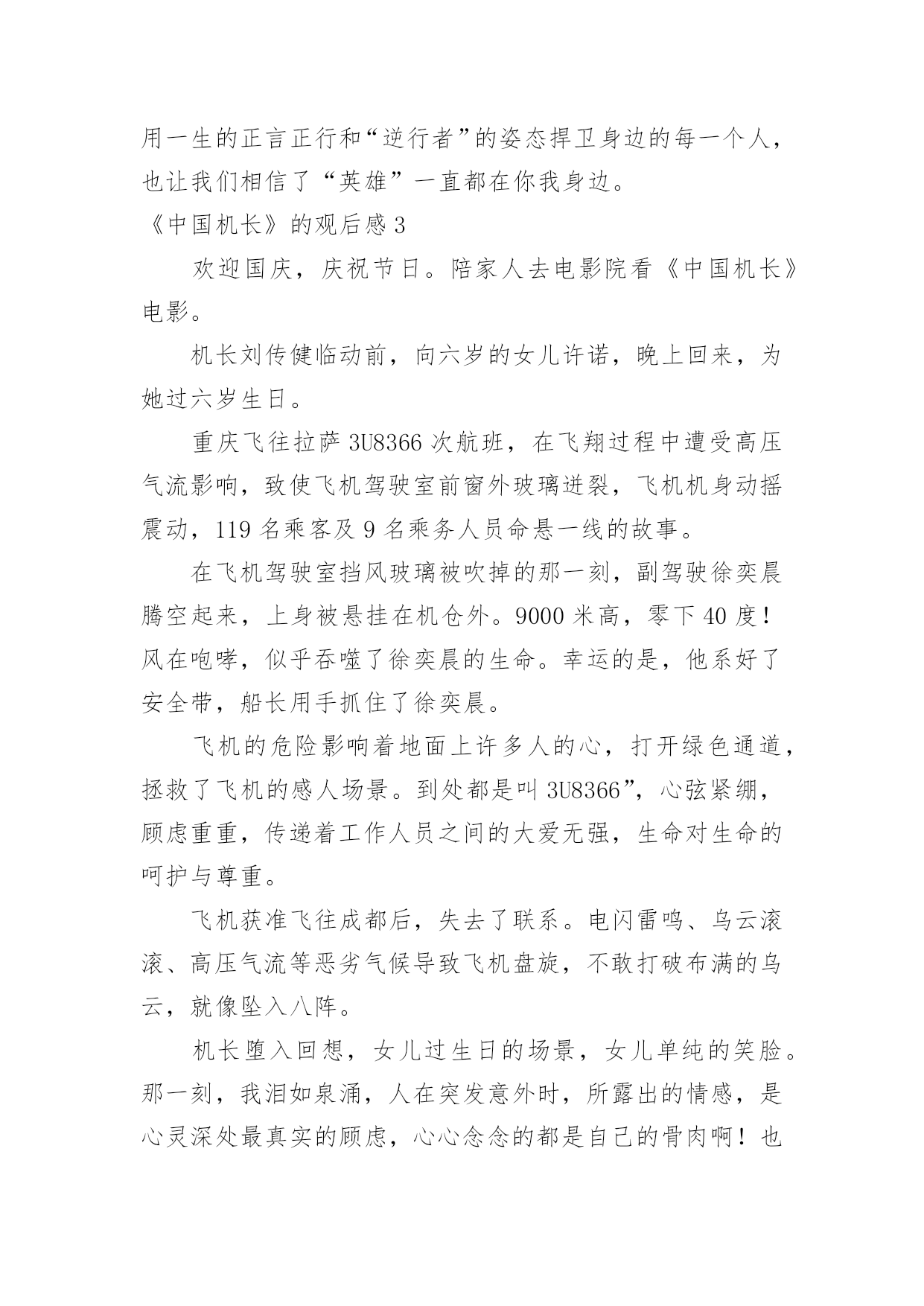 《中国机长》的观后感《中国机长》的观后感认真品味一部作品后,一定有很多值得分享的心得吧,这时候最关键的观后感不能忘了。快来参考观后感是怎么写的吧,下面是小编为大家整理的《中国机长》的观后感,欢迎大家分享。《中国机长》的观后感1飞过数万英里的云和月亮,穿越群山和海洋。尽职尽责地尊重生命,信仰和信任保护前进。这是真正的中国机长。《中国机长》改编自真实事件,机组人员执行从四川到拉萨的飞行任务,突然遇到危险,意外。凭借优秀的飞行能力,机组人员的高执行力,最终从危险中拯救了自己。四川8633成功迫降。在数万英里的高空,飞机右挡风玻璃突然破裂,气温突然下降,气压不平衡,仪器损坏,副驾驶半身在飞机外,情况危急,每个人的生命,我看到刘机长失去压力,风扫,颤抖的手控制杆保持飞机平衡,坚定的眼睛,发誓和危险的战斗。这是一颗高度负责的心,可以无畏和遗憾。面对乘客不合理的要求,空乘人员仍然耐心地微笑;面对乘客的恐慌和冲动,即使是他们自己的安全。由于对这个职业的高度尊重,我们可以在关键时刻响亮而稳定,有勇气放弃自己来拯救他人,并在紧急降落后向乘客深深鞠躬,真诚地道歉。正因为如此,有无畏,没有遗憾……是对生命的尊重,有一个死亡和生命的奇迹。这是人类耐心的极限。在极限的时候,是对生活的热情,是对119名乘客的尊重,是对生命意义的追求,所以机长在危险面前并不混乱,并迅速判断飞行路线。我们只有这个机会。所以,他坚决选择穿越不可预测、危险的积云,倾盆大雨,闪电,乌云覆盖顶部,但船长凭借优秀的技能,准确操纵36个困难的动作,飞越重云,创造人类飞行的奇迹。正是在强烈信念的支持下,它迸发出无限的力量,向前前进。只要有一线希望,我就会安全地把乘客送回地面和我也答应今晚回家和女儿一起过生日。船长的脑海里回荡着这些简单的话语,但它们已经成为他强大的精神后盾,冲破枷锁,拯救了自己的生命。正是由于他对机长的坚定信念和极大的信任,乘务长仍然可以在呼吸困难时一次又一次地摘下面具,并以平静的语气播放通知,这已成为乘客的助推器。信仰是黎明,照亮人们前进的光明。这不仅是中国人心中的责任,也是骨子里的信仰。人们的信仰就像草和树对时间的热爱。我们从不缺少像刘长健这样的中国队长,以及中国士兵、中国消防队员、中国医务人员和其他人,他们用自己的鲜血奋斗,用自己的汗水护送中国龙锋利的鳞片,并在未来腾空。因为他们,中国有一条清澈的河流,中国有一条长长的河。无穷无尽的距离,无数的人,都与我有使命感。有些人,有些人一辈子都有使命感。有了共同令人难忘的责任感,道路最终会被阻挡和延伸,或者风景是无限的。对于我们这些年轻人来说,我们应该遵循前辈的信仰,发展我们的爱,追求时代。《中国机长》的观后感2“只要在平凡的岗位上做出不平凡的事,就是英雄。”一次偶然的机会欣赏了《中国机长》这部电影,刷新了我对英雄的概念……《中国机长》是根据2018年5月14日四川航空3U8633航班机组成功处置特情真实事件改编:机组执行航班任务时,在万米高空突遇驾驶舱挡风玻璃爆裂脱落、座舱释压的极端罕见险情。生死关头,他们临危不乱、果断应对、正确处置,确保了机上全部人员的生命安全,创造了世界民航史上的奇迹。什么是英雄?我相信很多人的第一反应都会想到电影中那些飞天遁地、无所不能的超级英雄。他们亦或因为奇遇有幸获得了超能力,或是拥有超越常人的大脑以及富可敌国的“钞”能力。但请不要忘记,现实生活中“英雄”,他们和你我一样,都是普通人,只不过是拼尽全力以肉体凡胎在拯救生命、创造奇迹。3U8633航班机长刘传健说:“在万里高空的险情中如此从容,别问怎么做到的,每一个传奇背后,都隐藏着坚守和执着”。天下难事必作于易,天下大事必作于细。创造奇迹的不是一个人一瞬间,而是一群人一辈子用百分之百的努力,应对万分之一的隐患。当飞机出事后,虽然周遭只有一望无际的天空和连绵不断的山脉,但那一刻他们并非孤立无援,除了有勇敢果断的机长、尽职尽责的乘务员,管制员的快速应变能力也为飞机的安全降落提供了重要保障,他们在联系不到刘机长的情况下,仅凭雷达讯息,清空飞机前往备降机场航道上所有可能经过的航班,光是机场附近的区域就有8架飞机的航线临时发生了变动。在飞机着陆前,因为没办法确认它将在哪个跑道降落,机场塔台便通过沟通协调清空了所有跑道。整个过程中,管制员对3U8633的呼叫从未间断,即使可能根本没人能收到,但也绝不放过万分之一的希望。飞机备降后,地面保障部门、消防员、医疗员也全员出动,等待着3U8633的归来。这就是团队的力量,正是因为每个人都坚守岗位,尽自己最大的努力做好本职工作,最终才使得飞机成功备降成都双流机场,保证了飞机上119位乘客的生命安全。因此,我们不要觉得平凡的事太小。每一个不平凡的事都是由无数个平凡的小事凑成的,“英雄”本就是平凡的人在做不平凡的事。当我