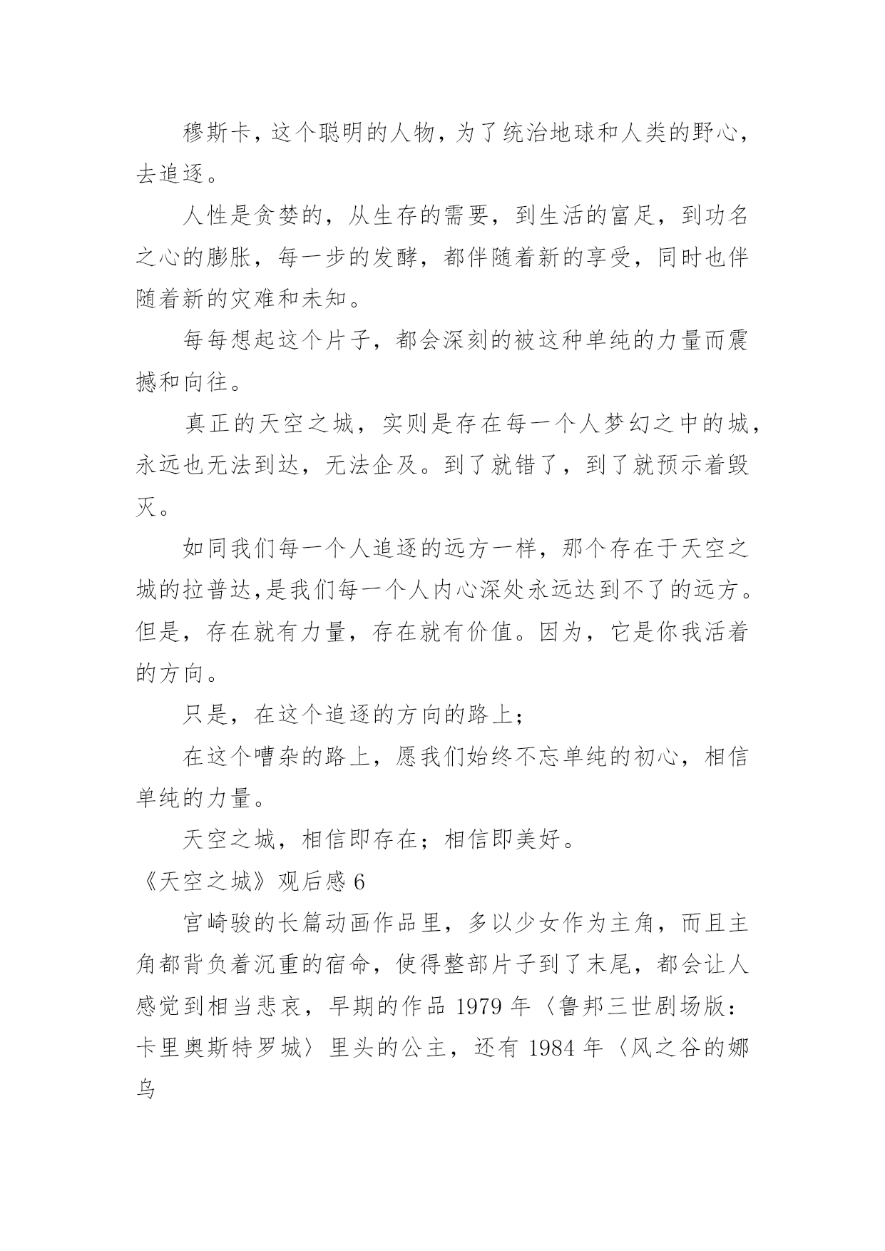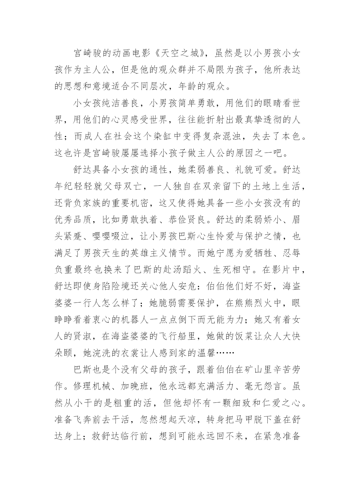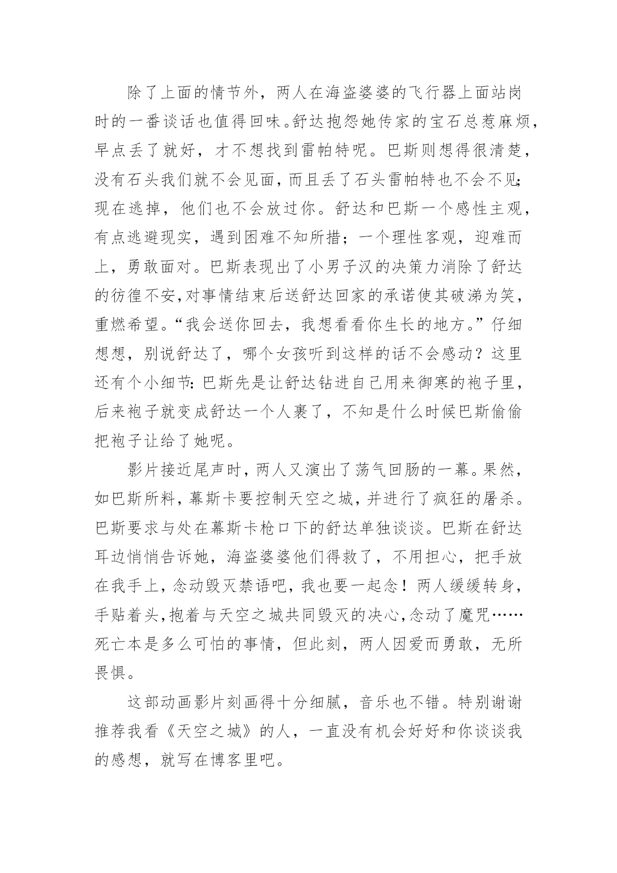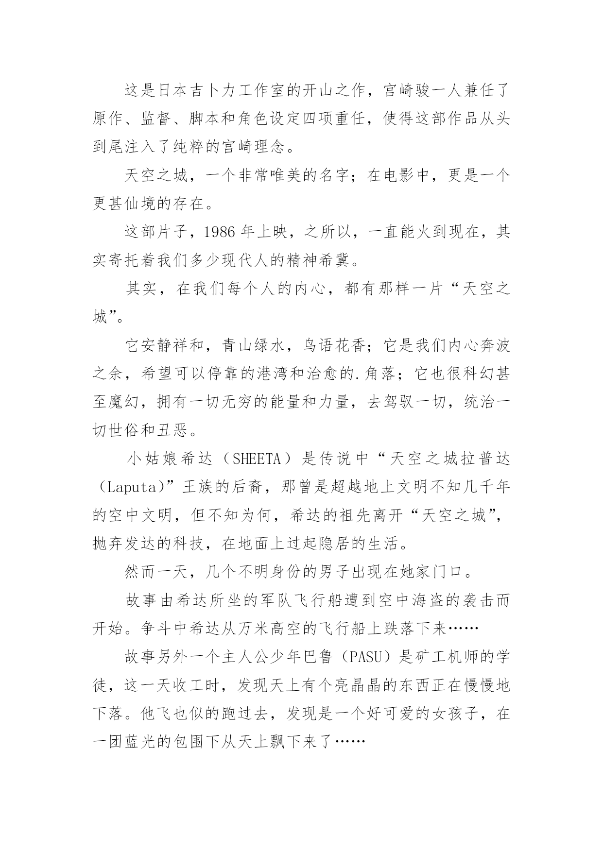《天空之城》观后感《天空之城》观后感7篇看完一部作品以后,一定有不少感悟吧,何不写一篇观后感记录下呢?那么你真的会写观后感吗?以下是小编整理的《天空之城》观后感,希望能够帮助到大家。《天空之城》观后感1今天我来说说宫崎骏的《天空之城》,这部动画片说的是天空中有个漂浮的城市犹如仙境,名叫拉普达。小女孩希达是天空之城的公主她有一块祖传的飞行石。这块石头有强大的力量,可以帮她指引回拉普达的方向。所以海盗和慕斯卡的军队都来抢夺飞行石。在逃亡的途中,希达认识了很多好朋友,他们之间发生了很多有趣的事情…这部电影想告诉我们两个道理。第一,告诉我们人不能太贪婪,一贪婪就会做出后悔莫及的事情。慕斯卡为了得到天空之城的所有权,做了很多坏事,反派角色最终以失败告终。第二,要保护大自然,失去了大自然,哪怕有再强的高科技,人类无法生存。天空之城最后被毁的只剩下一棵树。宫崎骏想告诉我们人与自然的矛盾是天生的。只要人类繁衍下去,破坏自然的行动就会一直重复下去。虽然很消极,也确实如此。但是我坚信我们人类都在觉悟中,更在改进中。《天空之城》观后感2宫崎骏的动画电影《天空之城》,虽然是以小男孩小女孩作为主人公,但是他的观众群并不局限为孩子,他所表达的思想和意境适合不同层次,年龄的观众。小女孩纯洁善良,小男孩简单勇敢,用他们的眼睛看世界,用他们的心灵感受世界,往往能折射出最真挚透彻的人性;而成人在社会这个染缸中变得复杂混浊,失去了本色。这也许是宫崎骏屡屡选择小孩子做主人公的原因之一吧。舒达具备小女孩的通性,她柔弱善良、礼貌可爱。舒达年纪轻轻就父母双亡,一人独自在双亲留下的土地上生活,还背负家族的重要机密,这又使得她具备一些小女孩没有的优秀品质,比如勇敢执着、恭俭贤良。舒达的柔弱娇小、眉头紧蹙、嘤嘤啜泣,让小男孩巴斯心生怜爱与保护之情,也满足了男孩天生的英雄主义情节。而她宁愿为爱牺牲、忍辱负重最终也换来了巴斯的赴汤蹈火、生死相守。在影片中,舒达即使身陷险境还关心他人安危:伯伯他们好不好,海盗婆婆一行人怎么样了;她脆弱需要保护,在熊熊烈火中,眼睁睁看着衷心的机器人一点点倒下而无能为力;她又有着女人的贤淑,在海盗婆婆的飞行船里,她做的饭菜让众人大快朵颐,她浣洗的衣裳让人感到家的温馨……巴斯也是个没有父母的孩子,跟着伯伯在矿山里辛苦劳作。修理机械、加晚班,他永远都充满活力、毫无怨言。虽然从小干的是粗重的活,但他却怀有一颗细致和仁爱之心。准备飞奔前去干活,忽然想起天凉,转身把马甲脱下盖在舒达身上;救舒达临行前,想到可能永远回不来,在紧急准备的40秒内还冲去将笼子里的鸽子放生,让它们好好保重。他坚强执着,从屋顶上摔下,笑着说他的头比拳头还硬;因为坚信爸爸不会撒谎,所以执着地想制造飞行器,一定要找到传说中的天空之城雷帕特。巴斯的男子汉气概则充分表现在每次遇险,他总挡在舒达前面,像个男人那样护着娇小的她。可以说,他身上浓缩了小男孩的优秀特性。舒达为救巴斯而不得不对幕斯卡妥协。她对巴斯说:“对不起,给你添了很多麻烦。多谢你,我不会忘记巴斯的。”说这番话时,她的心里一定在滴着血。为了救心爱的人,冒着不被他理解和可能永远不再相见的风险。哭着跑开,在窗口看着巴斯孤独伤心的背影渐行渐远,嘴里念着他的名字,无奈而绝望。单纯的巴斯,一脸迷茫、失落甚至愤慨:“不是约定好了吗?”他不相信眼前这个女孩会出尔反尔,让他忘记雷帕特的事情。想问╠╠却看着舒达欲言又止、哭着跑开,想追╠╠却被坏蛋幕斯卡拦住,最后只有心碎离开。这一幕,小男子汉想爱不能爱、想恨恨不了,心有余而力不足的心情被表现得淋漓尽致。“如果你是男人应该会明白!”如果说幕斯卡的话没有对于一个小男孩来说太深奥,那么海盗婆婆的一席话却是让巴斯如梦初醒、信心满怀。“舒达是为了救你啊。”“……为救心爱的男人而牺牲自己。”“你要结婚也要找这样的女孩。”巴斯顿悟了,请求海盗婆婆带他一同前往:“我会像个傻瓜一样地保护他,我不要雷帕特的宝!”在爱情面前,小女孩比较隐忍、克己为人,小男孩则无所畏惧、勇往直前。这是许多东方爱情故事的经典模式。除了上面的情节外,两人在海盗婆婆的飞行器上面站岗时的一番谈话也值得回味。舒达抱怨她传家的宝石总惹麻烦,早点丢了就好,才不想找到雷帕特呢。巴斯则想得很清楚,没有石头我们就不会见面,而且丢了石头雷帕特也不会不见;现在逃掉,他们也不会放过你。舒达和巴斯一个感性主观,有点逃避现实,遇到困难不知所措;一个理性客观,迎难而上,勇敢面对。巴斯表现出了小男子汉的决策力消除了舒达的彷徨不安,对事情结束后送舒达回家的承诺使其破涕为笑,重燃希望。“我会送你回去,我想看看你生长的地方。”仔细想想,别说舒达了,哪个女孩听到这样的话不会感动?这里还有个小细节:巴斯先是让舒达钻进自己用来御寒的袍子里,后来袍子就变成舒达一个人裹了,不知是什么时候巴斯偷