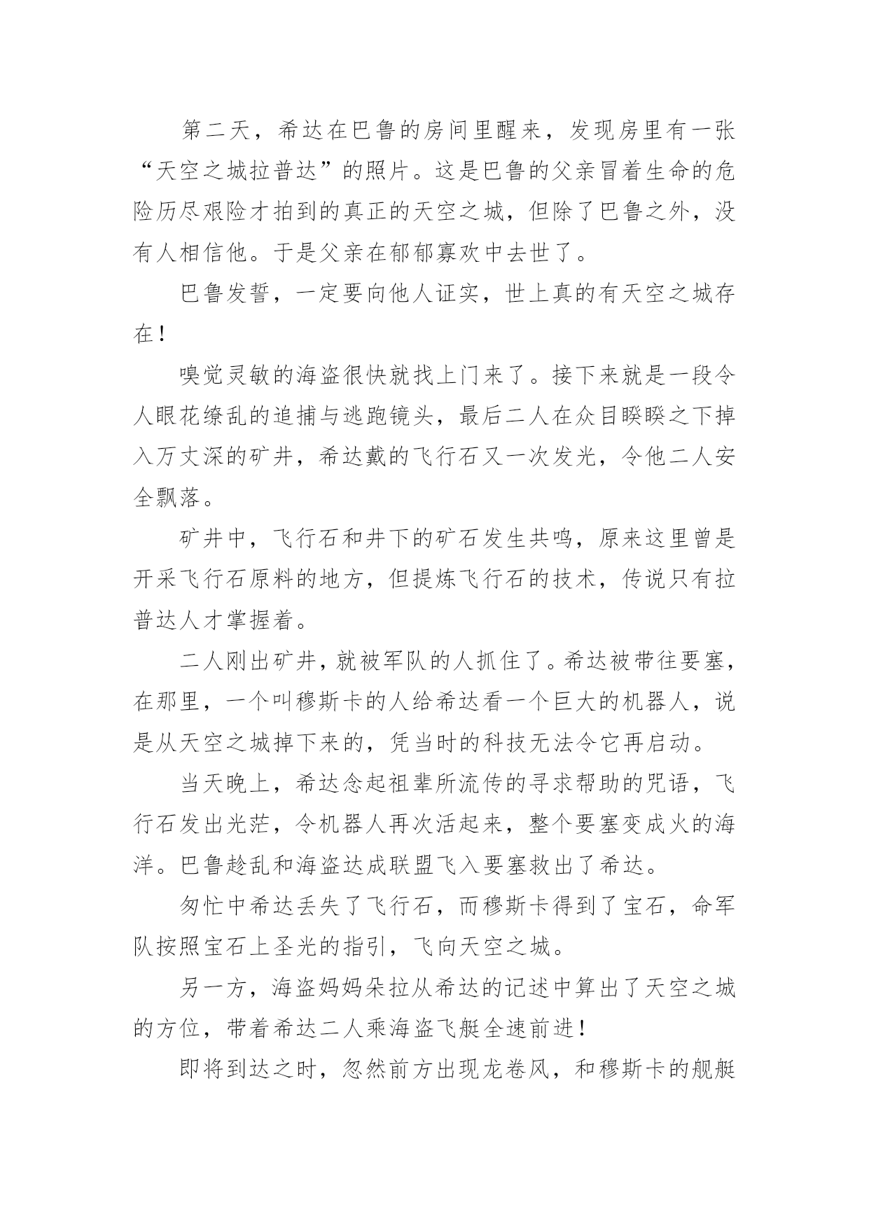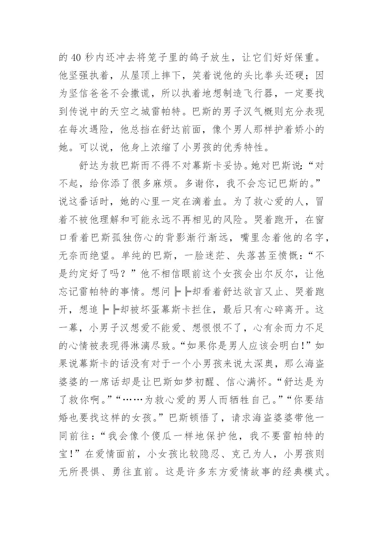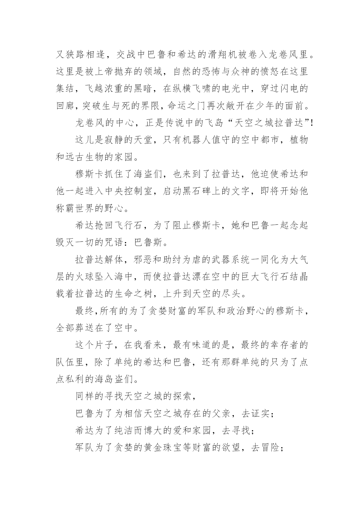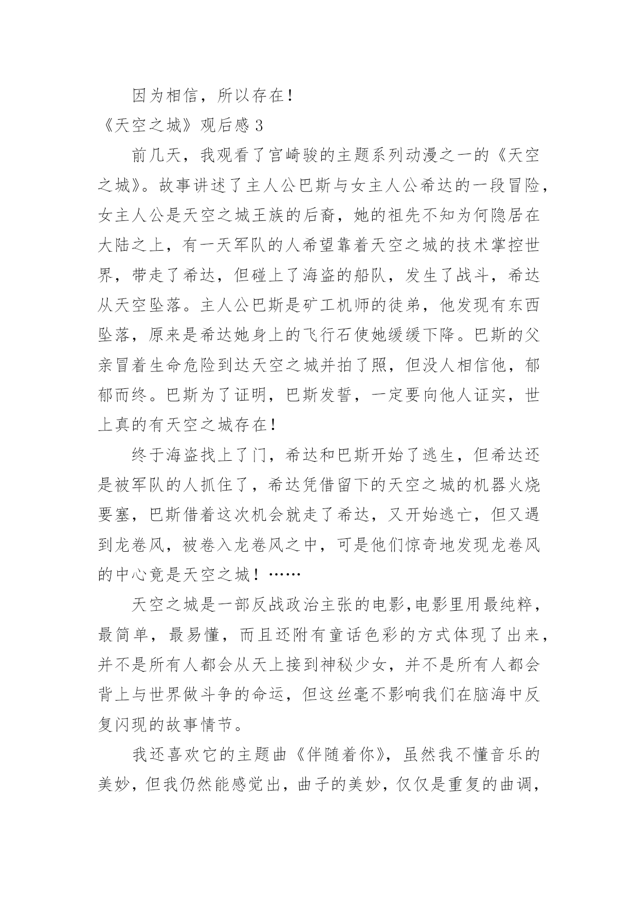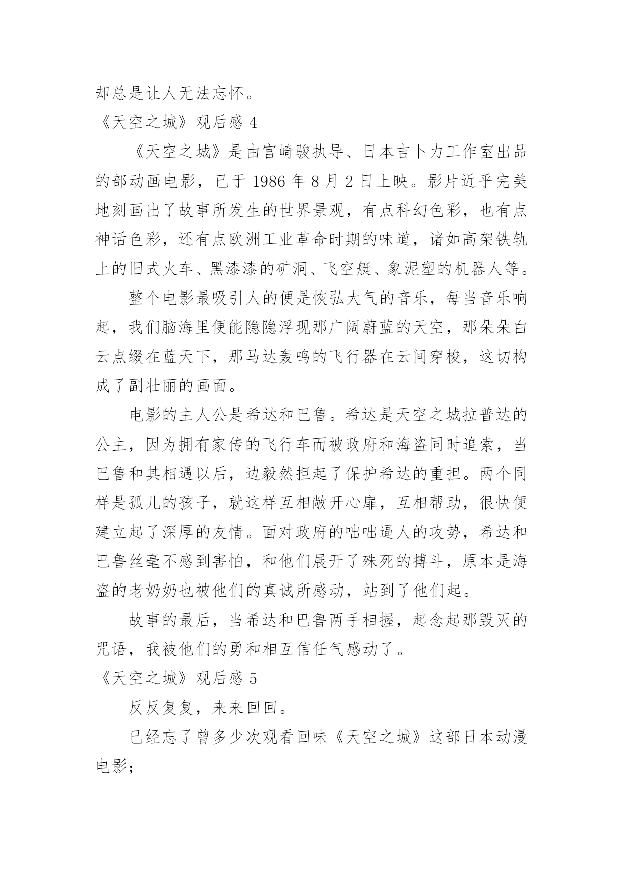 《天空之城》观后感《天空之城》观后感7篇看完一部作品以后,一定有不少感悟吧,何不写一篇观后感记录下呢?那么你真的会写观后感吗?以下是小编整理的《天空之城》观后感,希望能够帮助到大家。《天空之城》观后感1今天我来说说宫崎骏的《天空之城》,这部动画片说的是天空中有个漂浮的城市犹如仙境,名叫拉普达。小女孩希达是天空之城的公主她有一块祖传的飞行石。这块石头有强大的力量,可以帮她指引回拉普达的方向。所以海盗和慕斯卡的军队都来抢夺飞行石。在逃亡的途中,希达认识了很多好朋友,他们之间发生了很多有趣的事情…这部电影想告诉我们两个道理。第一,告诉我们人不能太贪婪,一贪婪就会做出后悔莫及的事情。慕斯卡为了得到天空之城的所有权,做了很多坏事,反派角色最终以失败告终。第二,要保护大自然,失去了大自然,哪怕有再强的高科技,人类无法生存。天空之城最后被毁的只剩下一棵树。宫崎骏想告诉我们人与自然的矛盾是天生的。只要人类繁衍下去,破坏自然的行动就会一直重复下去。虽然很消极,也确实如此。但是我坚信我们人类都在觉悟中,更在改进中。《天空之城》观后感2宫崎骏的动画电影《天空之城》,虽然是以小男孩小女孩作为主人公,但是他的观众群并不局限为孩子,他所表达的思想和意境适合不同层次,年龄的观众。小女孩纯洁善良,小男孩简单勇敢,用他们的眼睛看世界,用他们的心灵感受世界,往往能折射出最真挚透彻的人性;而成人在社会这个染缸中变得复杂混浊,失去了本色。这也许是宫崎骏屡屡选择小孩子做主人公的原因之一吧。舒达具备小女孩的通性,她柔弱善良、礼貌可爱。舒达年纪轻轻就父母双亡,一人独自在双亲留下的土地上生活,还背负家族的重要机密,这又使得她具备一些小女孩没有的优秀品质,比如勇敢执着、恭俭贤良。舒达的柔弱娇小、眉头紧蹙、嘤嘤啜泣,让小男孩巴斯心生怜爱与保护之情,也满足了男孩天生的英雄主义情节。而她宁愿为爱牺牲、忍辱负重最终也换来了巴斯的赴汤蹈火、生死相守。在影片中,舒达即使身陷险境还关心他人安危:伯伯他们好不好,海盗婆婆一行人怎么样了;她脆弱需要保护,在熊熊烈火中,眼睁睁看着衷心的机器人一点点倒下而无能为力;她又有着女人的贤淑,在海盗婆婆的飞行船里,她做的饭菜让众人大快朵颐,她浣洗的衣裳让人感到家的温馨……巴斯也是个没有父母的孩子,跟着伯伯在矿山里辛苦劳作。修理机械、加晚班,他永远都充满活力、毫无怨言。虽然从小干的是粗重的活,但他却怀有一颗细致和仁爱之心。准备飞奔前去干活,忽然想起天凉,转身把马甲脱下盖在舒达身上;救舒达临行前,想到可能永远回不来,在紧急准备的40秒内还冲去将笼子里的鸽子放生,让它们好好保重。他坚强执着,从屋顶上摔下,笑着说他的头比拳头还硬;因为坚信爸爸不会撒谎,所以执着地想制造飞行器,一定要找到传说中的天空之城雷帕特。巴斯的男子汉气概则充分表现在每次遇险,他总挡在舒达前面,像个男人那样护着娇小的她。可以说,他身上浓缩了小男孩的优秀特性。舒达为救巴斯而不得不对幕斯卡妥协。她对巴斯说:“对不起,给你添了很多麻烦。多谢你,我不会忘记巴斯的。”说这番话时,她的心里一定在滴着血。为了救心爱的人,冒着不被他理解和可能永远不再相见的风险。哭着跑开,在窗口看着巴斯孤独伤心的背影渐行渐远,嘴里念着他的名字,无奈而绝望。单纯的巴斯,一脸迷茫、失落甚至愤慨:“不是约定好了吗?”他不相信眼前这个女孩会出尔反尔,让他忘记雷帕特的事情。想问╠╠却看着舒达欲言又止、哭着跑开,想追╠╠却被坏蛋幕斯卡拦住,最后只有心碎离开。这一幕,小男子汉想爱不能爱、想恨恨不了,心有余而力不足的心情被表现得淋漓尽致。“如果你是男人应该会明白!”如果说幕斯卡的话没有对于一个小男孩来说太深奥,那么海盗婆婆的一席话却是让巴斯如梦初醒、信心满怀。“舒达是为了救你啊。”“……为救心爱的男人而牺牲自己。”“你要结婚也要找这样的女孩。”巴斯顿悟了,请求海盗婆婆带他一同前往:“我会像个傻瓜一样地保护他,我不要雷帕特的宝!”在爱情面前,小女孩比较隐忍、克己为人,小男孩则无所畏惧、勇往直前。这是许多东方爱情故事的经典模式。除了上面的情节外,两人在海盗婆婆的飞行器上面站岗时的一番谈话也值得回味。舒达抱怨她传家的宝石总惹麻烦,早点丢了就好,才不想找到雷帕特呢。巴斯则想得很清楚,没有石头我们就不会见面,而且丢了石头雷帕特也不会不见;现在逃掉,他们也不会放过你。舒达和巴斯一个感性主观,有点逃避现实,遇到困难不知所措;一个理性客观,迎难而上,勇敢面对。巴斯表现出了小男子汉的决策力消除了舒达的彷徨不安,对事情结束后送舒达回家的承诺使其破涕为笑,重燃希望。“我会送你回去,我想看看你生长的地方。”仔细想想,别说舒达了,哪个女孩听到这样的话不会感动?这里还有个小细节:巴斯先是让舒达钻进自己用来御寒的袍子里,后来袍子就变成舒达一个人裹了,不知是什么时候巴斯偷