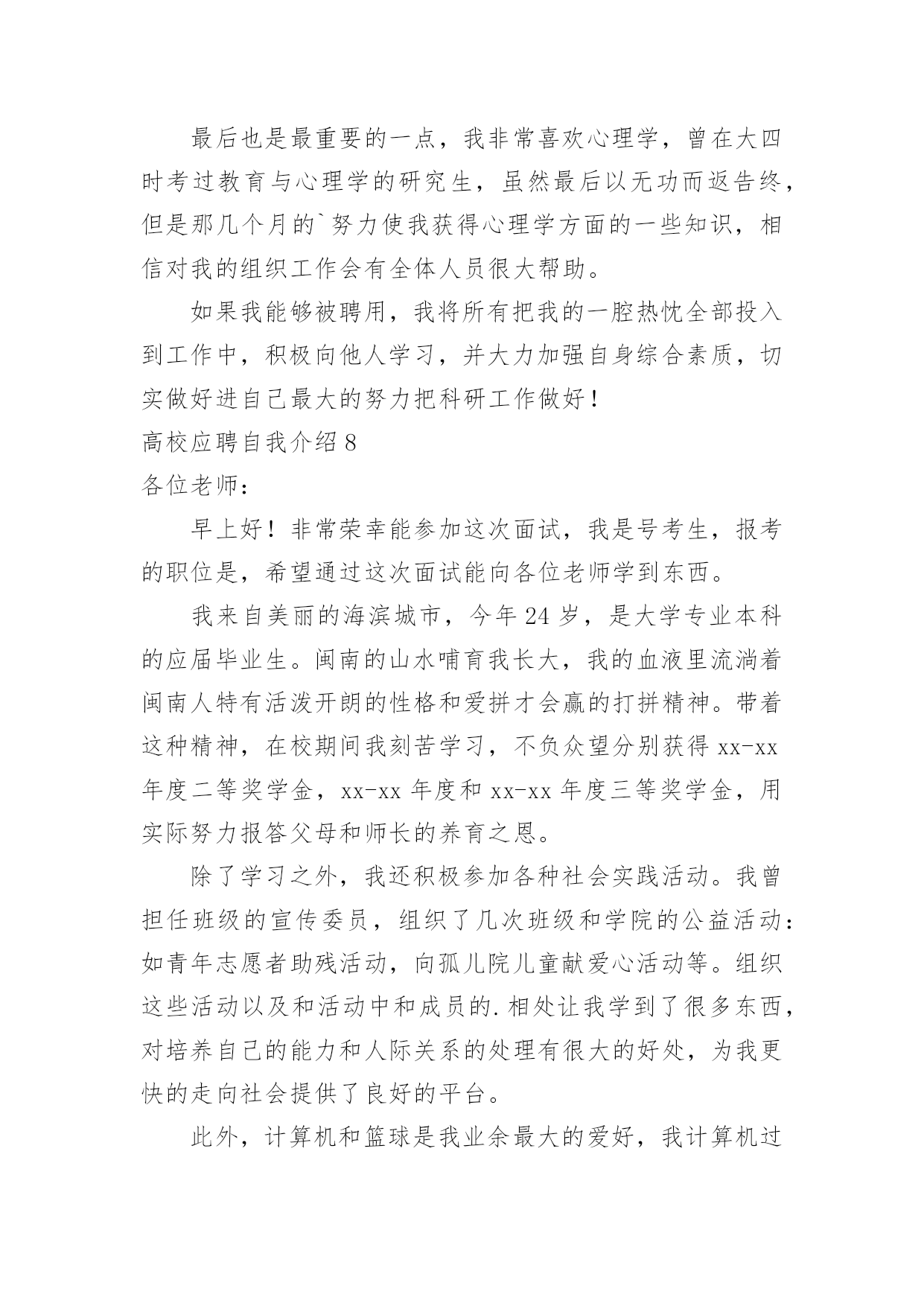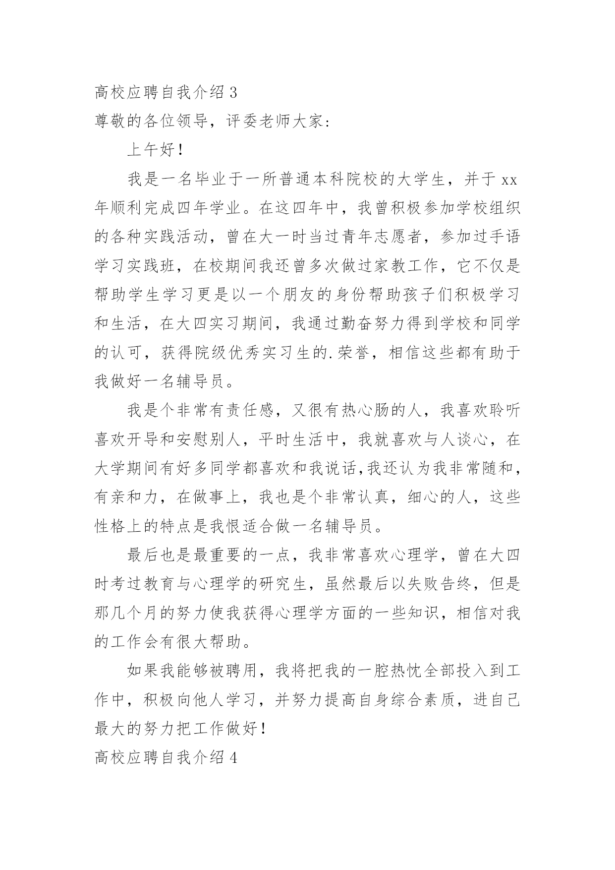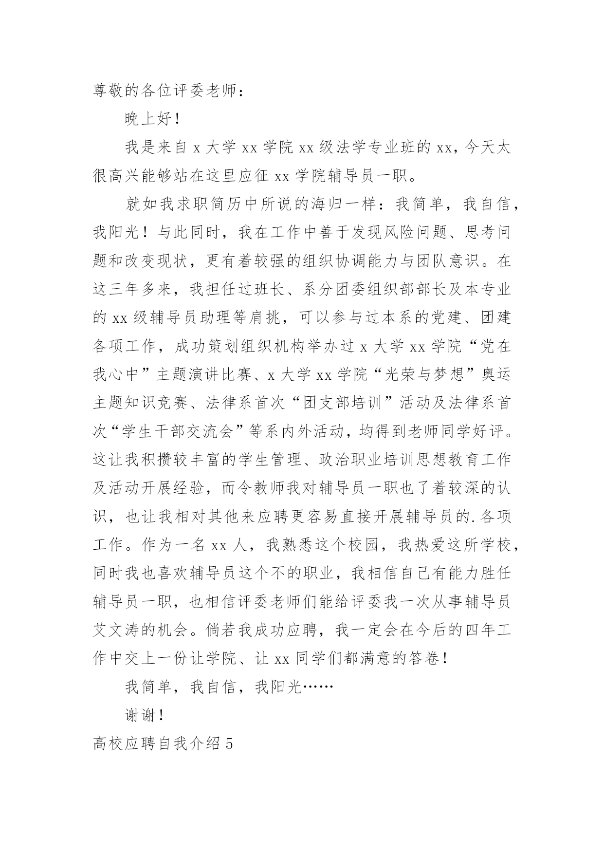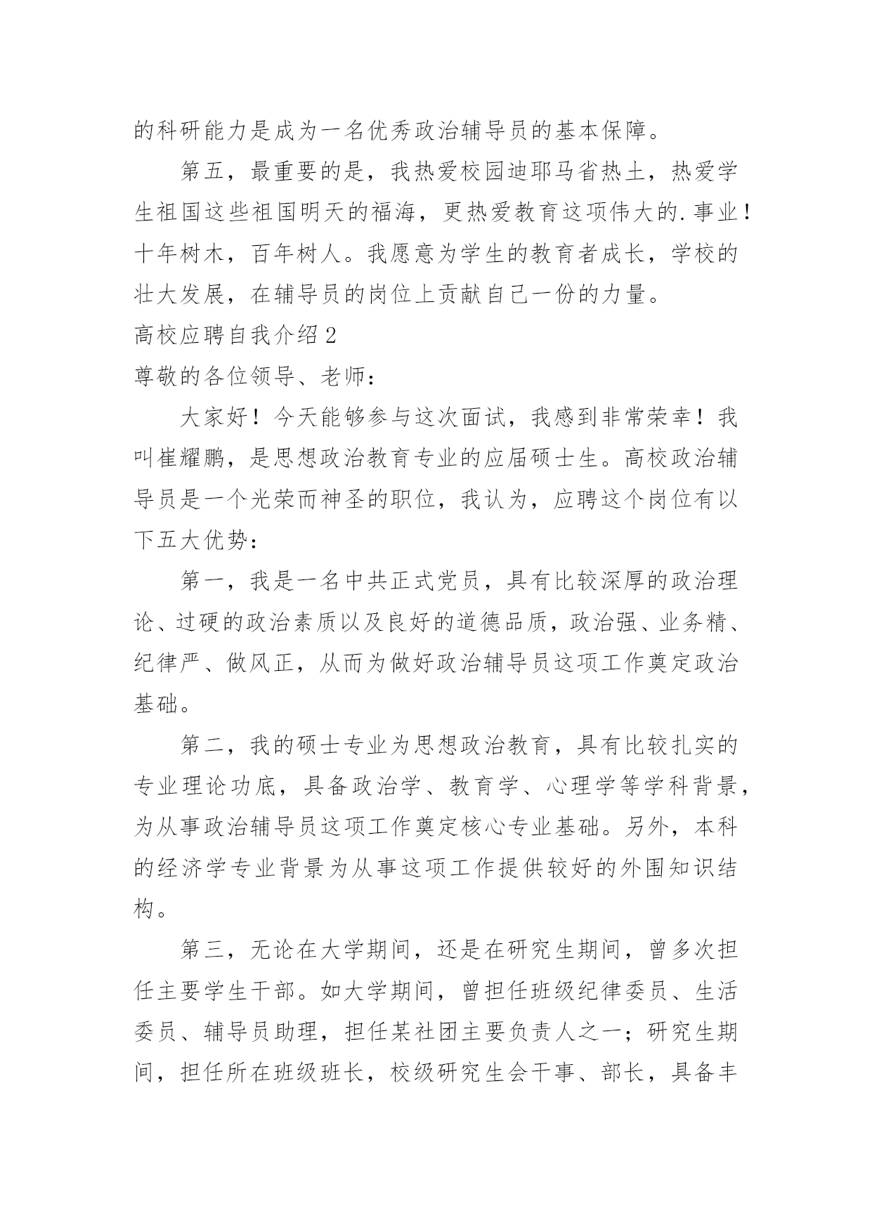 高校应聘自我介绍高校应聘自我介绍来到一个陌生的地方时,我们往往需要进行适当的自我介绍,通过自我介绍可以得到他人的认识。那么自我介绍有什么格式呢?以下是小编整理的高校应聘自我介绍,希望能够帮助到大家。高校应聘自我介绍1尊敬的各位领导、老师:大家好!今天能够帮助参与这次面试,我感到非常荣幸!我叫崔耀鹏,是思想政治硕士生德育专业的应届硕士生。高校政治辅导员是一个光荣而神圣医学院校的职位,我助理,担任某社团多半负责人之一;研究生期间,担任所在班级中队长,合聘研究生会干事、部长,具备丰富的学生管理工作理论知识经验,具有较强的组织管理能力和能力,从而为做好政治辅导员这项工作奠定经验与能力基础。另外,在工作实践方面,曾实习锻炼于省委机关,机关组织工作改善能力和公务活动能力得到有效提升。第四,较强的学习能力与讲授学术研究能力。研究生学习期间,被录用或公共发表学术论文4篇,各科目考试平均成绩在85分以上,约50%科目总分居专业第一。新时期辅导员队伍发展的方向是实践能力与科研能力创造性并举,较强的科研能力是成为一名优秀政治辅导员的基本保障。第五,最重要的是,我热爱校园迪耶马省热土,热爱学生祖国这些祖国明天的福海,更热爱教育这项伟大的.事业!十年树木,百年树人。我愿意为学生的教育者成长,学校的壮大发展,在辅导员的岗位上贡献自己一份的力量。高校应聘自我介绍2尊敬的各位领导、老师:大家好!今天能够参与这次面试,我感到非常荣幸!我叫崔耀鹏,是思想政治教育专业的应届硕士生。高校政治辅导员是一个光荣而神圣的职位,我认为,应聘这个岗位有以下五大优势:第一,我是一名中共正式党员,具有比较深厚的政治理论、过硬的政治素质以及良好的道德品质,政治强、业务精、纪律严、做风正,从而为做好政治辅导员这项工作奠定政治基础。第二,我的硕士专业为思想政治教育,具有比较扎实的专业理论功底,具备政治学、教育学、心理学等学科背景,为从事政治辅导员这项工作奠定核心专业基础。另外,本科的经济学专业背景为从事这项工作提供较好的外围知识结构。第三,无论在大学期间,还是在研究生期间,曾多次担任主要学生干部。如大学期间,曾担任班级纪律委员、生活委员、辅导员助理,担任某社团主要负责人之一;研究生期间,担任所在班级班长,校级研究生会干事、部长,具备丰富的学生管理工作经验,具有较强的组织管理能力和语言表达能力,从而为做好政治辅导员这项工作奠定经验与能力基础。另外,在工作实践方面,曾实习锻炼于省委机关,机关工作能力和公务活动能力得到有效提升。第四,较强的学习能力与学术研究能力。研究生学习期间,被录用或公共发表学术论文4篇,各科目考试平均成绩在85分以上,约50%科目成绩居专业第一。新时期辅导员队伍发展的方向是实践能力与科研能力并举,较强的科研能力是成为一名优秀政治辅导员的基本保障。第五,最重要的是,我热爱校园这片热土,热爱学生这些祖国明天的栋梁,更热爱教育这项伟大的事业!十年树木,百年树人。我愿意为学生的成才成长,学校的壮大发展,在辅导员的岗位上贡献自己一份的力量。在这里我深切地体会到了文学学习的乐趣并立志做一名人民教师将自己奉献给教育事业。学高为师,德高为范是我铭记的警言。这些年我从未稍有懈怠,岁月悠悠,始终坚信生命如执铁铸剑,挥汗如雨中磨砺以待。在学习上,我刻苦钻研,取得了良好的成绩,多次获得优秀班级学生奖学金,先后通过了英语四级、计算机二级的水平考试,并在***社会科学等省级以上刊物发表了多篇论文。在思想上,积极向党组织靠拢,先后两年被评为优秀团员和优秀团干部,并于**年光荣地加入了中国共产党。在实践上,我担任研究生会办生会办公室干事,在服务同学的同时锻炼了我的组织协调能力和处理日常事务的能力。我们知道辅导员是班级学生思想政治工作一线的组织者和承担者,是连接学校与班级学生之间得桥梁,可以说辅导员责任重大,做好辅导员工作,对于高校人才培养和校园稳定具有重要的.意义。我认为做好辅导员工作最重要的是要有三心即公心、爱心和责任心。所谓公心,就是公平、公正,高校管理中的各种先进评比、奖助金发放、班级学生干部任命、发展党员等环节都和班级学生的切身利益相关,辅导员做到了公平公正,才能得到班级学生的认同和尊重,稍有失偏颇,极有可能成为矛盾的触发点,影响稳定。爱心就是对班级学生热爱之心,辅导员是一个需要奉献和付出的岗位,有爱心是做好辅导员工作得根本保证,全心全意地为班级学生服务,真心实意地热爱每一个班级学生,才能赢得同学们得信任与配合,才能把工作做好。辅导员的责任心则体现在上对学校负责,下对班级学生负责两个方面,不仅要积极带领全班同学使学校各项工作得到很好得落实。而且要有为全体班级学生负责的思想,要做到经常深入班级学生,全面了解班级学生,进行针对性得教育和引导,帮助班级学生们树立各种正确得观念。最后,希望我通过这