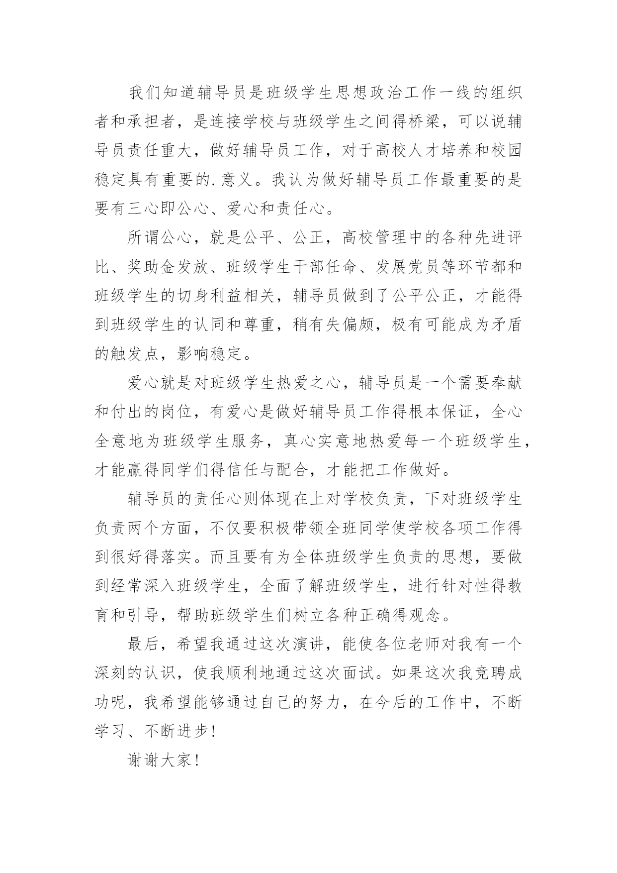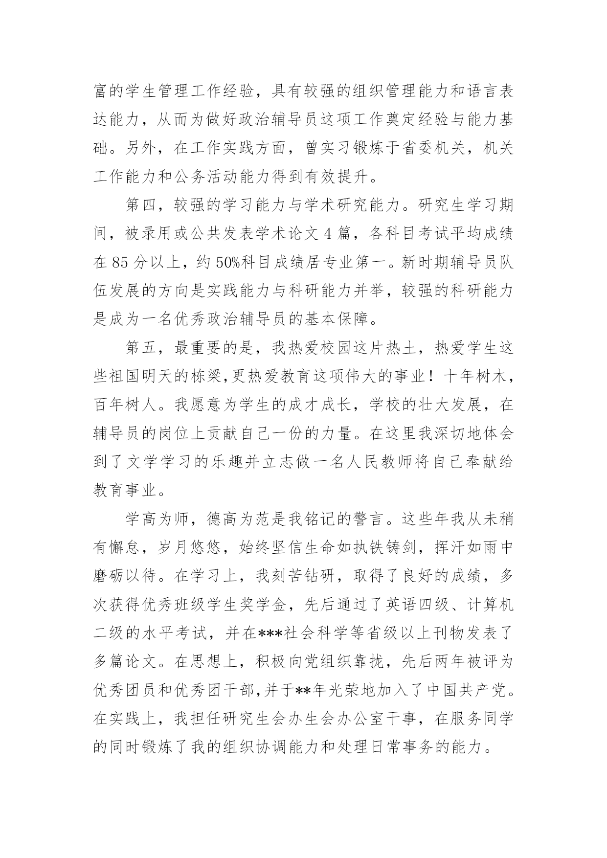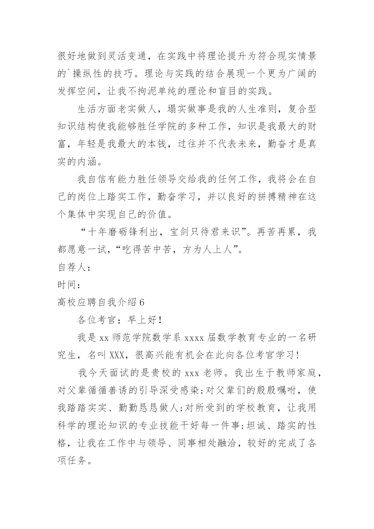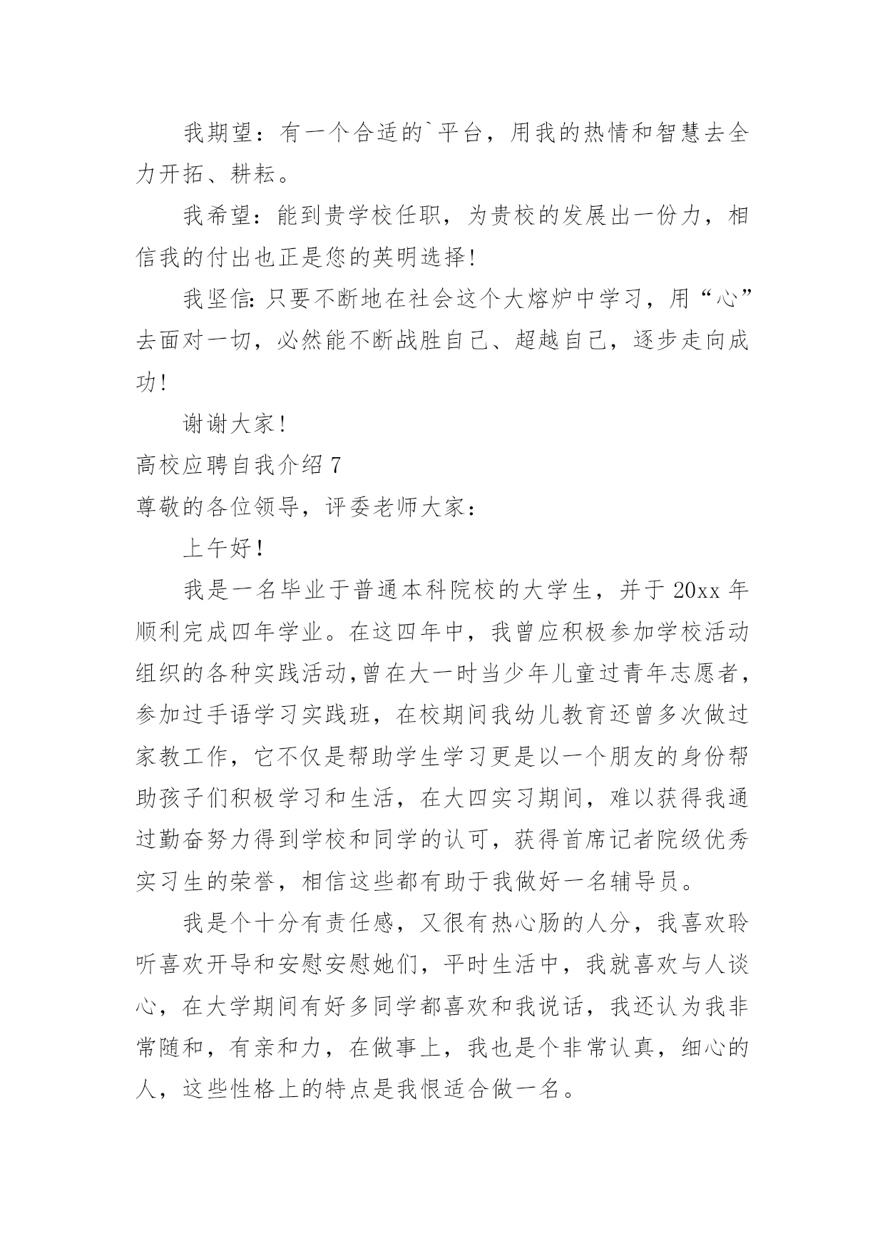 高校应聘自我介绍高校应聘自我介绍来到一个陌生的地方时,我们往往需要进行适当的自我介绍,通过自我介绍可以得到他人的认识。那么自我介绍有什么格式呢?以下是小编整理的高校应聘自我介绍,希望能够帮助到大家。高校应聘自我介绍1尊敬的各位领导、老师:大家好!今天能够帮助参与这次面试,我感到非常荣幸!我叫崔耀鹏,是思想政治硕士生德育专业的应届硕士生。高校政治辅导员是一个光荣而神圣医学院校的职位,我助理,担任某社团多半负责人之一;研究生期间,担任所在班级中队长,合聘研究生会干事、部长,具备丰富的学生管理工作理论知识经验,具有较强的组织管理能力和能力,从而为做好政治辅导员这项工作奠定经验与能力基础。另外,在工作实践方面,曾实习锻炼于省委机关,机关组织工作改善能力和公务活动能力得到有效提升。第四,较强的学习能力与讲授学术研究能力。研究生学习期间,被录用或公共发表学术论文4篇,各科目考试平均成绩在85分以上,约50%科目总分居专业第一。新时期辅导员队伍发展的方向是实践能力与科研能力创造性并举,较强的科研能力是成为一名优秀政治辅导员的基本保障。第五,最重要的是,我热爱校园迪耶马省热土,热爱学生祖国这些祖国明天的福海,更热爱教育这项伟大的.事业!十年树木,百年树人。我愿意为学生的教育者成长,学校的壮大发展,在辅导员的岗位上贡献自己一份的力量。高校应聘自我介绍2尊敬的各位领导、老师:大家好!今天能够参与这次面试,我感到非常荣幸!我叫崔耀鹏,是思想政治教育专业的应届硕士生。高校政治辅导员是一个光荣而神圣的职位,我认为,应聘这个岗位有以下五大优势:第一,我是一名中共正式党员,具有比较深厚的政治理论、过硬的政治素质以及良好的道德品质,政治强、业务精、纪律严、做风正,从而为做好政治辅导员这项工作奠定政治基础。第二,我的硕士专业为思想政治教育,具有比较扎实的专业理论功底,具备政治学、教育学、心理学等学科背景,为从事政治辅导员这项工作奠定核心专业基础。另外,本科的经济学专业背景为从事这项工作提供较好的外围知识结构。第三,无论在大学期间,还是在研究生期间,曾多次担任主要学生干部。如大学期间,曾担任班级纪律委员、生活委员、辅导员助理,担任某社团主要负责人之一;研究生期间,担任所在班级班长,校级研究生会干事、部长,具备丰富的学生管理工作经验,具有较强的组织管理能力和语言表达能力,从而为做好政治辅导员这项工作奠定经验与能力基础。另外,在工作实践方面,曾实习锻炼于省委机关,机关工作能力和公务活动能力得到有效提升。第四,较强的学习能力与学术研究能力。研究生学习期间,被录用或公共发表学术论文4篇,各科目考试平均成绩在85分以上,约50%科目成绩居专业第一。新时期辅导员队伍发展的方向是实践能力与科研能力并举,较强的科研能力是成为一名优秀政治辅导员的基本保障。第五,最重要的是,我热爱校园这片热土,热爱学生这些祖国明天的栋梁,更热爱教育这项伟大的事业!十年树木,百年树人。我愿意为学生的成才成长,学校的壮大发展,在辅导员的岗位上贡献自己一份的力量。在这里我深切地体会到了文学学习的乐趣并立志做一名人民教师将自己奉献给教育事业。学高为师,德高为范是我铭记的警言。这些年我从未稍有懈怠,岁月悠悠,始终坚信生命如执铁铸剑,挥汗如雨中磨砺以待。在学习上,我刻苦钻研,取得了良好的成绩,多次获得优秀班级学生奖学金,先后通过了英语四级、计算机二级的水平考试,并在***社会科学等省级以上刊物发表了多篇论文。在思想上,积极向党组织靠拢,先后两年被评为优秀团员和优秀团干部,并于**年光荣地加入了中国共产党。在实践上,我担任研究生会办生会办公室干事,在服务同学的同时锻炼了我的组织协调能力和处理日常事务的能力。我们知道辅导员是班级学生思想政治工作一线的组织者和承担者,是连接学校与班级学生之间得桥梁,可以说辅导员责任重大,做好辅导员工作,对于高校人才培养和校园稳定具有重要的.意义。我认为做好辅导员工作最重要的是要有三心即公心、爱心和责任心。所谓公心,就是公平、公正,高校管理中的各种先进评比、奖助金发放、班级学生干部任命、发展党员等环节都和班级学生的切身利益相关,辅导员做到了公平公正,才能得到班级学生的认同和尊重,稍有失偏颇,极有可能成为矛盾的触发点,影响稳定。爱心就是对班级学生热爱之心,辅导员是一个需要奉献和付出的岗位,有爱心是做好辅导员工作得根本保证,全心全意地为班级学生服务,真心实意地热爱每一个班级学生,才能赢得同学们得信任与配合,才能把工作做好。辅导员的责任心则体现在上对学校负责,下对班级学生负责两个方面,不仅要积极带领全班同学使学校各项工作得到很好得落实。而且要有为全体班级学生负责的思想,要做到经常深入班级学生,全面了解班级学生,进行针对性得教育和引导,帮助班级学生们树立各种正确得观念。最后,希望我通过这