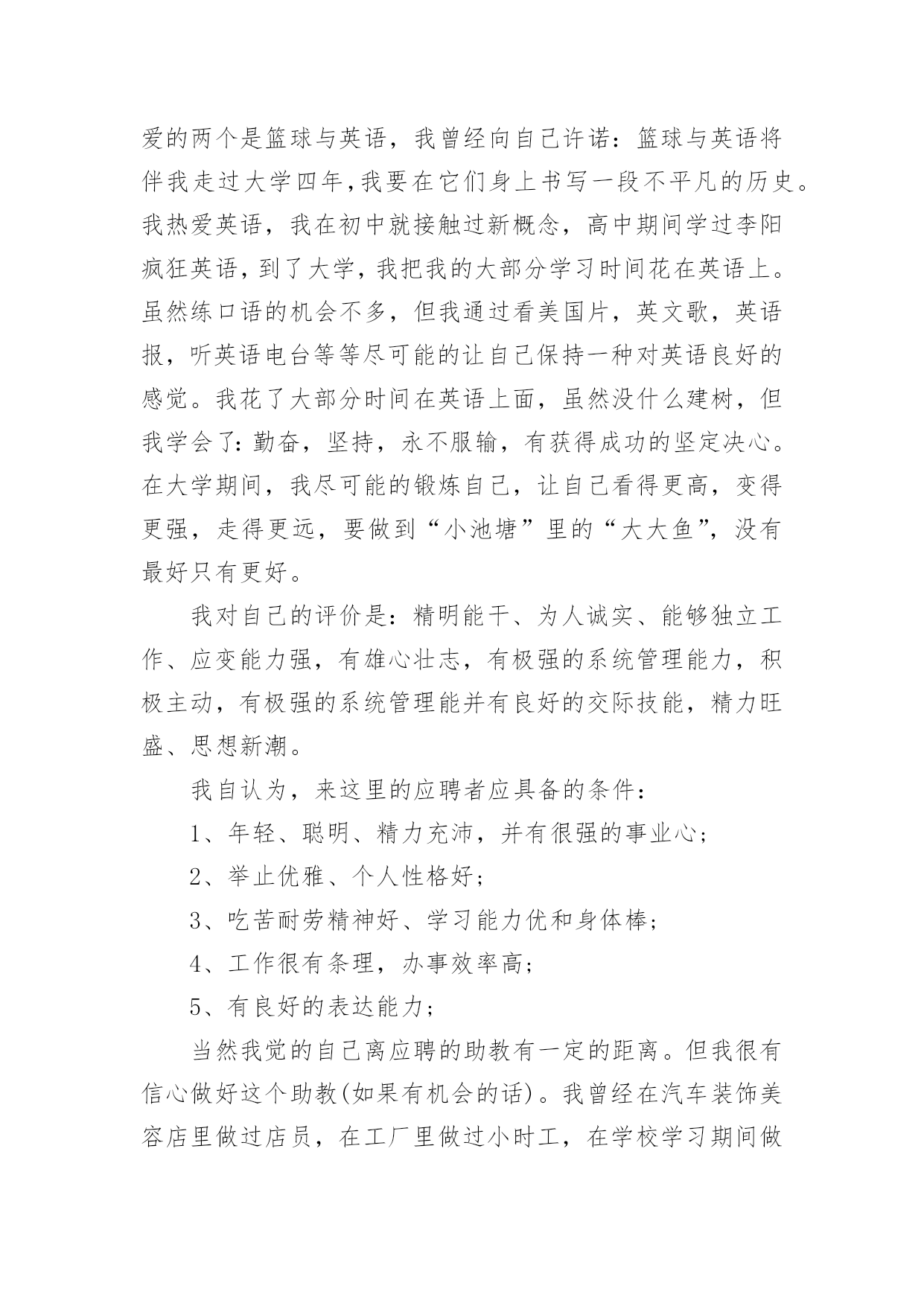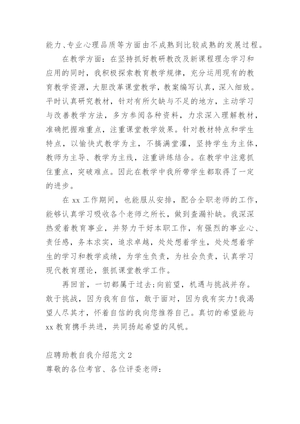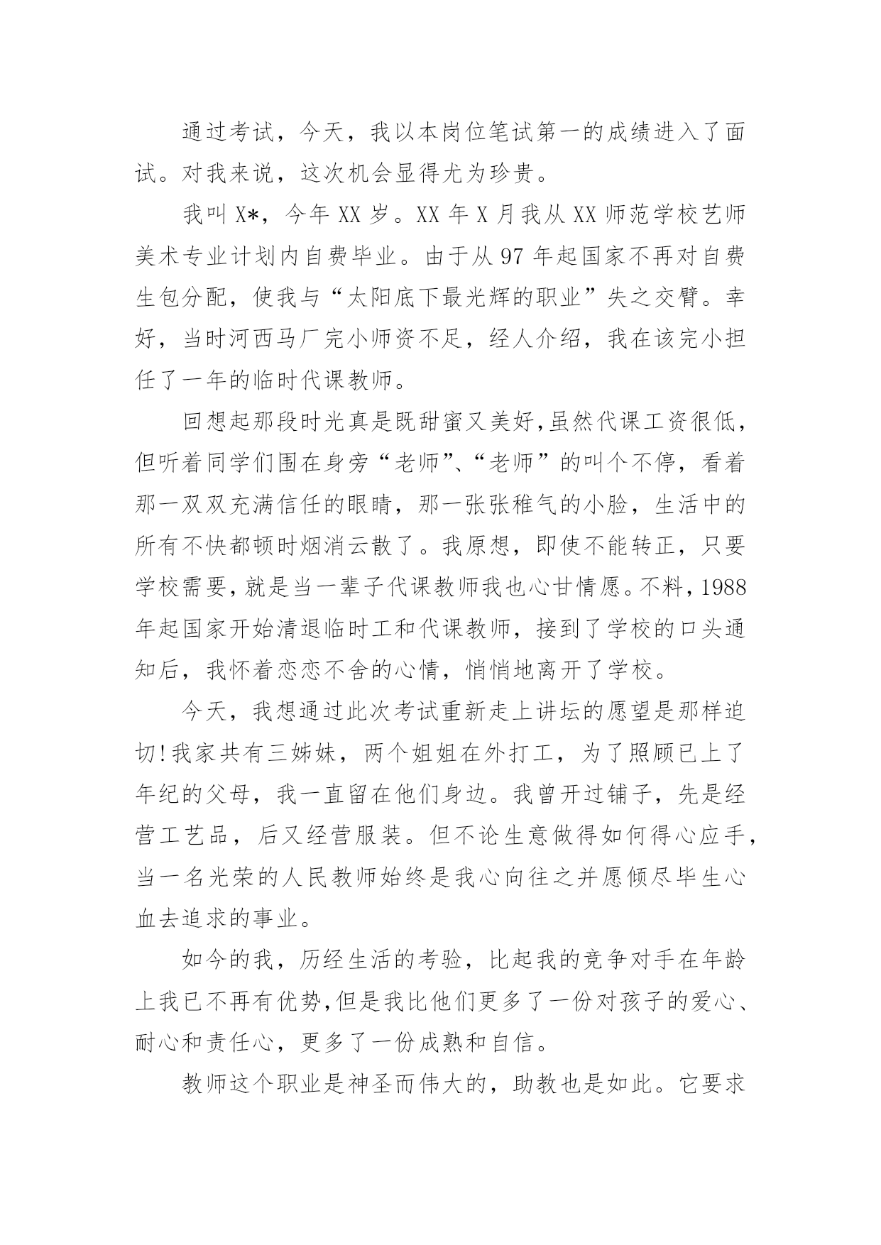应聘助教自我介绍应聘助教自我介绍范文应聘助教自我介绍范文1尊敬的xx教育的领导:您好!我叫xxx,从20xx年1月份开始担任xxx初高中的一名英语助教,现就就读于xxxx,所学专业为xxx。怀着对贵校的尊重与向往,我真挚地写了这封自荐信,向您展示一个完全真实的我,希望贵校能接纳我成为四星级助教的其中一员。从小我就十分崇拜教师这一职业,随着年龄的增长、认识的提高,我更萌发了要做一名优秀的人民教师的愿望。在经历了xx助教的兼职后,面对新的机遇和挑战,我更坚定了“自信、自强、勤奋、谦虚的人生信条。我十分珍惜在学校的学习时间,在大一学年中,获得了专业一等奖学金与国家励志奖学金,本着自强不息、学以致用的原则,一直以认真的态度对待学习。在学好专业课的同时,我也注重综合知识和技能的培养与提高,坚持不断从各方面完善自己,每个学期都较好的成绩完成学科的学习,并在教师技能方面,我不断的提高自身的整体水平,让自己具备良好的教师素质,并在教学中善于创新。在我的教学过程中我收获颇丰,现总结如下:在思想方面:我认真学习先进、科学的教育理念,并将此作为自己为人师表的准则。相信自己能从专业思想到专业能力、专业心理品质等方面由不成熟到比较成熟的发展过程。在教学方面:在坚持抓好教研教改及新课程理念学习和应用的同时,我积极探索教育教学规律,充分运用现有的教育教学资源,大胆改革课堂教学,教案编写认真,深入细致。平时认真研究教材,针对有所欠缺与不足的地方,主动学习与改善教学方法,多方参阅各种资料,力求深入理解教材,准确把握难重点,注重课堂教学效果。针对教材特点和学生特点,以愉快式教学为主,不搞满堂灌,坚持学生为主体,教师为主导、教学为主线,注重讲练结合。在教学中注意抓住重点,突破难点。因此在教学中我所带学生都取得了一定的进步。在xx工作期间,也能服从安排,配合全职老师的工作,能够认真学习吸收各个老师之所长,做到查漏补缺。我深深热爱着教育事业,并努力干好本职工作,有强烈的事业心、责任感,务本求实,追求卓越,处处想着学生,处处想着学生的学习和教学成绩,为学生负责,为社会负责,认真学习现代教育理论,狠抓课堂教学工作。再回首,一切都属于过去;向前望,机遇与挑战并存。敢于挑战,因为我有自信,敢于面对,因为我有实力!我渴望人尽其才,怀着自信的我向您推荐自己。真切的希望能与xx教育携手共进,共同扬起希望的风帆。应聘助教自我介绍范文2尊敬的各位考官、各位评委老师:通过考试,今天,我以本岗位笔试第一的成绩进入了面试。对我来说,这次机会显得尤为珍贵。我叫X*,今年XX岁。XX年X月我从XX师范学校艺师美术专业计划内自费毕业。由于从97年起国家不再对自费生包分配,使我与“太阳底下最光辉的职业”失之交臂。幸好,当时河西马厂完小师资不足,经人介绍,我在该完小担任了一年的临时代课教师。回想起那段时光真是既甜蜜又美好,虽然代课工资很低,但听着同学们围在身旁“老师”、“老师”的叫个不停,看着那一双双充满信任的眼睛,那一张张稚气的小脸,生活中的所有不快都顿时烟消云散了。我原想,即使不能转正,只要学校需要,就是当一辈子代课教师我也心甘情愿。不料,1988年起国家开始清退临时工和代课教师,接到了学校的口头通知后,我怀着恋恋不舍的心情,悄悄地离开了学校。今天,我想通过此次考试重新走上讲坛的愿望是那样迫切!我家共有三姊妹,两个姐姐在外打工,为了照顾已上了年纪的父母,我一直留在他们身边。我曾开过铺子,先是经营工艺品,后又经营服装。但不论生意做得如何得心应手,当一名光荣的人民教师始终是我心向往之并愿倾尽毕生心血去追求的事业。如今的我,历经生活的考验,比起我的竞争对手在年龄上我已不再有优势,但是我比他们更多了一份对孩子的爱心、耐心和责任心,更多了一份成熟和自信。教师这个职业是神圣而伟大的,助教也是如此。它要求教师不仅要有丰富的知识,还要有高尚的情操。因此,在读师范时,我就十分注重自身的全面发展,广泛地培养自己的兴趣爱好,并学有专长,做到除擅长绘画和书法外,还能会唱、会说、会讲。“学高仅能为师,身正方能为范”,在注重知识学习的同时我还注意培养自己高尚的道德情操,自觉遵纪守法,遵守社会公德,没有不良嗜好和行为。我想这些都是一名教育工作者应该具备的'最起码的素养。假如,我通过了面试,成为众多教师队伍中的成员,我将不断努力学习,努力工作,为家乡的教育事业贡献自己的力量,决不辜负“人类灵魂的工程师”这个光荣的称号。应聘助教自我介绍范文3各位考官好,今天能够站在这里参加面试,有机会向各位考官请教和学习,我感到非常的荣幸.希望通过这次面试能够把自己展示给大家,希望大家记住我.我叫xxx。今年22,我平时喜欢看书和上网浏览信息.我的性格比较开朗,随和.能关系周围的任何事,和亲人朋友能够和睦相处,并且对生活充满了信心.我以前在*