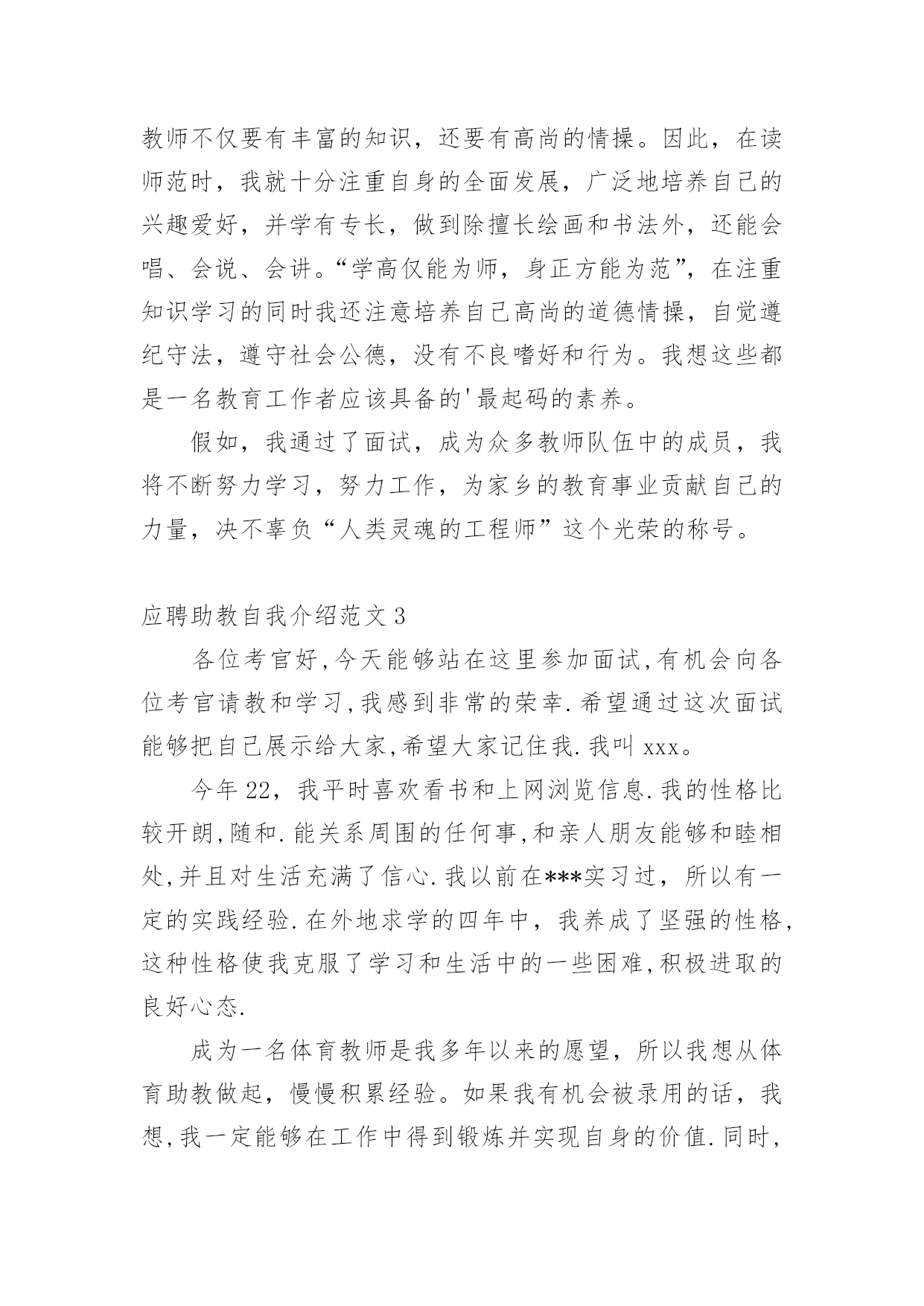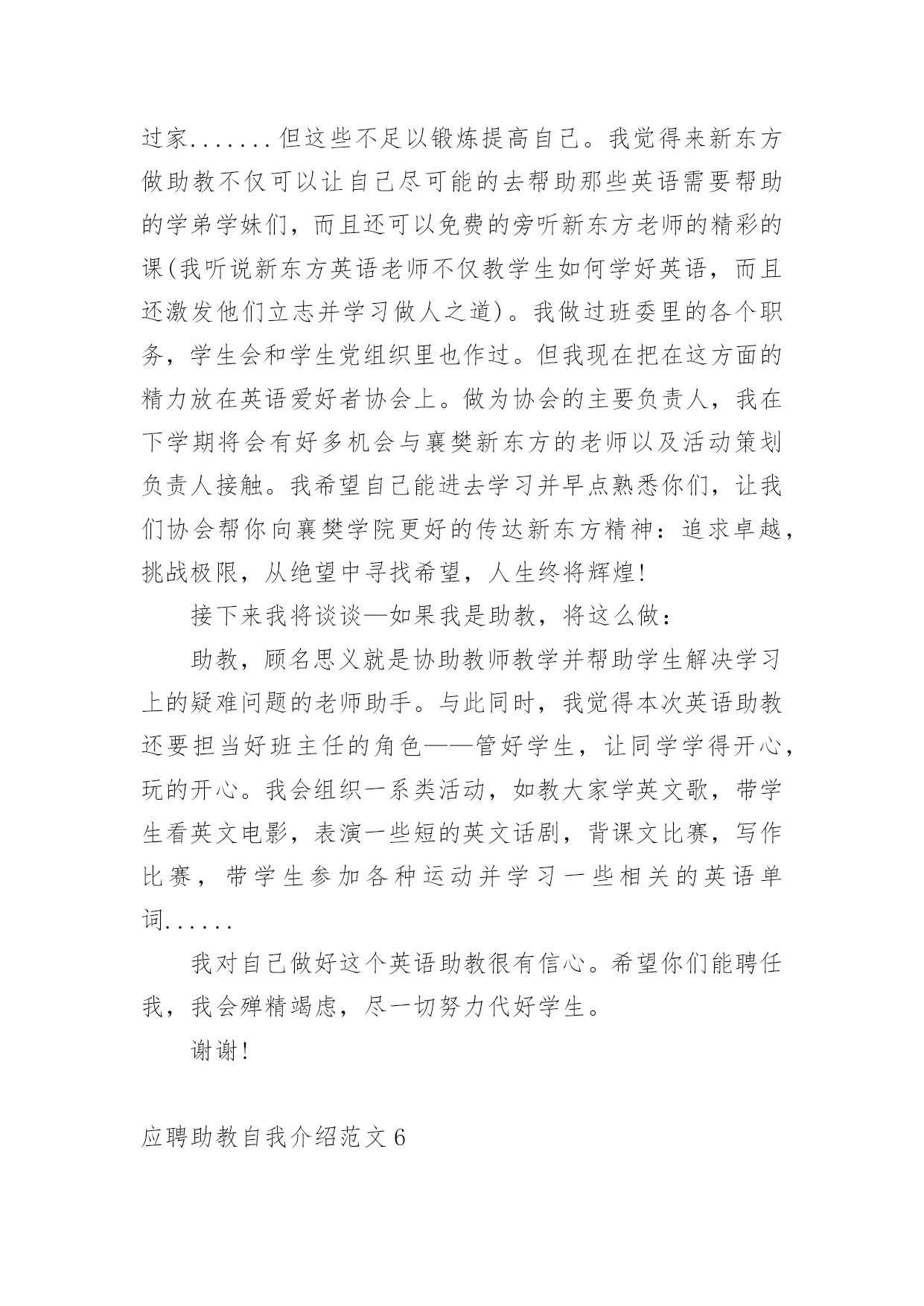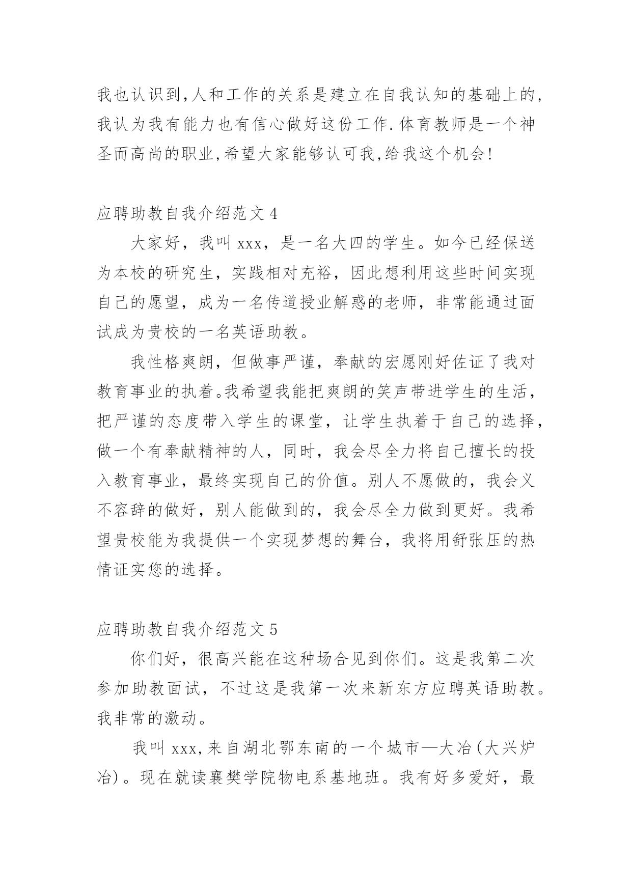 应聘助教自我介绍应聘助教自我介绍范文应聘助教自我介绍范文1尊敬的xx教育的领导:您好!我叫xxx,从20xx年1月份开始担任xxx初高中的一名英语助教,现就就读于xxxx,所学专业为xxx。怀着对贵校的尊重与向往,我真挚地写了这封自荐信,向您展示一个完全真实的我,希望贵校能接纳我成为四星级助教的其中一员。从小我就十分崇拜教师这一职业,随着年龄的增长、认识的提高,我更萌发了要做一名优秀的人民教师的愿望。在经历了xx助教的兼职后,面对新的机遇和挑战,我更坚定了“自信、自强、勤奋、谦虚的人生信条。我十分珍惜在学校的学习时间,在大一学年中,获得了专业一等奖学金与国家励志奖学金,本着自强不息、学以致用的原则,一直以认真的态度对待学习。在学好专业课的同时,我也注重综合知识和技能的培养与提高,坚持不断从各方面完善自己,每个学期都较好的成绩完成学科的学习,并在教师技能方面,我不断的提高自身的整体水平,让自己具备良好的教师素质,并在教学中善于创新。在我的教学过程中我收获颇丰,现总结如下:在思想方面:我认真学习先进、科学的教育理念,并将此作为自己为人师表的准则。相信自己能从专业思想到专业能力、专业心理品质等方面由不成熟到比较成熟的发展过程。在教学方面:在坚持抓好教研教改及新课程理念学习和应用的同时,我积极探索教育教学规律,充分运用现有的教育教学资源,大胆改革课堂教学,教案编写认真,深入细致。平时认真研究教材,针对有所欠缺与不足的地方,主动学习与改善教学方法,多方参阅各种资料,力求深入理解教材,准确把握难重点,注重课堂教学效果。针对教材特点和学生特点,以愉快式教学为主,不搞满堂灌,坚持学生为主体,教师为主导、教学为主线,注重讲练结合。在教学中注意抓住重点,突破难点。因此在教学中我所带学生都取得了一定的进步。在xx工作期间,也能服从安排,配合全职老师的工作,能够认真学习吸收各个老师之所长,做到查漏补缺。我深深热爱着教育事业,并努力干好本职工作,有强烈的事业心、责任感,务本求实,追求卓越,处处想着学生,处处想着学生的学习和教学成绩,为学生负责,为社会负责,认真学习现代教育理论,狠抓课堂教学工作。再回首,一切都属于过去;向前望,机遇与挑战并存。敢于挑战,因为我有自信,敢于面对,因为我有实力!我渴望人尽其才,怀着自信的我向您推荐自己。真切的希望能与xx教育携手共进,共同扬起希望的风帆。应聘助教自我介绍范文2尊敬的各位考官、各位评委老师:通过考试,今天,我以本岗位笔试第一的成绩进入了面试。对我来说,这次机会显得尤为珍贵。我叫X*,今年XX岁。XX年X月我从XX师范学校艺师美术专业计划内自费毕业。由于从97年起国家不再对自费生包分配,使我与“太阳底下最光辉的职业”失之交臂。幸好,当时河西马厂完小师资不足,经人介绍,我在该完小担任了一年的临时代课教师。回想起那段时光真是既甜蜜又美好,虽然代课工资很低,但听着同学们围在身旁“老师”、“老师”的叫个不停,看着那一双双充满信任的眼睛,那一张张稚气的小脸,生活中的所有不快都顿时烟消云散了。我原想,即使不能转正,只要学校需要,就是当一辈子代课教师我也心甘情愿。不料,1988年起国家开始清退临时工和代课教师,接到了学校的口头通知后,我怀着恋恋不舍的心情,悄悄地离开了学校。今天,我想通过此次考试重新走上讲坛的愿望是那样迫切!我家共有三姊妹,两个姐姐在外打工,为了照顾已上了年纪的父母,我一直留在他们身边。我曾开过铺子,先是经营工艺品,后又经营服装。但不论生意做得如何得心应手,当一名光荣的人民教师始终是我心向往之并愿倾尽毕生心血去追求的事业。如今的我,历经生活的考验,比起我的竞争对手在年龄上我已不再有优势,但是我比他们更多了一份对孩子的爱心、耐心和责任心,更多了一份成熟和自信。教师这个职业是神圣而伟大的,助教也是如此。它要求教师不仅要有丰富的知识,还要有高尚的情操。因此,在读师范时,我就十分注重自身的全面发展,广泛地培养自己的兴趣爱好,并学有专长,做到除擅长绘画和书法外,还能会唱、会说、会讲。“学高仅能为师,身正方能为范”,在注重知识学习的同时我还注意培养自己高尚的道德情操,自觉遵纪守法,遵守社会公德,没有不良嗜好和行为。我想这些都是一名教育工作者应该具备的'最起码的素养。假如,我通过了面试,成为众多教师队伍中的成员,我将不断努力学习,努力工作,为家乡的教育事业贡献自己的力量,决不辜负“人类灵魂的工程师”这个光荣的称号。应聘助教自我介绍范文3各位考官好,今天能够站在这里参加面试,有机会向各位考官请教和学习,我感到非常的荣幸.希望通过这次面试能够把自己展示给大家,希望大家记住我.我叫xxx。今年22,我平时喜欢看书和上网浏览信息.我的性格比较开朗,随和.能关系周围的任何事,和亲人朋友能够和睦相处,并且对生活充满了信心.我以前在*