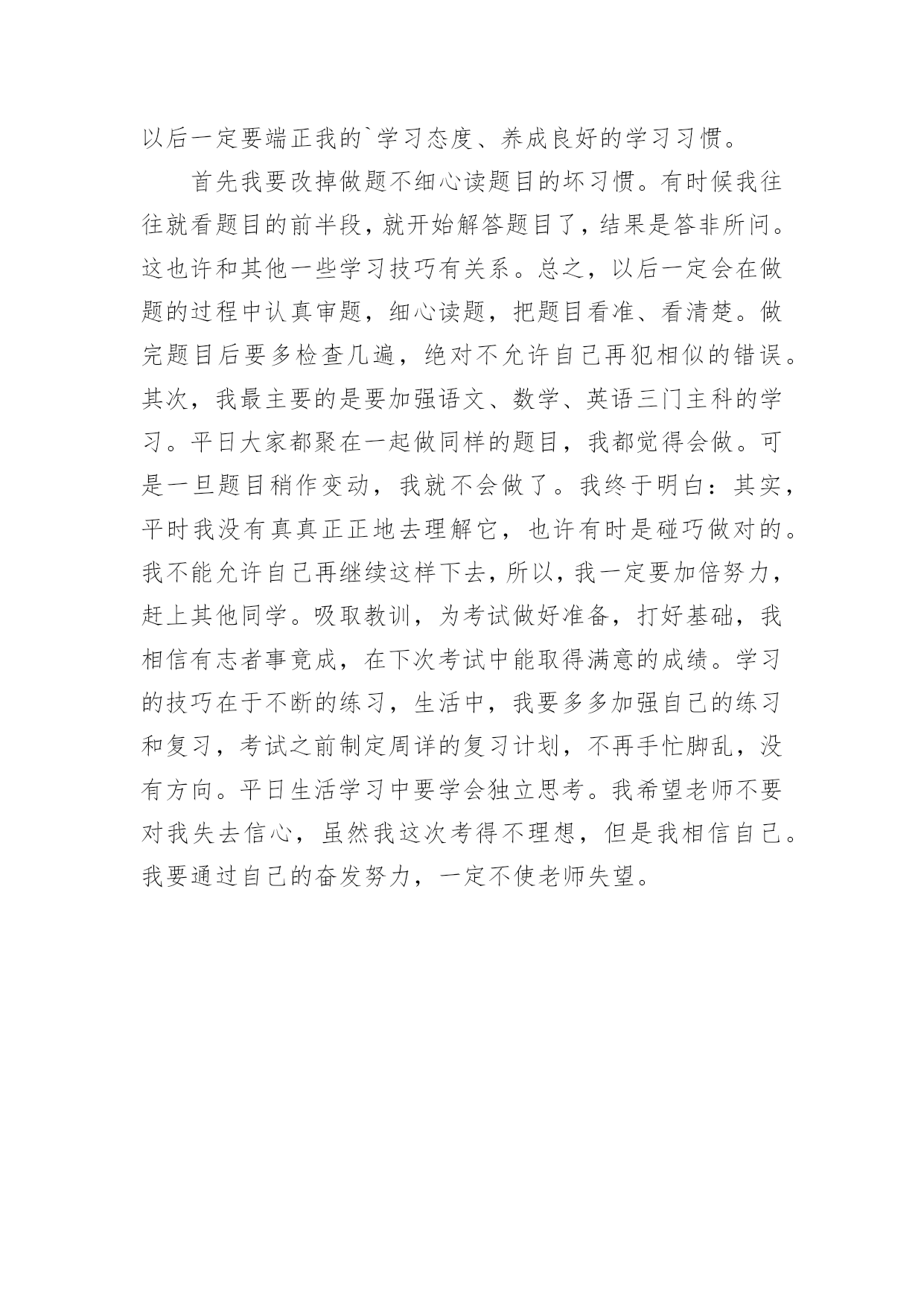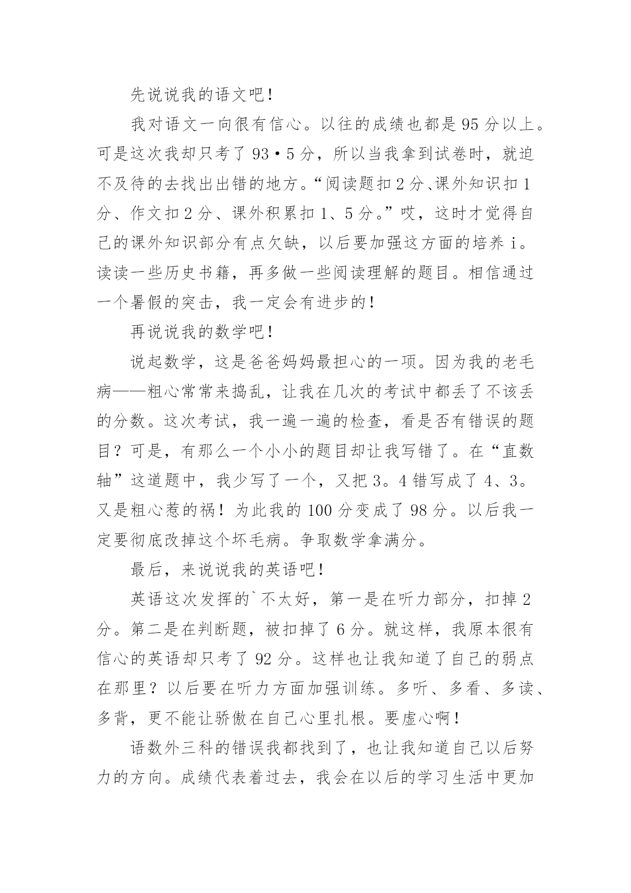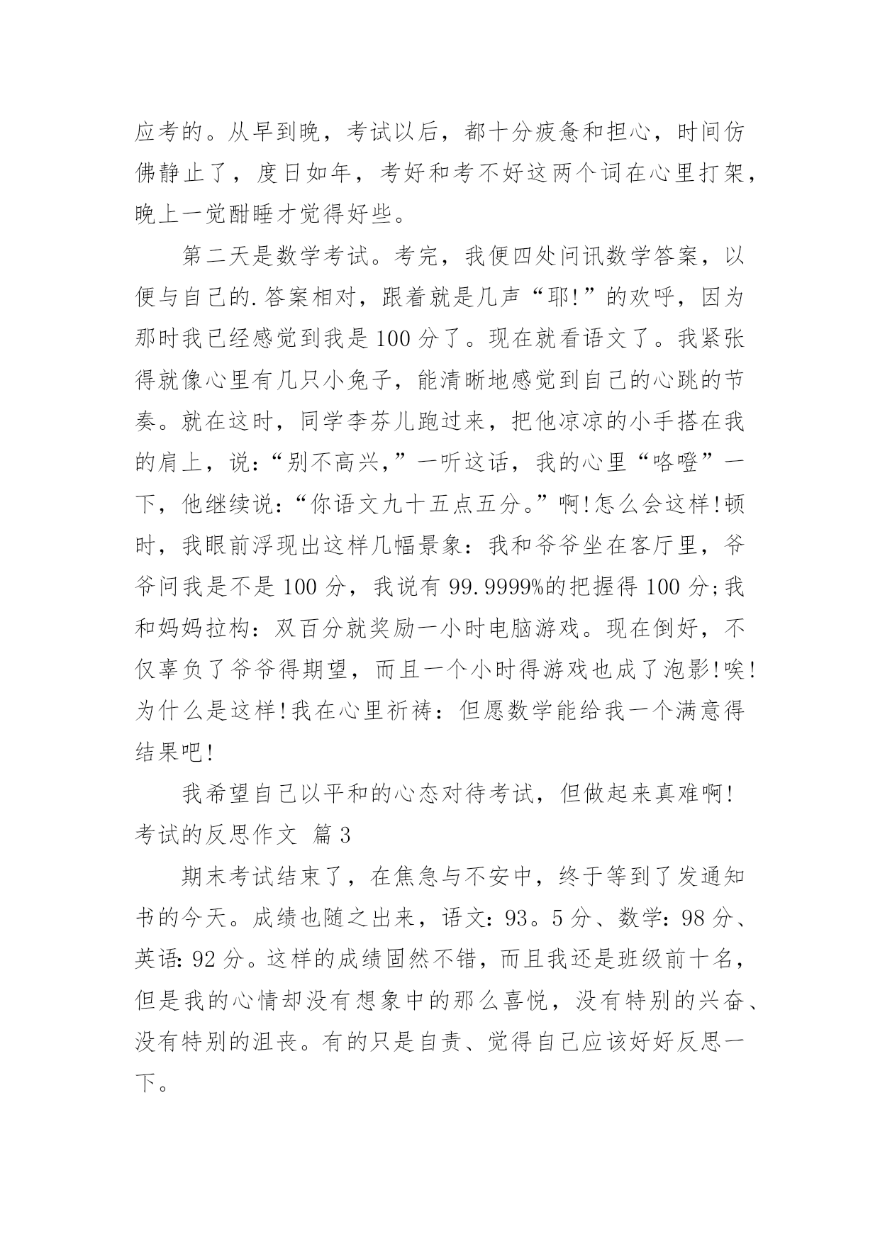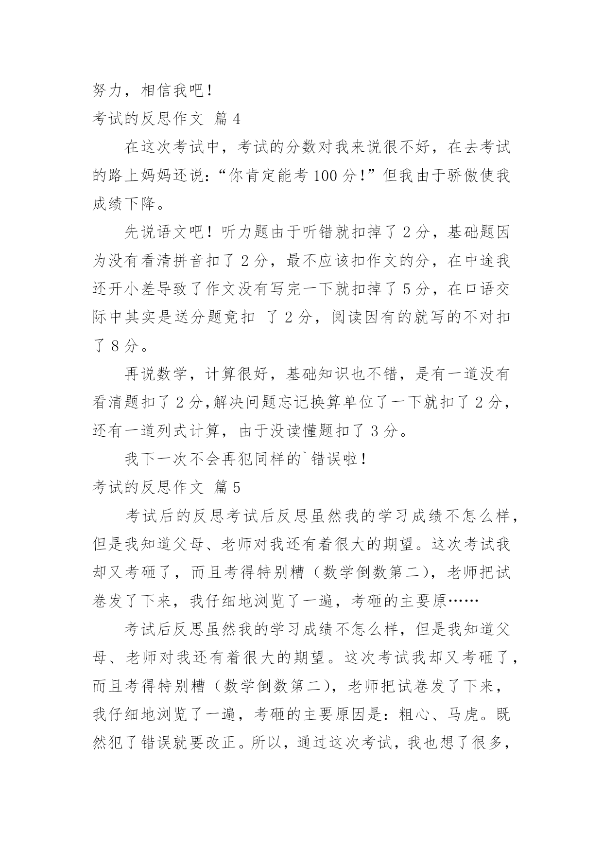 考试的反思作文关于考试的反思作文锦集5篇在日复一日的学习、工作或生活中,大家都写过作文吧,写作文是培养人们的观察力、联想力、想象力、思考力和记忆力的重要手段。那要怎么写好作文呢?下面是小编精心整理的考试的反思作文5篇,仅供参考,希望能够帮助到大家。考试的反思作文篇1期中考试终于结束了,紧张的心情总算放下了。感觉考的'还行。数学最后一道题因为太粗心给做错了,还是平时努力程度不够啊!以后一定要改掉粗心大意的毛病。语文和英语卷子老师还没讲,希望不要出现因粗心而扣分的题。考试的反思作文篇2期中考试和期末考试一样重要,有时还意义非凡。考好了,心里甜滋滋的,随之而来的是老师的赞扬、同学们的羡慕和父母的喜悦;考得不好,老师会失望,父母会生气,还可能会面对同学轻视得眼光和讥讽的话语。以我微薄之见,考好则已,考不好也别灰心,如果上要考虑长辈的夸奖,下要考虑同学的冷嘲热讽,则必败无疑。考好不骄,考差不气馁,以平平和和的心态应考,反而能考好。但是,说到容易,做到却难。就拿这次期中考试来说吧。我是抱着考双百分的信心来应考的。从早到晚,考试以后,都十分疲惫和担心,时间仿佛静止了,度日如年,考好和考不好这两个词在心里打架,晚上一觉酣睡才觉得好些。第二天是数学考试。考完,我便四处问讯数学答案,以便与自己的.答案相对,跟着就是几声“耶!”的欢呼,因为那时我已经感觉到我是100分了。现在就看语文了。我紧张得就像心里有几只小兔子,能清晰地感觉到自己的心跳的节奏。就在这时,同学李芬儿跑过来,把他凉凉的小手搭在我的肩上,说:“别不高兴,”一听这话,我的心里“咯噔”一下,他继续说:“你语文九十五点五分。”啊!怎么会这样!顿时,我眼前浮现出这样几幅景象:我和爷爷坐在客厅里,爷爷问我是不是100分,我说有99.9999%的把握得100分;我和妈妈拉构:双百分就奖励一小时电脑游戏。现在倒好,不仅辜负了爷爷得期望,而且一个小时得游戏也成了泡影!唉!为什么是这样!我在心里祈祷:但愿数学能给我一个满意得结果吧!我希望自己以平和的心态对待考试,但做起来真难啊!考试的反思作文篇3期末考试结束了,在焦急与不安中,终于等到了发通知书的今天。成绩也随之出来,语文:93。5分、数学:98分、英语:92分。这样的成绩固然不错,而且我还是班级前十名,但是我的心情却没有想象中的那么喜悦,没有特别的兴奋、没有特别的沮丧。有的只是自责、觉得自己应该好好反思一下。先说说我的语文吧!我对语文一向很有信心。以往的成绩也都是95分以上。可是这次我却只考了93·5分,所以当我拿到试卷时,就迫不及待的去找出出错的地方。“阅读题扣2分、课外知识扣1分、作文扣2分、课外积累扣1、5分。”哎,这时才觉得自己的课外知识部分有点欠缺,以后要加强这方面的培养i。读读一些历史书籍,再多做一些阅读理解的题目。相信通过一个暑假的突击,我一定会有进步的!再说说我的数学吧!说起数学,这是爸爸妈妈最担心的一项。因为我的老毛病——粗心常常来捣乱,让我在几次的考试中都丢了不该丢的分数。这次考试,我一遍一遍的检查,看是否有错误的题目?可是,有那么一个小小的题目却让我写错了。在“直数轴”这道题中,我少写了一个,又把3。4错写成了4、3。又是粗心惹的祸!为此我的100分变成了98分。以后我一定要彻底改掉这个坏毛病。争取数学拿满分。最后,来说说我的英语吧!英语这次发挥的`不太好,第一是在听力部分,扣掉2分。第二是在判断题,被扣掉了6分。就这样,我原本很有信心的英语却只考了92分。这样也让我知道了自己的弱点在那里?以后要在听力方面加强训练。多听、多看、多读、多背,更不能让骄傲在自己心里扎根。要虚心啊!语数外三科的错误我都找到了,也让我知道自己以后努力的方向。成绩代表着过去,我会在以后的学习生活中更加努力,相信我吧!考试的反思作文篇4在这次考试中,考试的分数对我来说很不好,在去考试的路上妈妈还说:“你肯定能考100分!”但我由于骄傲使我成绩下降。先说语文吧!听力题由于听错就扣掉了2分,基础题因为没有看清拼音扣了2分,最不应该扣作文的分,在中途我还开小差导致了作文没有写完一下就扣掉了5分,在口语交际中其实是送分题竟扣了2分,阅读因有的就写的不对扣了8分。再说数学,计算很好,基础知识也不错,是有一道没有看清题扣了2分,解决问题忘记换算单位了一下就扣了2分,还有一道列式计算,由于没读懂题扣了3分。我下一次不会再犯同样的`错误啦!考试的反思作文篇5考试后的反思考试后反思虽然我的学习成绩不怎么样,但是我知道父母、老师对我还有着很大的期望。这次考试我却又考砸了,而且考得特别糟(数学倒数第二),老师把试卷发了下来,我仔细地浏览了一遍,考砸的主要原……考试后反思虽然我的学习成绩不怎么样,但是我知道父母、老师对我还有着很大的期望。这次考试我却又考砸了,而且考得特别糟