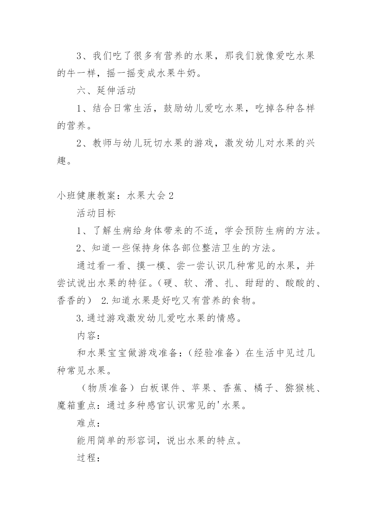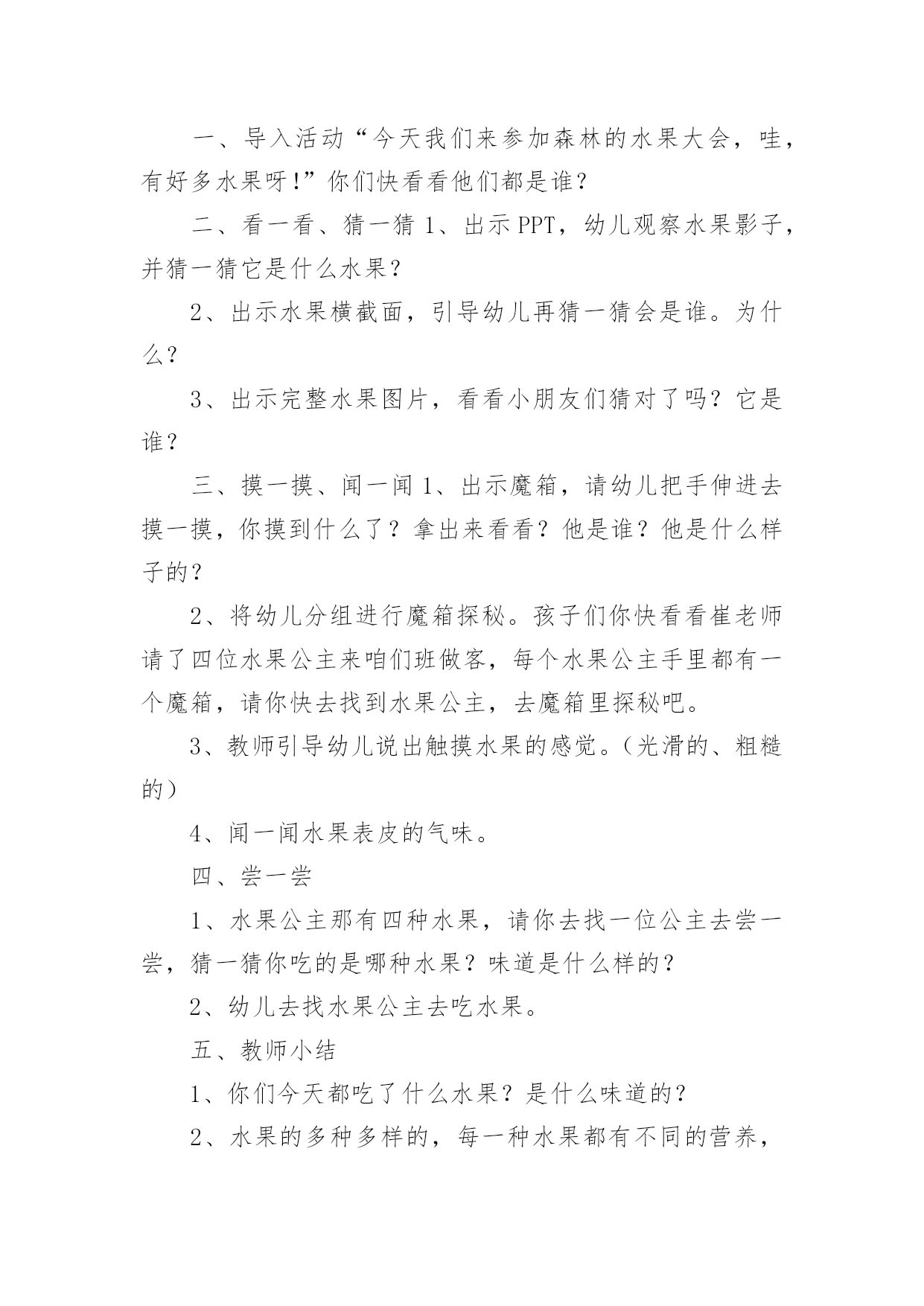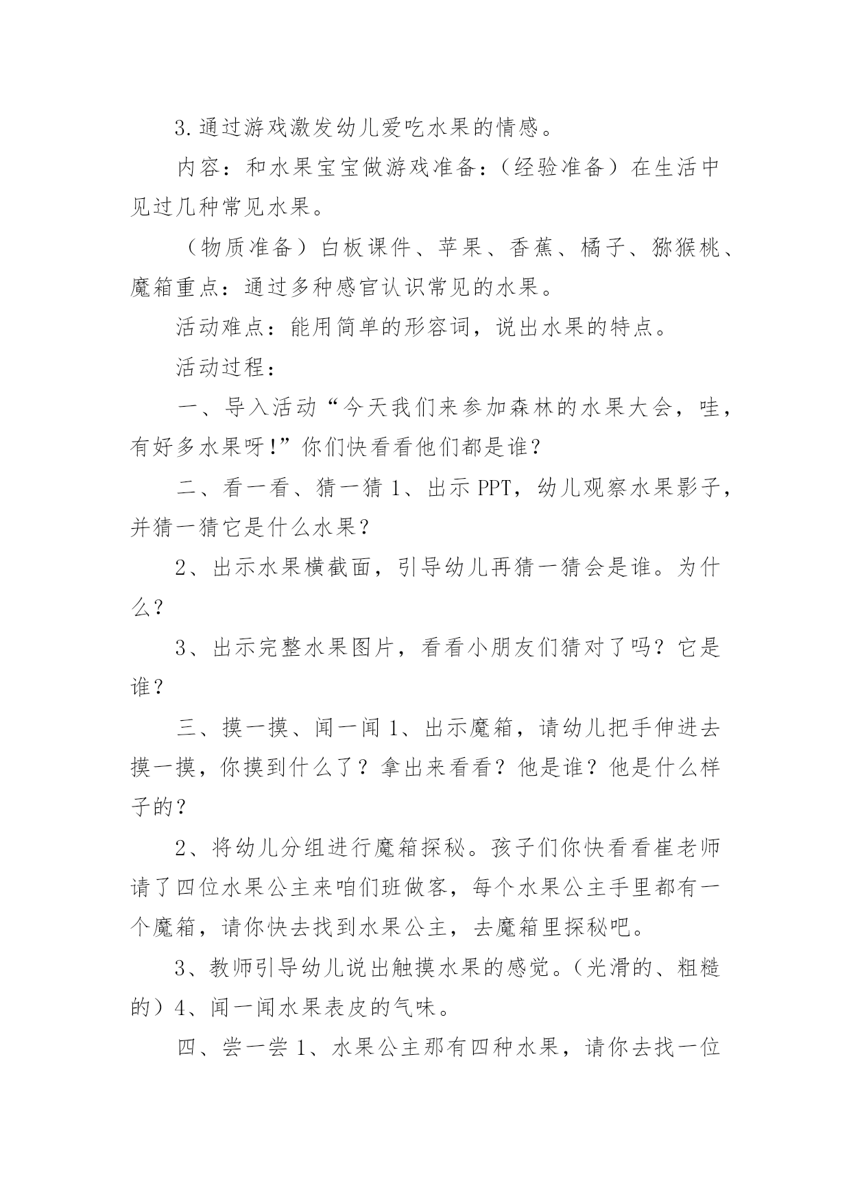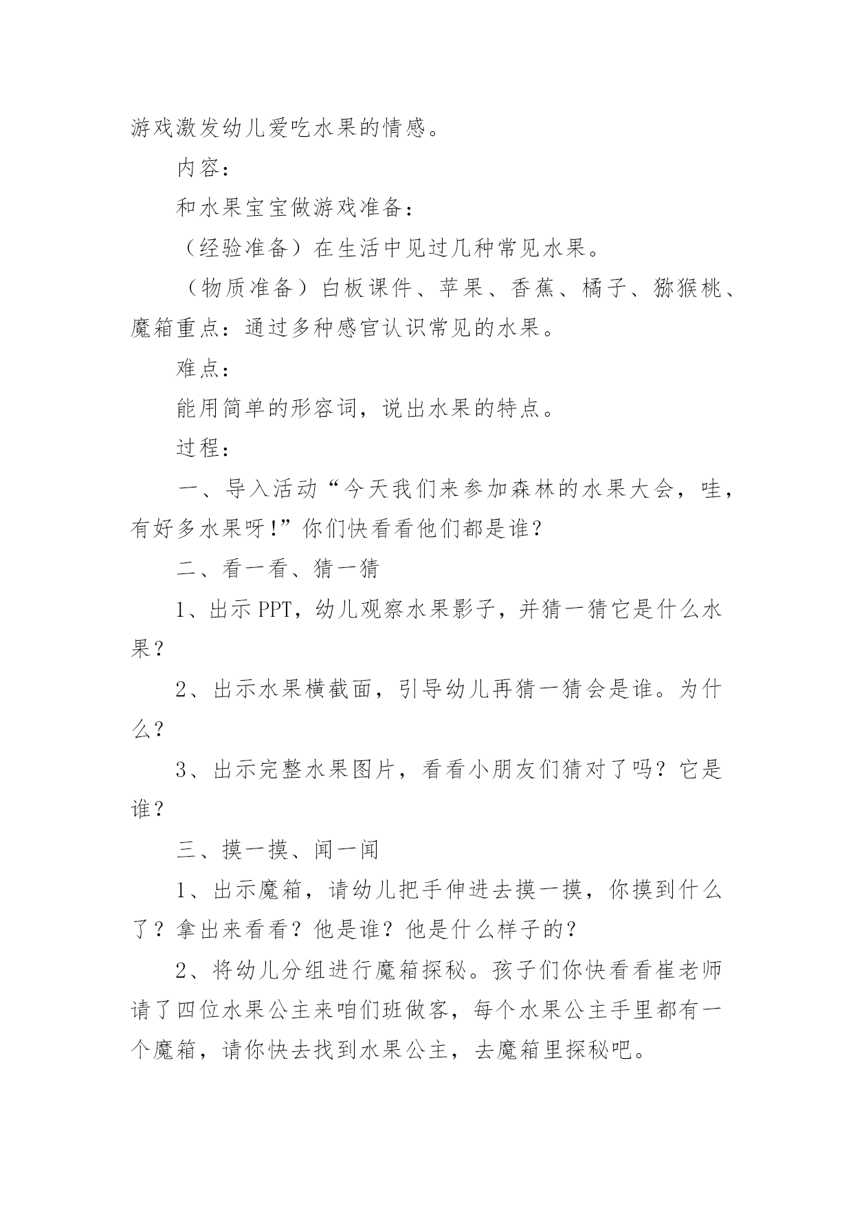 小班健康教案:水果大会作为一名为他人授业解惑的教育工作者,往往需要进行教案编写工作,编写教案助于积累教学经验,不断提高教学质量。那么问题来了,教案应该怎么写?以下是小编为大家收集的小班健康教案:水果大会,仅供参考,欢迎大家阅读。小班健康教案:水果大会1活动目标:1.通过看一看、摸一模、尝一尝认识几种常见的水果,并尝试说出水果的特征。(硬、软、滑、扎、甜甜的、酸酸的、香香的)2.知道水果是好吃又有营养的食物。3.通过游戏激发幼儿爱吃水果的情感。活动内容:和水果宝宝做游戏活动准备:(经验准备)在生活中见过几种常见水果。(物质准备)白板课件、苹果、香蕉、橘子、猕猴桃、魔箱重点:通过多种感官认识常见的水果。活动难点:能用简单的形容词,说出水果的特点。活动过程:一、导入活动“今天我们来参加森林的水果大会,哇,有好多水果呀!”你们快看看他们都是谁?二、看一看、猜一猜1、出示PPT,幼儿观察水果影子,并猜一猜它是什么水果?2、出示水果横截面,引导幼儿再猜一猜会是谁。为什么?3、出示完整水果图片,看看小朋友们猜对了吗?它是谁?三、摸一摸、闻一闻1、出示魔箱,请幼儿把手伸进去摸一摸,你摸到什么了?拿出来看看?他是谁?他是什么样子的?2、将幼儿分组进行魔箱探秘。孩子们你快看看崔老师请了四位水果公主来咱们班做客,每个水果公主手里都有一个魔箱,请你快去找到水果公主,去魔箱里探秘吧。3、教师引导幼儿说出触摸水果的感觉。(光滑的、粗糙的')4、闻一闻水果表皮的气味。四、尝一尝1、水果公主那有四种水果,请你去找一位公主去尝一尝,猜一猜你吃的是哪种水果?味道是什么样的?2、幼儿去找水果公主去吃水果。五、教师1、你们今天都吃了什么水果?是什么味道的?2、水果的多种多样的,每一种水果都有不同的营养,而且味道也不一样,有的酸酸甜甜的,有的香香的,水果是又好吃又有营养的食物。3、我们吃了很多有营养的水果,那我们就像爱吃水果的牛一样,摇一摇变成水果牛奶。六、延伸活动1、结合日常生活,鼓励幼儿爱吃水果,吃掉各种各样的营养。2、教师与幼儿玩切水果的游戏,激发幼儿对水果的兴趣。小班健康教案:水果大会2活动目标1、了解生病给身体带来的不适,学会预防生病的方法。2、知道一些保持身体各部位整洁卫生的方法。通过看一看、摸一模、尝一尝认识几种常见的水果,并尝试说出水果的特征。(硬、软、滑、扎、甜甜的、酸酸的、香香的)2.知道水果是好吃又有营养的食物。3.通过游戏激发幼儿爱吃水果的情感。内容:和水果宝宝做游戏准备:(经验准备)在生活中见过几种常见水果。(物质准备)白板课件、苹果、香蕉、橘子、猕猴桃、魔箱重点:通过多种感官认识常见的'水果。难点:能用简单的形容词,说出水果的特点。过程:一、导入活动“今天我们来参加森林的水果大会,哇,有好多水果呀!”你们快看看他们都是谁?二、看一看、猜一猜1、出示PPT,幼儿观察水果影子,并猜一猜它是什么水果?2、出示水果横截面,引导幼儿再猜一猜会是谁。为什么?3、出示完整水果图片,看看小朋友们猜对了吗?它是谁?三、摸一摸、闻一闻1、出示魔箱,请幼儿把手伸进去摸一摸,你摸到什么了?拿出来看看?他是谁?他是什么样子的?2、将幼儿分组进行魔箱探秘。孩子们你快看看崔老师请了四位水果公主来咱们班做客,每个水果公主手里都有一个魔箱,请你快去找到水果公主,去魔箱里探秘吧。3、教师引导幼儿说出触摸水果的感觉。(光滑的、粗糙的)4、闻一闻水果表皮的气味。四、尝一尝1、水果公主那有四种水果,请你去找一位公主去尝一尝,猜一猜你吃的是哪种水果?味道是什么样的?2、幼儿去找水果公主去吃水果。五、教师小结1、你们今天都吃了什么水果?是什么味道的?2、水果的多种多样的,每一种水果都有不同的营养,而且味道也不一样,有的酸酸甜甜的,有的香香的,水果是又好吃又有营养的食物。3、我们吃了很多有营养的水果,那我们就像爱吃水果的牛一样,摇一摇变成水果牛奶。六、延伸活动1、结合日常生活,鼓励幼儿爱吃水果,吃掉各种各样的营养。2、教师与幼儿玩切水果的游戏,激发幼儿对水果的兴趣。教学反思:讲授法、提问法刺激听觉感官,示范法、观看法刺激视觉感官,练习法、游戏法综合刺激各种感官……因此,教学方式的成败与否,关键是看能否发挥出它应有的刺激性。教师要不断锤炼自身的刺激能力,如独具特色的肢体动作,极富渲染的表情神态,变化多端的语言声调等,这是实现教学方式刺激性的基础。因此优秀的教师应该时刻关注孩子的肢体、眼睛、嘴巴,了解孩子的内心状态,及时调整自己的教学方式。小班健康教案:水果大会3目标:1.通过看一看、摸一模、尝一尝认识几种常见的水果,并尝试说出水果的特征。(硬、软、滑、扎、甜甜的、酸酸的、香香的)2.知道水果是好吃又有营养的食物。3.通过游戏激发幼儿爱吃水果的情感。内容:和水果宝宝做游戏准备:(经验准备