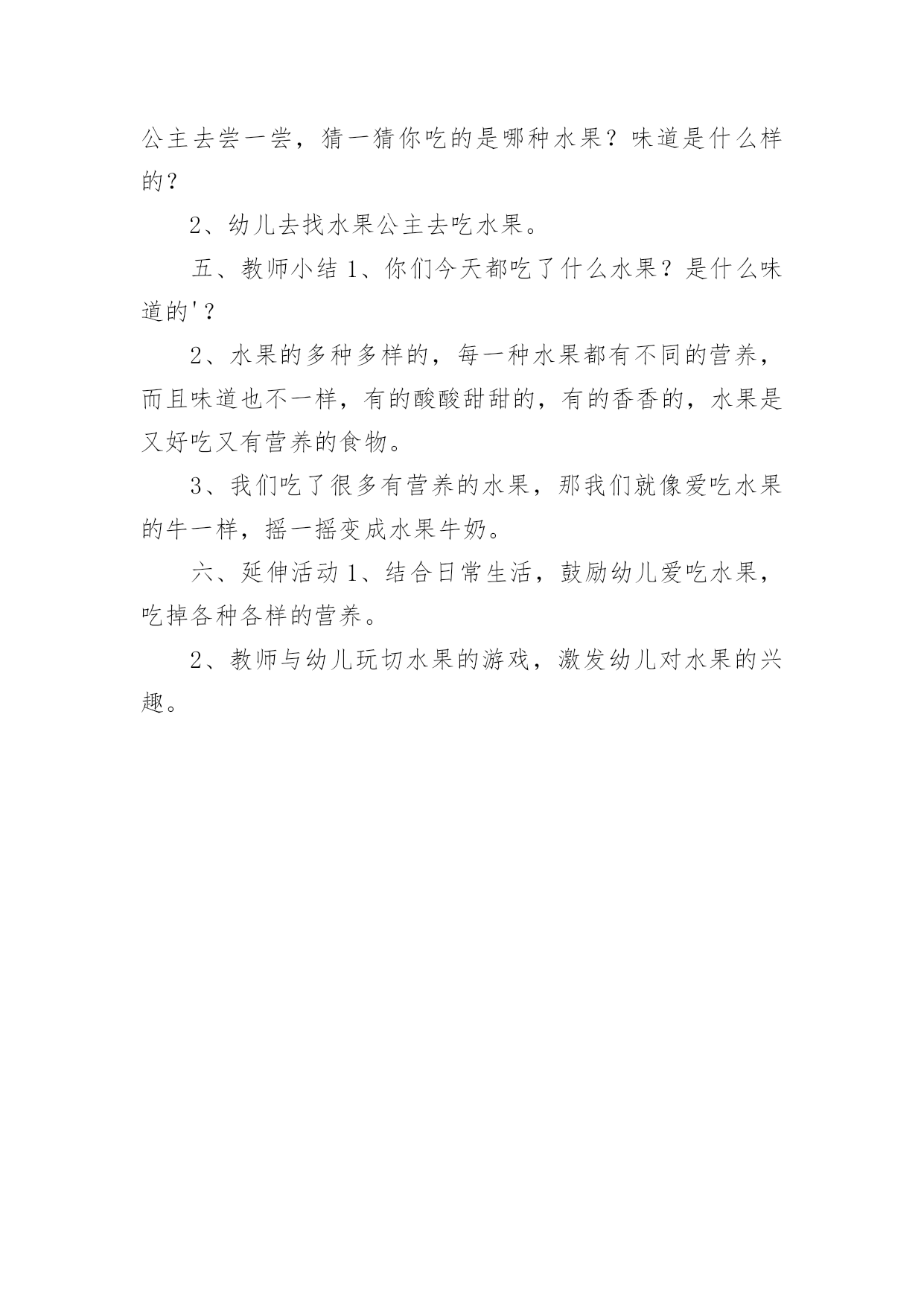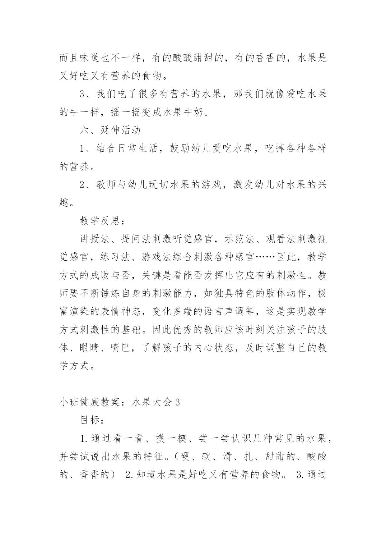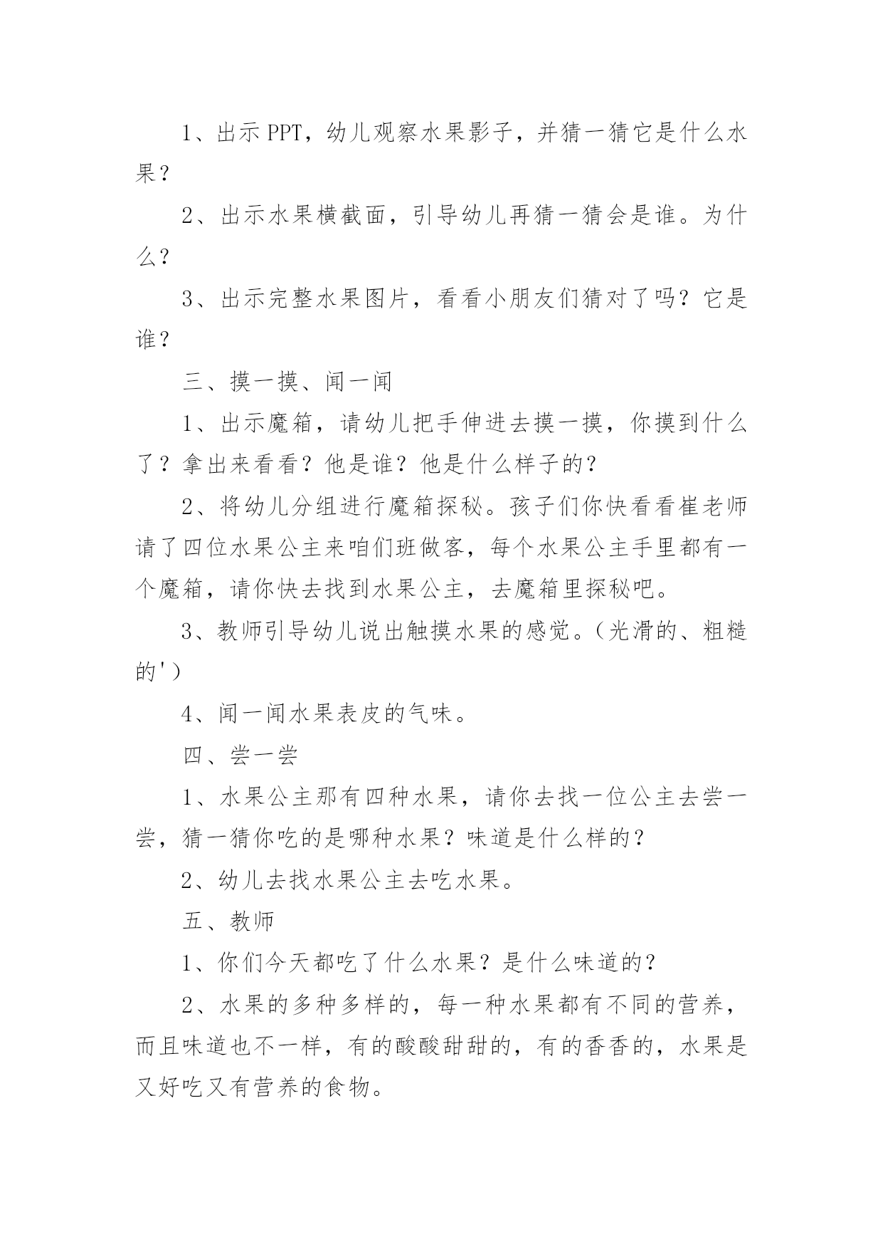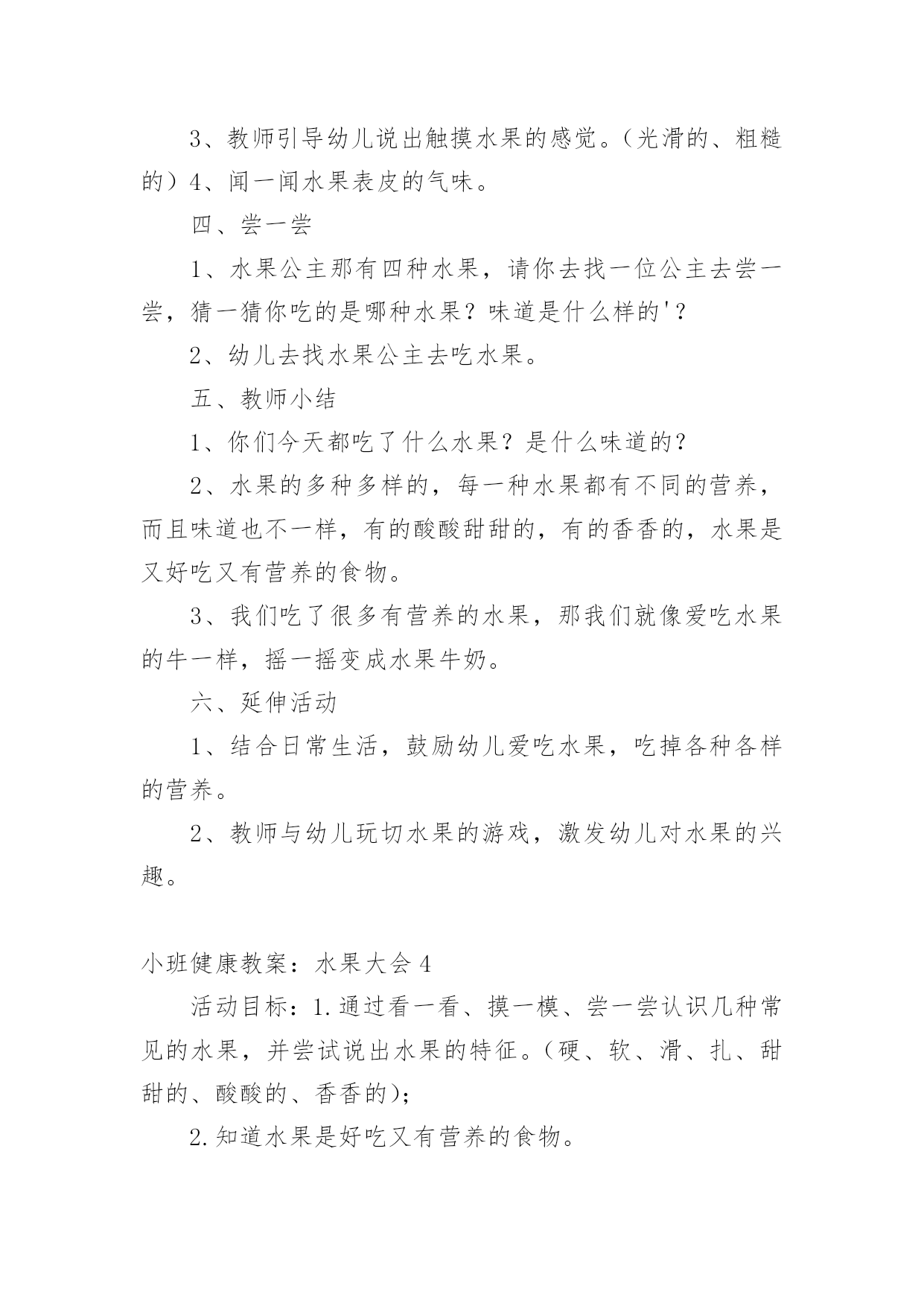 小班健康教案:水果大会作为一名为他人授业解惑的教育工作者,往往需要进行教案编写工作,编写教案助于积累教学经验,不断提高教学质量。那么问题来了,教案应该怎么写?以下是小编为大家收集的小班健康教案:水果大会,仅供参考,欢迎大家阅读。小班健康教案:水果大会1活动目标:1.通过看一看、摸一模、尝一尝认识几种常见的水果,并尝试说出水果的特征。(硬、软、滑、扎、甜甜的、酸酸的、香香的)2.知道水果是好吃又有营养的食物。3.通过游戏激发幼儿爱吃水果的情感。活动内容:和水果宝宝做游戏活动准备:(经验准备)在生活中见过几种常见水果。(物质准备)白板课件、苹果、香蕉、橘子、猕猴桃、魔箱重点:通过多种感官认识常见的水果。活动难点:能用简单的形容词,说出水果的特点。活动过程:一、导入活动“今天我们来参加森林的水果大会,哇,有好多水果呀!”你们快看看他们都是谁?二、看一看、猜一猜1、出示PPT,幼儿观察水果影子,并猜一猜它是什么水果?2、出示水果横截面,引导幼儿再猜一猜会是谁。为什么?3、出示完整水果图片,看看小朋友们猜对了吗?它是谁?三、摸一摸、闻一闻1、出示魔箱,请幼儿把手伸进去摸一摸,你摸到什么了?拿出来看看?他是谁?他是什么样子的?2、将幼儿分组进行魔箱探秘。孩子们你快看看崔老师请了四位水果公主来咱们班做客,每个水果公主手里都有一个魔箱,请你快去找到水果公主,去魔箱里探秘吧。3、教师引导幼儿说出触摸水果的感觉。(光滑的、粗糙的')4、闻一闻水果表皮的气味。四、尝一尝1、水果公主那有四种水果,请你去找一位公主去尝一尝,猜一猜你吃的是哪种水果?味道是什么样的?2、幼儿去找水果公主去吃水果。五、教师1、你们今天都吃了什么水果?是什么味道的?2、水果的多种多样的,每一种水果都有不同的营养,而且味道也不一样,有的酸酸甜甜的,有的香香的,水果是又好吃又有营养的食物。3、我们吃了很多有营养的水果,那我们就像爱吃水果的牛一样,摇一摇变成水果牛奶。六、延伸活动1、结合日常生活,鼓励幼儿爱吃水果,吃掉各种各样的营养。2、教师与幼儿玩切水果的游戏,激发幼儿对水果的兴趣。小班健康教案:水果大会2活动目标1、了解生病给身体带来的不适,学会预防生病的方法。2、知道一些保持身体各部位整洁卫生的方法。通过看一看、摸一模、尝一尝认识几种常见的水果,并尝试说出水果的特征。(硬、软、滑、扎、甜甜的、酸酸的、香香的)2.知道水果是好吃又有营养的食物。3.通过游戏激发幼儿爱吃水果的情感。内容:和水果宝宝做游戏准备:(经验准备)在生活中见过几种常见水果。(物质准备)白板课件、苹果、香蕉、橘子、猕猴桃、魔箱重点:通过多种感官认识常见的'水果。难点:能用简单的形容词,说出水果的特点。过程:一、导入活动“今天我们来参加森林的水果大会,哇,有好多水果呀!”你们快看看他们都是谁?二、看一看、猜一猜1、出示PPT,幼儿观察水果影子,并猜一猜它是什么水果?2、出示水果横截面,引导幼儿再猜一猜会是谁。为什么?3、出示完整水果图片,看看小朋友们猜对了吗?它是谁?三、摸一摸、闻一闻1、出示魔箱,请幼儿把手伸进去摸一摸,你摸到什么了?拿出来看看?他是谁?他是什么样子的?2、将幼儿分组进行魔箱探秘。孩子们你快看看崔老师请了四位水果公主来咱们班做客,每个水果公主手里都有一个魔箱,请你快去找到水果公主,去魔箱里探秘吧。3、教师引导幼儿说出触摸水果的感觉。(光滑的、粗糙的)4、闻一闻水果表皮的气味。四、尝一尝1、水果公主那有四种水果,请你去找一位公主去尝一尝,猜一猜你吃的是哪种水果?味道是什么样的?2、幼儿去找水果公主去吃水果。五、教师小结1、你们今天都吃了什么水果?是什么味道的?2、水果的多种多样的,每一种水果都有不同的营养,而且味道也不一样,有的酸酸甜甜的,有的香香的,水果是又好吃又有营养的食物。3、我们吃了很多有营养的水果,那我们就像爱吃水果的牛一样,摇一摇变成水果牛奶。六、延伸活动1、结合日常生活,鼓励幼儿爱吃水果,吃掉各种各样的营养。2、教师与幼儿玩切水果的游戏,激发幼儿对水果的兴趣。教学反思:讲授法、提问法刺激听觉感官,示范法、观看法刺激视觉感官,练习法、游戏法综合刺激各种感官……因此,教学方式的成败与否,关键是看能否发挥出它应有的刺激性。教师要不断锤炼自身的刺激能力,如独具特色的肢体动作,极富渲染的表情神态,变化多端的语言声调等,这是实现教学方式刺激性的基础。因此优秀的教师应该时刻关注孩子的肢体、眼睛、嘴巴,了解孩子的内心状态,及时调整自己的教学方式。小班健康教案:水果大会3目标:1.通过看一看、摸一模、尝一尝认识几种常见的水果,并尝试说出水果的特征。(硬、软、滑、扎、甜甜的、酸酸的、香香的)2.知道水果是好吃又有营养的食物。3.通过游戏激发幼儿爱吃水果的情感。内容:和水果宝宝做游戏准备:(经验准备