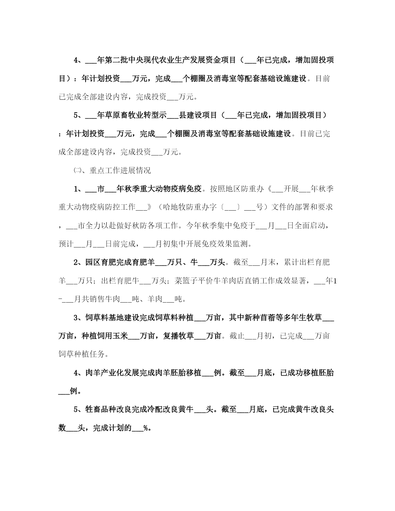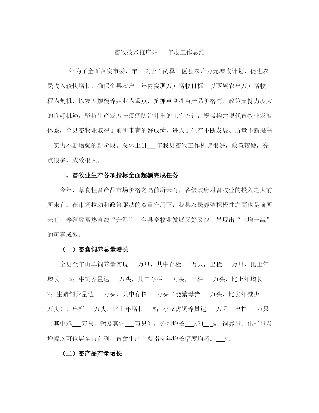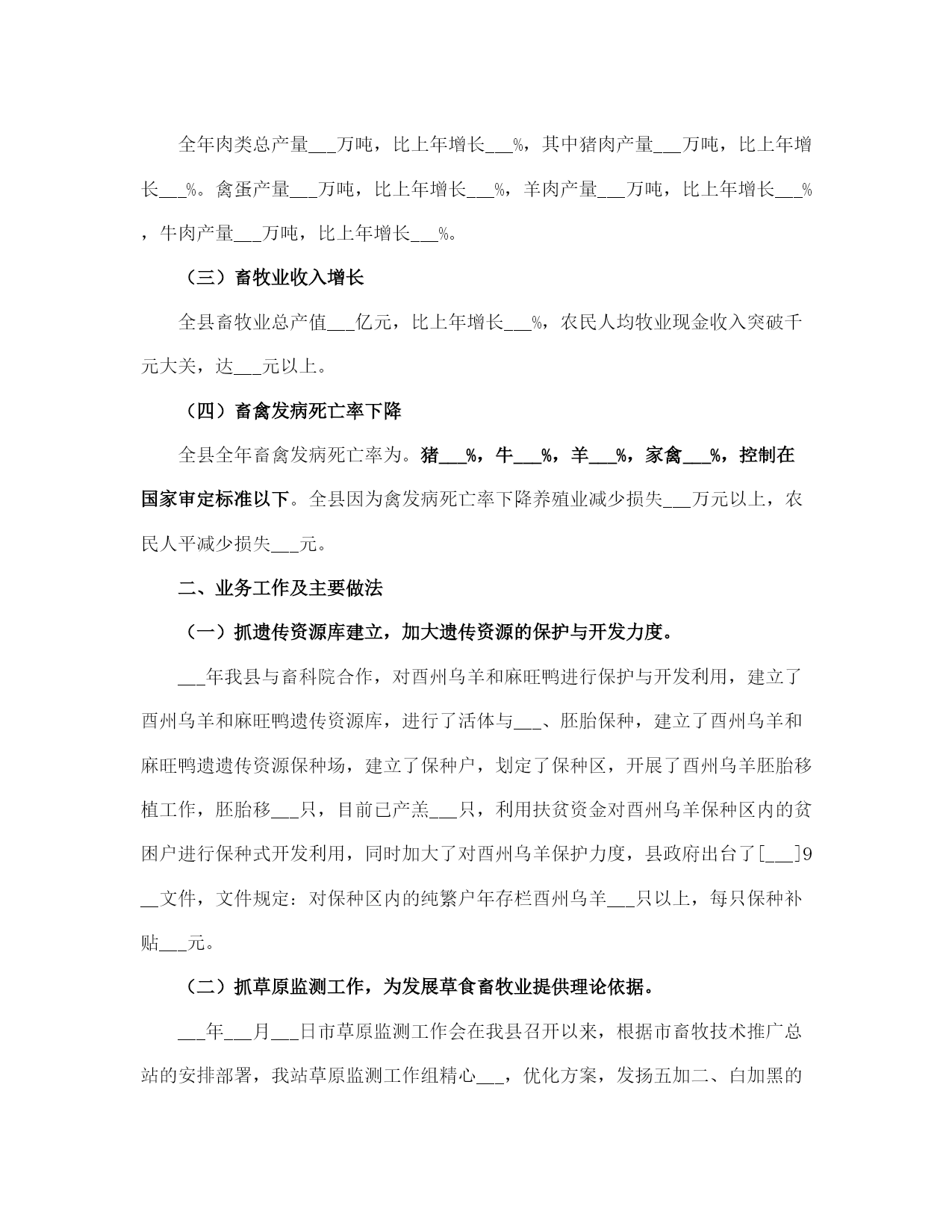 畜牧技术推广站年度工作总结(完整版)文档资料可直接使用,可编辑,欢迎下载畜牧技术推广站___年度工作总结___年为了全面落实市委、市__关于“两翼”区县农户万元增收计划,促进农民收入较快增长,确保全县农户三年内实现万元增收目标,以两翼农户万元增收工程为契机,以发展规模养殖业为重点,抢抓草食牲畜产品价格高、政策支持力度大的良好机遇,坚持生产发展与疫病防治并重的工作方针,积极构建现代畜牧业发展体系,全县畜牧业取得了前所未有的好成绩,进入了生产不断发展、质量不断提高、实力不断增强的新阶段。总体上讲___年我县畜牧工作机遇很好,政策较硬,亮点很多,成效很大。一、畜牧业生产各项指标全面超额完成任务今年,草食牲畜产品市场价格之高前所未有,各级政府对畜牧业的投入之大前所未有。在市场拉动和政策驱动的双重作用下,我县农民养殖积极性之高也是前所未有,养殖致富热直线“升温”,全县畜牧业发展又好又快,呈现出“三增一减”的可喜成效。(一)畜禽饲养总量增长全县全年山羊饲养量实现___万只,其中存栏___万只,出栏___万只,比上年增长___%;牛饲养量达___万头,其中存栏___万头,出栏___万头,比上年增长___%;生猪饲养量达___万头,其中存栏___万头(能繁母猪___万头,比去年减少___万头),出栏___万头,比上年增长___%;小家禽饲养量达___万只,出栏___万只(其中鸡___万只,鸭及其它___万只),分别增长___%和___%;饲养量、出栏量及增幅均可位居全市前列,畜禽生产主要指标年增长幅度均超过___%。(二)畜产品产量增长全年肉类总产量___万吨,比上年增长___%,其中猪肉产量___万吨,比上年增长___%。禽蛋产量___万吨,比上年增长___%,羊肉产量___万吨,比上年增长___%,牛肉产量___万吨,比上年增长___%。(三)畜牧业收入增长全县畜牧业总产值___亿元,比上年增长___%,农民人均牧业现金收入突破千元大关,达___元以上。(四)畜禽发病死亡率下降全县全年畜禽发病死亡率为。猪___%,牛___%,羊___%,家禽___%,控制在国家审定标准以下。全县因为禽发病死亡率下降养殖业减少损失___万元以上,农民人平减少损失___元。二、业务工作及主要做法(一)抓遗传资源库建立,加大遗传资源的保护与开发力度。___年我县与畜科院合作,对酉州乌羊和麻旺鸭进行保护与开发利用,建立了酉州乌羊和麻旺鸭遗传资源库,进行了活体与___、胚胎保种,建立了酉州乌羊和麻旺鸭遗遗传资源保种场,建立了保种户,划定了保种区,开展了酉州乌羊胚胎移植工作,胚胎移___只,目前已产羔___只,利用扶贫资金对酉州乌羊保种区内的贫困户进行保种式开发利用,同时加大了对酉州乌羊保护力度,县政府出台了[___]9__文件,文件规定:对保种区内的纯繁户年存栏酉州乌羊___只以上,每只保种补贴___元。(二)抓草原监测工作,为发展草食畜牧业提供理论依据。___年___月___日市草原监测工作会在我县召开以来,根据市畜牧技术推广总站的安排部署,我站草原监测工作组精心___,优化方案,发扬五加二、白加黑的精神,圆满完成了草原监测工作任务。监测组起早摸黑野外调查___天,徒步行程数百公里,拍摄照片___多张,监测了暖性草丛草地和暖性灌草丛草地两大类草地,共完成了___个样地草原地面监测、草原生态环境调查、___个养殖农户入户调查、___个牧草信息调查、___个草原类型信息调查工作任务,调查数据经市级主管部门审核合格。监测结果全县草原主要分布在海拔___米至___米之间,我县草原生态状况良好,多数得到合理利用或轻度利用,少数未利用,个别轻度超载。草原平均鲜草产量(不计再生草)为___公斤/公顷,风干重为___公斤/公顷,全县总鲜草产量估算达___万吨(全县可利用草地面积为___万公顷),干草可达___万吨。加之我县饲料作物(红苕藤、蔬菜等)年产量约___万吨,再加上农作物秸秆、林木果叶饲料等,全县理论载畜量约为___万个牛单位。(三)抓规模化养殖,促进畜牧业上档提速。在农村千家万户养殖量持续下降这一不可逆转的形势下,大力发展规模养殖业,才是壮大畜牧产业的根本出路。我们紧紧围绕“养殖抓规模”这一___,方向性课题,切实加强技术指导和产业服务,突破性建设高标准、高起点的规模化养殖小区(场),扶持发展中小规模养殖场(大户),全县规模化养殖程度进一步提高,传统型的养殖格局已经彻底打破,逐步朝向建立现代化畜牧业发展体系。全县新建规模化养殖小区(场)___个,其中山羊养殖小区(场)___个,养猪小区(场)___个,养牛小区(场)___个,新建各类适度规模养殖户___户,规模化养殖饲养量占全县养殖总量的___%,极大促进了规模养殖业迅猛发展,促