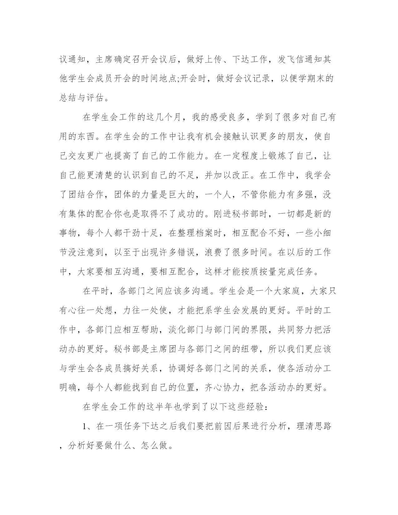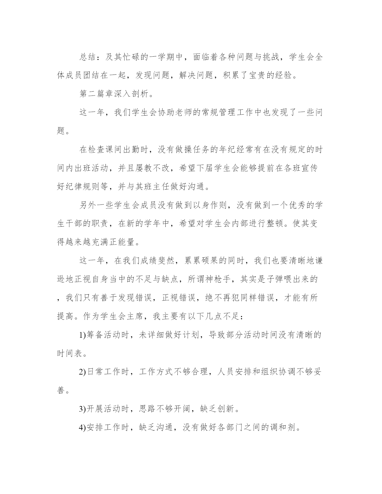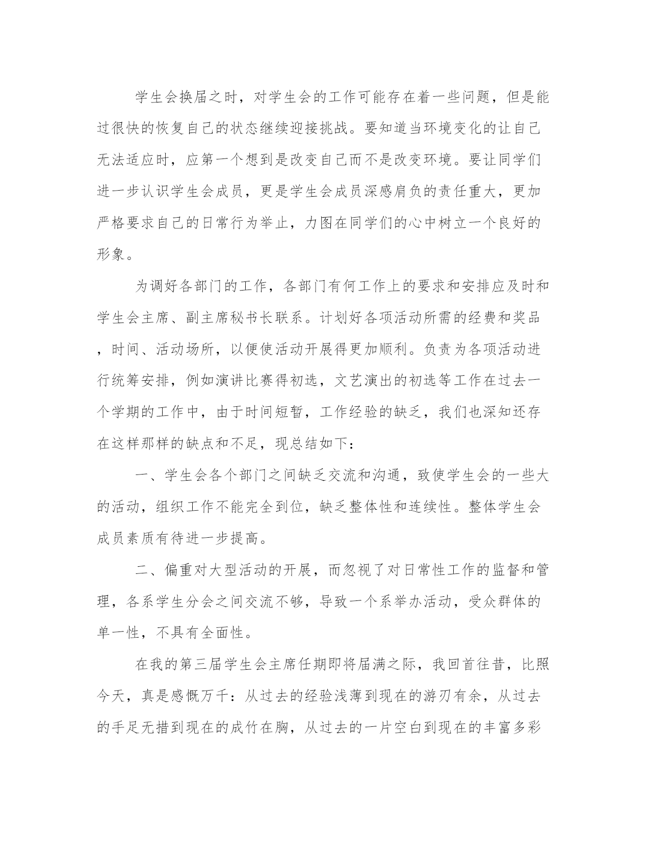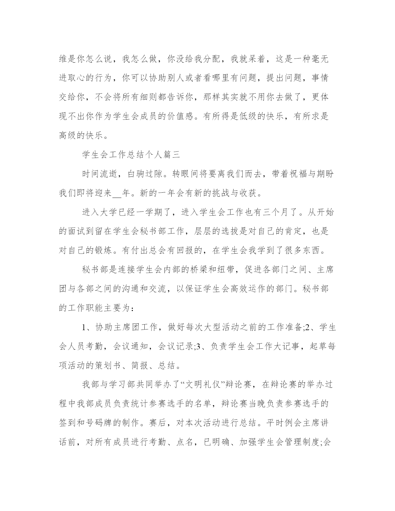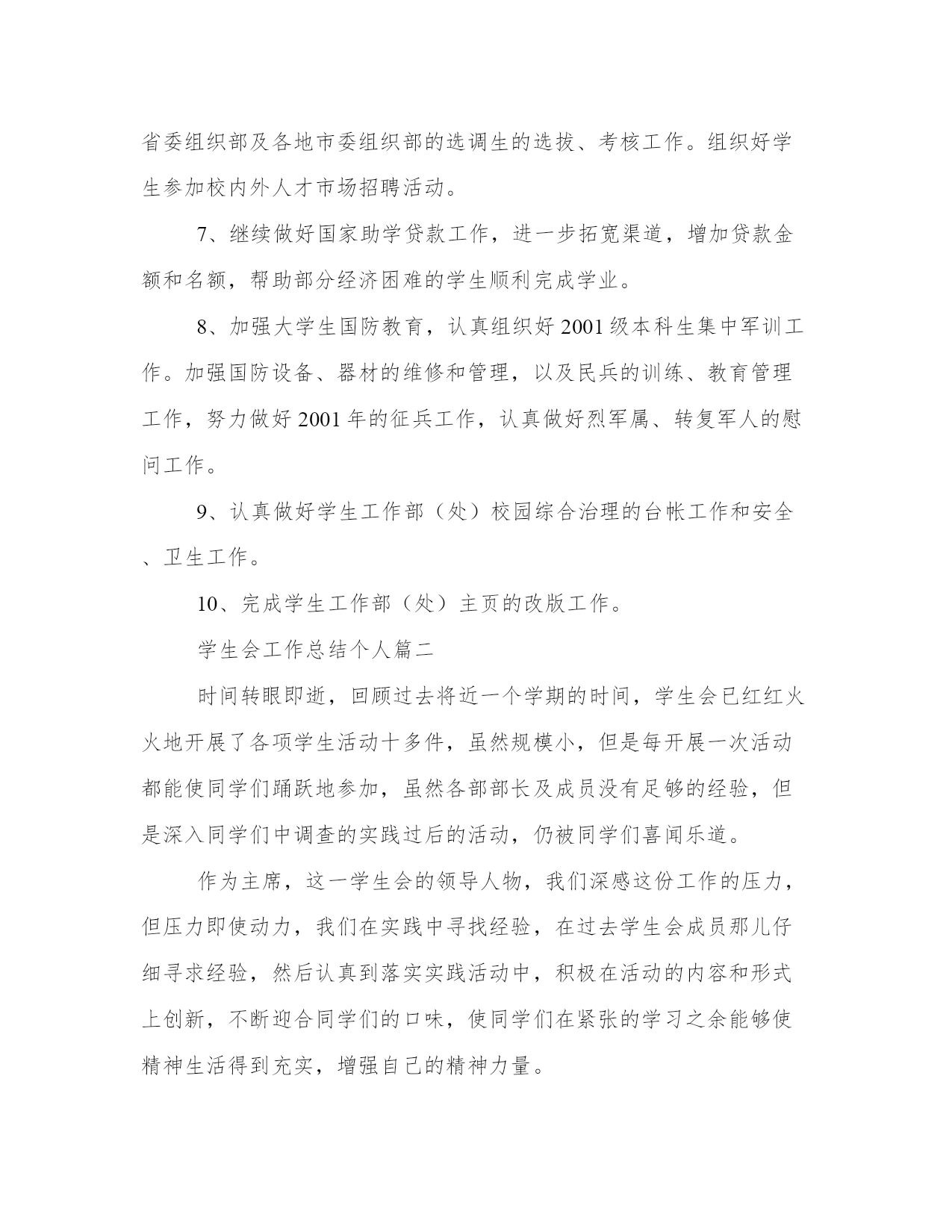最新学生会工作总结个人学生会工作总结工作总结(精选14篇)总结的选材不能求全贪多、主次不分,要根据实际情况和总结的目的,把那些既能显示本单位、本地区特点,又有一定普遍性的材料作为重点选用,写得详细、具体。总结怎么写才能发挥它最大的作用呢?下面是小编带来的优秀总结范文,希望大家能够喜欢!学生会工作总结个人篇一学生工作部(处)本学期学生工作部(处)的总体思路是:以邓小平理论、江泽民同志“七一”讲话和江泽民同志在清华大学建校九十周年大会上的讲话精神为指导思想,深刻理解马克思主义与时俱进的理论品质,加强政治理论学习和科技文化知识学习,加强自身建设,增强服务意识,提高工作效率,提高工作质量,努力工作,自加压力,注重学生工作的前瞻性,理清思路,明确方向,使我校学生工作在现有的基础上上新的水平和层次,进一步扩大在全省乃至全国的影响。1、深入实际调查分析,分析新情况,思考新问题,探讨新思路。深入院系学生中了解工作,了解学生思想动态,有针对性地开展工作。进一步抓好学生骨干队伍建设,发挥其骨干作用。开拓思想政治工作?"基地“的内容、方法和手段,进一步发挥思想政治工作的功能。2、在完成2001年招生任务的同时,认真做好2001招生工作的`总结工作,为下年度的各类招生计划做好准备工作。拟订2002年全日制本专科招生计划。加强招生政策调研,草拟若干争取优秀考生的政策措施。落实2002年艺术类专业的设点考试工作。3、认真做好2001-2002学年度开学的各项准备工作,组织新生班主任培训。做好2001级本科新生的入学教育和新生军训工作。加强院系心理咨询队伍建设,做好部分院系建立学生心理健康档案工作。4、认真做好院系学生工作考评方案的修改工作,尽快出台新的考评方案,进一步加大学生创新工作导向力度,提高院系学生工作的积极性、主动性和创造性,不断提高学生综合素质。完善和改进院系学生工作综合考评有关工作。5、进一步完善和修订学生管理条例,建立有关学生资料信息库。认真做好学生经费管理工作,重点搞好新生特困生的调查、登记工作及在校贫困生的临时补助、学费减免工作和助学金的评定、发放工作。进一步加强校内外勤工助学活动的指导和管理。6、围绕提高”一次就业率“,加强就业基础工作,调整就业思路,拓宽就业渠道,加强就业宣传,组织为院系安装毕业生就业管理系统以及操作人员培训工作。认真做好2002年毕业生生源情况的审核及上报工作。和院系一起进一步加大就业工作指导的力度,创造性地开展就业指导工作。认真做好2002年优秀毕业生的初评工作。认真做好省委组织部及各地市委组织部的选调生的选拔、考核工作。组织好学生参加校内外人才市场招聘活动。7、继续做好国家助学贷款工作,进一步拓宽渠道,增加贷款金额和名额,帮助部分经济困难的学生顺利完成学业。8、加强大学生国防教育,认真组织好2001级本科生集中军训工作。加强国防设备、器材的维修和管理,以及民兵的训练、教育管理工作,努力做好2001年的征兵工作,认真做好烈军属、转复军人的慰问工作。9、认真做好学生工作部(处)校园综合治理的台帐工作和安全、卫生工作。10、完成学生工作部(处)主页的改版工作。学生会工作总结个人篇二时间转眼即逝,回顾过去将近一个学期的时间,学生会已红红火火地开展了各项学生活动十多件,虽然规模小,但是每开展一次活动都能使同学们踊跃地参加,虽然各部部长及成员没有足够的经验,但是深入同学们中调查的实践过后的活动,仍被同学们喜闻乐道。作为主席,这一学生会的领导人物,我们深感这份工作的压力,但压力即使动力,我们在实践中寻找经验,在过去学生会成员那儿仔细寻求经验,然后认真到落实实践活动中,积极在活动的内容和形式上创新,不断迎合同学们的口味,使同学们在紧张的学习之余能够使精神生活得到充实,增强自己的精神力量。学生会换届之时,对学生会的工作可能存在着一些问题,但是能过很快的恢复自己的状态继续迎接挑战。要知道当环境变化的让自己无法适应时,应第一个想到是改变自己而不是改变环境。要让同学们进一步认识学生会成员,更是学生会成员深感肩负的责任重大,更加严格要求自己的日常行为举止,力图在同学们的心中树立一个良好的形象。为调好各部门的工作,各部门有何工作上的要求和安排应及时和学生会主席、副主席秘书长联系。计划好各项活动所需的经费和奖品,时间、活动场所,以便使活动开展得更加顺利。负责为各项活动进行统筹安排,例如演讲比赛得初选,文艺演出的初选等工作在过去一个学期的工作中,由于时间短暂,工作经验的缺乏,我们也深知还存在这样那样的缺点和不足,现总结如下:一、学生会各个部门之间缺乏交流和沟通,致使学生会的一些大的活动,组织工作不能完全到位,缺乏整体性和连续性。整体学生会成员素质有待进一步提高。二、偏重对大型活动的开展,而忽视了对日常
