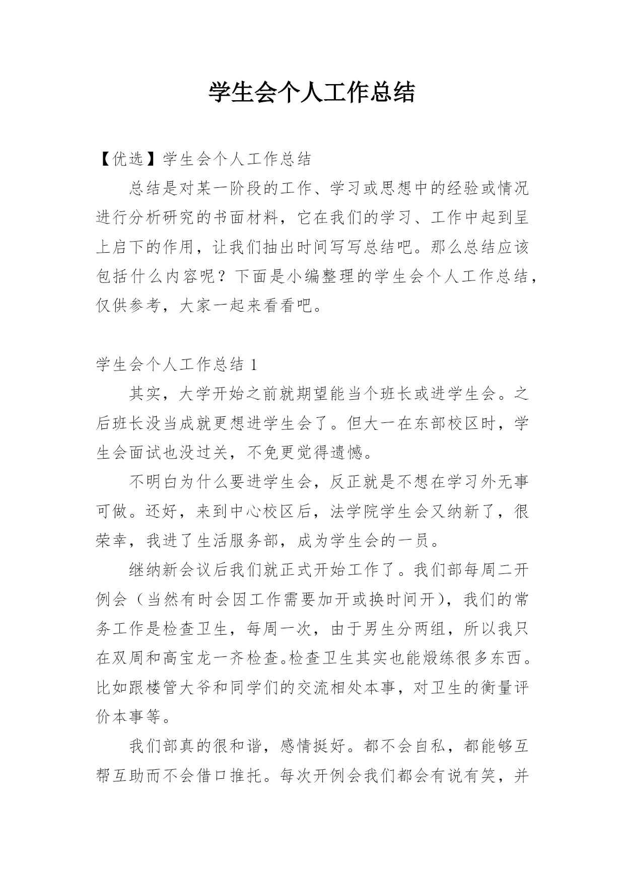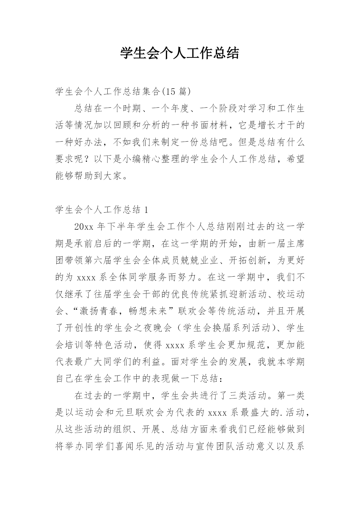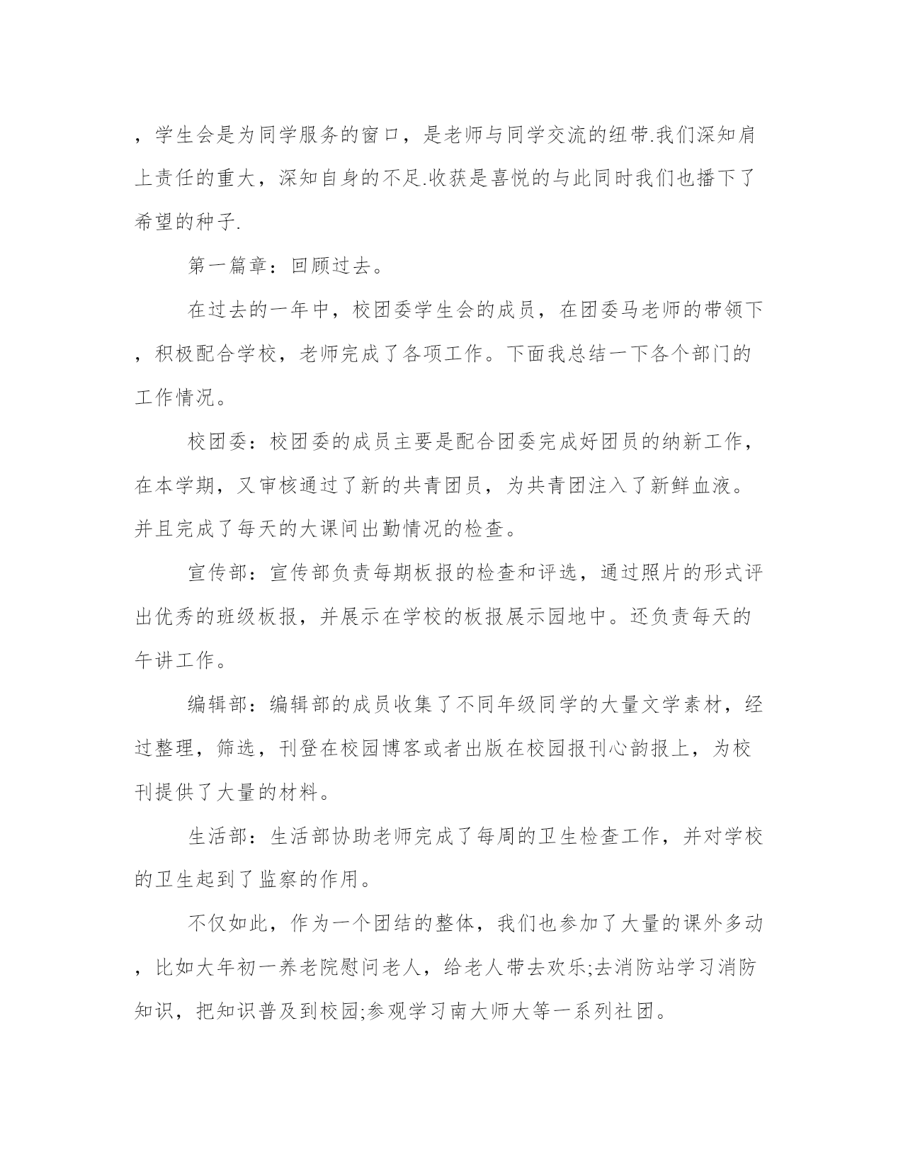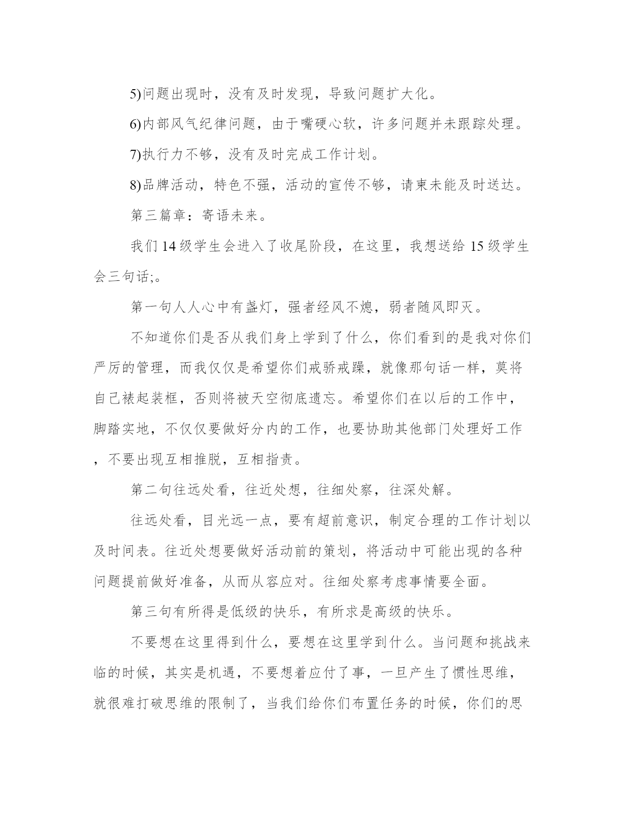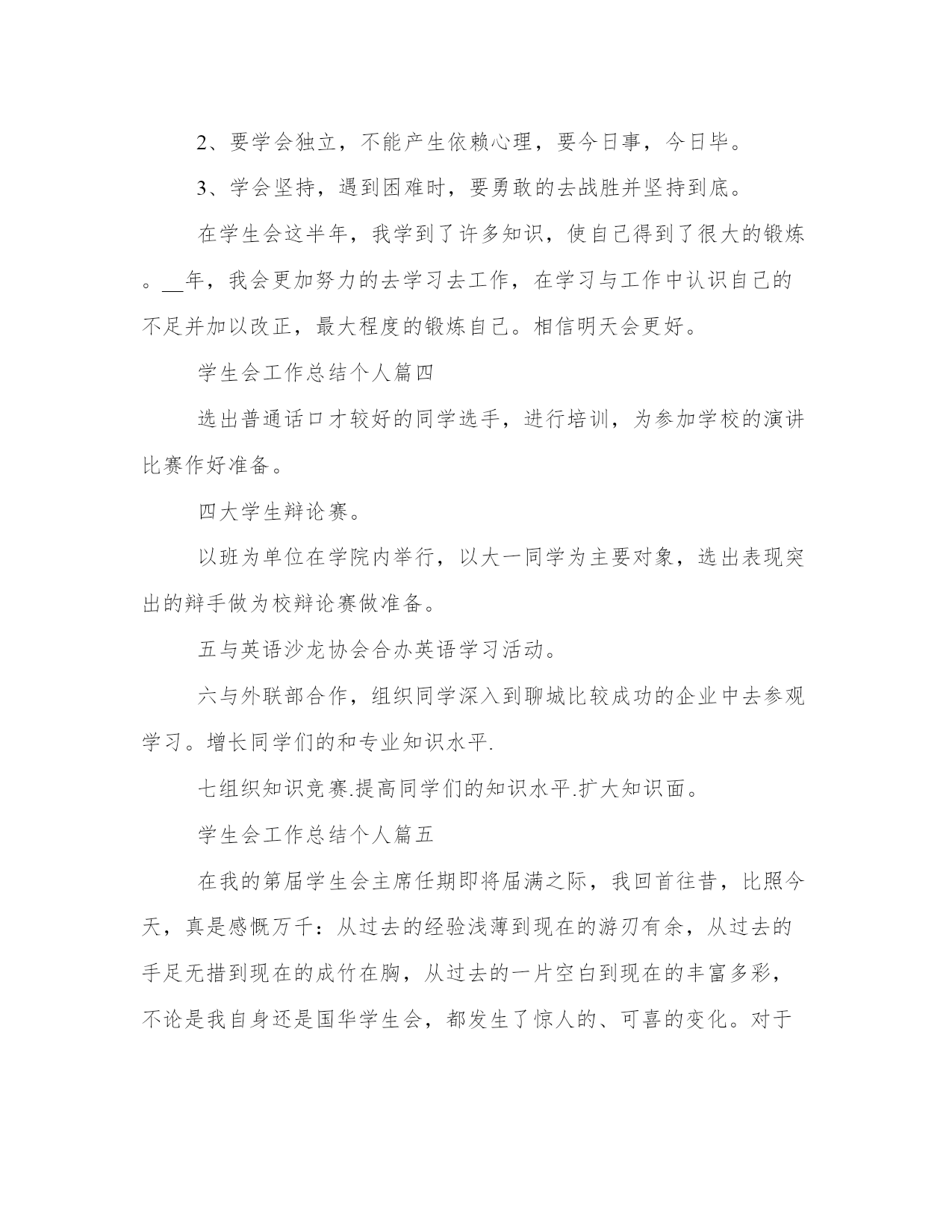 最新学生会工作总结个人学生会工作总结工作总结(精选14篇)总结的选材不能求全贪多、主次不分,要根据实际情况和总结的目的,把那些既能显示本单位、本地区特点,又有一定普遍性的材料作为重点选用,写得详细、具体。总结怎么写才能发挥它最大的作用呢?下面是小编带来的优秀总结范文,希望大家能够喜欢!学生会工作总结个人篇一学生工作部(处)本学期学生工作部(处)的总体思路是:以邓小平理论、江泽民同志“七一”讲话和江泽民同志在清华大学建校九十周年大会上的讲话精神为指导思想,深刻理解马克思主义与时俱进的理论品质,加强政治理论学习和科技文化知识学习,加强自身建设,增强服务意识,提高工作效率,提高工作质量,努力工作,自加压力,注重学生工作的前瞻性,理清思路,明确方向,使我校学生工作在现有的基础上上新的水平和层次,进一步扩大在全省乃至全国的影响。1、深入实际调查分析,分析新情况,思考新问题,探讨新思路。深入院系学生中了解工作,了解学生思想动态,有针对性地开展工作。进一步抓好学生骨干队伍建设,发挥其骨干作用。开拓思想政治工作?"基地“的内容、方法和手段,进一步发挥思想政治工作的功能。2、在完成2001年招生任务的同时,认真做好2001招生工作的`总结工作,为下年度的各类招生计划做好准备工作。拟订2002年全日制本专科招生计划。加强招生政策调研,草拟若干争取优秀考生的政策措施。落实2002年艺术类专业的设点考试工作。3、认真做好2001-2002学年度开学的各项准备工作,组织新生班主任培训。做好2001级本科新生的入学教育和新生军训工作。加强院系心理咨询队伍建设,做好部分院系建立学生心理健康档案工作。4、认真做好院系学生工作考评方案的修改工作,尽快出台新的考评方案,进一步加大学生创新工作导向力度,提高院系学生工作的积极性、主动性和创造性,不断提高学生综合素质。完善和改进院系学生工作综合考评有关工作。5、进一步完善和修订学生管理条例,建立有关学生资料信息库。认真做好学生经费管理工作,重点搞好新生特困生的调查、登记工作及在校贫困生的临时补助、学费减免工作和助学金的评定、发放工作。进一步加强校内外勤工助学活动的指导和管理。6、围绕提高”一次就业率“,加强就业基础工作,调整就业思路,拓宽就业渠道,加强就业宣传,组织为院系安装毕业生就业管理系统以及操作人员培训工作。认真做好2002年毕业生生源情况的审核及上报工作。和院系一起进一步加大就业工作指导的力度,创造性地开展就业指导工作。认真做好2002年优秀毕业生的初评工作。认真做好省委组织部及各地市委组织部的选调生的选拔、考核工作。组织好学生参加校内外人才市场招聘活动。7、继续做好国家助学贷款工作,进一步拓宽渠道,增加贷款金额和名额,帮助部分经济困难的学生顺利完成学业。8、加强大学生国防教育,认真组织好2001级本科生集中军训工作。加强国防设备、器材的维修和管理,以及民兵的训练、教育管理工作,努力做好2001年的征兵工作,认真做好烈军属、转复军人的慰问工作。9、认真做好学生工作部(处)校园综合治理的台帐工作和安全、卫生工作。10、完成学生工作部(处)主页的改版工作。学生会工作总结个人篇二时间转眼即逝,回顾过去将近一个学期的时间,学生会已红红火火地开展了各项学生活动十多件,虽然规模小,但是每开展一次活动都能使同学们踊跃地参加,虽然各部部长及成员没有足够的经验,但是深入同学们中调查的实践过后的活动,仍被同学们喜闻乐道。作为主席,这一学生会的领导人物,我们深感这份工作的压力,但压力即使动力,我们在实践中寻找经验,在过去学生会成员那儿仔细寻求经验,然后认真到落实实践活动中,积极在活动的内容和形式上创新,不断迎合同学们的口味,使同学们在紧张的学习之余能够使精神生活得到充实,增强自己的精神力量。学生会换届之时,对学生会的工作可能存在着一些问题,但是能过很快的恢复自己的状态继续迎接挑战。要知道当环境变化的让自己无法适应时,应第一个想到是改变自己而不是改变环境。要让同学们进一步认识学生会成员,更是学生会成员深感肩负的责任重大,更加严格要求自己的日常行为举止,力图在同学们的心中树立一个良好的形象。为调好各部门的工作,各部门有何工作上的要求和安排应及时和学生会主席、副主席秘书长联系。计划好各项活动所需的经费和奖品,时间、活动场所,以便使活动开展得更加顺利。负责为各项活动进行统筹安排,例如演讲比赛得初选,文艺演出的初选等工作在过去一个学期的工作中,由于时间短暂,工作经验的缺乏,我们也深知还存在这样那样的缺点和不足,现总结如下:一、学生会各个部门之间缺乏交流和沟通,致使学生会的一些大的活动,组织工作不能完全到位,缺乏整体性和连续性。整体学生会成员素质有待进一步提高。二、偏重对大型活动的开展,而忽视了对日常