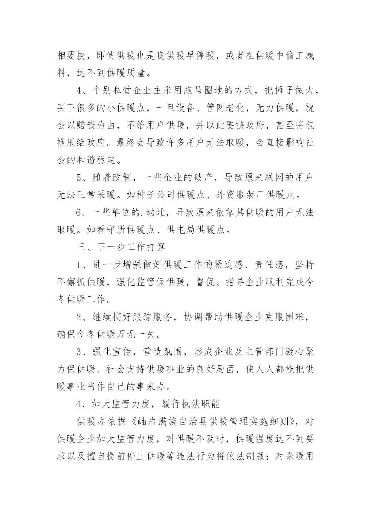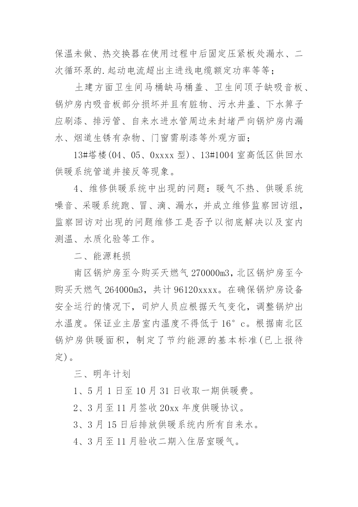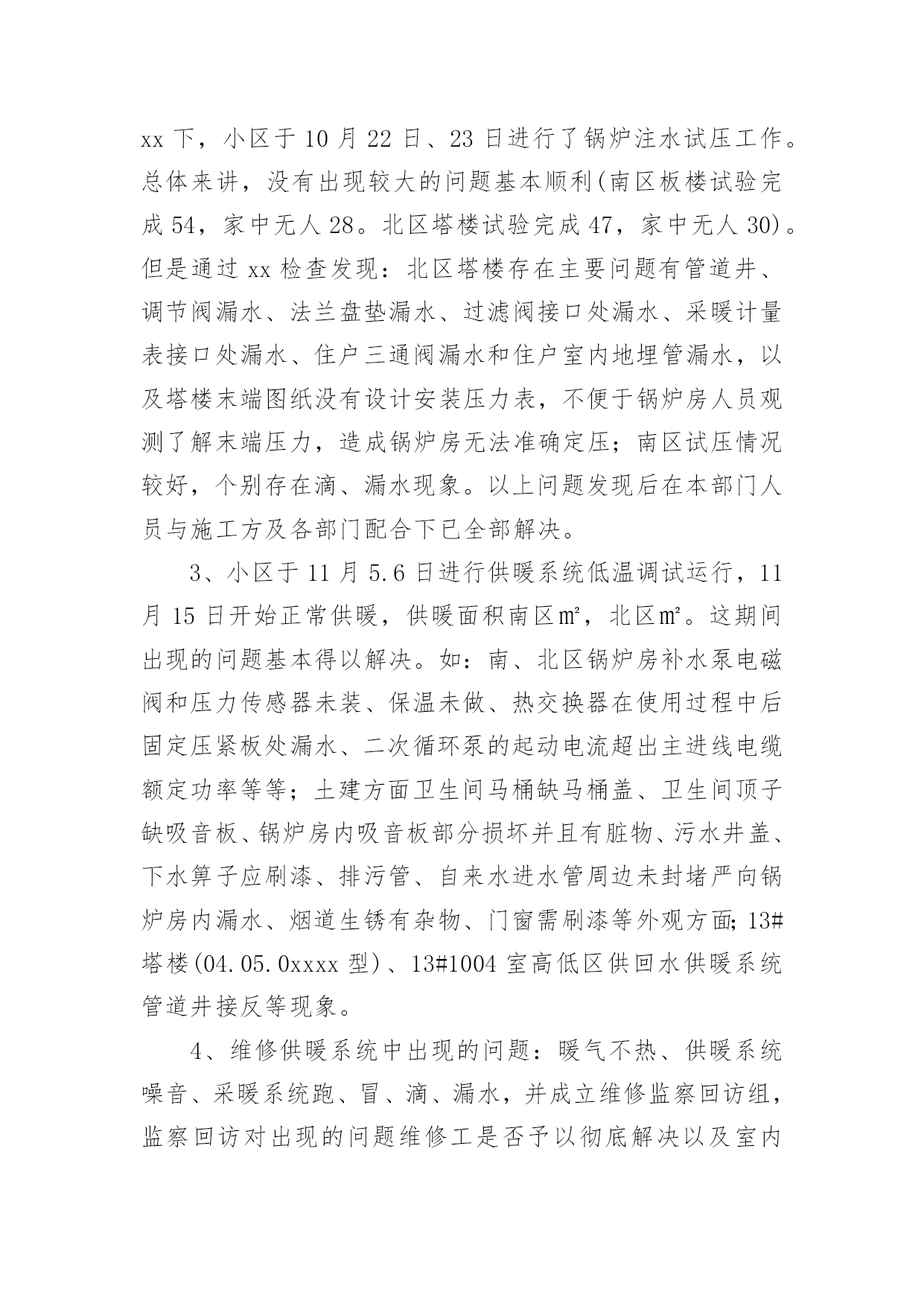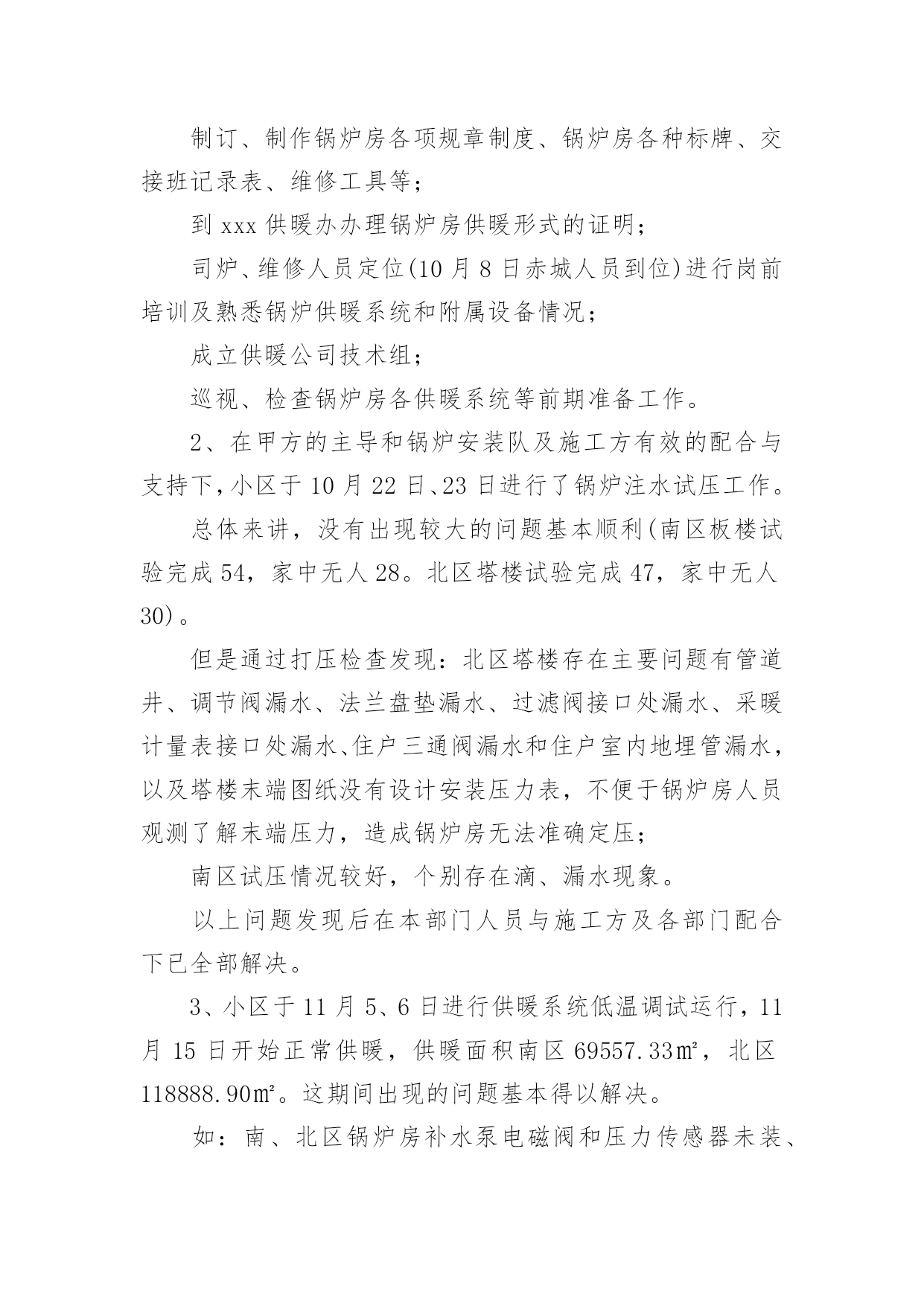 供暖工作总结供暖工作总结范文精品12篇总结是指社会团体、企业单位和个人对某一阶段的学习、工作或其完成情况加以回顾和分析,得出教训和一些规律性认识的一种书面材料,他能够提升我们的书面表达能力,为此要我们写一份总结。那么总结有什么格式呢?以下是小编为大家整理的供暖工作总结范文,仅供参考,欢迎大家阅读。供暖工作总结范文1供暖公司自成立之日起,积极响应一个声音、十分努力、百般维护、千万珍惜的精神以及供暖公司提倡的融瑞丽治业精神、暖社区四季如春的服务理念,结合甲方工作的指导方针与瑞丽物业的服务宗旨,认真贯彻执行上级交予的供暖任务,接受任务后能够迅速做出安排,在甲方及物业各部门的支持与配合下,基本能够圆满完成赋予的各项供暖工作任务,保障供暖工作的正常运行。通过近段时间来的供暖工作,我们取得经验的同时也发现了存在的问题,针对以往的工作及今后工作的顺利进行,我们从以下几个方面进行了总结:一、前期工作1、签收供暖协议;制订执行融合供暖结构组合方案;制订、制作锅炉房各项规章制度、锅炉房各种标牌、交接班记录表、维修工具等;到xxx供暖办办理锅炉房供暖形式的证明;司炉、维修人员定位(10月8日赤城人员到位)进行岗前培训及熟悉锅炉供暖系统和附属设备情况;成立供暖公司技术组;巡视、检查锅炉房各供暖系统等前期准备工作。2、在甲方的主导和锅炉安装队及施工方有效的配合与支持下,小区于10月22日、23日进行了锅炉注水试压工作。总体来讲,没有出现较大的问题基本顺利(南区板楼试验完成54,家中无人28。北区塔楼试验完成47,家中无人30)。但是通过打压检查发现:北区塔楼存在主要问题有管道井、调节阀漏水、法兰盘垫漏水、过滤阀接口处漏水、采暖计量表接口处漏水、住户三通阀漏水和住户室内地埋管漏水,以及塔楼末端图纸没有设计安装压力表,不便于锅炉房人员观测了解末端压力,造成锅炉房无法准确定压;南区试压情况较好,个别存在滴、漏水现象。以上问题发现后在本部门人员与施工方及各部门配合下已全部解决。3、小区于11月5、6日进行供暖系统低温调试运行,11月15日开始正常供暖,供暖面积南区69557.33㎡,北区118888.90㎡。这期间出现的问题基本得以解决。如:南、北区锅炉房补水泵电磁阀和压力传感器未装、保温未做、热交换器在使用过程中后固定压紧板处漏水、二次循环泵的.起动电流超出主进线电缆额定功率等等;土建方面卫生间马桶缺马桶盖、卫生间顶子缺吸音板、锅炉房内吸音板部分损坏并且有脏物、污水井盖、下水箅子应刷漆、排污管、自来水进水管周边未封堵严向锅炉房内漏水、烟道生锈有杂物、门窗需刷漆等外观方面;13#塔楼(04、05、0xxxx型)、13#1004室高低区供回水供暖系统管道井接反等现象。4、维修供暖系统中出现的问题:暖气不热、供暖系统噪音、采暖系统跑、冒、滴、漏水,并成立维修监察回访组,监察回访对出现的问题维修工是否予以彻底解决以及室内测温、水质化验等工作。二、能源耗损南区锅炉房至今购买天燃气270000m3,北区锅炉房至今购买天燃气264000m3,共计96120xxxx。在确保锅炉房设备安全运行的情况下,司炉人员应根据天气变化,调整锅炉出水温度。保证业主居室内温度不得低于16°c。根据南北区锅炉房供暖面积,制定了节约能源的基本标准(已上报待定)。三、明年计划1、5月1日至10月31日收取一期供暖费。2、3月至11月签收20xx年度供暖协议。3、3月15日后排放供暖系统内所有自来水。4、3月至11月验收二期入住居室暖气。5、3月至11月检修节门、清理管道井、检查压力表各供暖系统。6、10月份供暖季度工(司炉、维修)到岗。7、3月至11月锅炉房供暖系统进行检修。8、10月15日前购买锅炉房软化水用盐,检查各项前期准备工作是否到位。9、10月x日进行供暖系统注水打压。10、11月15日进行正常供暖工作。11、与区供暖办公室及区技术监督局进行业务相关的沟通工作。供暖工作总结范文2提高供暖质量事关百姓切身利益、事关社会稳定、和谐。供暖办本着“强化监管,重在指导,一切有利于提高供暖质量的原则”,对城镇供暖面积超过2万平方米的十一家供暖企业进行了资质审查,提出科学的整改方案,督促企业未雨绸缪,早动手、早准备,零距离指导、无条件服务。在县政府的正确领导和支持下,在企业的积极配合下,供暖工作有了良好的发展态势,群众反映供暖效果较好。一、供暖工作进展情况自二〇xx年四月份以来,供暖企业在供暖办的指导和督促下,按照整改计划认真开展设备更新改造、锅炉检修、管线打压、管网改造等工作,各供暖企业克服资金短缺,煤价、电价上涨等不利因素,想方设法多方筹集资金,今年总投资800万元,历时6个月,供暖准备工作成效显著,为今冬正常供暖奠定了良好的物质基础。(一)锅炉、附属设备维修及管网改造针对上个供暖期个别企业