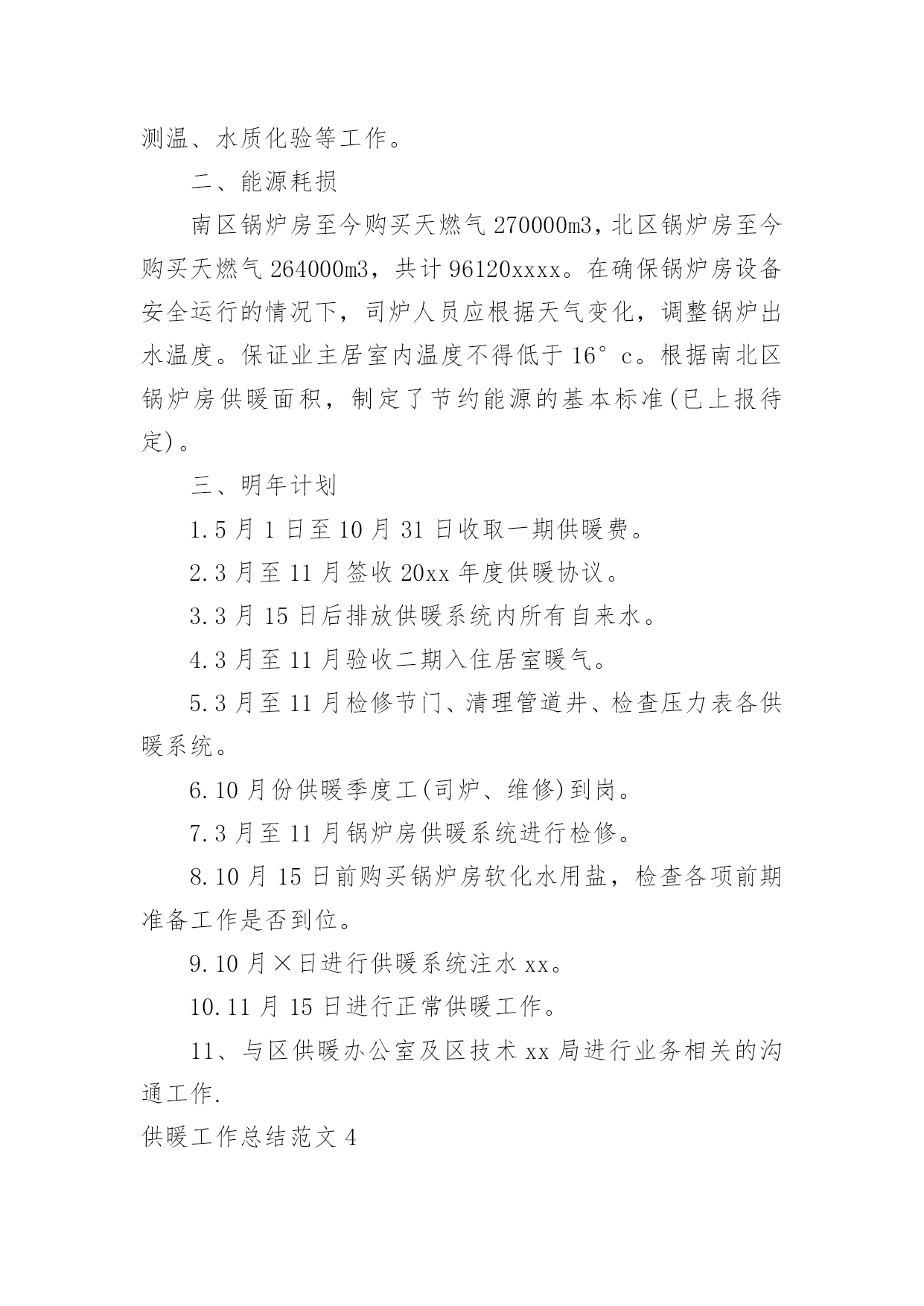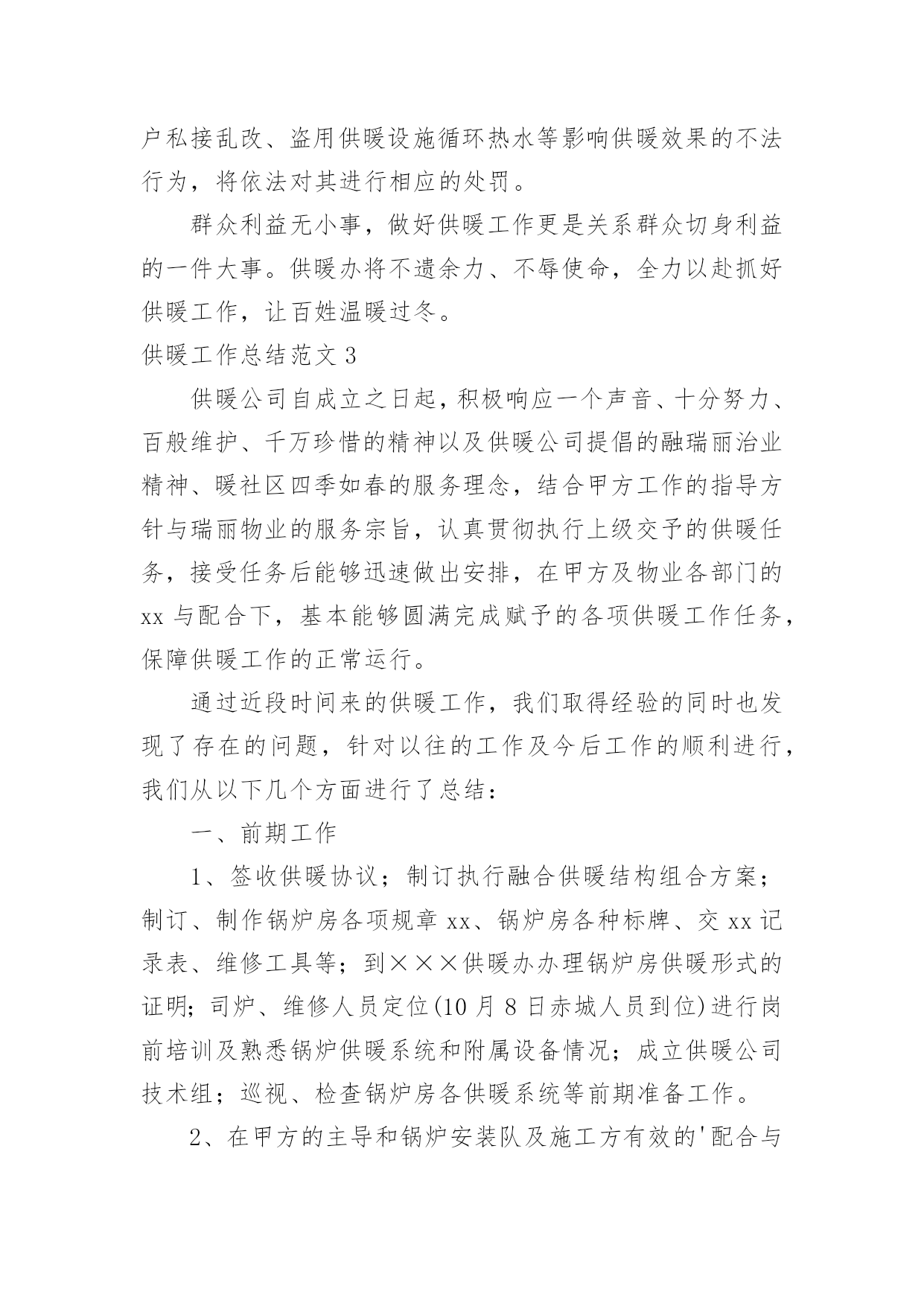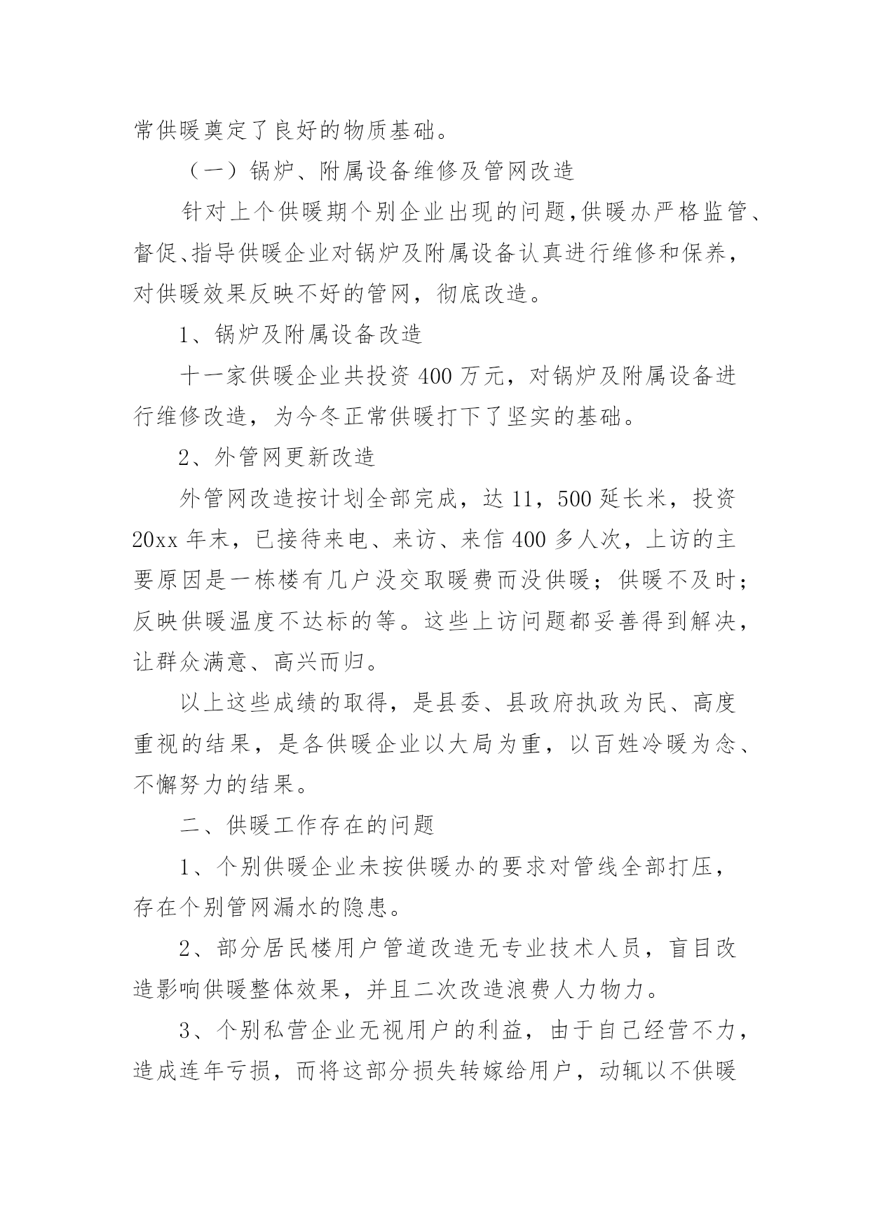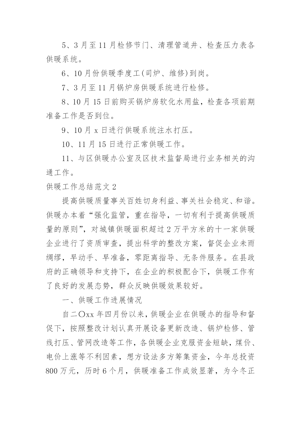 供暖工作总结供暖工作总结范文精品12篇总结是指社会团体、企业单位和个人对某一阶段的学习、工作或其完成情况加以回顾和分析,得出教训和一些规律性认识的一种书面材料,他能够提升我们的书面表达能力,为此要我们写一份总结。那么总结有什么格式呢?以下是小编为大家整理的供暖工作总结范文,仅供参考,欢迎大家阅读。供暖工作总结范文1供暖公司自成立之日起,积极响应一个声音、十分努力、百般维护、千万珍惜的精神以及供暖公司提倡的融瑞丽治业精神、暖社区四季如春的服务理念,结合甲方工作的指导方针与瑞丽物业的服务宗旨,认真贯彻执行上级交予的供暖任务,接受任务后能够迅速做出安排,在甲方及物业各部门的支持与配合下,基本能够圆满完成赋予的各项供暖工作任务,保障供暖工作的正常运行。通过近段时间来的供暖工作,我们取得经验的同时也发现了存在的问题,针对以往的工作及今后工作的顺利进行,我们从以下几个方面进行了总结:一、前期工作1、签收供暖协议;制订执行融合供暖结构组合方案;制订、制作锅炉房各项规章制度、锅炉房各种标牌、交接班记录表、维修工具等;到xxx供暖办办理锅炉房供暖形式的证明;司炉、维修人员定位(10月8日赤城人员到位)进行岗前培训及熟悉锅炉供暖系统和附属设备情况;成立供暖公司技术组;巡视、检查锅炉房各供暖系统等前期准备工作。2、在甲方的主导和锅炉安装队及施工方有效的配合与支持下,小区于10月22日、23日进行了锅炉注水试压工作。总体来讲,没有出现较大的问题基本顺利(南区板楼试验完成54,家中无人28。北区塔楼试验完成47,家中无人30)。但是通过打压检查发现:北区塔楼存在主要问题有管道井、调节阀漏水、法兰盘垫漏水、过滤阀接口处漏水、采暖计量表接口处漏水、住户三通阀漏水和住户室内地埋管漏水,以及塔楼末端图纸没有设计安装压力表,不便于锅炉房人员观测了解末端压力,造成锅炉房无法准确定压;南区试压情况较好,个别存在滴、漏水现象。以上问题发现后在本部门人员与施工方及各部门配合下已全部解决。3、小区于11月5、6日进行供暖系统低温调试运行,11月15日开始正常供暖,供暖面积南区69557.33㎡,北区118888.90㎡。这期间出现的问题基本得以解决。如:南、北区锅炉房补水泵电磁阀和压力传感器未装、保温未做、热交换器在使用过程中后固定压紧板处漏水、二次循环泵的.起动电流超出主进线电缆额定功率等等;土建方面卫生间马桶缺马桶盖、卫生间顶子缺吸音板、锅炉房内吸音板部分损坏并且有脏物、污水井盖、下水箅子应刷漆、排污管、自来水进水管周边未封堵严向锅炉房内漏水、烟道生锈有杂物、门窗需刷漆等外观方面;13#塔楼(04、05、0xxxx型)、13#1004室高低区供回水供暖系统管道井接反等现象。4、维修供暖系统中出现的问题:暖气不热、供暖系统噪音、采暖系统跑、冒、滴、漏水,并成立维修监察回访组,监察回访对出现的问题维修工是否予以彻底解决以及室内测温、水质化验等工作。二、能源耗损南区锅炉房至今购买天燃气270000m3,北区锅炉房至今购买天燃气264000m3,共计96120xxxx。在确保锅炉房设备安全运行的情况下,司炉人员应根据天气变化,调整锅炉出水温度。保证业主居室内温度不得低于16°c。根据南北区锅炉房供暖面积,制定了节约能源的基本标准(已上报待定)。三、明年计划1、5月1日至10月31日收取一期供暖费。2、3月至11月签收20xx年度供暖协议。3、3月15日后排放供暖系统内所有自来水。4、3月至11月验收二期入住居室暖气。5、3月至11月检修节门、清理管道井、检查压力表各供暖系统。6、10月份供暖季度工(司炉、维修)到岗。7、3月至11月锅炉房供暖系统进行检修。8、10月15日前购买锅炉房软化水用盐,检查各项前期准备工作是否到位。9、10月x日进行供暖系统注水打压。10、11月15日进行正常供暖工作。11、与区供暖办公室及区技术监督局进行业务相关的沟通工作。供暖工作总结范文2提高供暖质量事关百姓切身利益、事关社会稳定、和谐。供暖办本着“强化监管,重在指导,一切有利于提高供暖质量的原则”,对城镇供暖面积超过2万平方米的十一家供暖企业进行了资质审查,提出科学的整改方案,督促企业未雨绸缪,早动手、早准备,零距离指导、无条件服务。在县政府的正确领导和支持下,在企业的积极配合下,供暖工作有了良好的发展态势,群众反映供暖效果较好。一、供暖工作进展情况自二〇xx年四月份以来,供暖企业在供暖办的指导和督促下,按照整改计划认真开展设备更新改造、锅炉检修、管线打压、管网改造等工作,各供暖企业克服资金短缺,煤价、电价上涨等不利因素,想方设法多方筹集资金,今年总投资800万元,历时6个月,供暖准备工作成效显著,为今冬正常供暖奠定了良好的物质基础。(一)锅炉、附属设备维修及管网改造针对上个供暖期个别企业