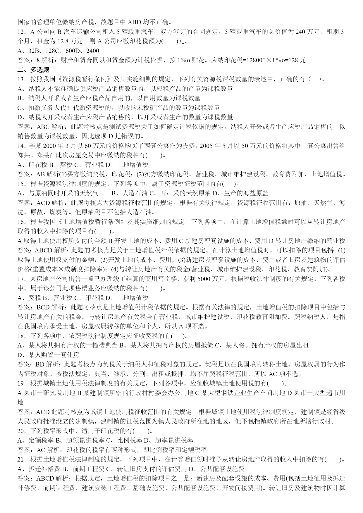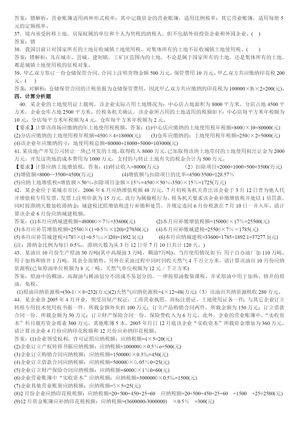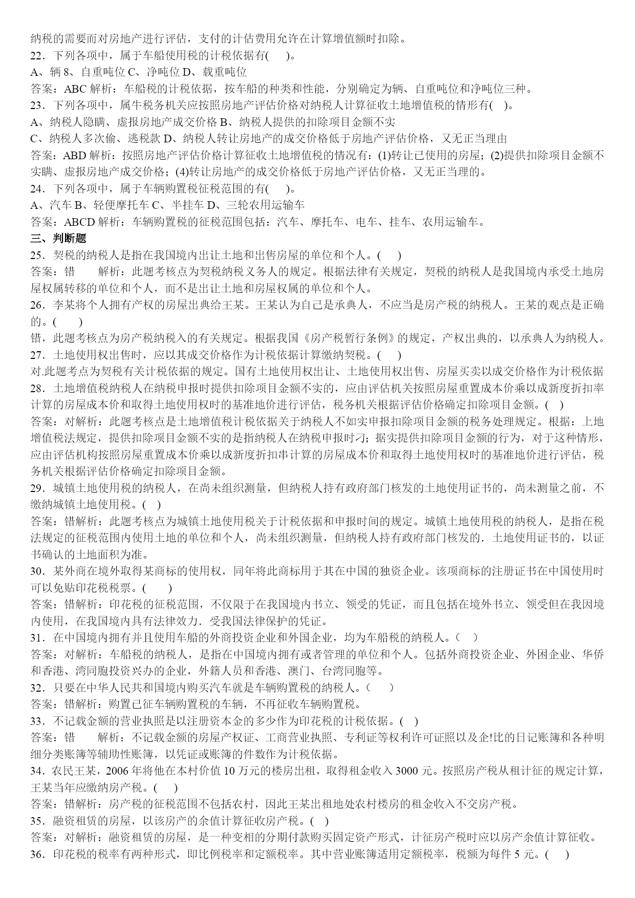 经济法基础第6章练习1——答案一、单选题1.某企业经营用的一幢房产原值2000000元,已知房产税税率为1.2%,当地规定的房产税扣除比例为25%,则该房产应缴纳的房产税为()元。A、15000B、18000C、20000D、24000答案:B解析:此题考核点是有关房产税计税依据和应纳税额计算的规定。根据法律规定,房产税从价计征的讨税依据为:房产原值减除10%~30%后的余值:应纳税额的计算公式为:应税房产原值×(1-扣除比例)×1.2%。本题应纳税为:2000000×(1-25%)×1.2%=18000