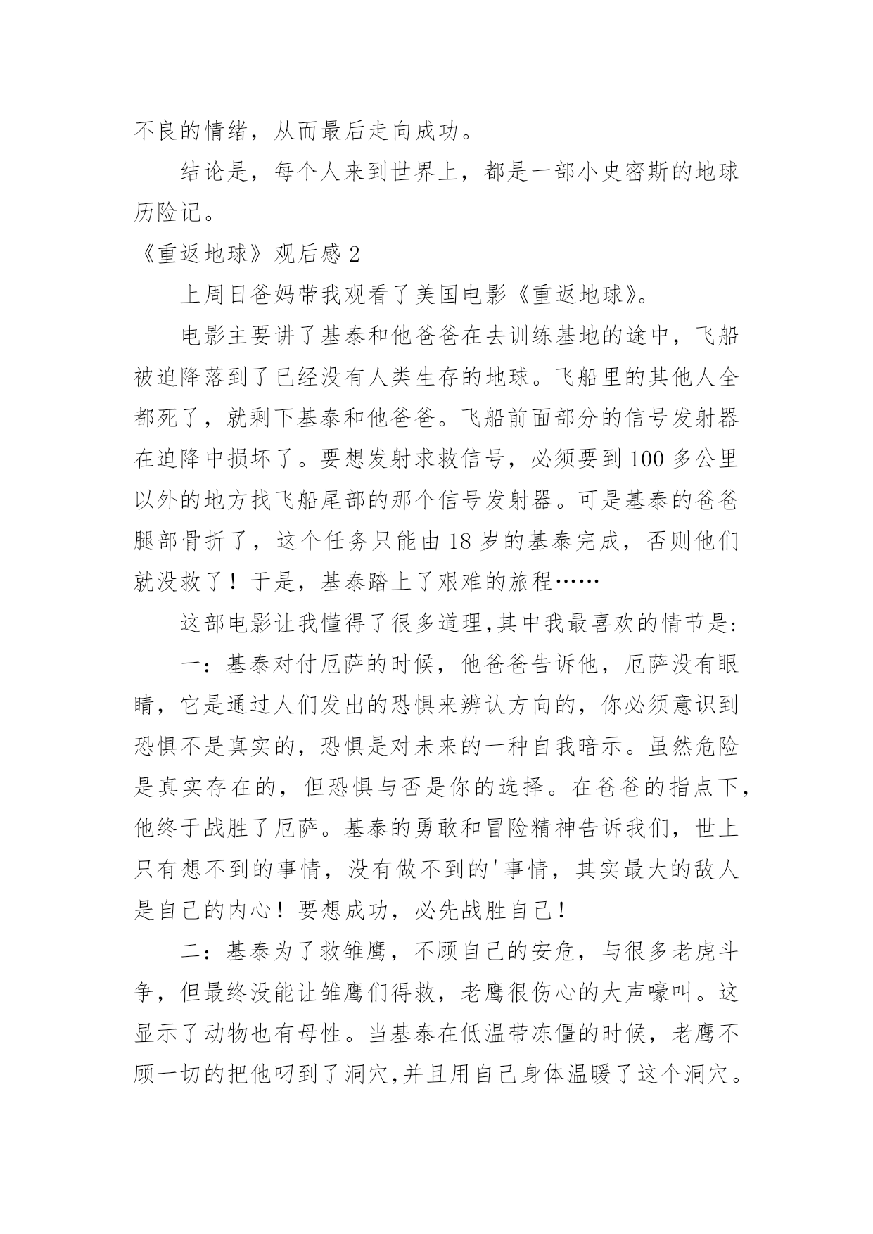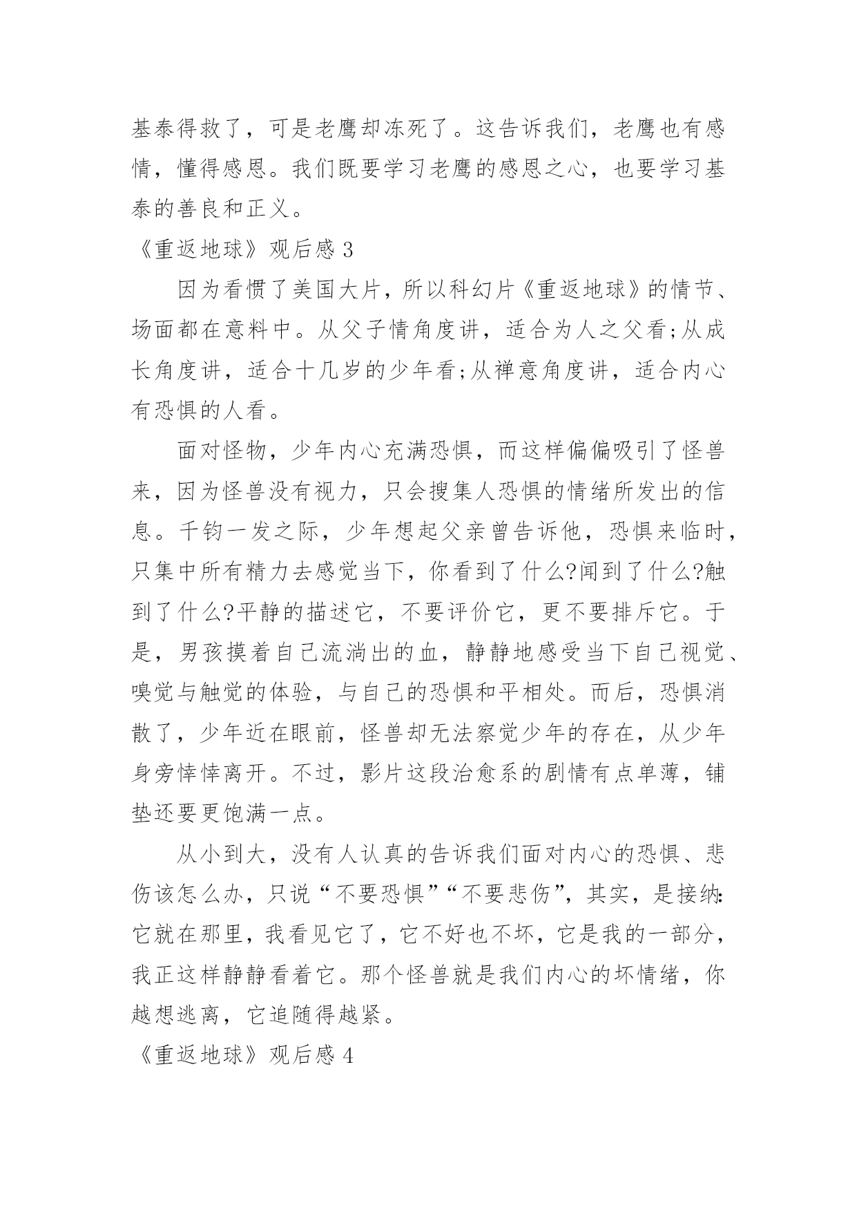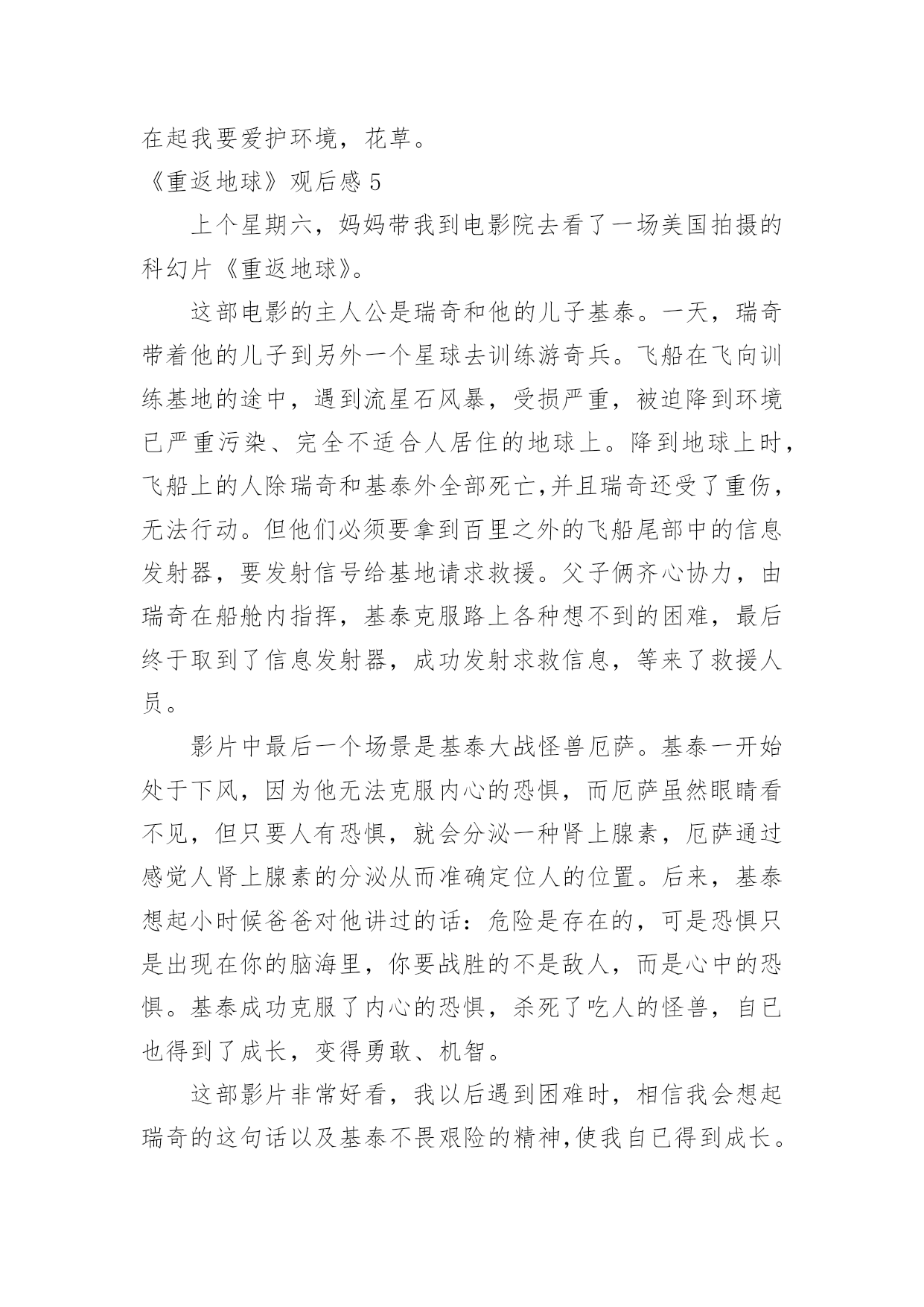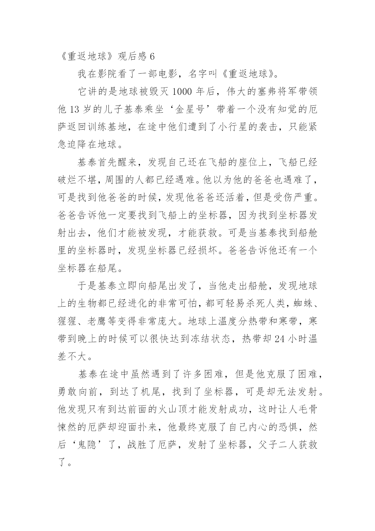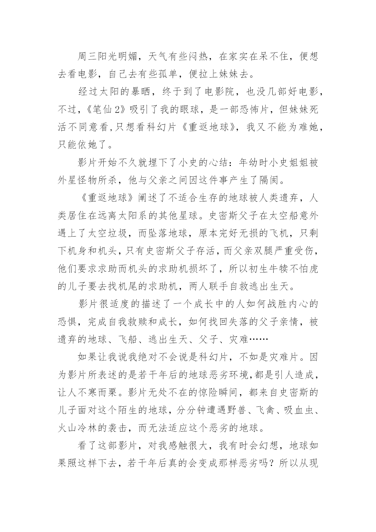 《重返地球》观后感《重返地球》观后感当认真看完一部作品后,相信大家增长不少见闻吧,是时候写一篇观后感好好记录一下了。可是观后感怎么写才合适呢?以下是小编为大家整理的《重返地球》观后感,欢迎阅读,希望大家能够喜欢。《重返地球》观后感1昨晚观看了史密斯父子主演的《重返地球》,真心觉得这是一部很好的科幻片,观众在享受特技带来的视觉盛宴之余,更重要的是影片重新给我们阐释了“恐惧”概念。“恐惧”从来就是不存在的,只是人类在面临危险时的一种主观内心感受,这种内心感受容易使人类在关键时刻做出错误的判断和决定,导致危险变为现实。影片中,小史密斯在寻找感应器的过程中,多次面临死亡的威胁,从开始时的极度恐惧、急躁、慌乱,到最后在面对最邪恶的怪物厄萨时,克服恐惧、克服心魔,成功杀掉厄萨,挽救了自己和父亲的生命。小史密斯的成功历险记仿佛也是在告诉我们,人的一生,也就是一次历险,在这过程中,你会遇到许多困难和困境,在最初,你会恐惧、彷徨、无助,因不能克制自己的情绪,导致一些错误的选择和决定;到慢慢不断的成长成熟,学会了克制、学会了镇定,克服了一些不良的情绪,从而最后走向成功。结论是,每个人来到世界上,都是一部小史密斯的地球历险记。《重返地球》观后感2上周日爸妈带我观看了美国电影《重返地球》。电影主要讲了基泰和他爸爸在去训练基地的途中,飞船被迫降落到了已经没有人类生存的地球。飞船里的其他人全都死了,就剩下基泰和他爸爸。飞船前面部分的信号发射器在迫降中损坏了。要想发射求救信号,必须要到100多公里以外的地方找飞船尾部的那个信号发射器。可是基泰的爸爸腿部骨折了,这个任务只能由18岁的基泰完成,否则他们就没救了!于是,基泰踏上了艰难的旅程……这部电影让我懂得了很多道理,其中我最喜欢的情节是:一:基泰对付厄萨的时候,他爸爸告诉他,厄萨没有眼睛,它是通过人们发出的恐惧来辨认方向的,你必须意识到恐惧不是真实的,恐惧是对未来的一种自我暗示。虽然危险是真实存在的,但恐惧与否是你的选择。在爸爸的指点下,他终于战胜了厄萨。基泰的勇敢和冒险精神告诉我们,世上只有想不到的事情,没有做不到的'事情,其实最大的敌人是自己的内心!要想成功,必先战胜自己!二:基泰为了救雏鹰,不顾自己的安危,与很多老虎斗争,但最终没能让雏鹰们得救,老鹰很伤心的大声嚎叫。这显示了动物也有母性。当基泰在低温带冻僵的时候,老鹰不顾一切的把他叼到了洞穴,并且用自己身体温暖了这个洞穴。基泰得救了,可是老鹰却冻死了。这告诉我们,老鹰也有感情,懂得感恩。我们既要学习老鹰的感恩之心,也要学习基泰的善良和正义。《重返地球》观后感3因为看惯了美国大片,所以科幻片《重返地球》的情节、场面都在意料中。从父子情角度讲,适合为人之父看;从成长角度讲,适合十几岁的少年看;从禅意角度讲,适合内心有恐惧的人看。面对怪物,少年内心充满恐惧,而这样偏偏吸引了怪兽来,因为怪兽没有视力,只会搜集人恐惧的情绪所发出的信息。千钧一发之际,少年想起父亲曾告诉他,恐惧来临时,只集中所有精力去感觉当下,你看到了什么?闻到了什么?触到了什么?平静的描述它,不要评价它,更不要排斥它。于是,男孩摸着自己流淌出的血,静静地感受当下自己视觉、嗅觉与触觉的体验,与自己的恐惧和平相处。而后,恐惧消散了,少年近在眼前,怪兽却无法察觉少年的存在,从少年身旁悻悻离开。不过,影片这段治愈系的剧情有点单薄,铺垫还要更饱满一点。从小到大,没有人认真的告诉我们面对内心的恐惧、悲伤该怎么办,只说“不要恐惧”“不要悲伤”,其实,是接纳:它就在那里,我看见它了,它不好也不坏,它是我的一部分,我正这样静静看着它。那个怪兽就是我们内心的坏情绪,你越想逃离,它追随得越紧。《重返地球》观后感4周三阳光明媚,天气有些闷热,在家实在呆不住,便想去看电影,自己去有些孤单,便拉上妹妹去。经过太阳的暴晒,终于到了电影院,也没几部好电影,不过,《笔仙2》吸引了我的眼球,是一部恐怖片,但妹妹死活不同意看,只想看科幻片《重返地球》,我又不能为难她,只能依她了。影片开始不久就埋下了小史的心结:年幼时小史姐姐被外星怪物所杀,他与父亲之间因这件事产生了隔阂。《重返地球》阐述了不适合生存的地球被人类遗弃,人类居住在远离太阳系的其他星球。史密斯父子在太空船意外遇上了太空垃圾,而坠落地球,原本完好无损的飞机,只剩下机身和机头,只有史密斯父子存活,而父亲双腿严重受伤,他们要求求助而机头的求助机损坏了,所以初生牛犊不怕虎的儿子要去找机尾的求助机,两人联手自救逃出生天。影片很适度的描述了一个成长中的人如何战胜内心的恐惧,完成自我救赎和成长,如何找回失落的父子亲情,被遗弃的地球、飞船、逃出生天、父子、灾难……如果让我说我绝对不会说是科幻片,不如是灾难片。因为影片所表述的是若干年后的地球恶劣环境,都是引人造成,让人不寒而栗。影片