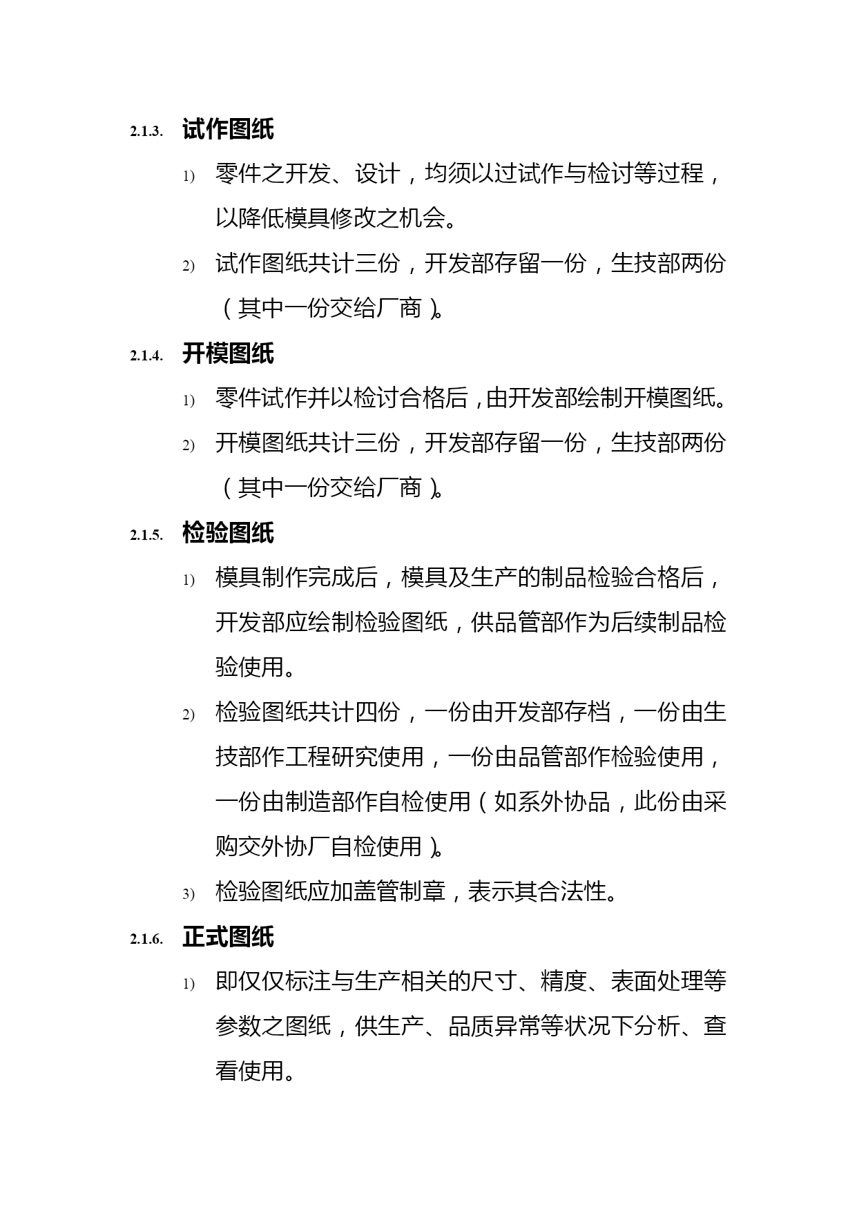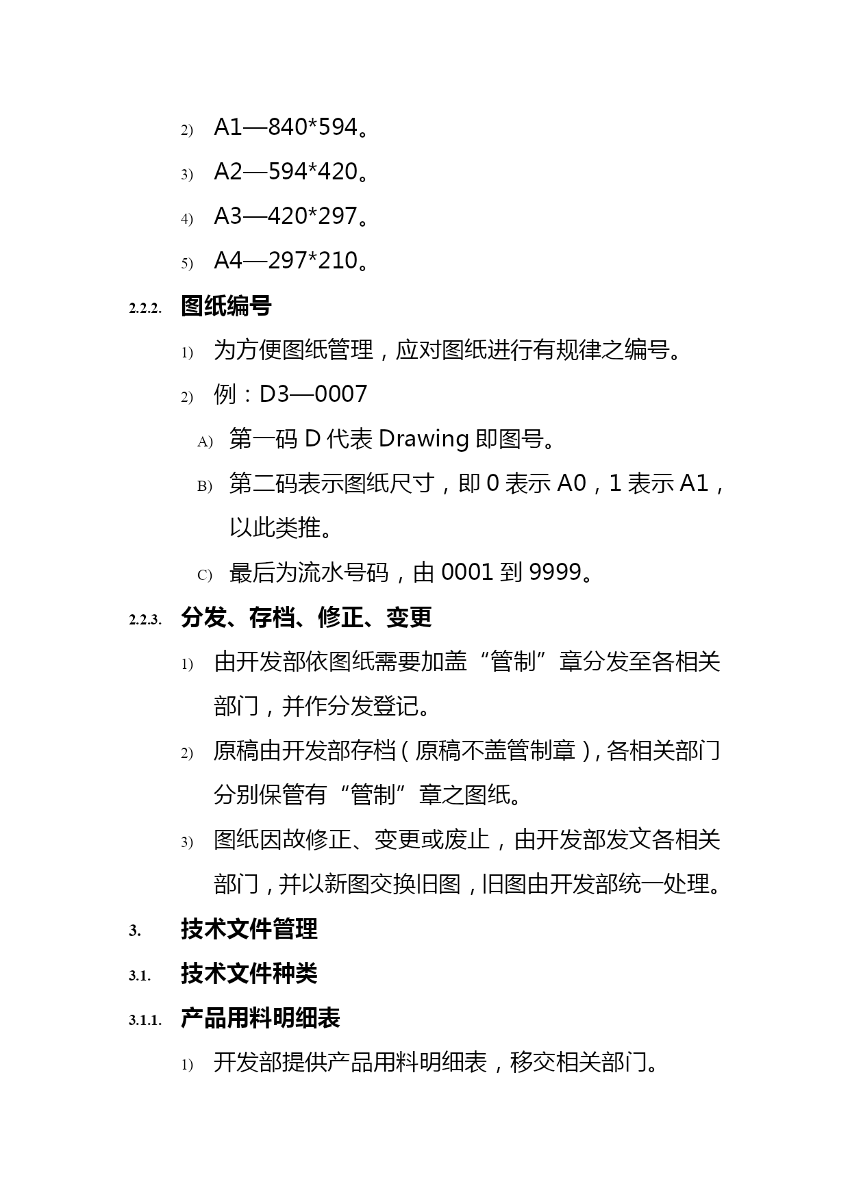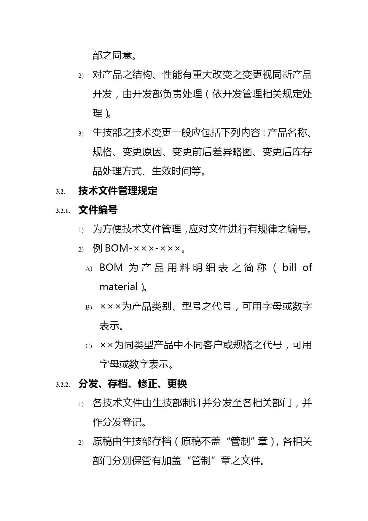 技术资料办法汇编(完整版)资料(可以直接使用,可编辑优秀版资料,欢迎下载)天马行空官方博客:;QQ:1318241189;QQ群:175569632技术资料管理办法总则制定目的规范技术资料的整理、分类、发放、存档等事项,使之合理并有章可循。适用范围凡公司内技术资料之管理,悉依本办法执行。权责单位总经理室负责本办法制定、修改、废止之起草作。总经理负责本办法制定、修改、废止之核准。技术图纸管理技术图纸种类原稿由开发部设计、制作、修改和存档,并由开发部自行管理。原稿图纸均不对外借用,以确保原稿之完整性。第二原稿由原稿复制而成,并归开发部自行保管,以防原稿污损或遗失备用。第二原稿可供生技部、品管部及制造部工作需要时借用,但借用者须事先申请。试作图纸零件之开发、设计,均须以过试作与检讨等过程,以降低模具修改之机会。试作图纸共计三份,开发部存留一份,生技部两份(其中一份交给厂商)。开模图纸零件试作并以检讨合格后,由开发部绘制开模图纸。开模图纸共计三份,开发部存留一份,生技部两份(其中一份交给厂商)。检验图纸模具制作完成后,模具及生产的制品检验合格后,开发部应绘制检验图纸,供品管部作为后续制品检验使用。检验图纸共计四份,一份由开发部存档,一份由生技部作工程研究使用,一份由品管部作检验使用,一份由制造部作自检使用(如系外协品,此份由采购交外协厂自检使用)。检验图纸应加盖管制章,表示其合法性。正式图纸即仅仅标注与生产相关的尺寸、精度、表面处理等参数之图纸,供生产、品质异常等状况下分析、查看使用。正式图纸共计七份,其中开发部自存一份,品管、生技各一份,制造部两份,采购部两份(一份存采购,一份存厂商)。设计变更图纸零件已经评审合格,且已导入量产,因故需变更尺寸时,应绘制设计变更图纸。设计变更图纸有三种变更情形:变更即原尺寸进行变更,应加盖“变更”章。追加即原图纸没有之部分,经设计变更后需增加时,加盖“追加”章。修整即尺寸不变,因笔误或其他失误需修正者,盖“修正”章。设计变更应遵循《技术变更管理办法》。变更时须发出变更通知,同时以新图纸换回旧图纸,并将回收的旧图纸销毁(设计原稿不销毁)。设计图纸管理规定技术图纸尺寸本公司技术图纸尺寸(长*宽)规定如下(单位mm):A0—880*不限制。A1—840*594。A2—594*420。A3—420*297。A4—297*210。图纸编号为方便图纸管理,应对图纸进行有规律之编号。例:D3—0007第一码D代表Drawing即图号。第二码表示图纸尺寸,即0表示A0,1表示A1,以此类推。最后为流水号码,由0001到9999。分发、存档、修正、变更由开发部依图纸需要加盖“管制”章分发至各相关部门,并作分发登记。原稿由开发部存档(原稿不盖管制章),各相关部门分别保管有“管制”章之图纸。图纸因故修正、变更或废止,由开发部发文各相关部门,并以新图交换旧图,旧图由开发部统一处理。技术文件管理技术文件种类产品用料明细表开发部提供产品用料明细表,移交相关部门。产品用料明细表一般包括零部件之名称、编号、规格、单位、标准用量、自制或外购、损耗率等内容。工艺流程生技部根据产品生产加工之工艺状况,对工艺流程进行修订。工艺流程一般应包括加工、搬运、检验、储存等内容。作业标准书(或称作业指导书)生技部根据产品加工的特点,对每一加工工序之作业标准书进行制定及修改。作业标准书一般应包括产品名称、加工工序名称、作业顺序、条件、方法、产品略图、使用设备、工具、标准工时、标准不良率、自检标准等内容。标准工时生技部根据产品加工状况,测定每一工序作业标准工时。标准工时一般应注明下列内容:产品名称、规格、工序名称、作业条件、使用设备、标准产量、标准工时、标准不良率。技术变更资料在未改变产品结构、性能的基础上,局部技术变更由生技部发出技术变更资料,并征询开发部、制造部之同意。对产品之结构、性能有重大改变之变更视同新产品开发,由开发部负责处理(依开发管理相关规定处理)。生技部之技术变更一般应包括下列内容:产品名称、规格、变更原因、变更前后差异略图、变更后库存品处理方式、生效时间等。技术文件管理规定文件编号为方便技术文件管理,应对文件进行有规律之编号。例BOM-×××-×××。BOM为产品用料明细表之简称(billofmaterial)。×××为产品类别、型号之代号,可用字母或数字表示。××为同类型产品中不同客户或规格之代号,可用字母或数字表示。分发、存档、修正、更换各技术文件由生技部制订并分发至各相关部门,并作分发登记。原稿由生技部存档(原稿不盖“管制”章),各