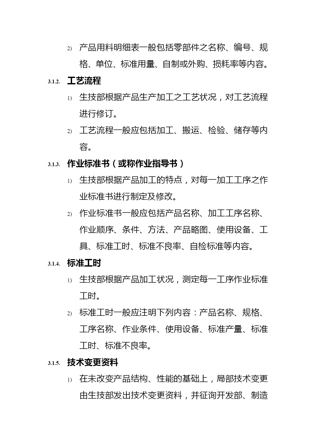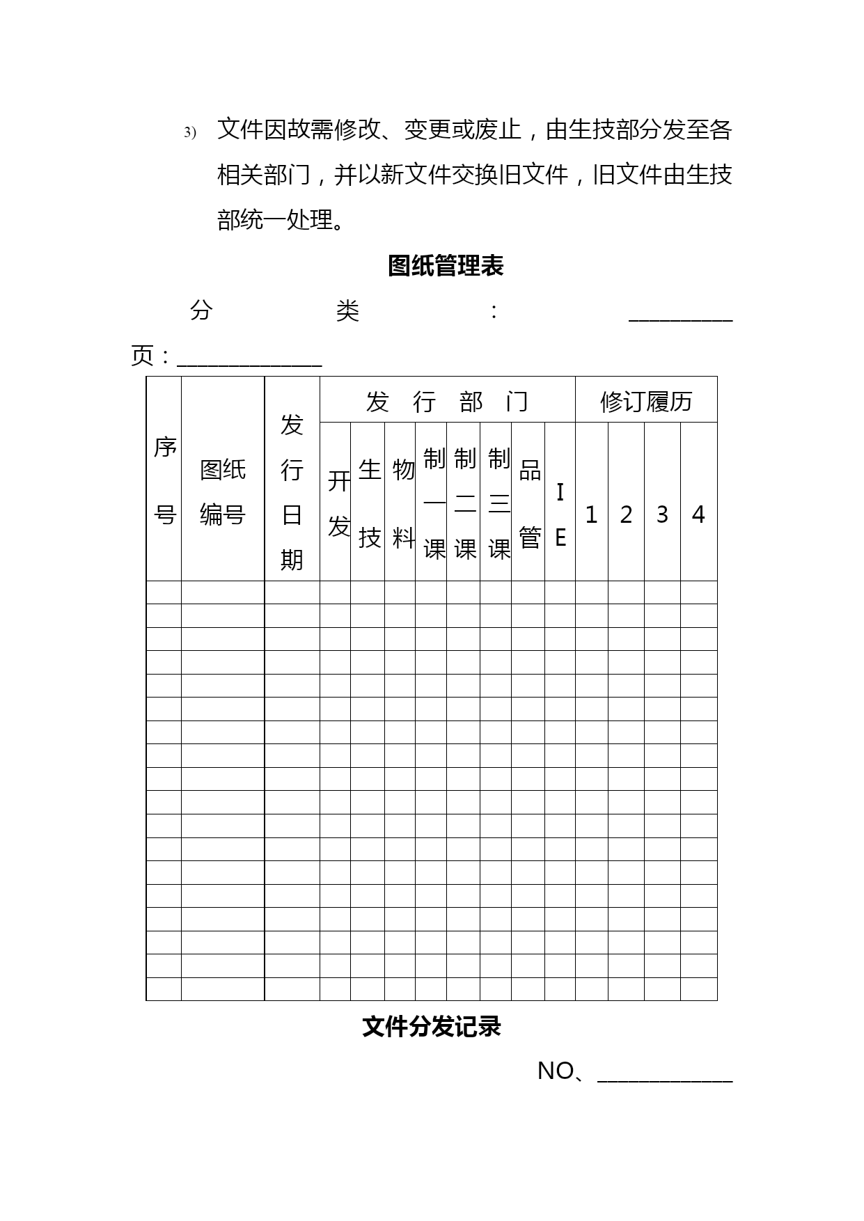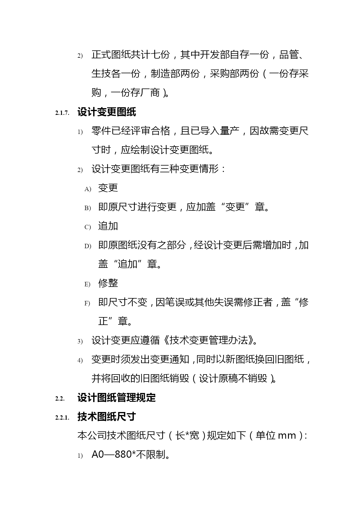 技术资料办法汇编(完整版)资料(可以直接使用,可编辑优秀版资料,欢迎下载)天马行空官方博客:;QQ:1318241189;QQ群:175569632技术资料管理办法总则制定目的规范技术资料的整理、分类、发放、存档等事项,使之合理并有章可循。适用范围凡公司内技术资料之管理,悉依本办法执行。权责单位总经理室负责本办法制定、修改、废止之起草作。总经理负责本办法制定、修改、废止之核准。技术图纸管理技术图纸种类原稿由开发部设计、制作、修改和存档,并由开发部自行管理。原稿图纸均不对外借用,以确保原稿之完整性。第二原稿由原稿复制而成,并归开发部自行保管,以防原稿污损或遗失备用。第二原稿可供生技部、品管部及制造部工作需要时借用,但借用者须事先申请。试作图纸零件之开发、设计,均须以过试作与检讨等过程,以降低模具修改之机会。试作图纸共计三份,开发部存留一份,生技部两份(其中一份交给厂商)。开模图纸零件试作并以检讨合格后,由开发部绘制开模图纸。开模图纸共计三份,开发部存留一份,生技部两份(其中一份交给厂商)。检验图纸模具制作完成后,模具及生产的制品检验合格后,开发部应绘制检验图纸,供品管部作为后续制品检验使用。检验图纸共计四份,一份由开发部存档,一份由生技部作工程研究使用,一份由品管部作检验使用,一份由制造部作自检使用(如系外协品,此份由采购交外协厂自检使用)。检验图纸应加盖管制章,表示其合法性。正式图纸即仅仅标注与生产相关的尺寸、精度、表面处理等参数之图纸,供生产、品质异常等状况下分析、查看使用。正式图纸共计七份,其中开发部自存一份,品管、生技各一份,制造部两份,采购部两份(一份存采购,一份存厂商)。设计变更图纸零件已经评审合格,且已导入量产,因故需变更尺寸时,应绘制设计变更图纸。设计变更图纸有三种变更情形:变更即原尺寸进行变更,应加盖“变更”章。追加即原图纸没有之部分,经设计变更后需增加时,加盖“追加”章。修整即尺寸不变,因笔误或其他失误需修正者,盖“修正”章。设计变更应遵循《技术变更管理办法》。变更时须发出变更通知,同时以新图纸换回旧图纸,并将回收的旧图纸销毁(设计原稿不销毁)。设计图纸管理规定技术图纸尺寸本公司技术图纸尺寸(长*宽)规定如下(单位mm):A0—880*不限制。A1—840*594。A2—594*420。A3—420*297。A4—297*210。图纸编号为方便图纸管理,应对图纸进行有规律之编号。例:D3—0007第一码D代表Drawing即图号。第二码表示图纸尺寸,即0表示A0,1表示A1,以此类推。最后为流水号码,由0001到9999。分发、存档、修正、变更由开发部依图纸需要加盖“管制”章分发至各相关部门,并作分发登记。原稿由开发部存档(原稿不盖管制章),各相关部门分别保管有“管制”章之图纸。图纸因故修正、变更或废止,由开发部发文各相关部门,并以新图交换旧图,旧图由开发部统一处理。技术文件管理技术文件种类产品用料明细表开发部提供产品用料明细表,移交相关部门。产品用料明细表一般包括零部件之名称、编号、规格、单位、标准用量、自制或外购、损耗率等内容。工艺流程生技部根据产品生产加工之工艺状况,对工艺流程进行修订。工艺流程一般应包括加工、搬运、检验、储存等内容。作业标准书(或称作业指导书)生技部根据产品加工的特点,对每一加工工序之作业标准书进行制定及修改。作业标准书一般应包括产品名称、加工工序名称、作业顺序、条件、方法、产品略图、使用设备、工具、标准工时、标准不良率、自检标准等内容。标准工时生技部根据产品加工状况,测定每一工序作业标准工时。标准工时一般应注明下列内容:产品名称、规格、工序名称、作业条件、使用设备、标准产量、标准工时、标准不良率。技术变更资料在未改变产品结构、性能的基础上,局部技术变更由生技部发出技术变更资料,并征询开发部、制造部之同意。对产品之结构、性能有重大改变之变更视同新产品开发,由开发部负责处理(依开发管理相关规定处理)。生技部之技术变更一般应包括下列内容:产品名称、规格、变更原因、变更前后差异略图、变更后库存品处理方式、生效时间等。技术文件管理规定文件编号为方便技术文件管理,应对文件进行有规律之编号。例BOM-×××-×××。BOM为产品用料明细表之简称(billofmaterial)。×××为产品类别、型号之代号,可用字母或数字表示。××为同类型产品中不同客户或规格之代号,可用字母或数字表示。分发、存档、修正、更换各技术文件由生技部制订并分发至各相关部门,并作分发登记。原稿由生技部存档(原稿不盖“管制”章),各