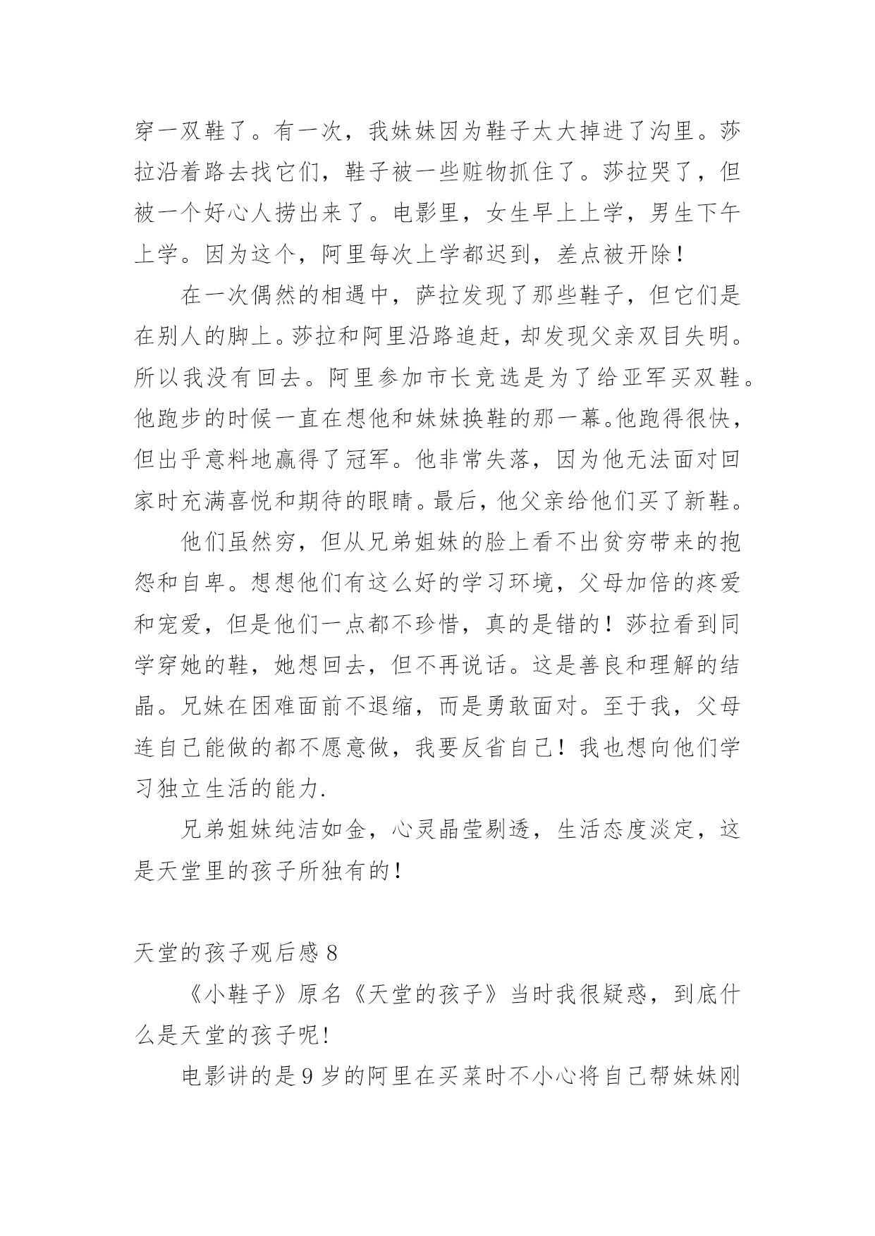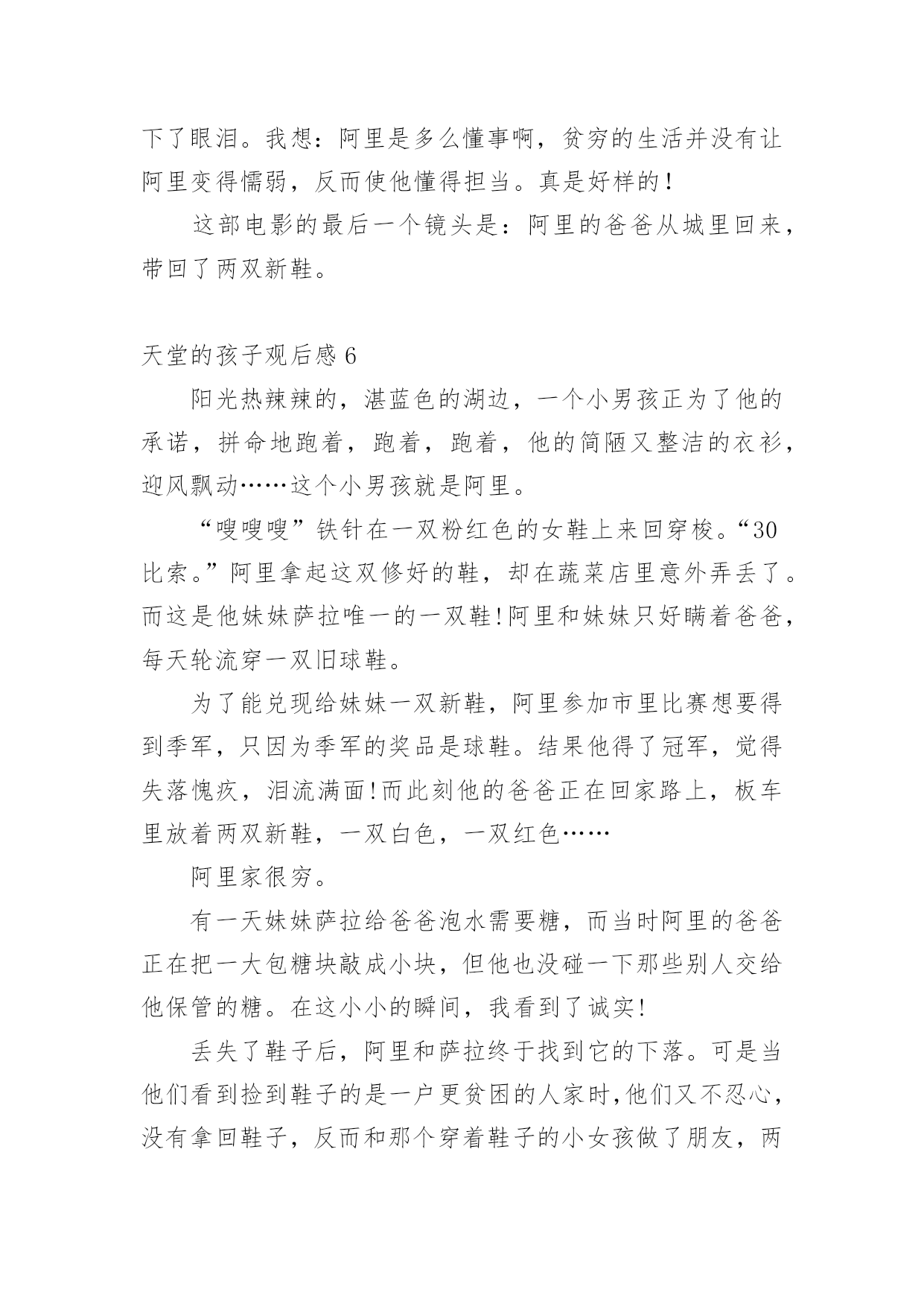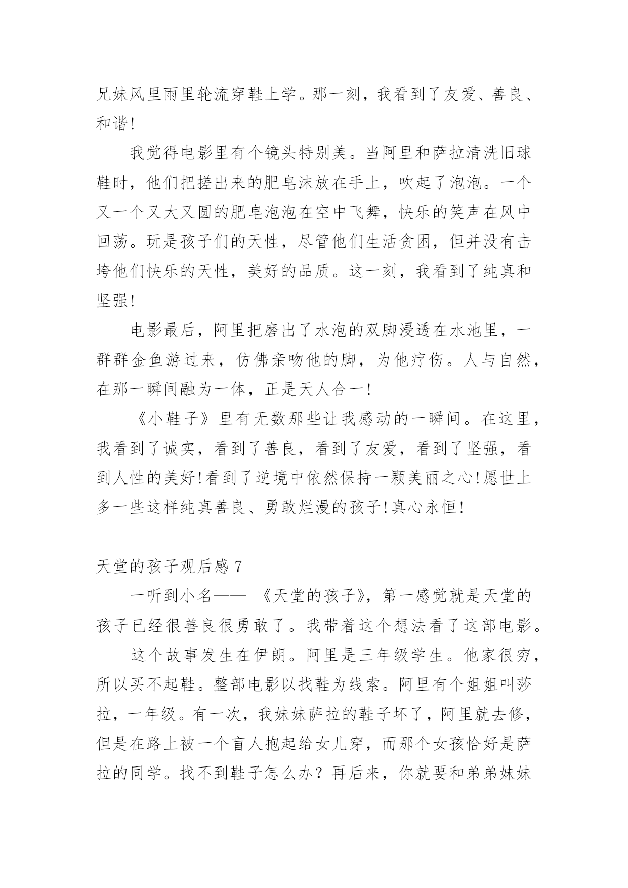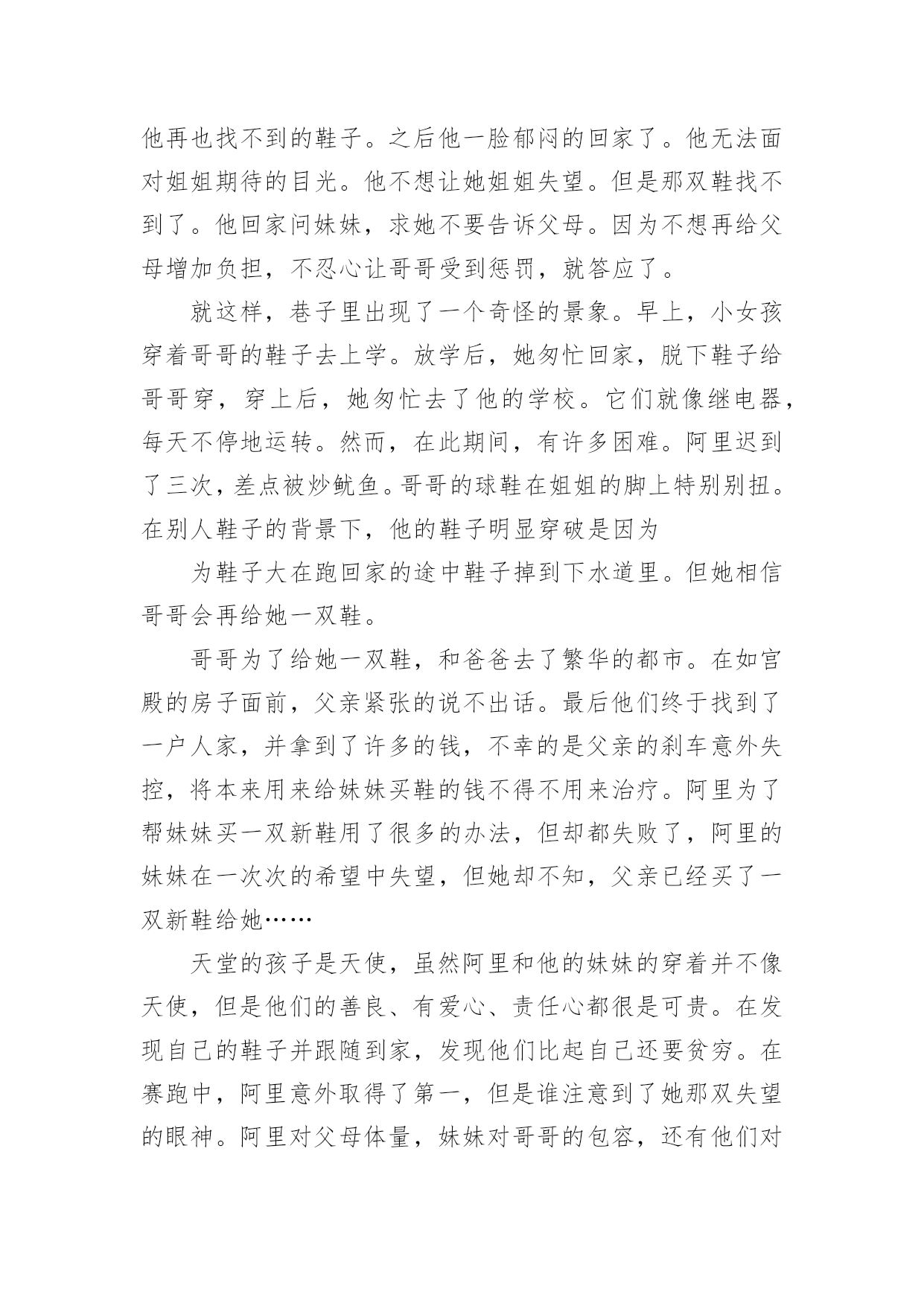 天堂的孩子观后感天堂的孩子观后感15篇看完某一作品后,这次观看让你有什么领悟呢?记录下来很重要哦,一起来写一篇观后感吧。那么你会写观后感吗?下面是小编整理的天堂的孩子观后感,仅供参考,欢迎大家阅读。天堂的孩子观后感1阿里取回为妹妹修理的小鞋子时,不慎把这双妹妹仅有的鞋子丢失了,为了免除父母的惩罚,他央求妹妹与他达成协议:每天妹妹上学时穿他的鞋子,然后下学后再换给他去上学。当阿里含着泪对妹妹说这些的时候,那是一种无助,那是一种自责。或许家境的贫寒让他更明白哥哥的责任。于是兄妹仅有的这双鞋子每天就在两个人的脚上交换着,当妹妹匆匆跑回来的时候,阿里则飞快的去学校。当妹妹一次把鞋掉在水沟中,她哭泣着追赶漂泊的鞋,她更象追求一个属于他们兄妹两个的心理依靠。当他们两个在刷球鞋互相高兴的吹着肥皂泡,互相微笑着面对一双球鞋,在那一刻,他们是是最快乐的。当阿里和父亲进城给那些富人修剪草坪时,一个叫哈里的小孩恳求阿里和他玩耍。面对众多的玩具,哈里并没有因为物质富裕而开心,反而物质富裕填不满他内心的空虚。当身在天堂心却不在的他和阿里在一起才体会到儿童的快乐,是不是一种悲哀?当阿里知道马拉松比赛的第三名可以获得一双运动鞋,他便哭着哀求老师给他机会。在比赛中,他脑海里不断浮现和妹妹交换球鞋的场景,那是一个关于承诺的约定。他就这样坚持着跑完了全程,却发现自己是第一名。看着不能获得第三名,他失望的哭了。回到家,没有实现自己的诺言,妹妹远离了他。他把磨起泡的脚放进池塘来缓解痛苦的时候,父亲早为他们买了新鞋,正在回家的途中,几条金鱼在他的小脚间游动……于是我开始琢磨《天堂的孩子》的含义。天堂或许就是这个样子,并不是因为你贫穷而远离你。天堂就是你面对困难或贫穷时所表现出的那种从容心态。内心的快乐并不取决于你所拥有的财富,而是在于你采取的生活态度。快乐其实很简单,当用一颗从容的心去面对生活,我们就是生活在天堂!天堂从来没有远离过我们,只不过我们没有用心去体会而已!天堂的孩子观后感2《小鞋子》,原名《天堂的孩子》,当时很疑惑。天堂里的孩子是什么样的?电影讲的是9岁的阿里在买菜的时候,不小心把刚给妹妹修的鞋子弄丢了。这是他姐姐唯一的一双鞋。他急忙去找他再也找不到的鞋子。之后他一脸郁闷的回家了。他无法面对姐姐期待的目光。他不想让她姐姐失望。但是那双鞋找不到了。他回家问妹妹,求她不要告诉父母。因为不想再给父母增加负担,不忍心让哥哥受到惩罚,就答应了。就这样,巷子里出现了一个奇怪的景象。早上,小女孩穿着哥哥的鞋子去上学。放学后,她匆忙回家,脱下鞋子给哥哥穿,穿上后,她匆忙去了他的学校。它们就像继电器,每天不停地运转。然而,在此期间,有许多困难。阿里迟到了三次,差点被炒鱿鱼。哥哥的球鞋在姐姐的脚上特别别扭。在别人鞋子的背景下,他的鞋子明显穿破是因为为鞋子大在跑回家的途中鞋子掉到下水道里。但她相信哥哥会再给她一双鞋。哥哥为了给她一双鞋,和爸爸去了繁华的都市。在如宫殿的房子面前,父亲紧张的说不出话。最后他们终于找到了一户人家,并拿到了许多的钱,不幸的是父亲的刹车意外失控,将本来用来给妹妹买鞋的钱不得不用来治疗。阿里为了帮妹妹买一双新鞋用了很多的办法,但却都失败了,阿里的妹妹在一次次的希望中失望,但她却不知,父亲已经买了一双新鞋给她……天堂的孩子是天使,虽然阿里和他的妹妹的穿着并不像天使,但是他们的善良、有爱心、责任心都很是可贵。在发现自己的鞋子并跟随到家,发现他们比起自己还要贫穷。在赛跑中,阿里意外取得了第一,但是谁注意到了她那双失望的眼神。阿里对父母体量,妹妹对哥哥的包容,还有他们对邻居的关心。可见他们一家人有用健康的精神财富。菜店的老板,房东,他们的物质方面虽然比阿里一家丰富但是他们的人性却是丑恶的。人之初,性本善。让我们拥有善良,发扬爱的传递。天堂的孩子观后感3我震惊了,被感染了!今天准时看了《天堂的孩子》教育片。一直以来,我都很喜欢看这类电影,感人的东西印在我的眼睛里,刻在我的心里。每一次,我都深受感动和启发。灵感就像是给观众的礼物。这一次,我也是用心去看,设身处地。这部电影讲述了一个贫穷家庭的故事。这部电影的主人公阿里和他的姐姐萨拉生活在一个贫困的家庭,萨拉的母亲经常努力工作的家务活,累倒在床。父亲又要工作。所以家里的家务活全都落在了阿里和莎拉身上。有一次,阿里去买土豆的时候不小心把莎拉唯一的鞋子弄丢了。因为阿里和莎拉的上学时间不同,为了不让父母操心,所以阿里决定不让妹妹告诉父母。让妹妹放学后马上跑回去,把鞋子脱给阿里穿。看着阿里和莎拉一次次拼命地跑,真让人心酸。阿里因为三翻四次地迟到,差点让教务处处长开除。有一次,阿里听说学校组织运动会,阿里苦哀求老师让他去比赛,为的是能拿三等奖得到球鞋。可是,阿里得到了第一名没有得到球鞋,却把鞋磨烂了,脚也起了泡。后来,爸爸赚到