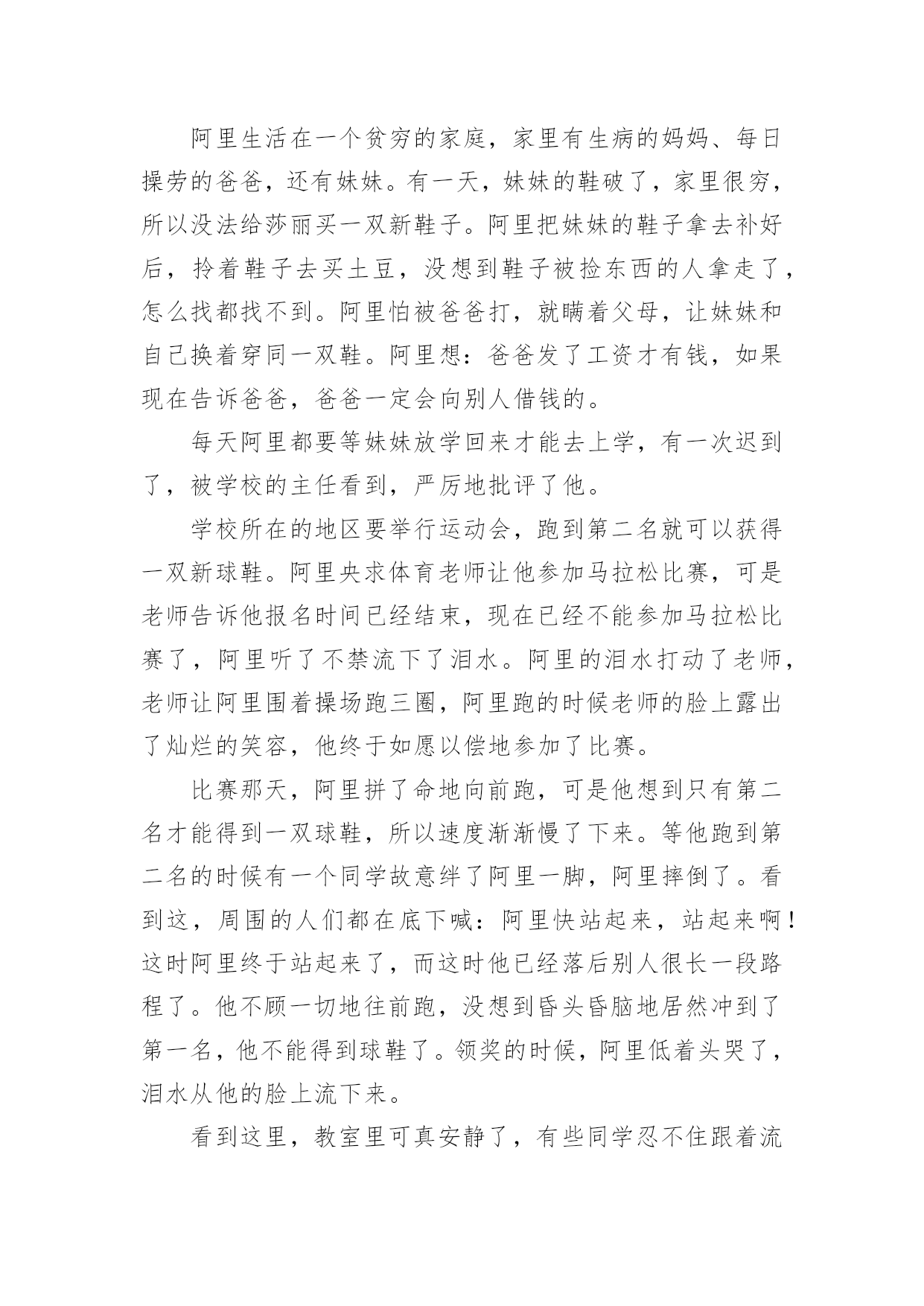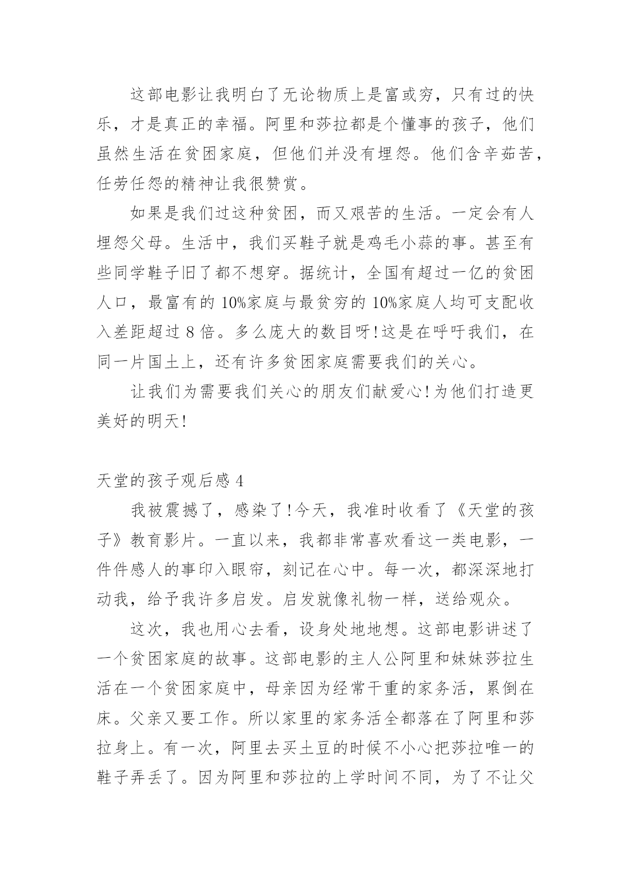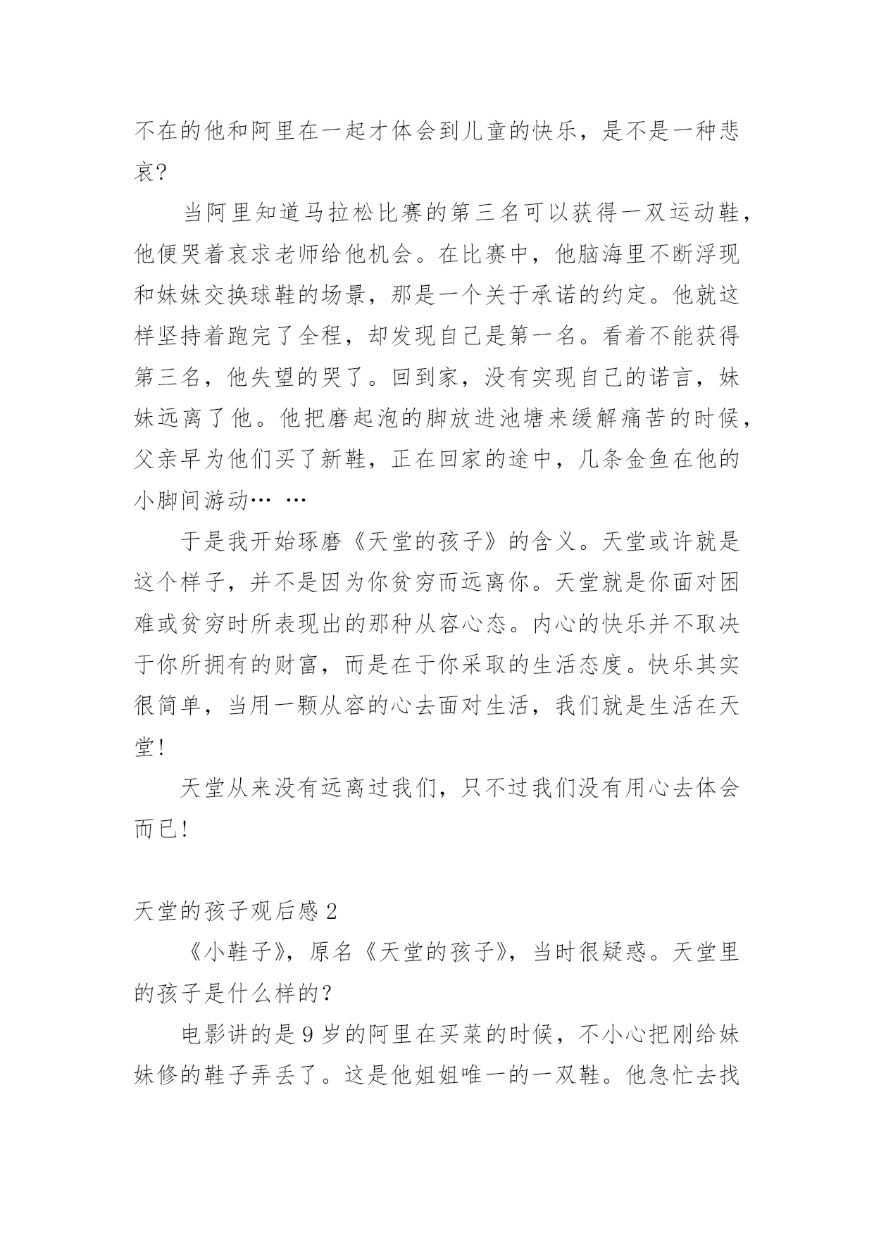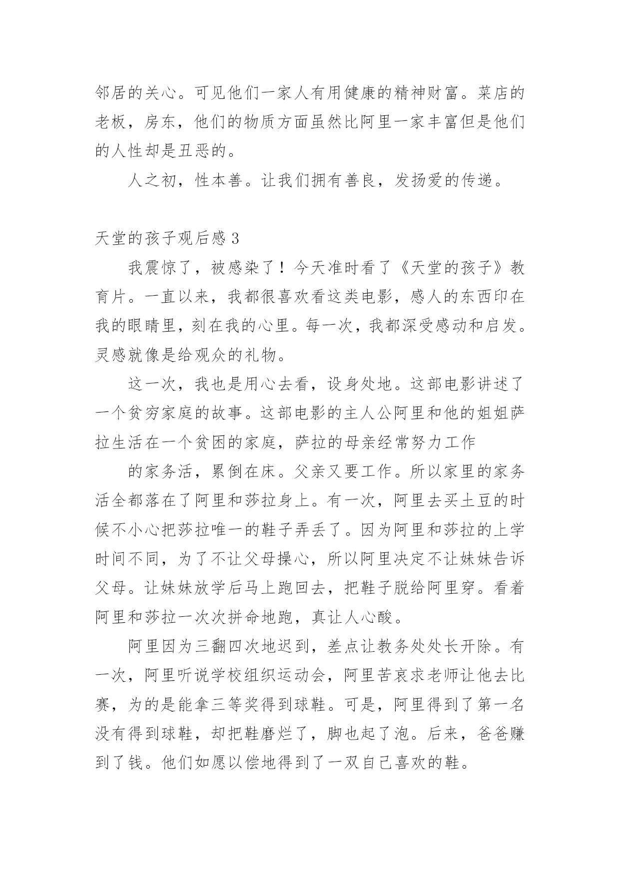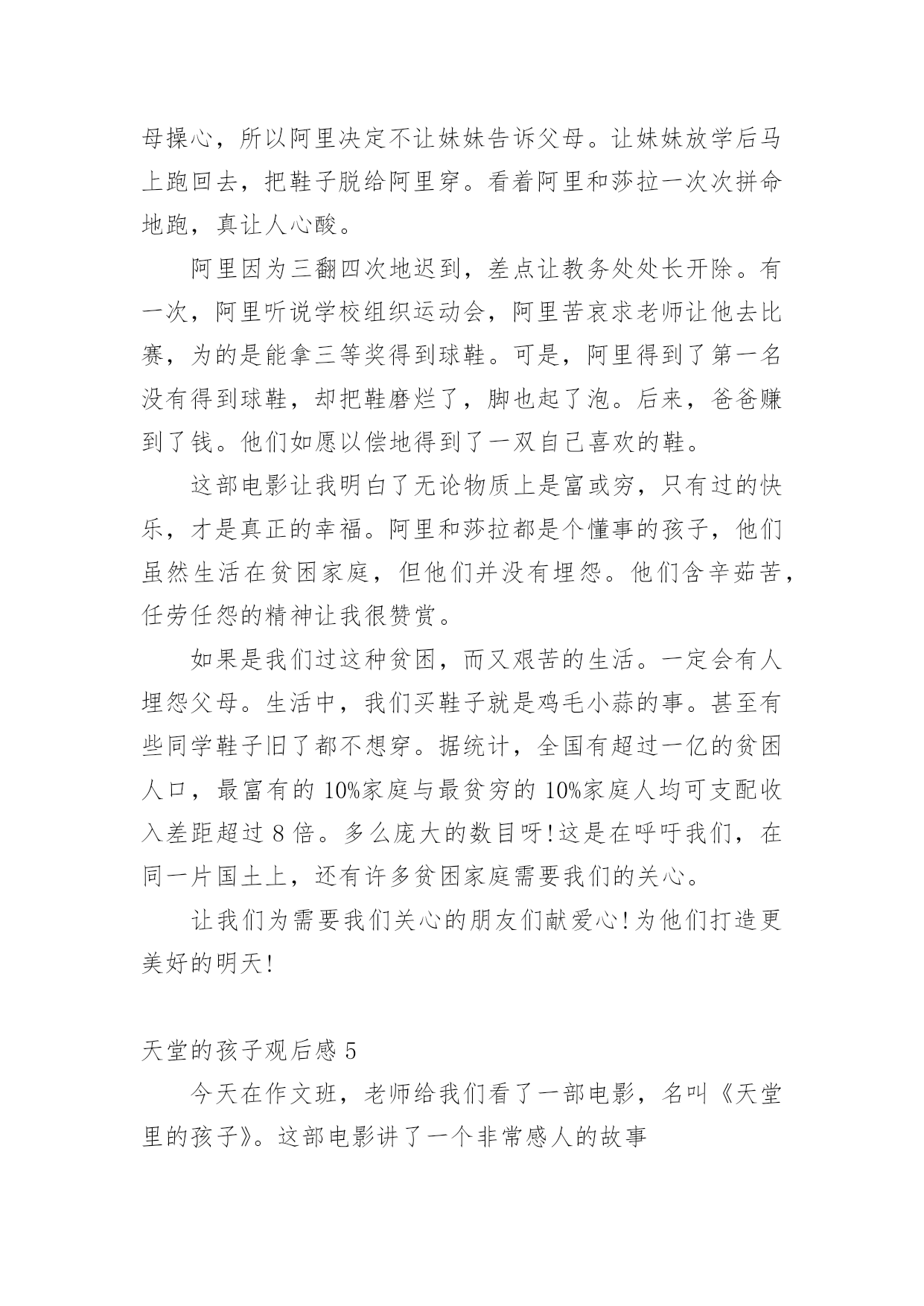 天堂的孩子观后感天堂的孩子观后感15篇看完某一作品后,这次观看让你有什么领悟呢?记录下来很重要哦,一起来写一篇观后感吧。那么你会写观后感吗?下面是小编整理的天堂的孩子观后感,仅供参考,欢迎大家阅读。天堂的孩子观后感1阿里取回为妹妹修理的小鞋子时,不慎把这双妹妹仅有的鞋子丢失了,为了免除父母的惩罚,他央求妹妹与他达成协议:每天妹妹上学时穿他的鞋子,然后下学后再换给他去上学。当阿里含着泪对妹妹说这些的时候,那是一种无助,那是一种自责。或许家境的贫寒让他更明白哥哥的责任。于是兄妹仅有的这双鞋子每天就在两个人的脚上交换着,当妹妹匆匆跑回来的时候,阿里则飞快的去学校。当妹妹一次把鞋掉在水沟中,她哭泣着追赶漂泊的鞋,她更象追求一个属于他们兄妹两个的心理依靠。当他们两个在刷球鞋互相高兴的吹着肥皂泡,互相微笑着面对一双球鞋,在那一刻,他们是是最快乐的。当阿里和父亲进城给那些富人修剪草坪时,一个叫哈里的小孩恳求阿里和他玩耍。面对众多的玩具,哈里并没有因为物质富裕而开心,反而物质富裕填不满他内心的空虚。当身在天堂心却不在的他和阿里在一起才体会到儿童的快乐,是不是一种悲哀?当阿里知道马拉松比赛的第三名可以获得一双运动鞋,他便哭着哀求老师给他机会。在比赛中,他脑海里不断浮现和妹妹交换球鞋的场景,那是一个关于承诺的约定。他就这样坚持着跑完了全程,却发现自己是第一名。看着不能获得第三名,他失望的哭了。回到家,没有实现自己的诺言,妹妹远离了他。他把磨起泡的脚放进池塘来缓解痛苦的时候,父亲早为他们买了新鞋,正在回家的途中,几条金鱼在他的小脚间游动……于是我开始琢磨《天堂的孩子》的含义。天堂或许就是这个样子,并不是因为你贫穷而远离你。天堂就是你面对困难或贫穷时所表现出的那种从容心态。内心的快乐并不取决于你所拥有的财富,而是在于你采取的生活态度。快乐其实很简单,当用一颗从容的心去面对生活,我们就是生活在天堂!天堂从来没有远离过我们,只不过我们没有用心去体会而已!天堂的孩子观后感2《小鞋子》,原名《天堂的孩子》,当时很疑惑。天堂里的孩子是什么样的?电影讲的是9岁的阿里在买菜的时候,不小心把刚给妹妹修的鞋子弄丢了。这是他姐姐唯一的一双鞋。他急忙去找他再也找不到的鞋子。之后他一脸郁闷的回家了。他无法面对姐姐期待的目光。他不想让她姐姐失望。但是那双鞋找不到了。他回家问妹妹,求她不要告诉父母。因为不想再给父母增加负担,不忍心让哥哥受到惩罚,就答应了。就这样,巷子里出现了一个奇怪的景象。早上,小女孩穿着哥哥的鞋子去上学。放学后,她匆忙回家,脱下鞋子给哥哥穿,穿上后,她匆忙去了他的学校。它们就像继电器,每天不停地运转。然而,在此期间,有许多困难。阿里迟到了三次,差点被炒鱿鱼。哥哥的球鞋在姐姐的脚上特别别扭。在别人鞋子的背景下,他的鞋子明显穿破是因为为鞋子大在跑回家的途中鞋子掉到下水道里。但她相信哥哥会再给她一双鞋。哥哥为了给她一双鞋,和爸爸去了繁华的都市。在如宫殿的房子面前,父亲紧张的说不出话。最后他们终于找到了一户人家,并拿到了许多的钱,不幸的是父亲的刹车意外失控,将本来用来给妹妹买鞋的钱不得不用来治疗。阿里为了帮妹妹买一双新鞋用了很多的办法,但却都失败了,阿里的妹妹在一次次的希望中失望,但她却不知,父亲已经买了一双新鞋给她……天堂的孩子是天使,虽然阿里和他的妹妹的穿着并不像天使,但是他们的善良、有爱心、责任心都很是可贵。在发现自己的鞋子并跟随到家,发现他们比起自己还要贫穷。在赛跑中,阿里意外取得了第一,但是谁注意到了她那双失望的眼神。阿里对父母体量,妹妹对哥哥的包容,还有他们对邻居的关心。可见他们一家人有用健康的精神财富。菜店的老板,房东,他们的物质方面虽然比阿里一家丰富但是他们的人性却是丑恶的。人之初,性本善。让我们拥有善良,发扬爱的传递。天堂的孩子观后感3我震惊了,被感染了!今天准时看了《天堂的孩子》教育片。一直以来,我都很喜欢看这类电影,感人的东西印在我的眼睛里,刻在我的心里。每一次,我都深受感动和启发。灵感就像是给观众的礼物。这一次,我也是用心去看,设身处地。这部电影讲述了一个贫穷家庭的故事。这部电影的主人公阿里和他的姐姐萨拉生活在一个贫困的家庭,萨拉的母亲经常努力工作的家务活,累倒在床。父亲又要工作。所以家里的家务活全都落在了阿里和莎拉身上。有一次,阿里去买土豆的时候不小心把莎拉唯一的鞋子弄丢了。因为阿里和莎拉的上学时间不同,为了不让父母操心,所以阿里决定不让妹妹告诉父母。让妹妹放学后马上跑回去,把鞋子脱给阿里穿。看着阿里和莎拉一次次拼命地跑,真让人心酸。阿里因为三翻四次地迟到,差点让教务处处长开除。有一次,阿里听说学校组织运动会,阿里苦哀求老师让他去比赛,为的是能拿三等奖得到球鞋。可是,阿里得到了第一名没有得到球鞋,却把鞋磨烂了,脚也起了泡。后来,爸爸赚到