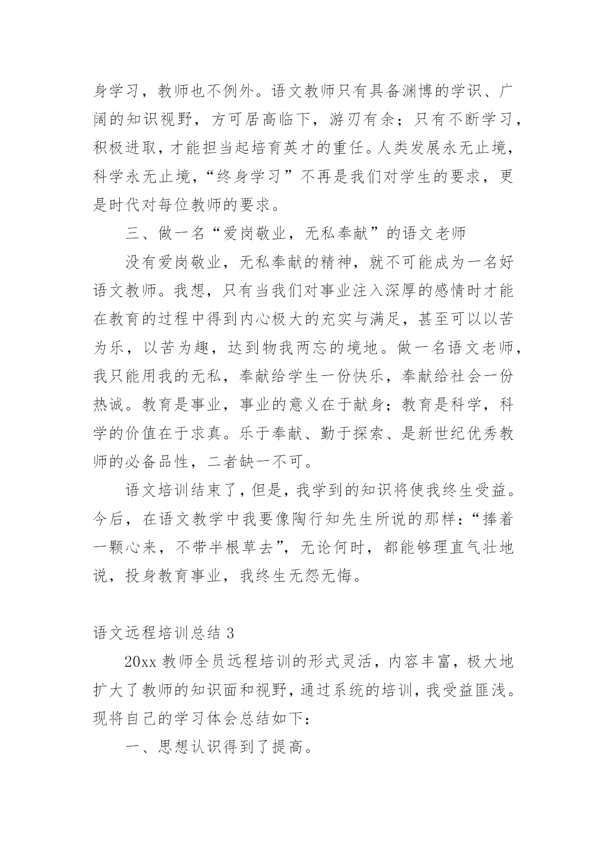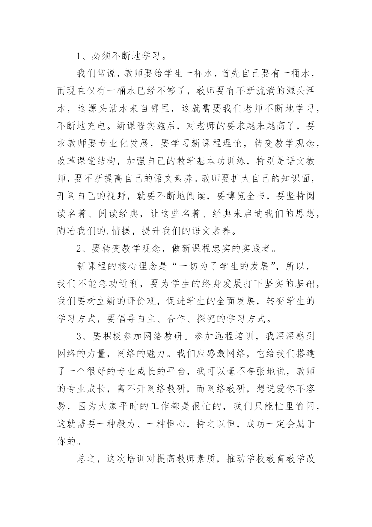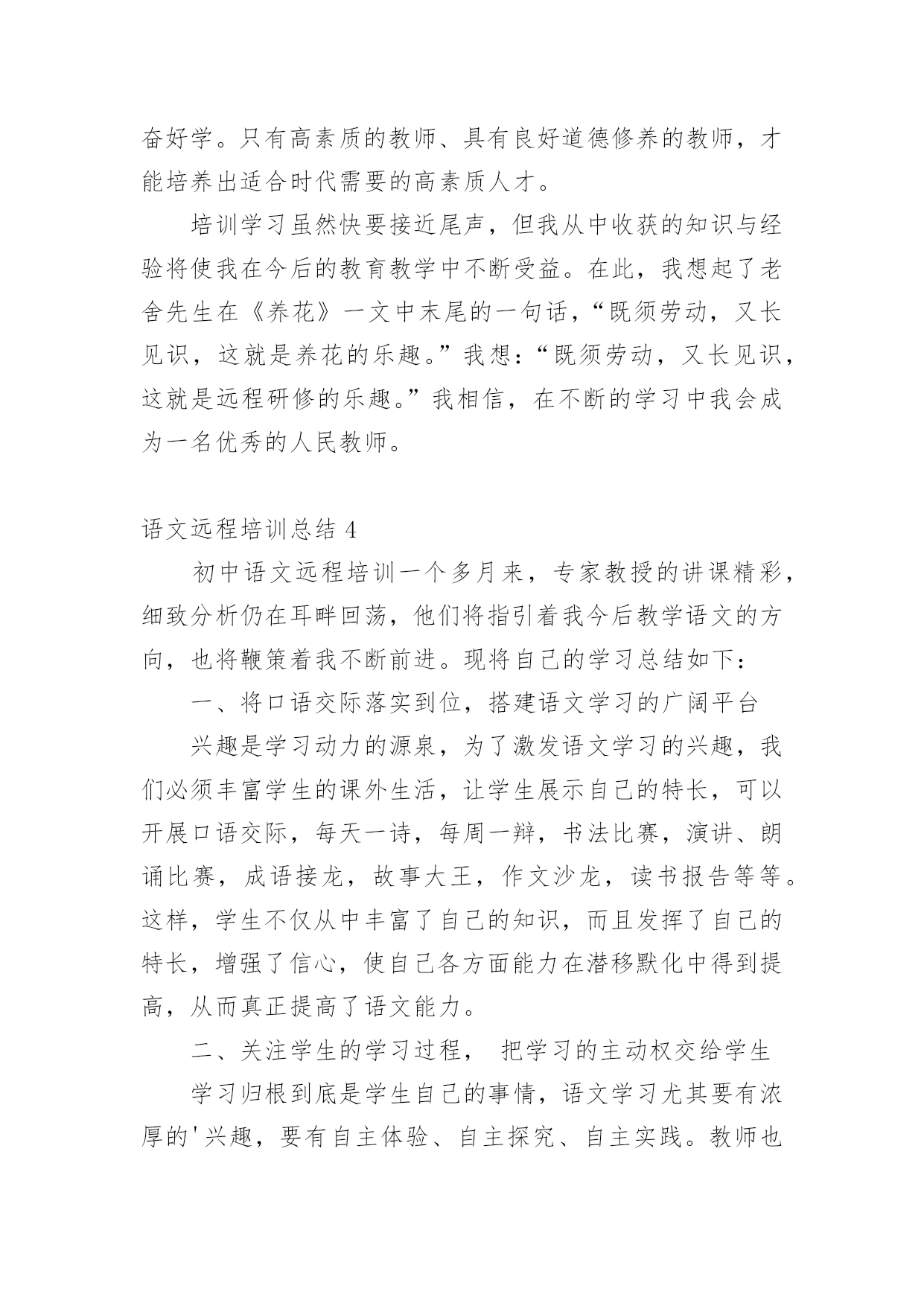 语文远程培训总结总结是对过去一定时期的工作、学习或思想情况进行回顾、分析,并做出客观评价的书面材料,通过它可以全面地、系统地了解以往的学习和工作情况,让我们来为自己写一份总结吧。那么总结要注意有什么内容呢?下面是小编为大家收集的语文远程培训总结,希望对大家有所帮助。语文远程培训总结1在培训过程中,观看了许多专家的精彩讲座,让我受益匪浅,感触颇深。通过本次远程教育培训,收获甚多,受益匪浅,使我真正体会到以前的认识是多么的肤浅,理论知识是多么的匮乏。讲课是一种艺术。这次培训使我感到还有许多需要学习的地方,要学习的东西实在是太多了。静下心来回味一下这二十几天收获的是什么?我感觉我收获的是差距,是我个人跟那些名师之间的差距。一、语文教学现状1、我们现在所教的语文,经过这些专家、权威人士的研究探讨,正在进行阅读教学的转型,正在改革中创新。而我平时在上语文课的时候,大部分时间还只是在为教课文而教课文,没有真正达到从“教课文”到“教语文课程内容”这一质的飞跃。特级教师沈大安说:“第一种水平:教一篇课文,知道一个故事,是一节不入门的课,因为没有走进语文教学之门;第二种水平,教一篇课文,明白一个道理,似乎比第一种好一点,但好不了多少,也是属于一节比较差的思想品德课,而第三种水平是积累语言,形成能力,发展思维、陶冶情操,这样的课,才是一节真正的语文课。”于我而言,这样的课,是一种境界多么高的课呀。我一直都在努力地朝这个方向靠拢,对比起来,我们学校不是正在进行《提高课堂教学的有效性》这一课题的研究吗?其实,我们学校领导的教学理念,是走在全国语文阅读教学改革的前列的,我们的名师、我们的专家就在我们的身边。2、我们要修炼自己的课堂语言,魅力的课堂,高效的课堂,首先来自教师魅力的语言,让我们的课堂语言简洁、精炼、丰富、动听,这也是教师一种重要的教学基本功。3、做为一线教师,我们很有必要学习教育理论,我们的课堂实践要有理论支撑。新课改后提出了许多重要的教学理念,我们要把这些教学理念变成自己的日常教学行为,要把这些理念渗透到各个学科教学中去。4、一个人的精神发育史,就是一个人的阅读史。阅读是语文教育的核心,给孩子读书,是一种最好的教育方式,它是送给孩子的一件终身享受的最好的礼物。最好的大学是图书馆,最好的教育是教会学生怎样阅读,让学生获得充实、幸福的人生,还是让孩子阅读。让孩子阅读就等于送给孩子千里眼、顺风耳,让孩子博古通今,就是让孩子读书,读好书,读整本书。二、今后努力方向:1、必须不断地学习。我们常说,教师要给学生一杯水,首先自己要有一桶水,而现在仅有一桶水已经不够了,教师要有不断流淌的源头活水,这源头活水来自哪里,这就需要我们老师不断地学习,不断地充电。新课程实施后,对老师的要求越来越高了,要求教师要专业化发展,要学习新课程理论,转变教学观念,改革课堂结构,加强自己的教学基本功训练,特别是语文教师,要不断提高自己的语文素养。教师要扩大自己的知识面,开阔自己的视野,就要不断地阅读,要博览全书,要坚持阅读名著、阅读经典,让这些名著、经典来启迪我们的思想,陶冶我们的.情操,提升我们的语文素养。2、要转变教学观念,做新课程忠实的实践者。新课程的核心理念是“一切为了学生的发展”,所以,我们不能急功近利,要为学生的终身发展打下坚实的基础,我们要树立新的评价观,促进学生的全面发展,转变学生的学习方式,要倡导自主、合作、探究的学习方式。3、要积极参加网络教研。参加远程培训,我深深感到网络的力量,网络的魅力。我们应感激网络,它给我们搭建了一个很好的专业成长的平台,我可以毫不夸张地说,教师的专业成长,离不开网络教研,而网络教研,想说爱你不容易,因为大家平时的工作都是很忙的,我们只能忙里偷闲,这就需要一种毅力、一种恒心,持之以恒,成功一定会属于你的。总之,这次培训对提高教师素质,推动学校教育教学改革,逐步提高教学质量起到了催化剂的作用,我一定会珍惜本次学习培训的机会,认真学习,利用时间给自己“充电”,为将来更好的从事语文教学工作打好坚实的基础。语文远程培训总结2随着时间的推移,十二天的初中语文远程培训马上就要结束了。这次培训形式灵活,内容系统、丰富,各位优秀教师的精彩授课,指导教师的细致分析,极大地扩大了教师的知识面和视野。在忙忙碌碌的日子里收获了许多许多,现将自己的学习心得体会总结如下:一、做一名“求实创新,开拓进取”的语文老师作为一名语文老师,要跟上时代的步伐。随着时代的进步与发展,语文教学也必须面向现代化、面向世界、面向未来,以适应当今经济一体化、全球化和信息化的时代需要。在科学、文化、经济飞速发展的.今天,面对头脑灵活的学生,仅有一桶水是远远不够的,需要有一缸水、一湖水,甚至是一江水。我们几年前,十几年前甚至几十年前的“一桶水”,经过这么长时间不断地倒给学生,剩