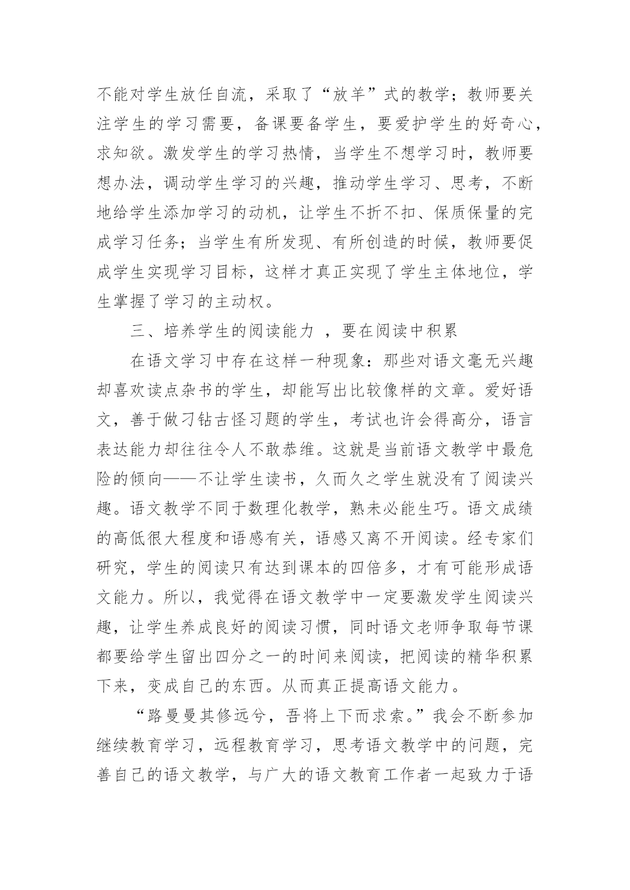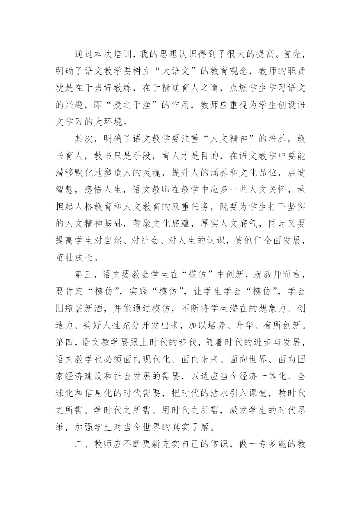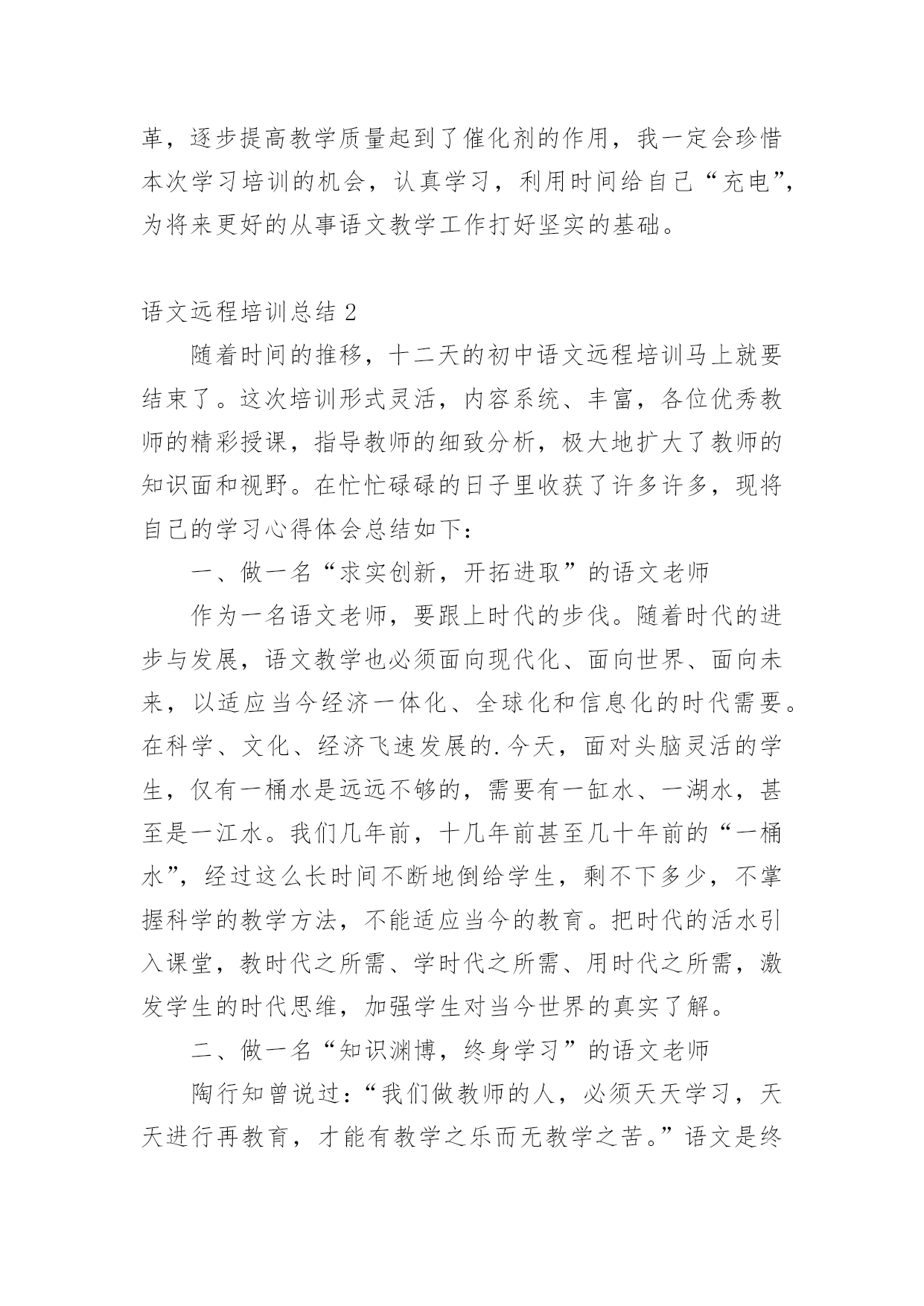 语文远程培训总结总结是对过去一定时期的工作、学习或思想情况进行回顾、分析,并做出客观评价的书面材料,通过它可以全面地、系统地了解以往的学习和工作情况,让我们来为自己写一份总结吧。那么总结要注意有什么内容呢?下面是小编为大家收集的语文远程培训总结,希望对大家有所帮助。语文远程培训总结1在培训过程中,观看了许多专家的精彩讲座,让我受益匪浅,感触颇深。通过本次远程教育培训,收获甚多,受益匪浅,使我真正体会到以前的认识是多么的肤浅,理论知识是多么的匮乏。讲课是一种艺术。这次培训使我感到还有许多需要学习的地方,要学习的东西实在是太多了。静下心来回味一下这二十几天收获的是什么?我感觉我收获的是差距,是我个人跟那些名师之间的差距。一、语文教学现状1、我们现在所教的语文,经过这些专家、权威人士的研究探讨,正在进行阅读教学的转型,正在改革中创新。而我平时在上语文课的时候,大部分时间还只是在为教课文而教课文,没有真正达到从“教课文”到“教语文课程内容”这一质的飞跃。特级教师沈大安说:“第一种水平:教一篇课文,知道一个故事,是一节不入门的课,因为没有走进语文教学之门;第二种水平,教一篇课文,明白一个道理,似乎比第一种好一点,但好不了多少,也是属于一节比较差的思想品德课,而第三种水平是积累语言,形成能力,发展思维、陶冶情操,这样的课,才是一节真正的语文课。”于我而言,这样的课,是一种境界多么高的课呀。我一直都在努力地朝这个方向靠拢,对比起来,我们学校不是正在进行《提高课堂教学的有效性》这一课题的研究吗?其实,我们学校领导的教学理念,是走在全国语文阅读教学改革的前列的,我们的名师、我们的专家就在我们的身边。2、我们要修炼自己的课堂语言,魅力的课堂,高效的课堂,首先来自教师魅力的语言,让我们的课堂语言简洁、精炼、丰富、动听,这也是教师一种重要的教学基本功。3、做为一线教师,我们很有必要学习教育理论,我们的课堂实践要有理论支撑。新课改后提出了许多重要的教学理念,我们要把这些教学理念变成自己的日常教学行为,要把这些理念渗透到各个学科教学中去。4、一个人的精神发育史,就是一个人的阅读史。阅读是语文教育的核心,给孩子读书,是一种最好的教育方式,它是送给孩子的一件终身享受的最好的礼物。最好的大学是图书馆,最好的教育是教会学生怎样阅读,让学生获得充实、幸福的人生,还是让孩子阅读。让孩子阅读就等于送给孩子千里眼、顺风耳,让孩子博古通今,就是让孩子读书,读好书,读整本书。二、今后努力方向:1、必须不断地学习。我们常说,教师要给学生一杯水,首先自己要有一桶水,而现在仅有一桶水已经不够了,教师要有不断流淌的源头活水,这源头活水来自哪里,这就需要我们老师不断地学习,不断地充电。新课程实施后,对老师的要求越来越高了,要求教师要专业化发展,要学习新课程理论,转变教学观念,改革课堂结构,加强自己的教学基本功训练,特别是语文教师,要不断提高自己的语文素养。教师要扩大自己的知识面,开阔自己的视野,就要不断地阅读,要博览全书,要坚持阅读名著、阅读经典,让这些名著、经典来启迪我们的思想,陶冶我们的.情操,提升我们的语文素养。2、要转变教学观念,做新课程忠实的实践者。新课程的核心理念是“一切为了学生的发展”,所以,我们不能急功近利,要为学生的终身发展打下坚实的基础,我们要树立新的评价观,促进学生的全面发展,转变学生的学习方式,要倡导自主、合作、探究的学习方式。3、要积极参加网络教研。参加远程培训,我深深感到网络的力量,网络的魅力。我们应感激网络,它给我们搭建了一个很好的专业成长的平台,我可以毫不夸张地说,教师的专业成长,离不开网络教研,而网络教研,想说爱你不容易,因为大家平时的工作都是很忙的,我们只能忙里偷闲,这就需要一种毅力、一种恒心,持之以恒,成功一定会属于你的。总之,这次培训对提高教师素质,推动学校教育教学改革,逐步提高教学质量起到了催化剂的作用,我一定会珍惜本次学习培训的机会,认真学习,利用时间给自己“充电”,为将来更好的从事语文教学工作打好坚实的基础。语文远程培训总结2随着时间的推移,十二天的初中语文远程培训马上就要结束了。这次培训形式灵活,内容系统、丰富,各位优秀教师的精彩授课,指导教师的细致分析,极大地扩大了教师的知识面和视野。在忙忙碌碌的日子里收获了许多许多,现将自己的学习心得体会总结如下:一、做一名“求实创新,开拓进取”的语文老师作为一名语文老师,要跟上时代的步伐。随着时代的进步与发展,语文教学也必须面向现代化、面向世界、面向未来,以适应当今经济一体化、全球化和信息化的时代需要。在科学、文化、经济飞速发展的.今天,面对头脑灵活的学生,仅有一桶水是远远不够的,需要有一缸水、一湖水,甚至是一江水。我们几年前,十几年前甚至几十年前的“一桶水”,经过这么长时间不断地倒给学生,剩