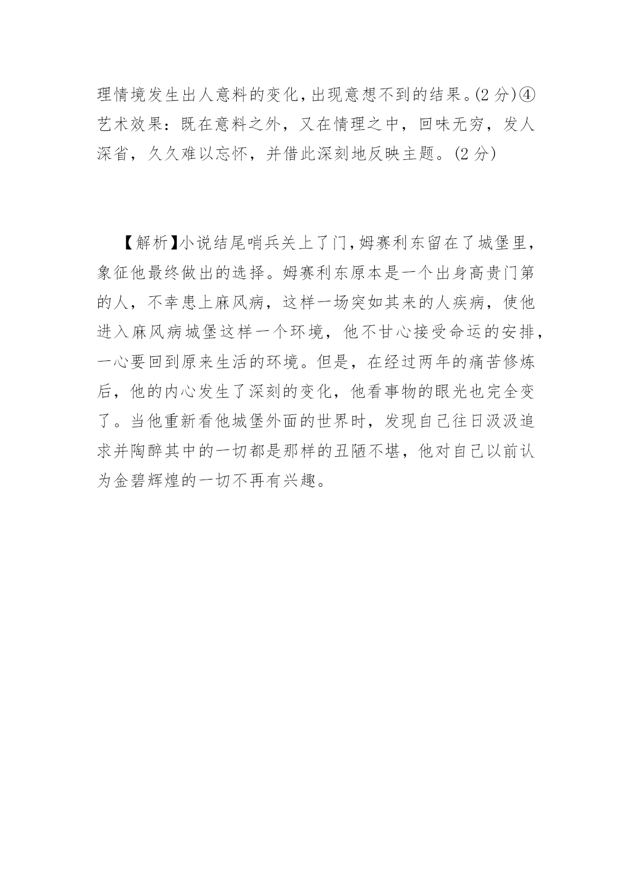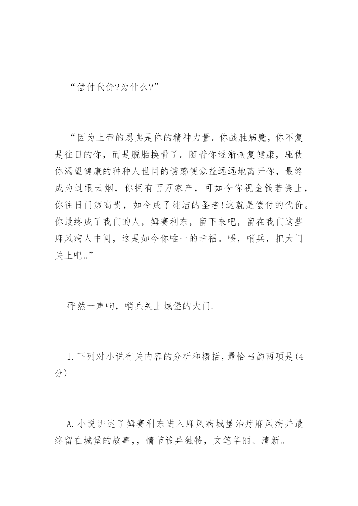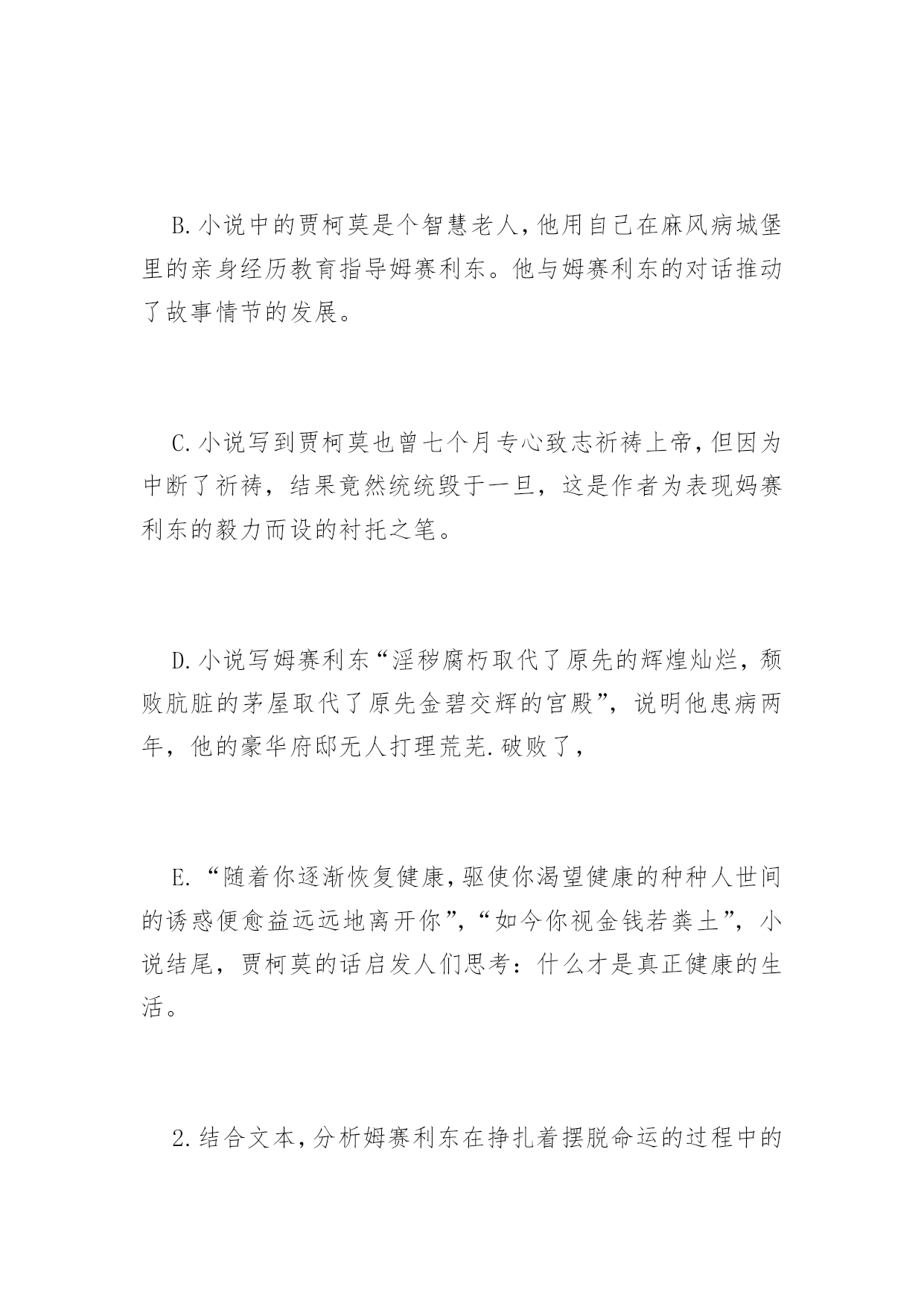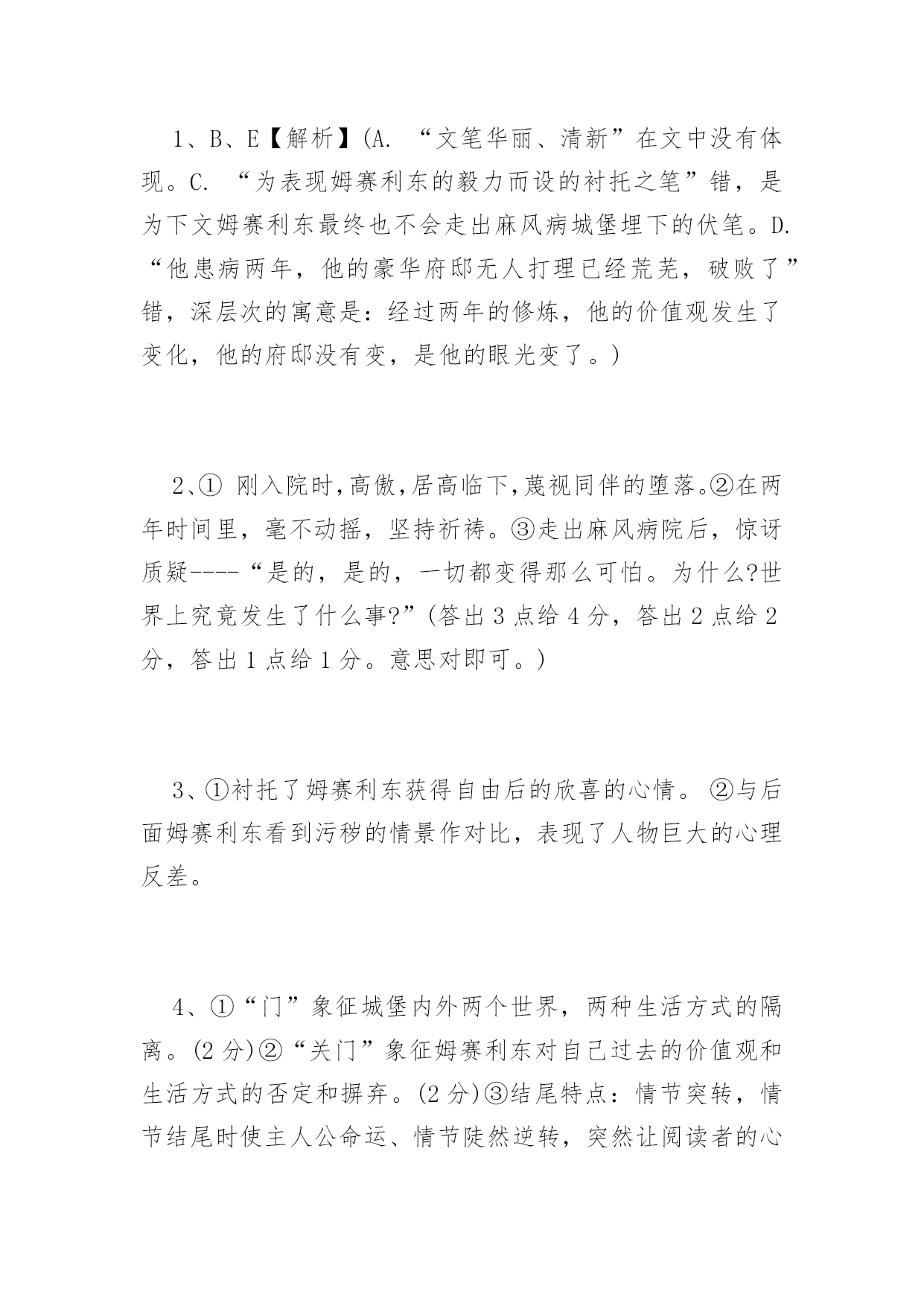 《渴望健康的人》阅读答案渴望健康的人距离城市约莫两公里的山岗上,坐落着-所庞大的城堡式的麻风病院.一道坚固的厚实的围墙高耸在城堡的四周。薄暮时分,麻风病人们照例聚集在围墙跟前。唯独一个年轻病人从不在这种场合露面。他入院方两个月,出身高贵门第,他叫姆赛利东。“你怎么在这里独自闷坐?”同伴们问道,“你不妨也去听听新闻,想必十分有趣呢!”“这意味着你们已经听任命运之神的摆布,而我并不甘心接受命运的安排,明白吗?”人群中走来一个名叫贾柯莫的老头,他是麻风痛院资格最老的病人,听到姆赛利东的话说:“可怜的孩子,我到这儿将近一百年了,凡我遇到的人,或者说走进这个大门的人,从来不曾有谁能够活着走出去的。这是麻风病人的命运."“不过,”姆赛利东说,“我需要恢复健康。我是百万富翁,你倘若登上围墙,就能瞧见我的府邸和它的两个闪烁着耀眼光辉的白银圆顶。我的骏马.狼犬.猎人在等待我,期待我重新回来。你应该明白,我需要健康。”“倘若仅仅凭主观的意愿便足以驱逐病魔,事情自然十分简单。”贾柯莫慈祥地微笑.“可是,”青年带着固执倔强的神情说,“我掌握着其他人不知道的秘诀。”“噢,”贾柯莫说,“确实有一伙骗子,专门兜售.一种据说能够治愈麻风病的秘方灵药,我年轻时曾经中过这样的圈套。“不,无须借助于药物,我只是向上帝祈祷。”“析求上帝施恩治愈你的病?难道你果真相信上帝能够显示圣迹,妙手回春么?”“是的,你们每个晚上去胡扯,而我却在向上帝祈祷。即便是吃饭的时候,甚至进入睡乡之后,我也不曾停止默祷。”贾柯莫听着这一席话,身躯不停地颤栗,滚滚热泪夺眶而出,淌在死灰色的脸皮上。“是的,是的”,老头儿呜咽着说,“像你这般年纪的时候,我也曾专心致志于祈祷上帝,七个孜孜不倦地努力的结果,我即将重新获得健康,谁晓得我中断了祈祷,竟然统统毁于二一旦。”姆赛利东问:“你不相信我?”“愿上帝保佑你。”姆赛利东毫不动摇,坚持祈祷。修炼持续了几近两年。一天,姆赛利东走出病室,人们惊诧地发现,他的狮子一般的丑陋的模样不见了,显现出的是一副青春焕发的英俊脸庞。麻风病症消失了!“他恢复了,健康了!”病友们欢欣雀跃。他获得了自由。大家举行欢送仪式。贾柯莫老头儿陪送他出院.哨兵检验了证件,启开大锁,打开了大门。晨光灿烂,葱郁茂盛的树林,膏翠如茵的草地,鸟儿发出清脆甜润的啁啾声。莹白的塔楼,花凉台,招展的旗帜,宛如龙蛇的风筝在天际飘荡。贾柯莫看到青年人喜形“于色,容光焕发。姆赛利东露出欣慰的笑容。骤然间,青年人的脸色刷地一下变得苍白。“你怎幺了?”姆赛利东倒退了一步,用双手捂住面孔:“天哪,多么可怕啊11’“你怎么啦?”贾柯莫重复地问。“简直无法忍受."姆赛利东惊呼,他眼前的景象霎时间完全变了。塔楼和宫殿的圆顶消失得无影无踪,只见龌龊的茅屋j粪土,贫穷;屋顶上的旗帜不见了,只有黑压压的一片牛虻。老头儿问:“告诉我,是淫秽腐朽取代了原先的辉煌灿烂,颓败肮脏的茅屋取代了原先金碧交辉的宫殿,是这样么,姆赛利东?”“是的,是的,二‘切都变得那么可怕。为什么?世界上究竟发生了什么事?”“我知道,”老头儿回答,“这是我们的命运,一切全得付出昂贵的代价。现在该你偿付代价了。”“偿付代价?为什么?”“因为上帝的恩典是你的精神力量。你战胜病魔,你不复是往日的你,而是脱胎换骨了。随着你逐渐恢复健康,驱使你渴望健康的种种人世间的诱惑便愈益远远地离开你,最终成为过眼云烟,你拥有百万家产,可如今你视金钱若粪土,你往日门第高贵,如今成了纯洁的圣者!这就是偿付的代价。你最终成了我们的人,姆赛利东,留下来吧,留在我们这些麻风病人中间,这是如今你唯一的幸福。喂,哨兵,把大门关上吧。”砰然一声响,哨兵关上城堡的大门.1.下列对小说有关内容的分析和概括,最恰当韵两项是(4分)A.小说讲述了姆赛利东进入麻风病城堡治疗麻风病并最终留在城堡的故事,,情节诡异独特,文笔华丽、清新。B.小说中的贾柯莫是个智慧老人,他用自己在麻风病城堡里的亲身经历教育指导姆赛利东。他与姆赛利东的对话推动了故事情节的发展。C.小说写到贾柯莫也曾七个月专心致志祈祷上帝,但因为中断了祈祷,结果竟然统统毁于一旦,这是作者为表现妈赛利东的毅力而设的衬托之笔。D.小说写姆赛利东“淫秽腐朽取代了原先的辉煌灿烂,颓败肮脏的茅屋取代了原先金碧交辉的宫殿”,说明他患病两年,他的豪华府邸无人打理荒芜.破败了,E.“随着你逐渐恢复健康,驱使你渴望健康的种种人世间的诱惑便愈益远远地离开你”,“如今你视金钱若粪土”,小说结尾,贾柯莫的话启发人们思考:什么才是真正健康的生活。2.结合文本,分析姆赛利东在挣扎着摆脱命运的过程中的心理变化.(4分)答:3.文中画线句子是—段景物描写,联系全文说说这段景物描写的作用.(